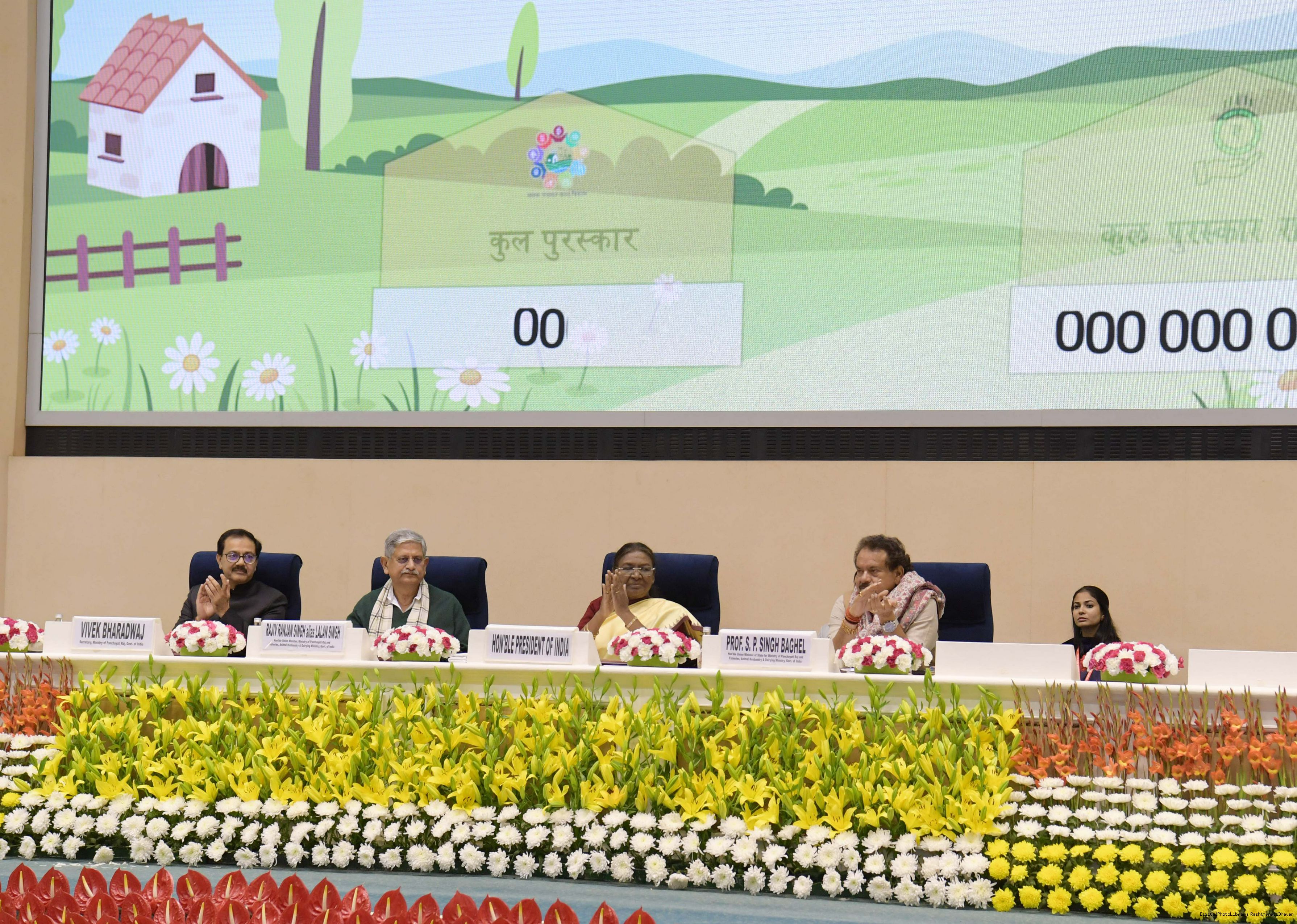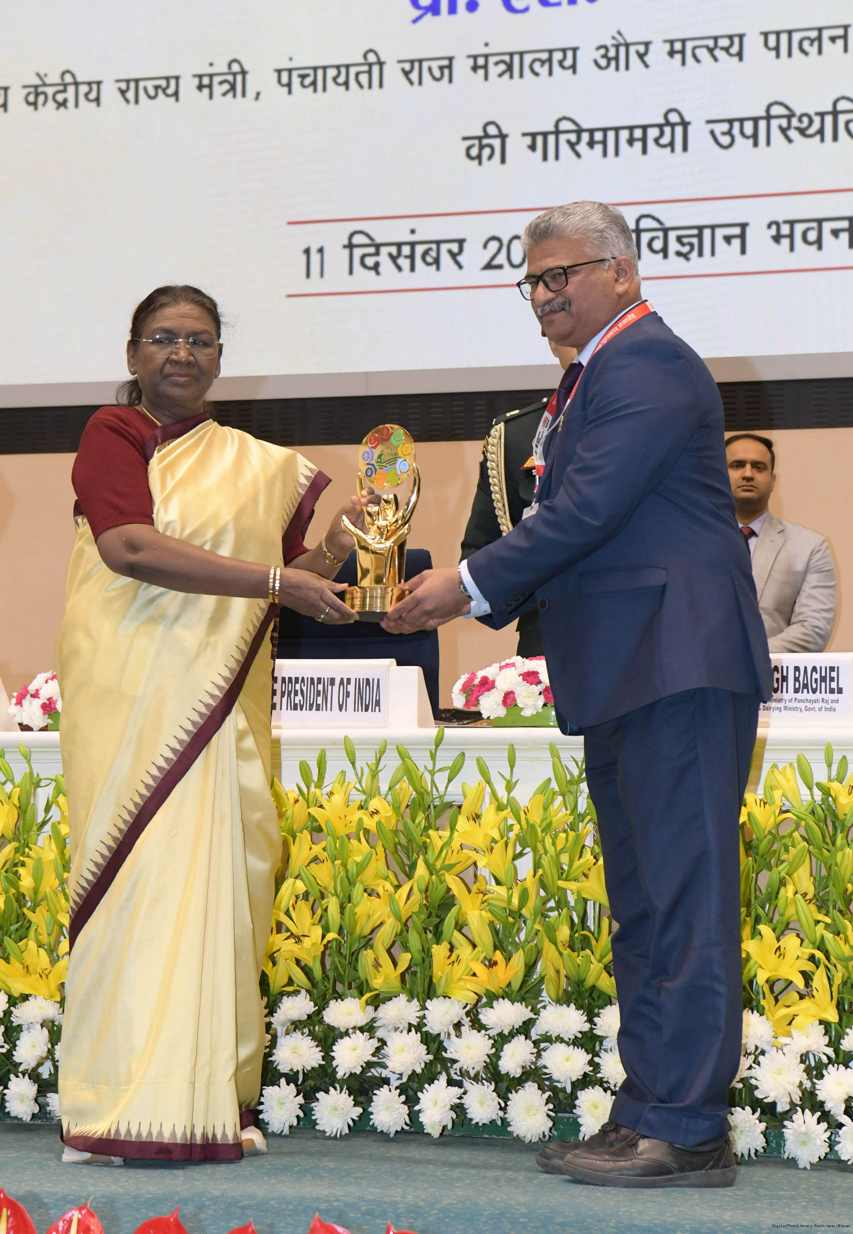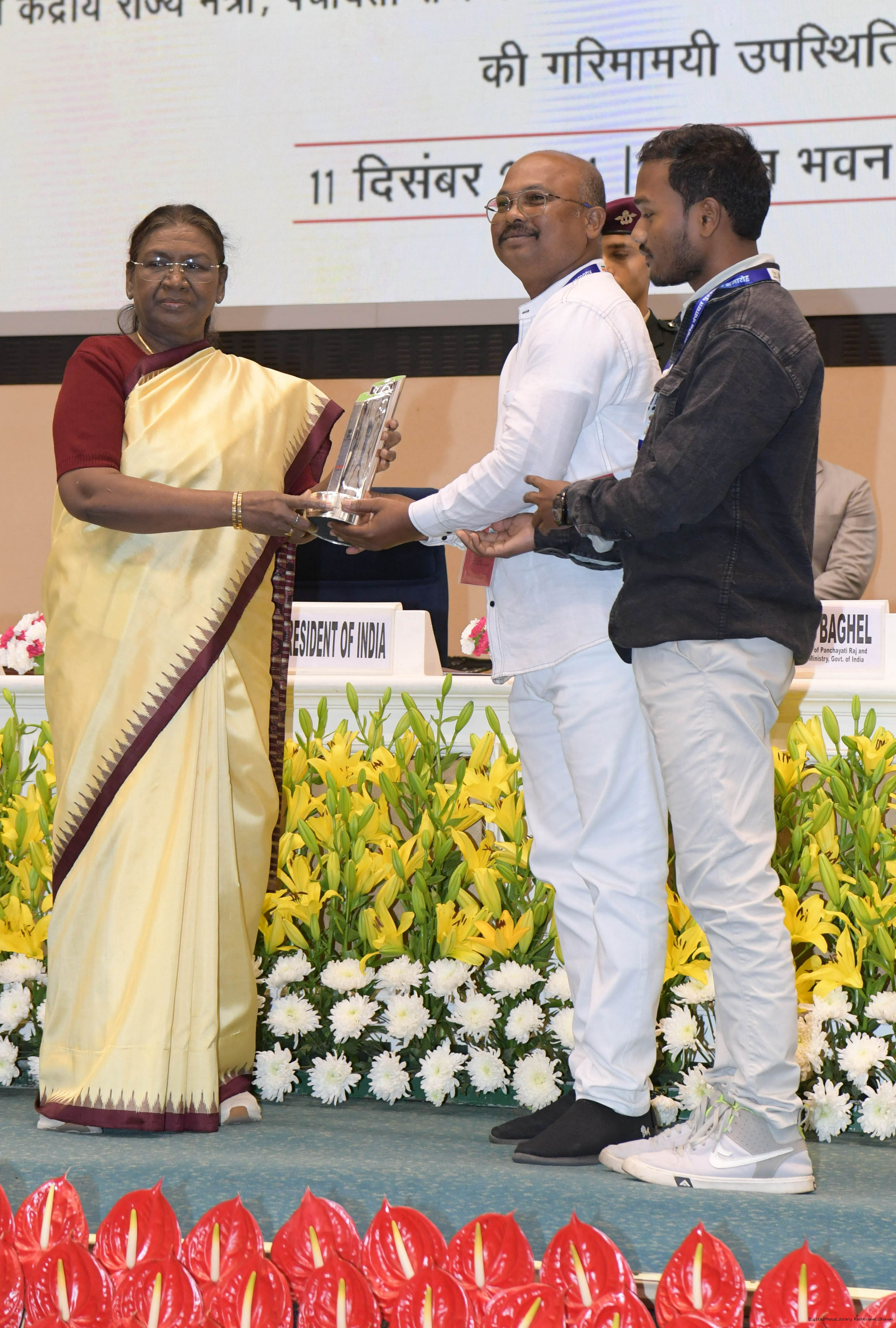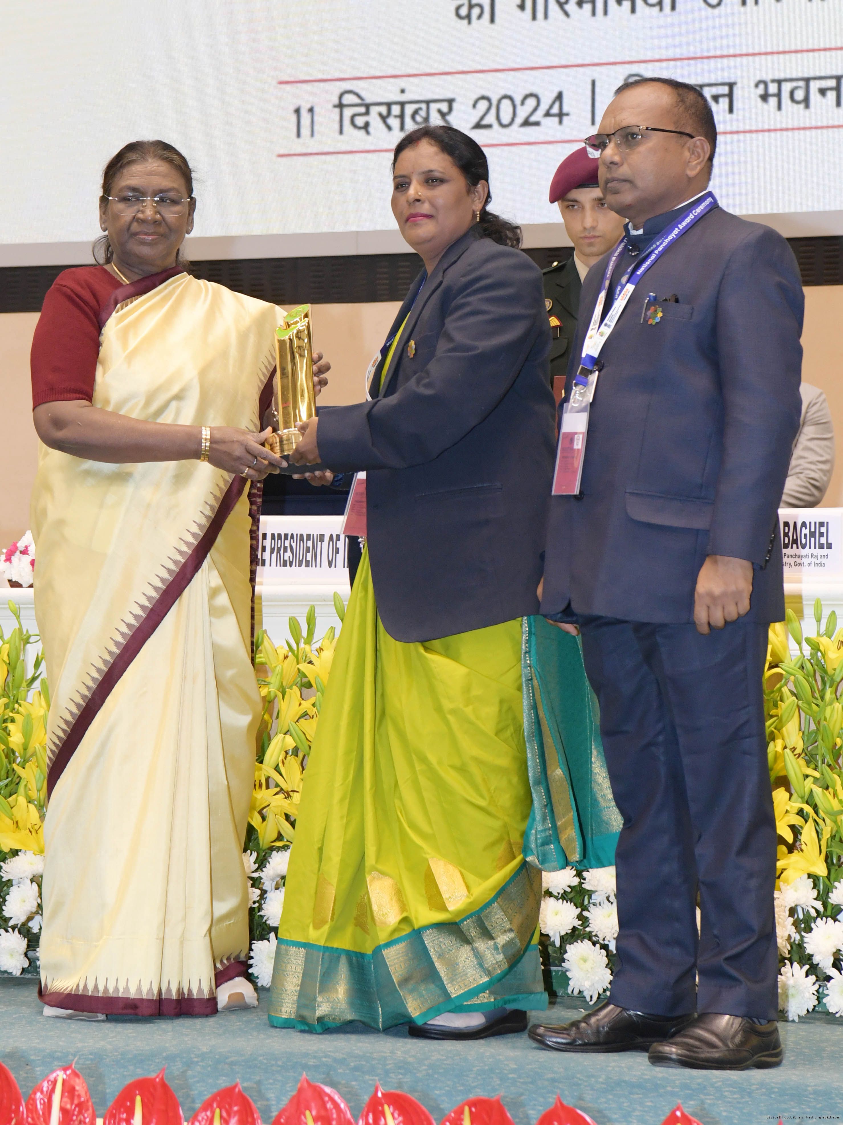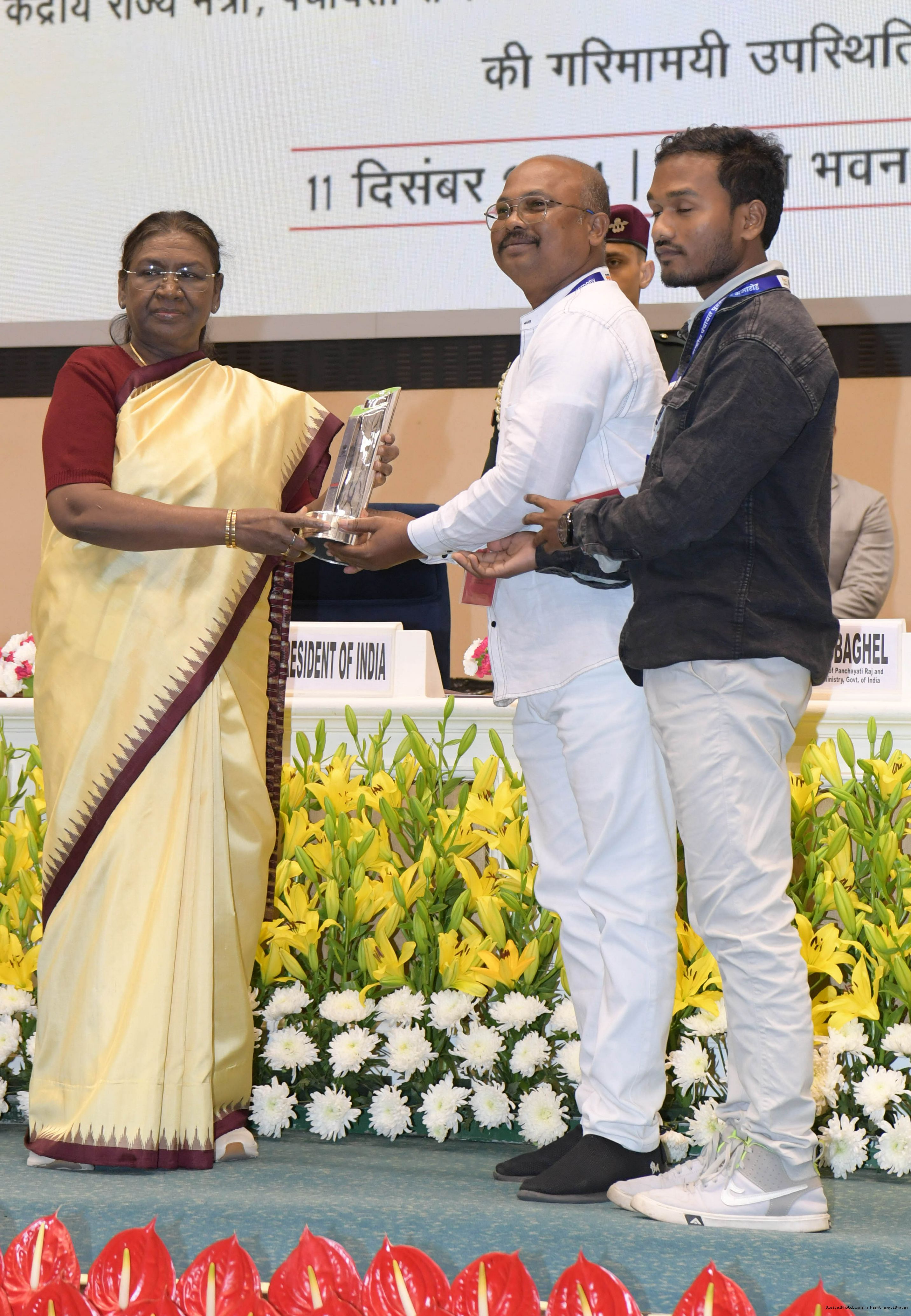 | Caption: | The President of India, Smt Droupadi Murmu conferred the National Panchayat Awards upon 45 awardees, selected across various categories, recognizing their exemplary contributions to the themes of sustainable and inclusive development, in New Delhi on December 11, 2024. |
