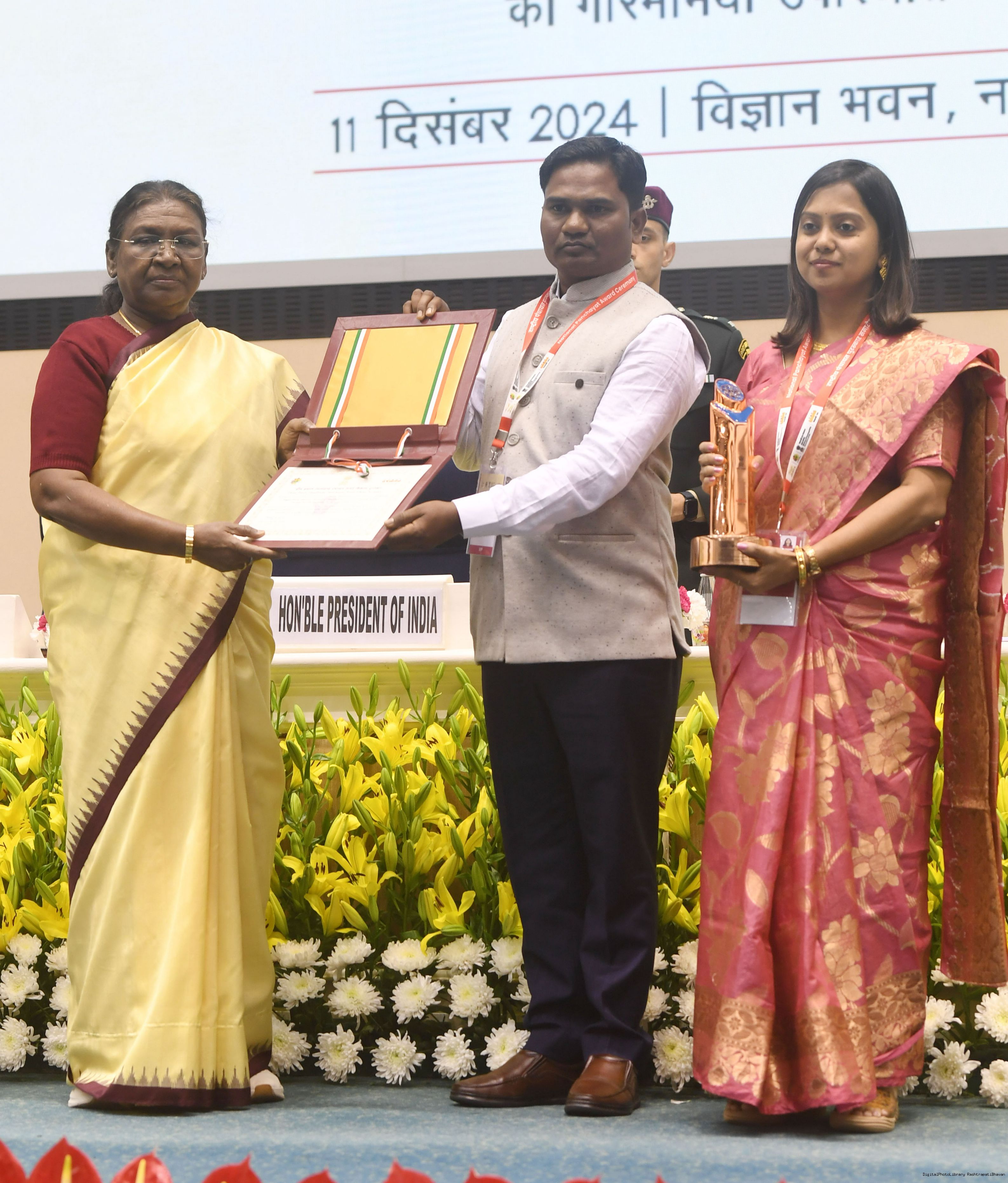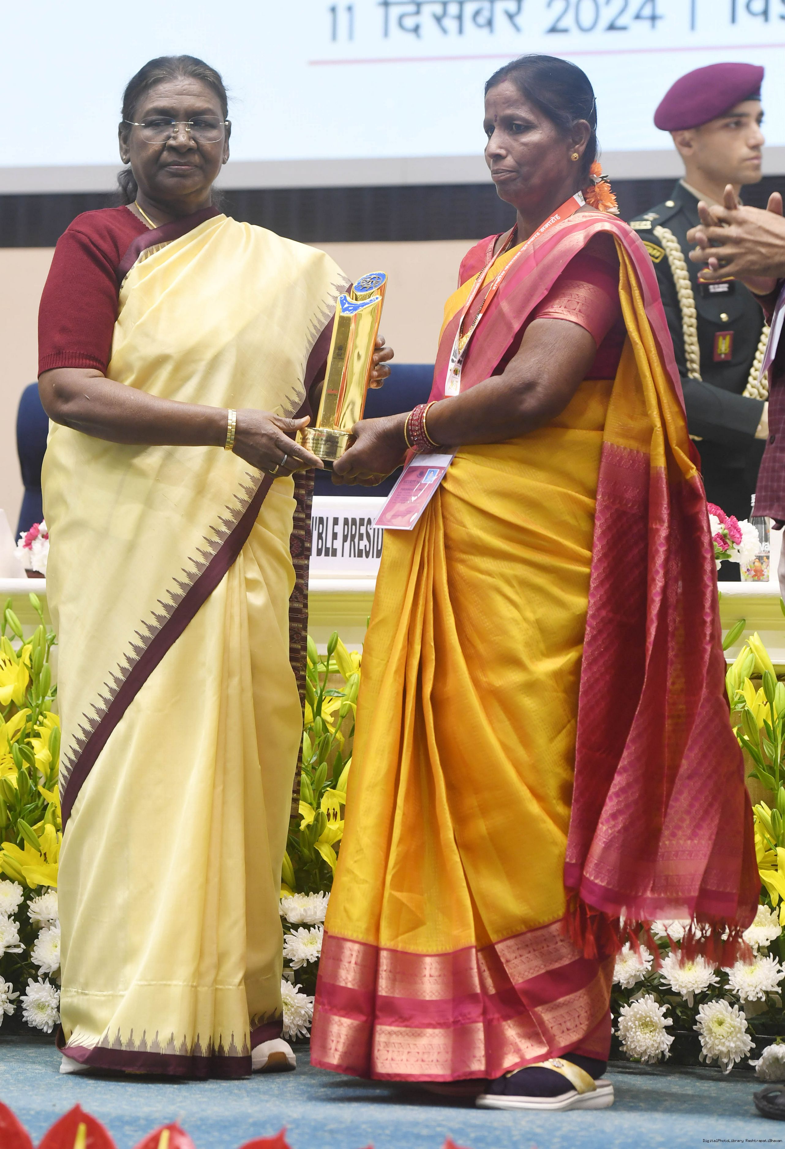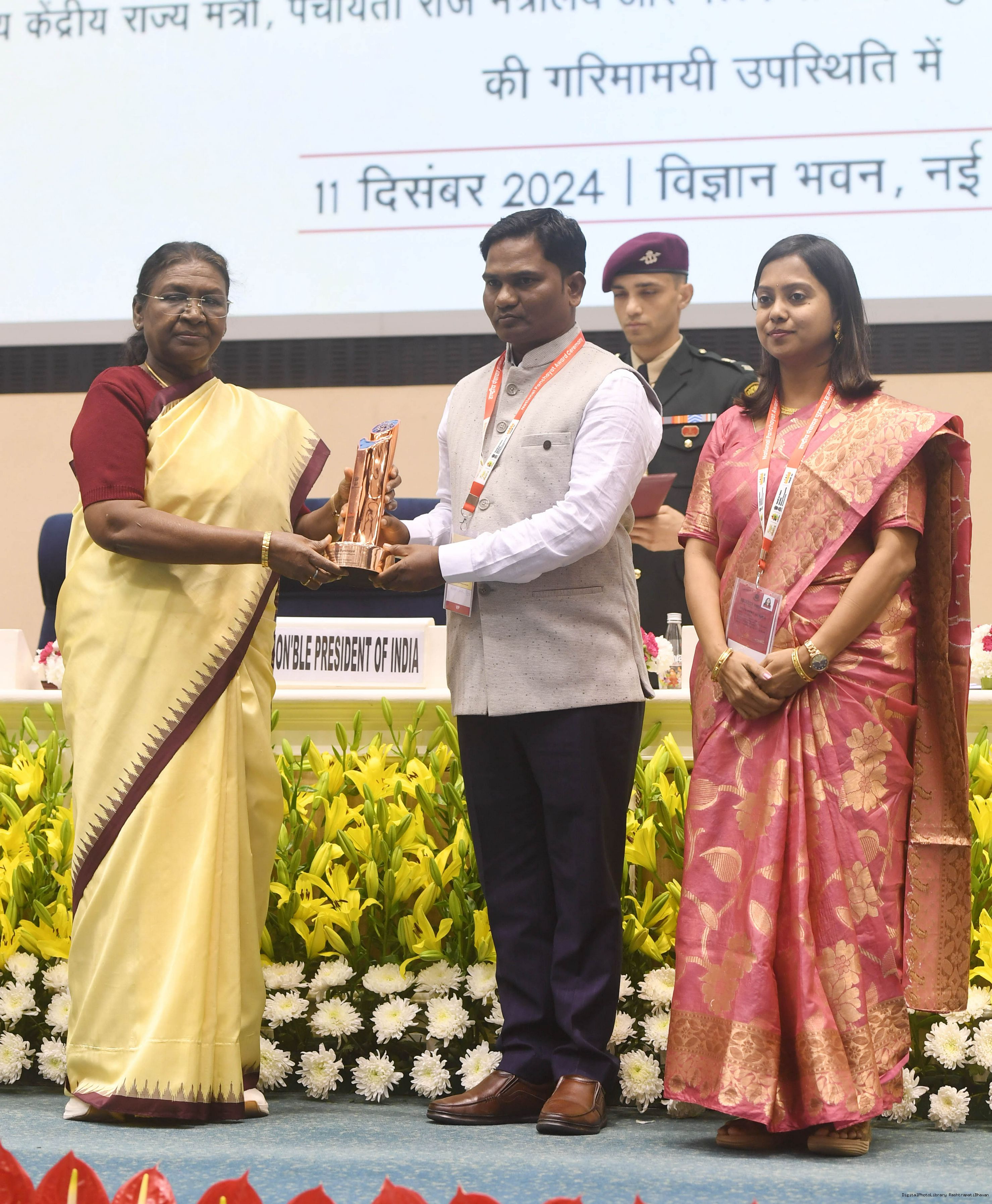 | Caption: | The President of India, Smt Droupadi Murmu conferred the National Panchayat Awards upon 45 awardees, selected across various categories, recognizing their exemplary contributions to the themes of sustainable and inclusive development, in New Delhi on December 11, 2024. |