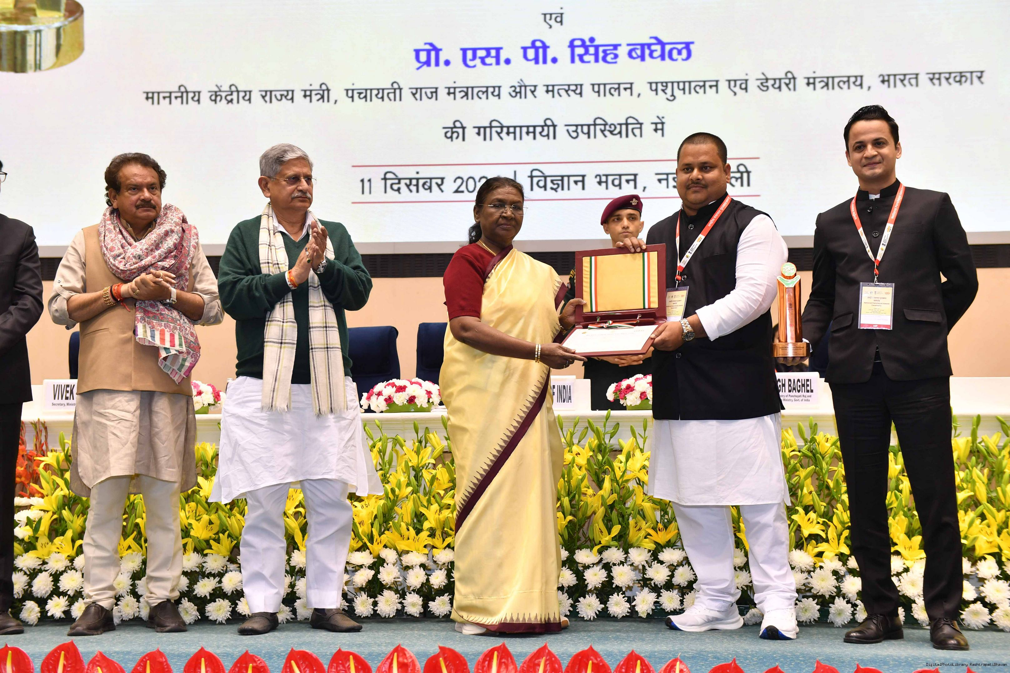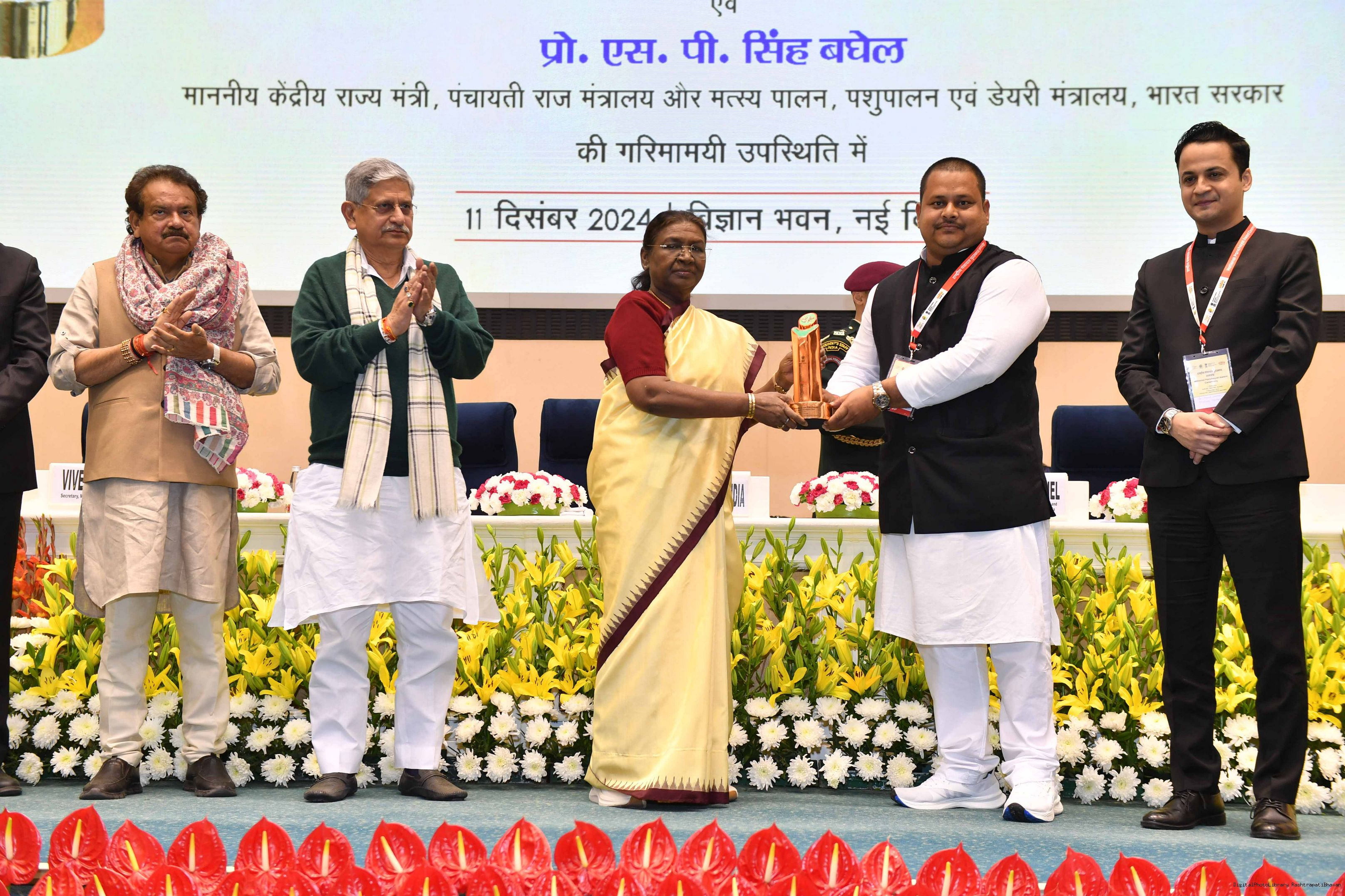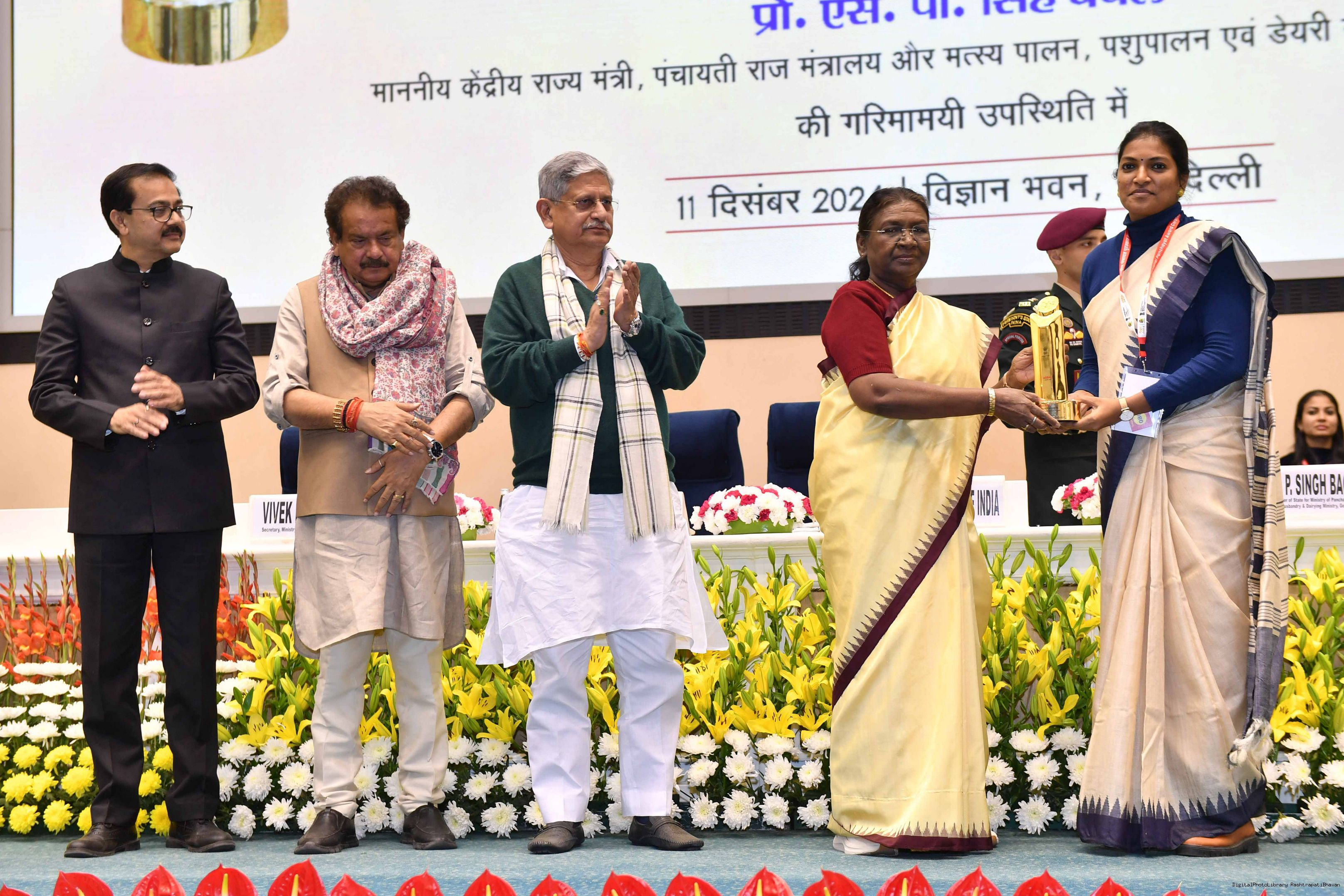 | Caption: | The President of India, Smt Droupadi Murmu conferred the National Panchayat Awards upon 45 awardees, selected across various categories, recognizing their exemplary contributions to the themes of sustainable and inclusive development, in New Delhi on December 11, 2024. |