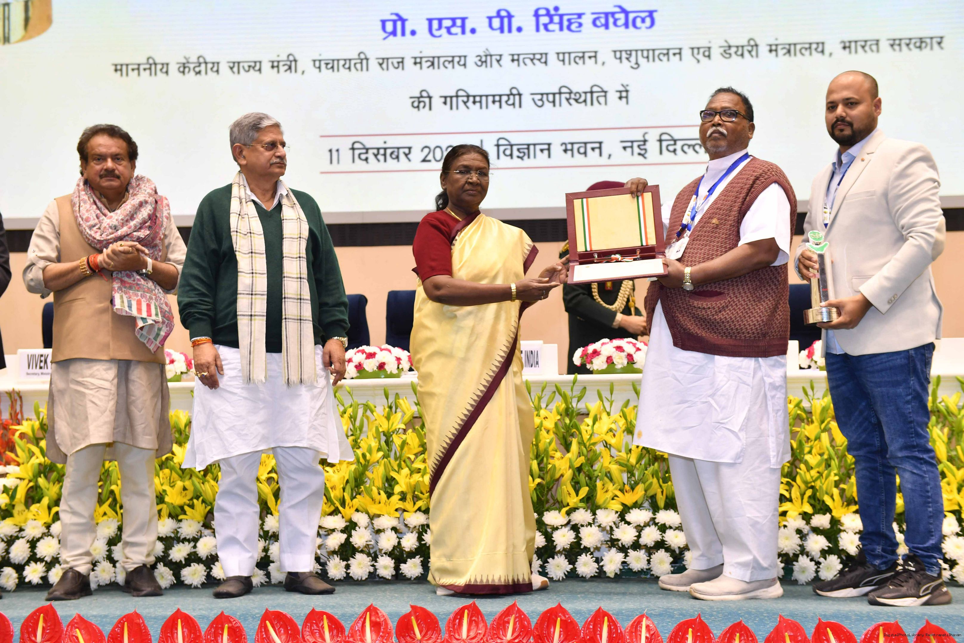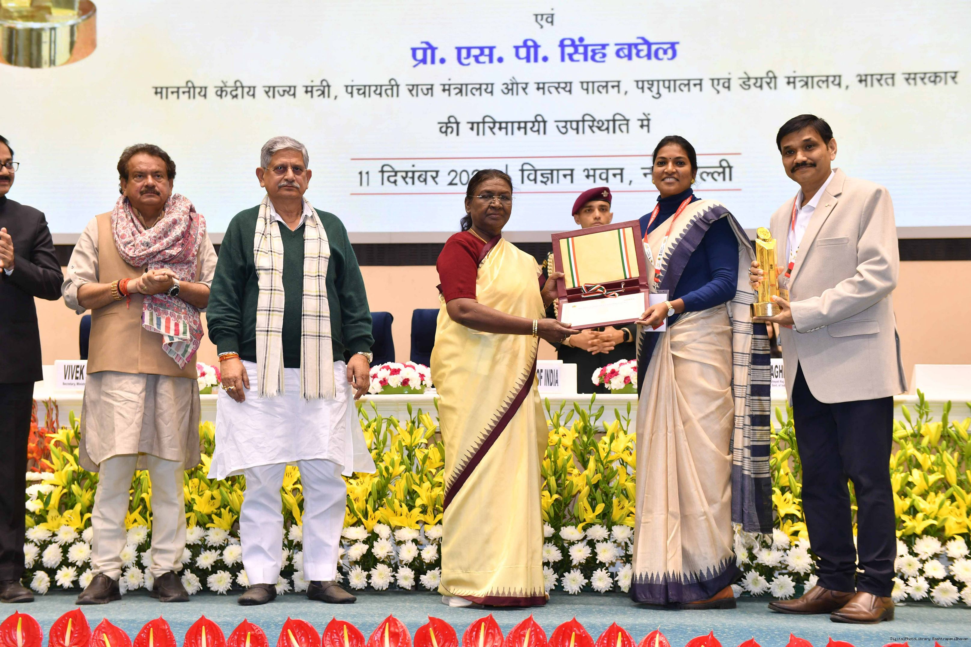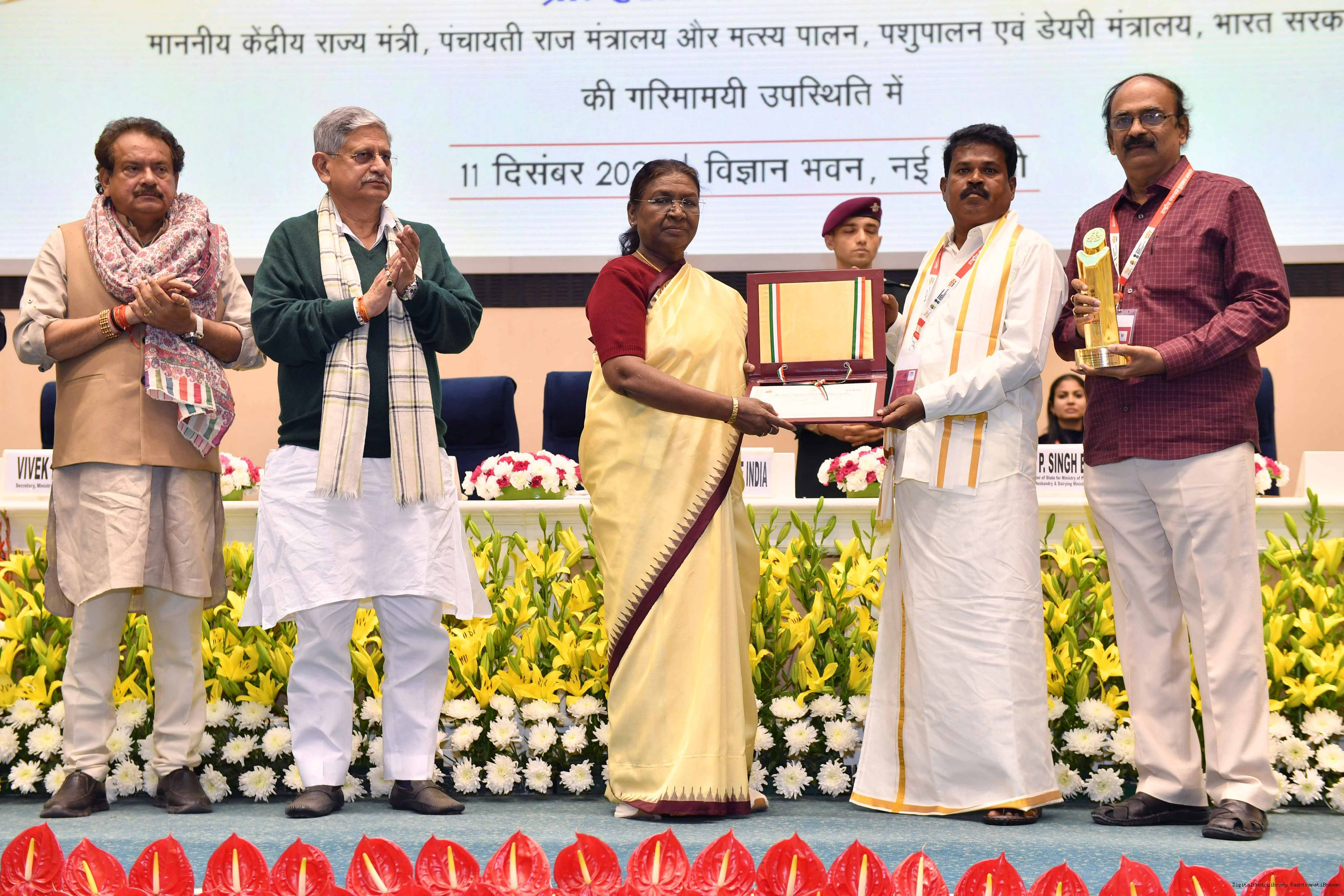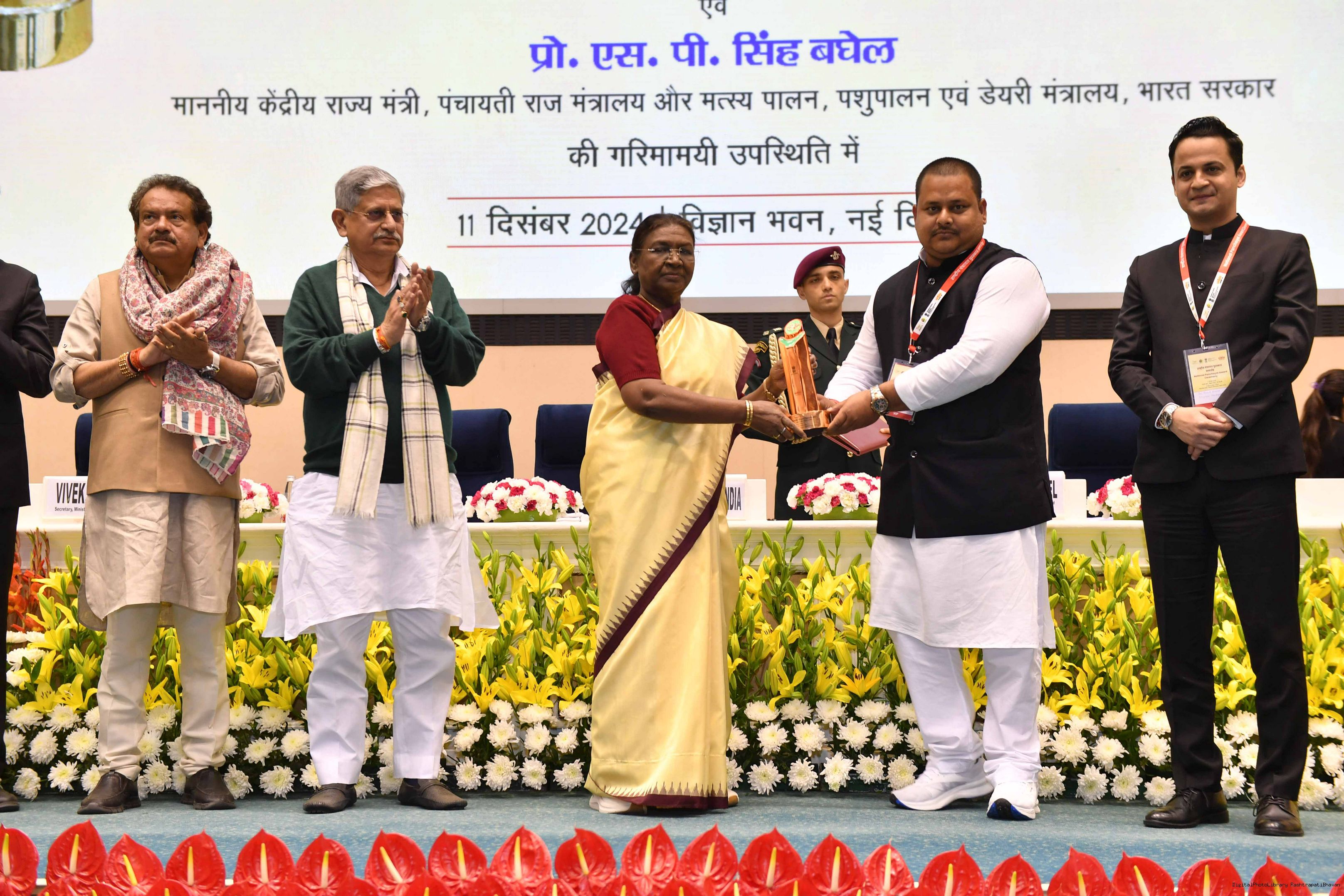 | Caption: | The President of India, Smt Droupadi Murmu conferred the National Panchayat Awards upon 45 awardees, selected across various categories, recognizing their exemplary contributions to the themes of sustainable and inclusive development, in New Delhi on December 11, 2024. |