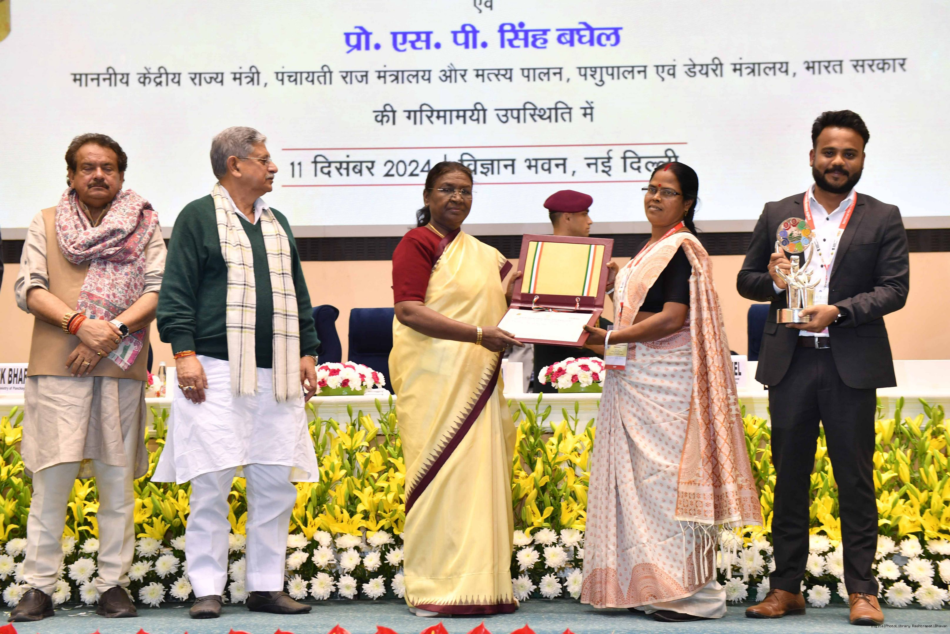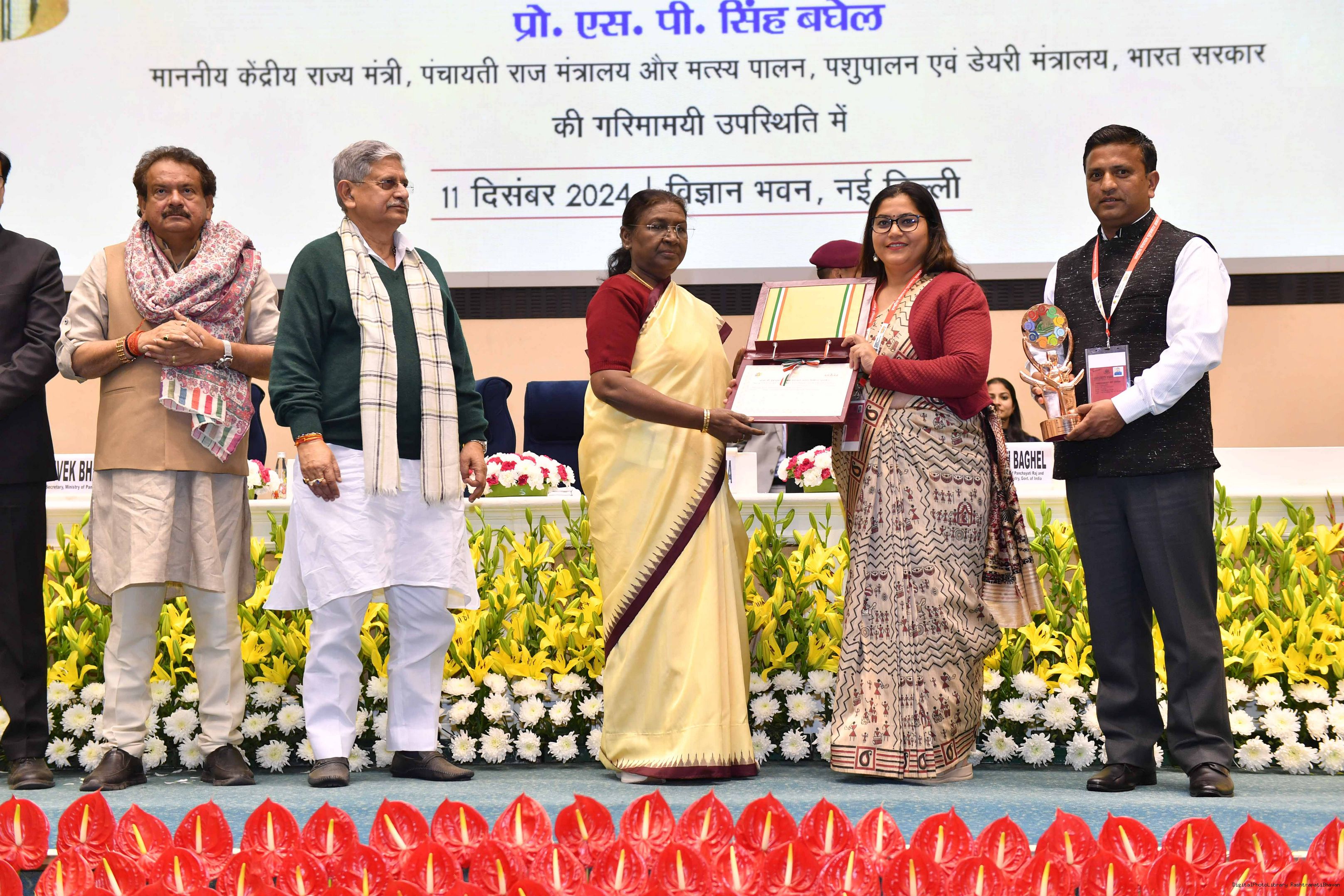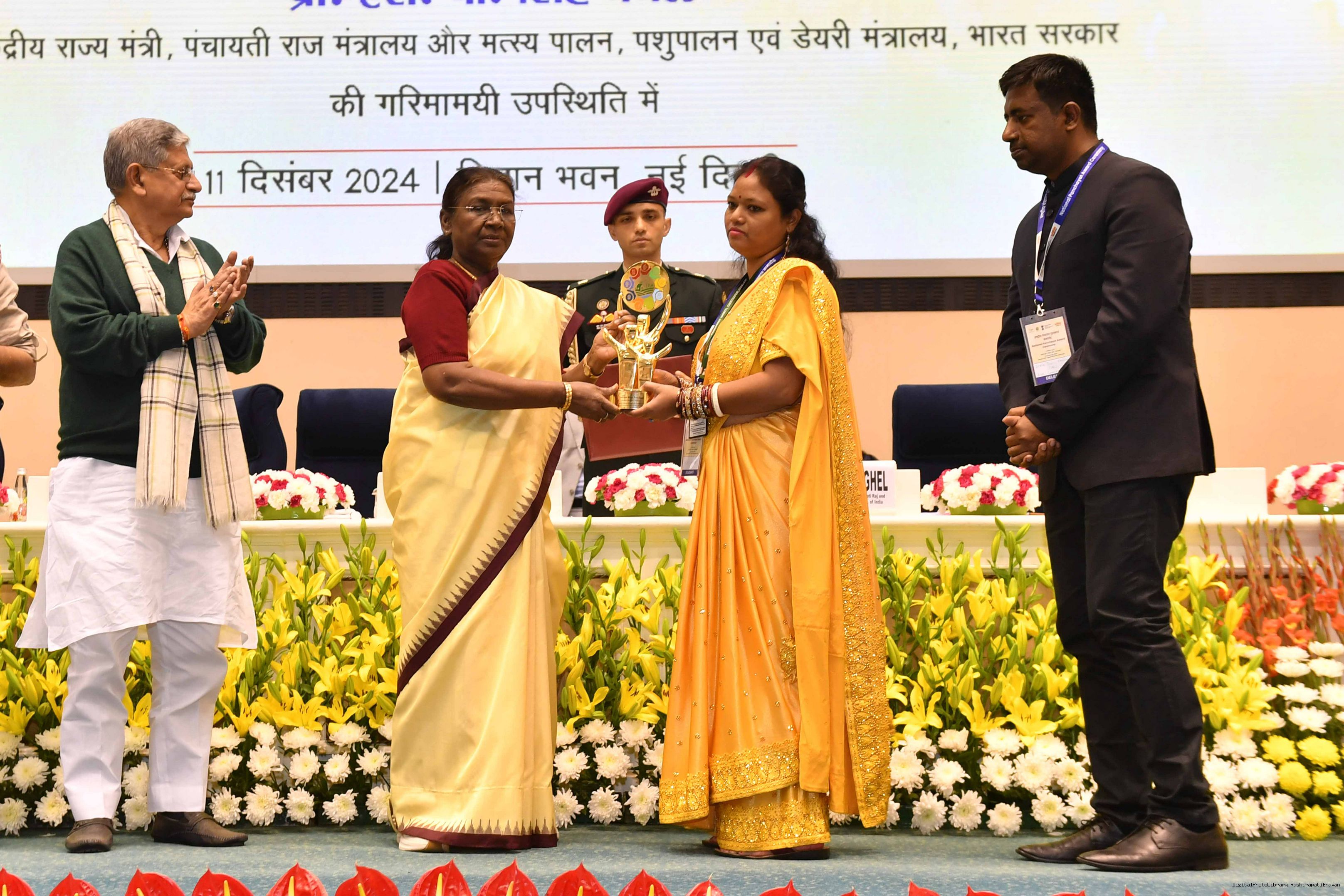 | Caption: | The President of India, Smt Droupadi Murmu conferred the National Panchayat Awards upon 45 awardees, selected across various categories, recognizing their exemplary contributions to the themes of sustainable and inclusive development, in New Delhi on December 11, 2024. |