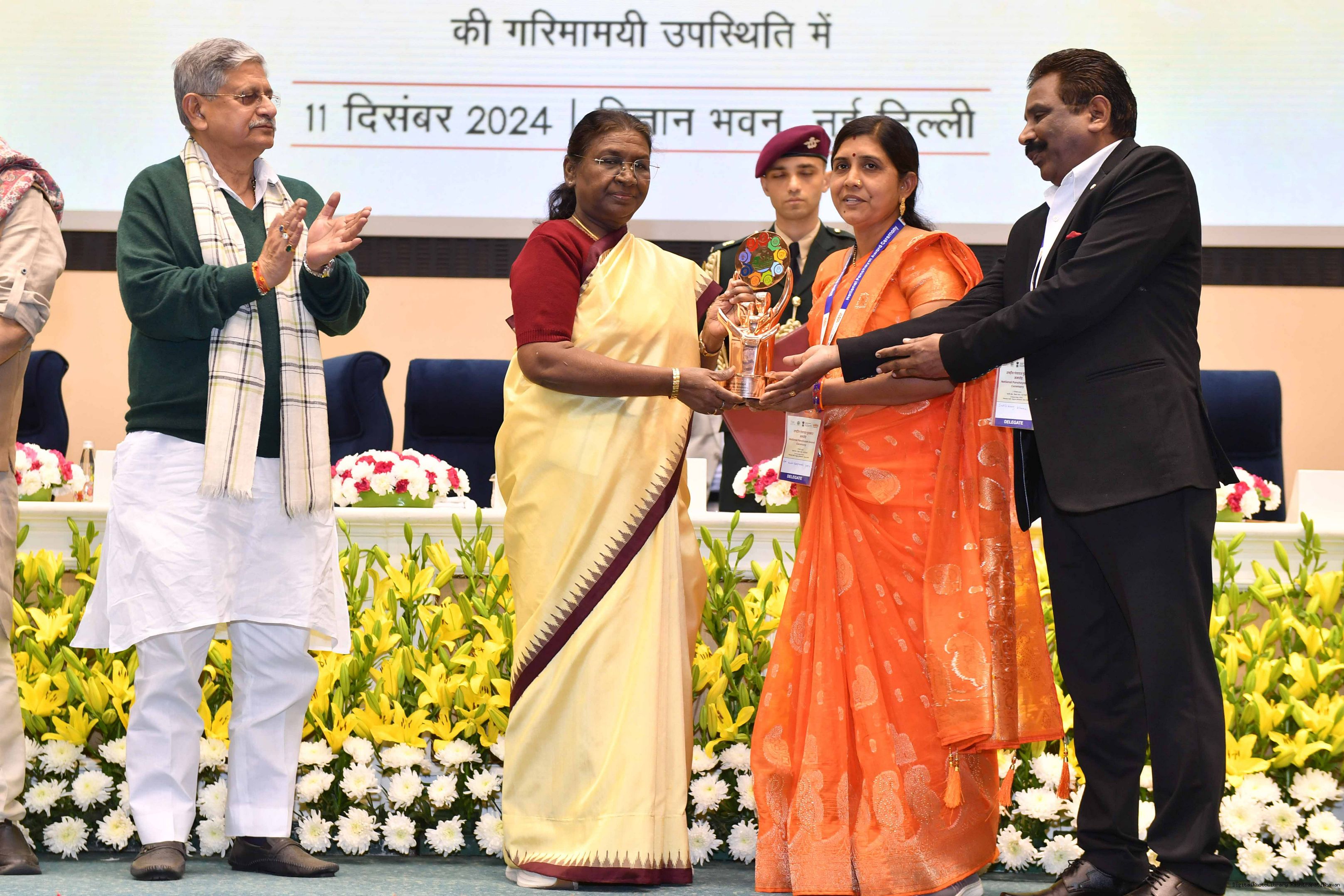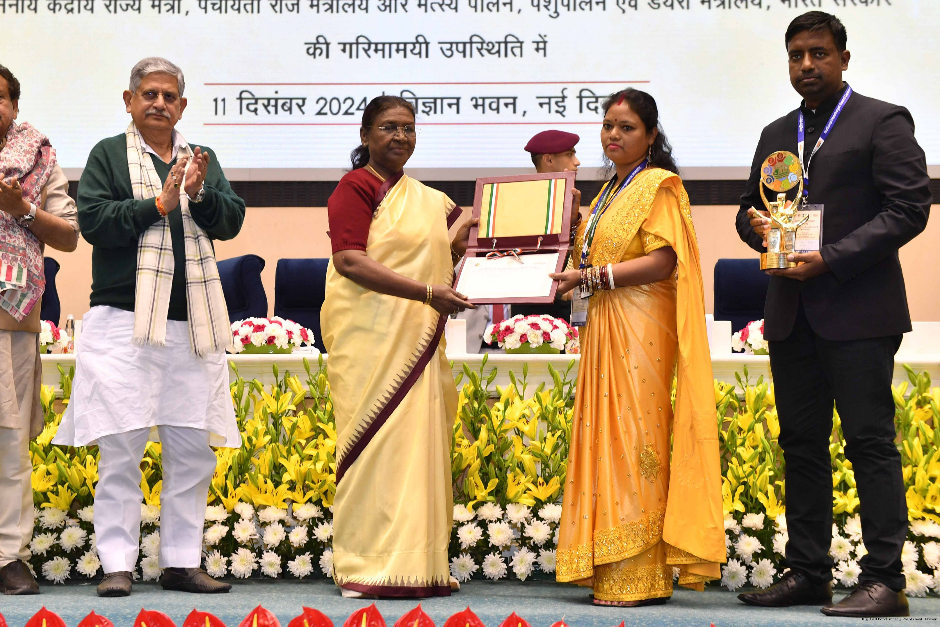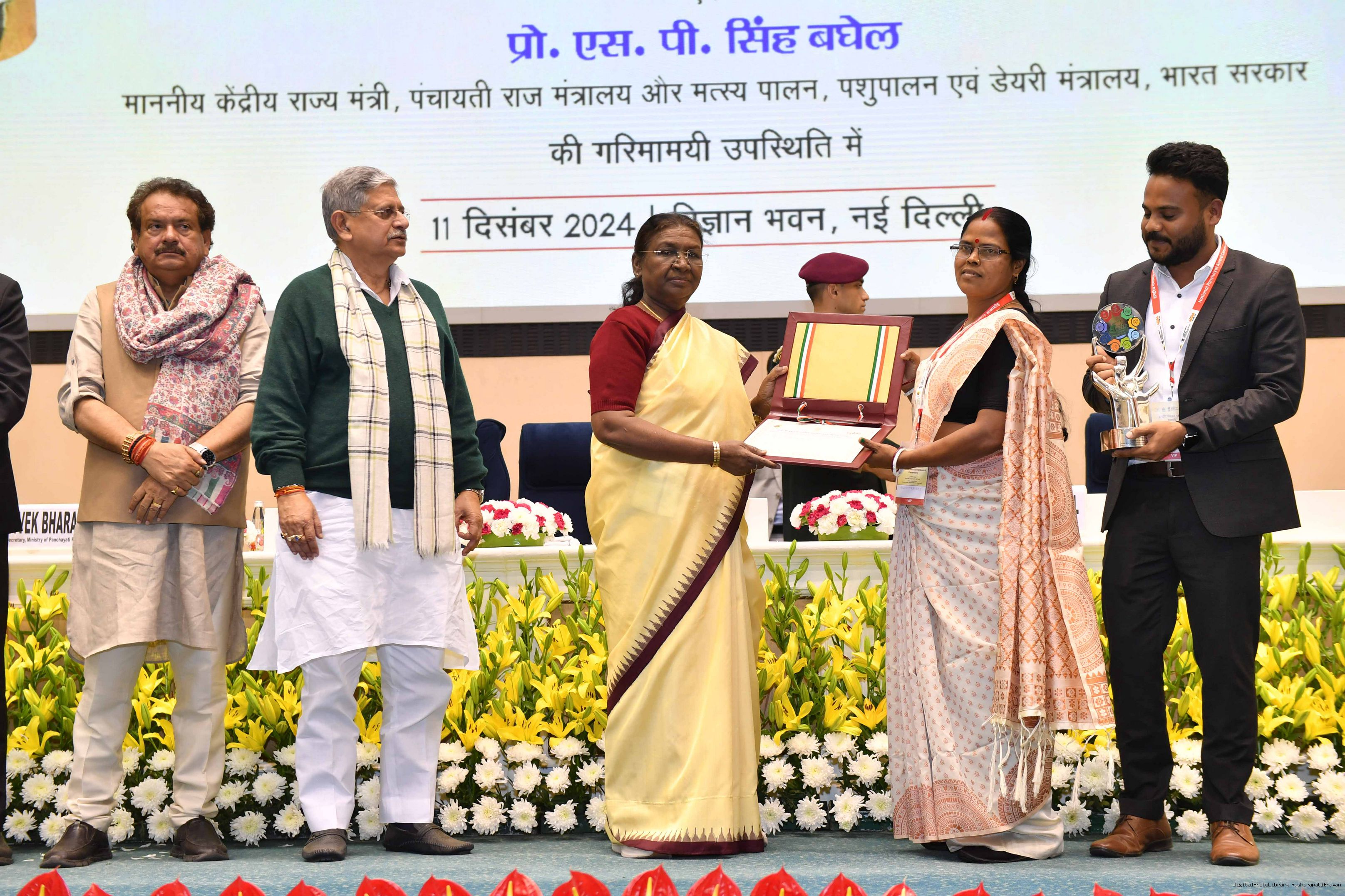 | Caption: | The President of India, Smt Droupadi Murmu conferred the National Panchayat Awards upon 45 awardees, selected across various categories, recognizing their exemplary contributions to the themes of sustainable and inclusive development, in New Delhi on December 11, 2024. |