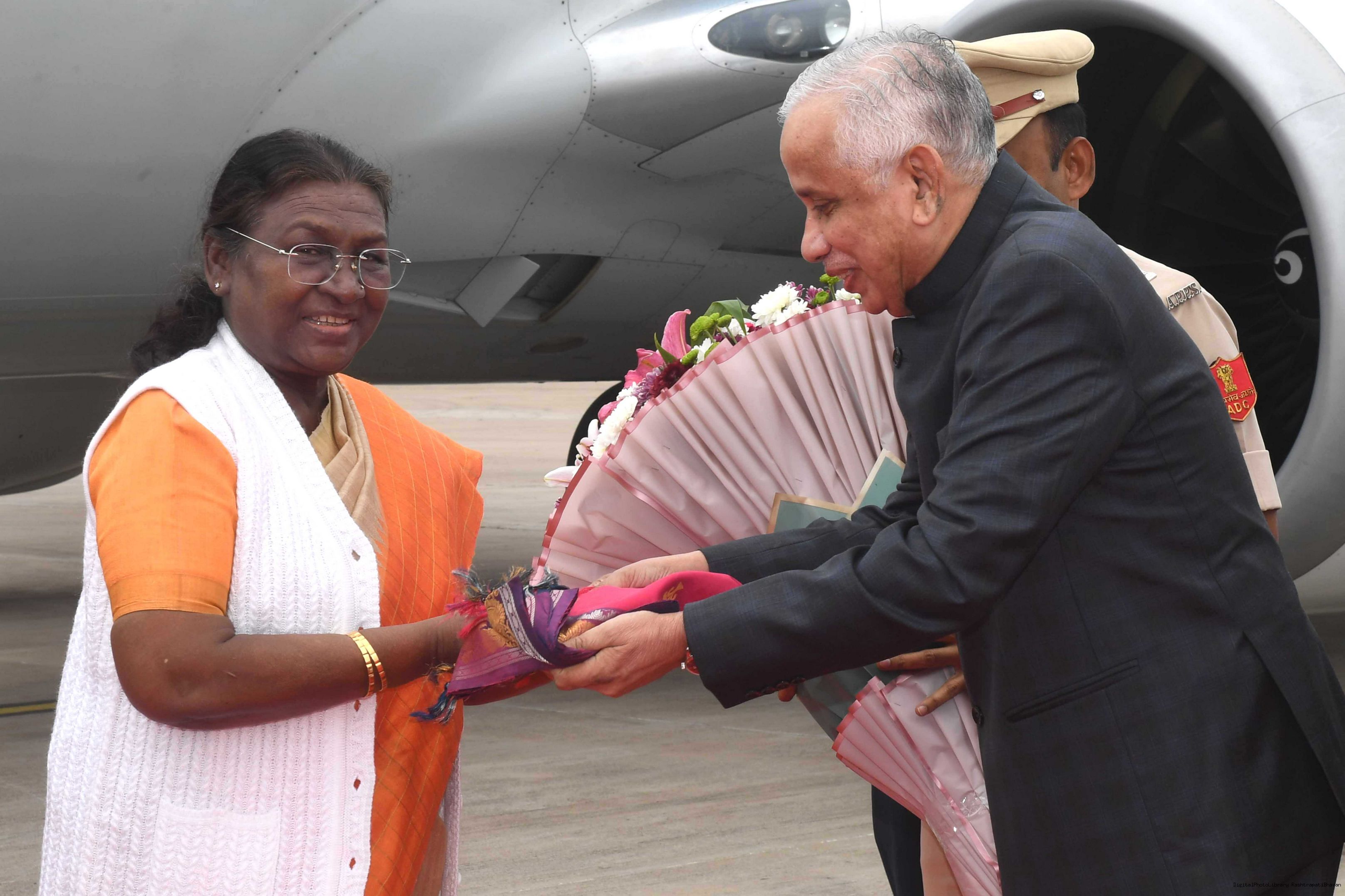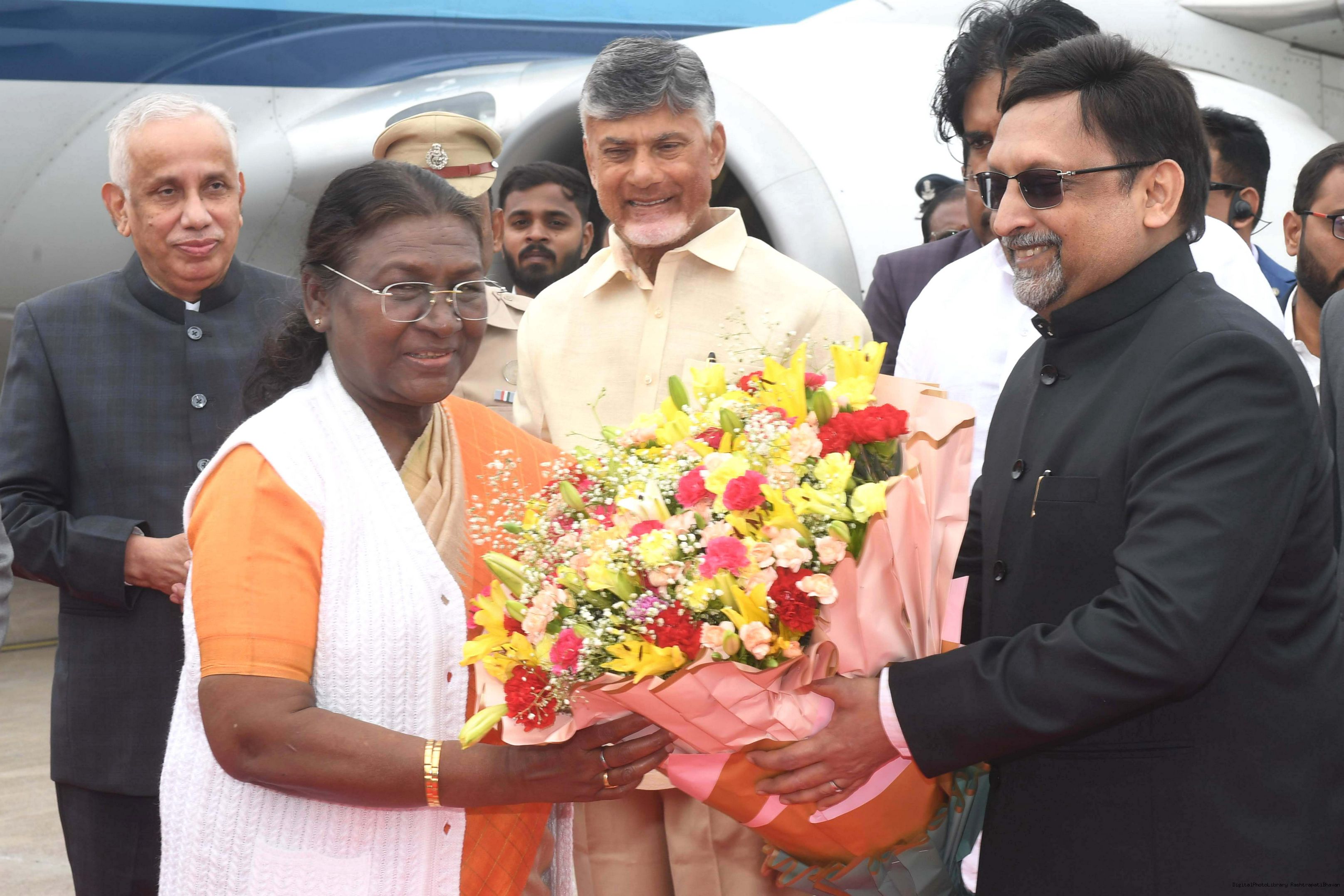 | Caption: | The Governor of Andhra Pradesh, Shri S. Abdul Nazeer, Chief Minister Shri N. Chandrababu Naidu and Deputy Chief Minister Shri K. Pawan Kalyan received the President of India Smt. Droupadi Murmu on her arrival at Vijayawada, Andhra Pradesh on December 17, 2024. |