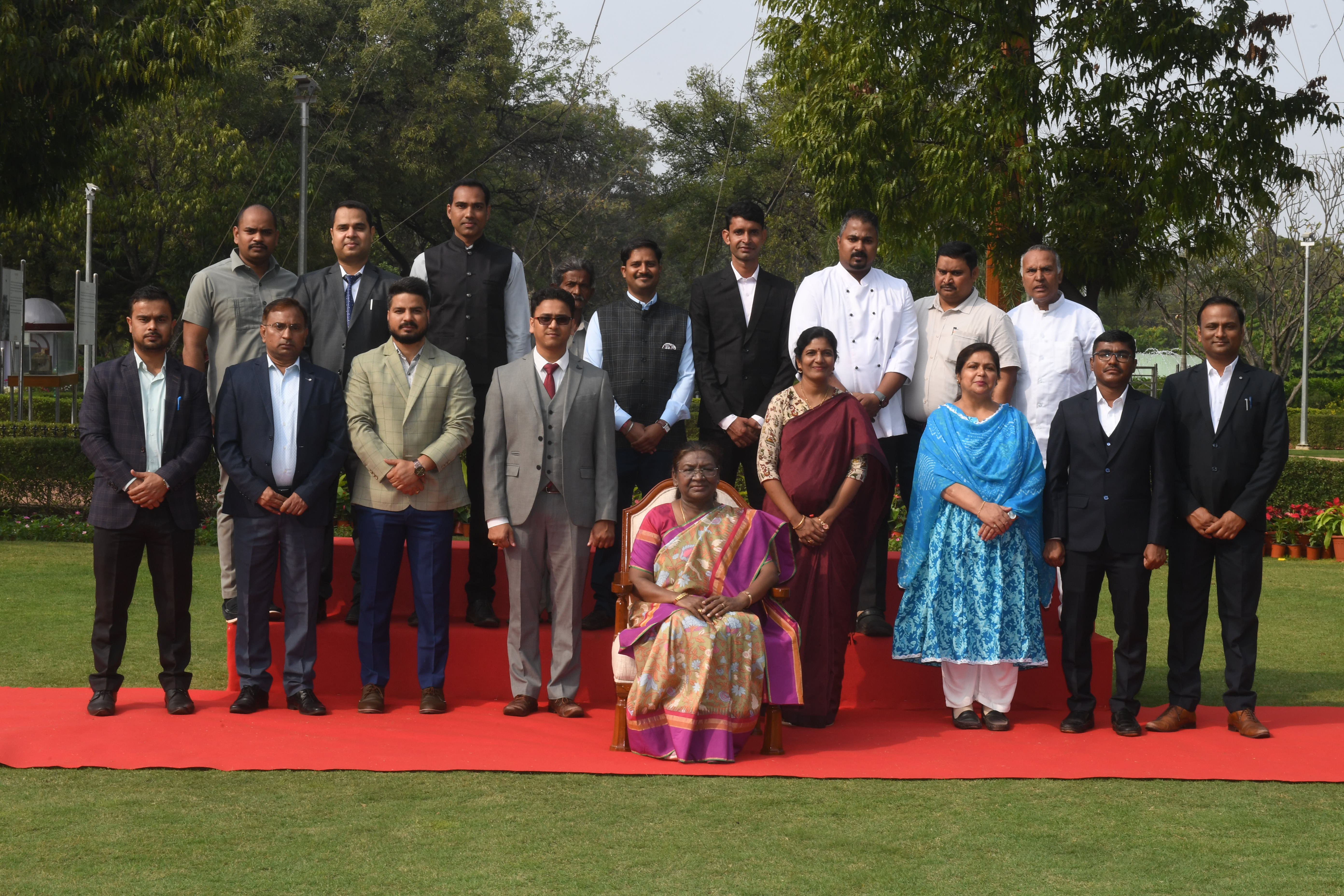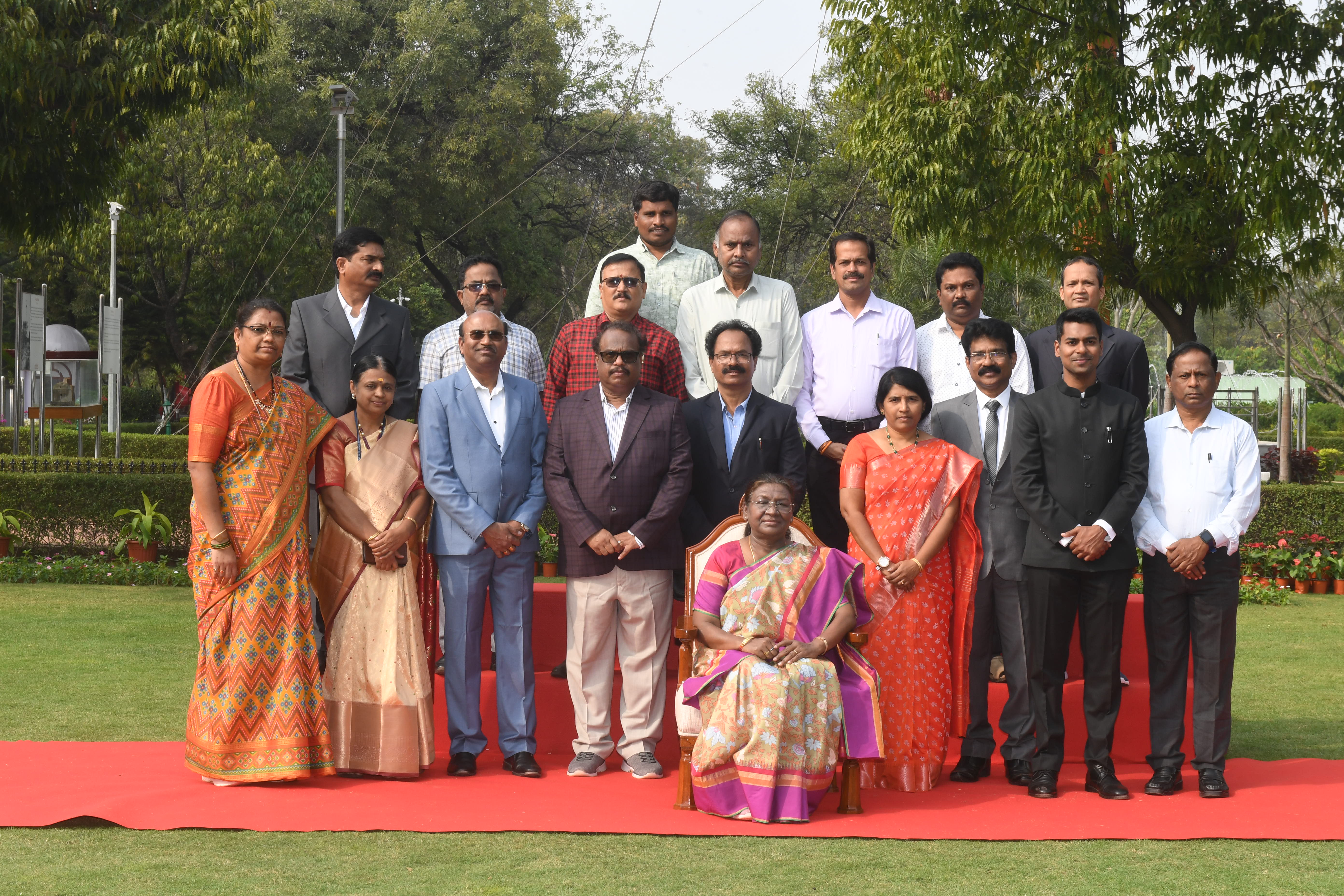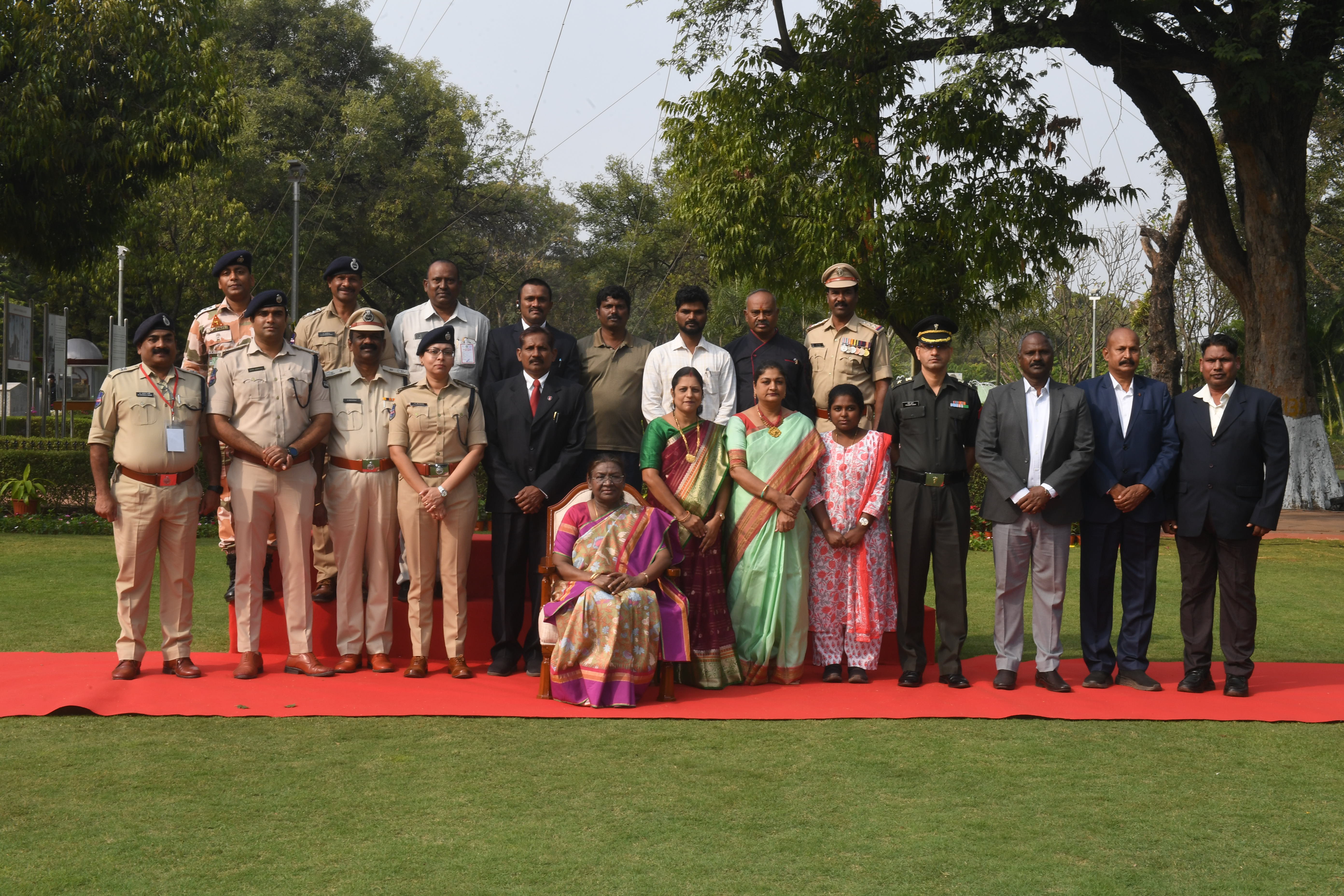 | Caption: | The President of India, Smt Droupadi Murmu posing a Group Photographs at Rashtrapati Nilayam, Bolarum on December 21, 2024. |