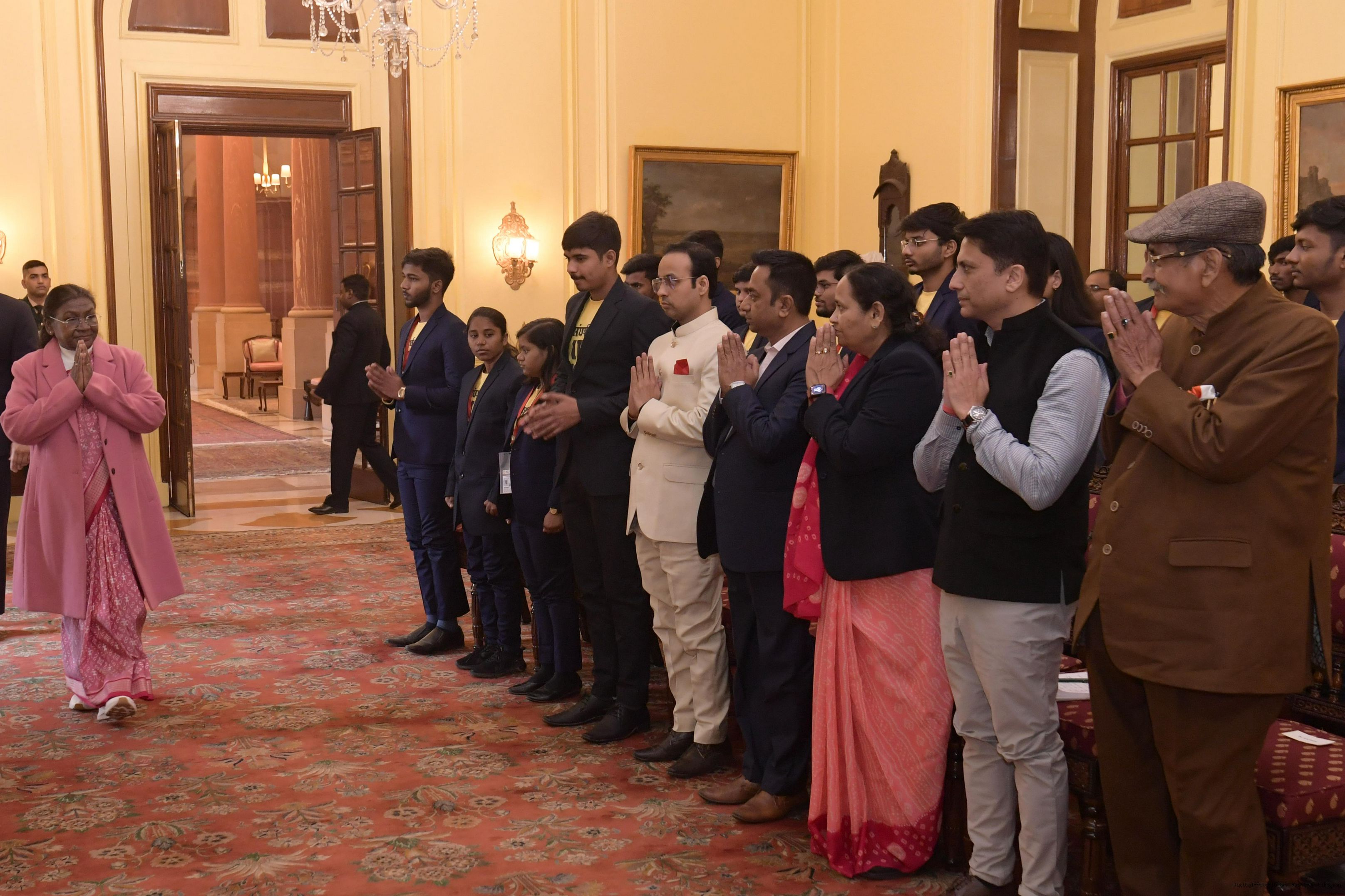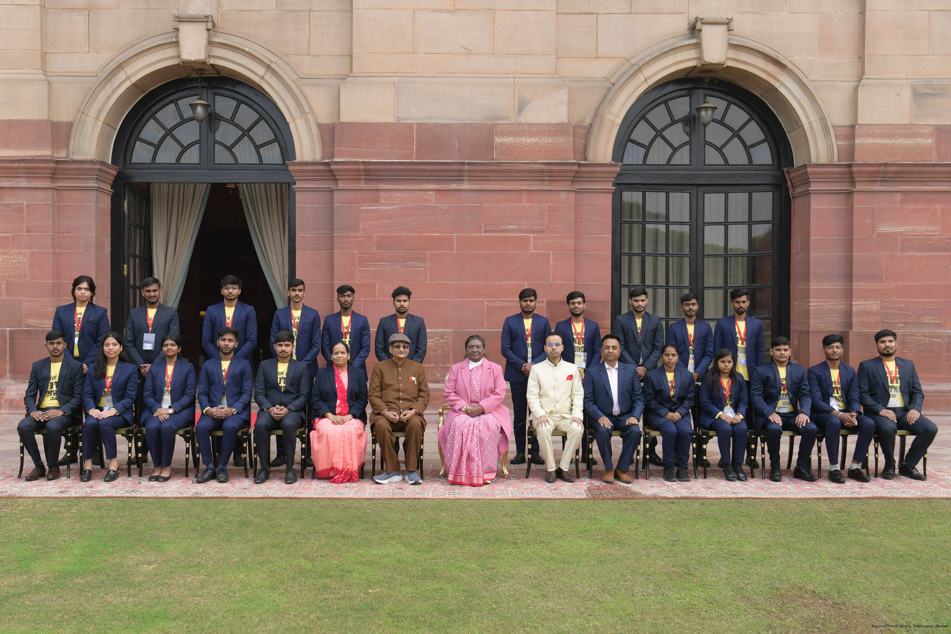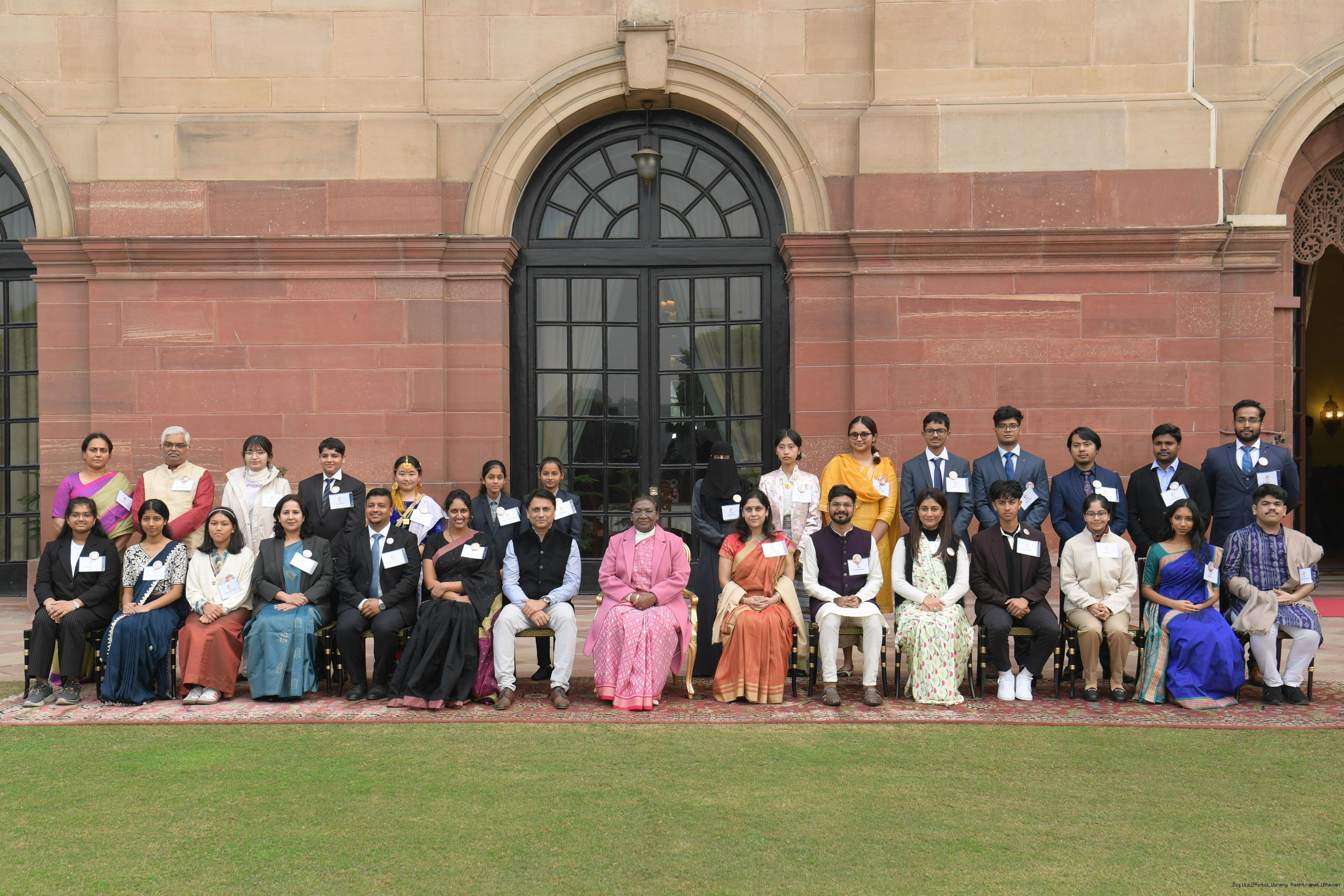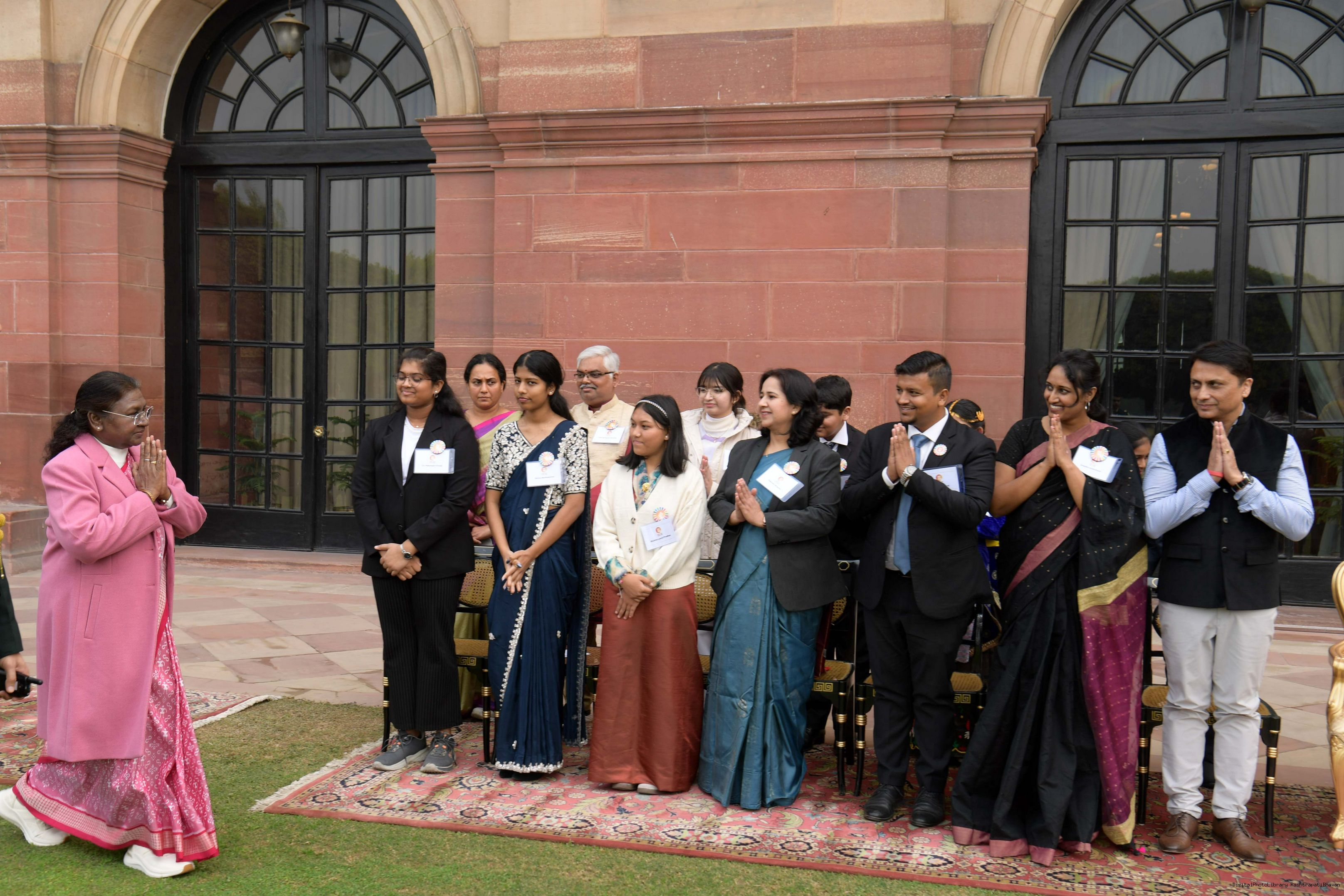 | Caption: | The President of India, Smt Droupadi Murmu met and posing a group photograph opportunity with Two group comprising of Dr.R.K. Sinha, former MP (Rajya Sabha) Ms. Deepika Venkatesh at Rashtrapati Bhavan on December 24, 2024. |