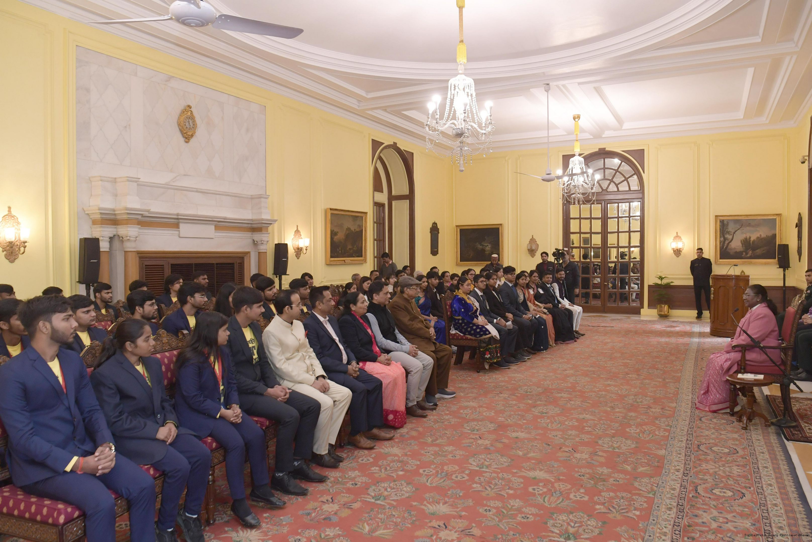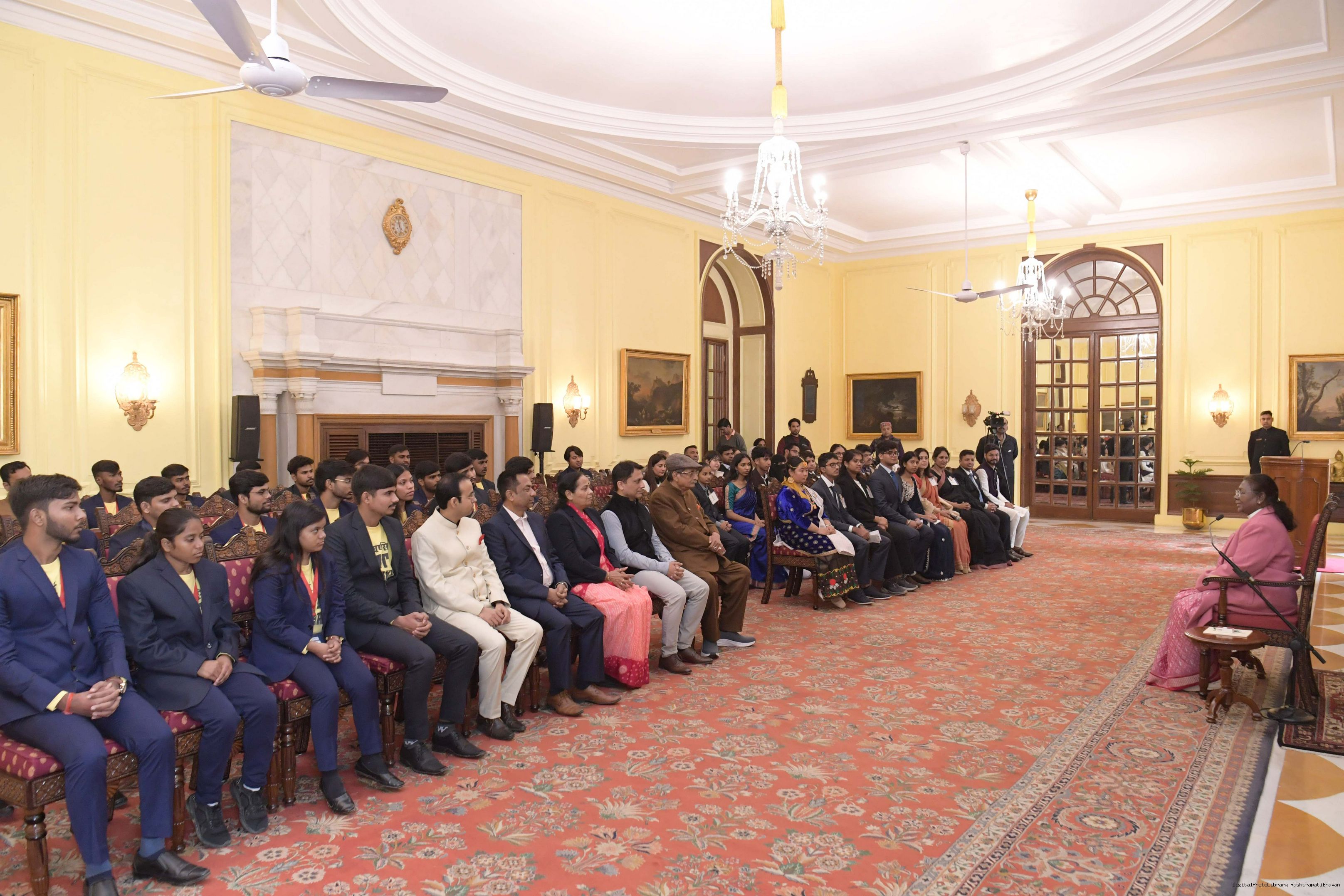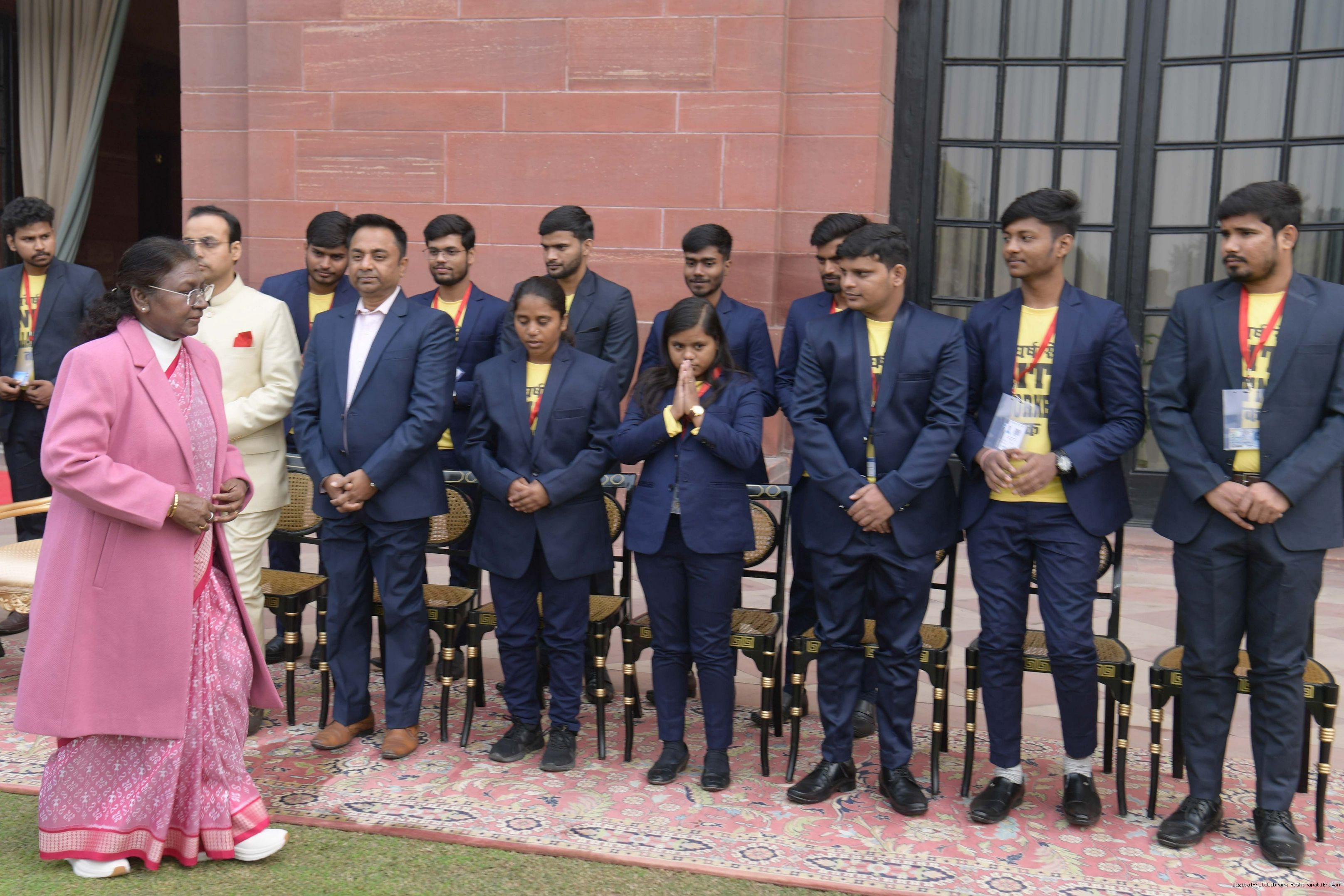 | Caption: | The President of India, Smt Droupadi Murmu met and posing a group photograph opportunity with Two group comprising of Dr.R.K. Sinha, former MP (Rajya Sabha) Ms. Deepika Venkatesh at Rashtrapati Bhavan on December 24, 2024. |