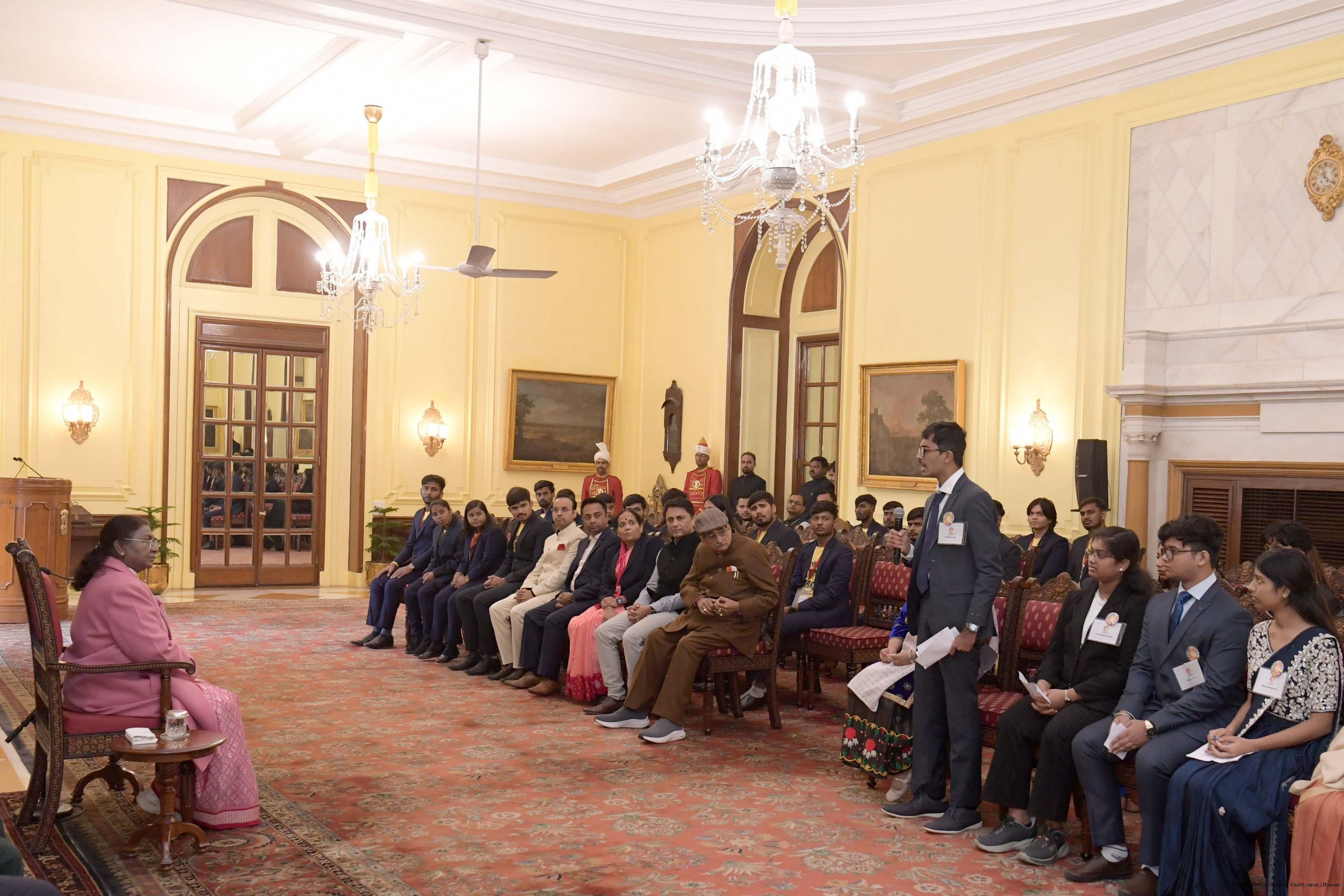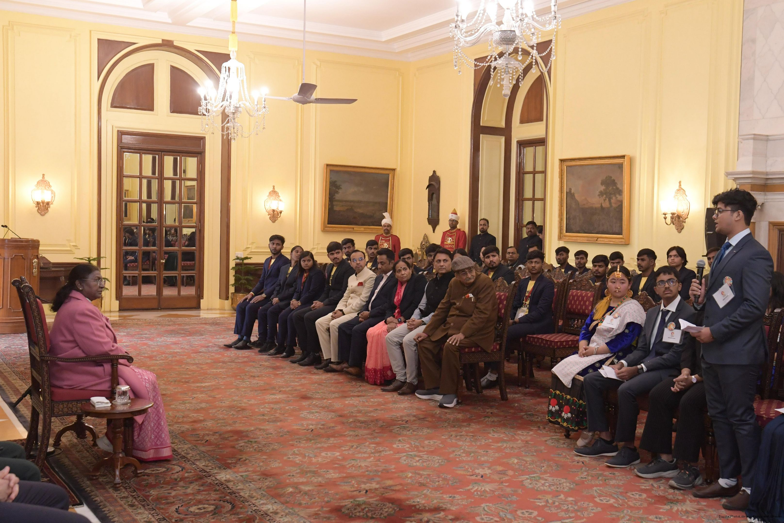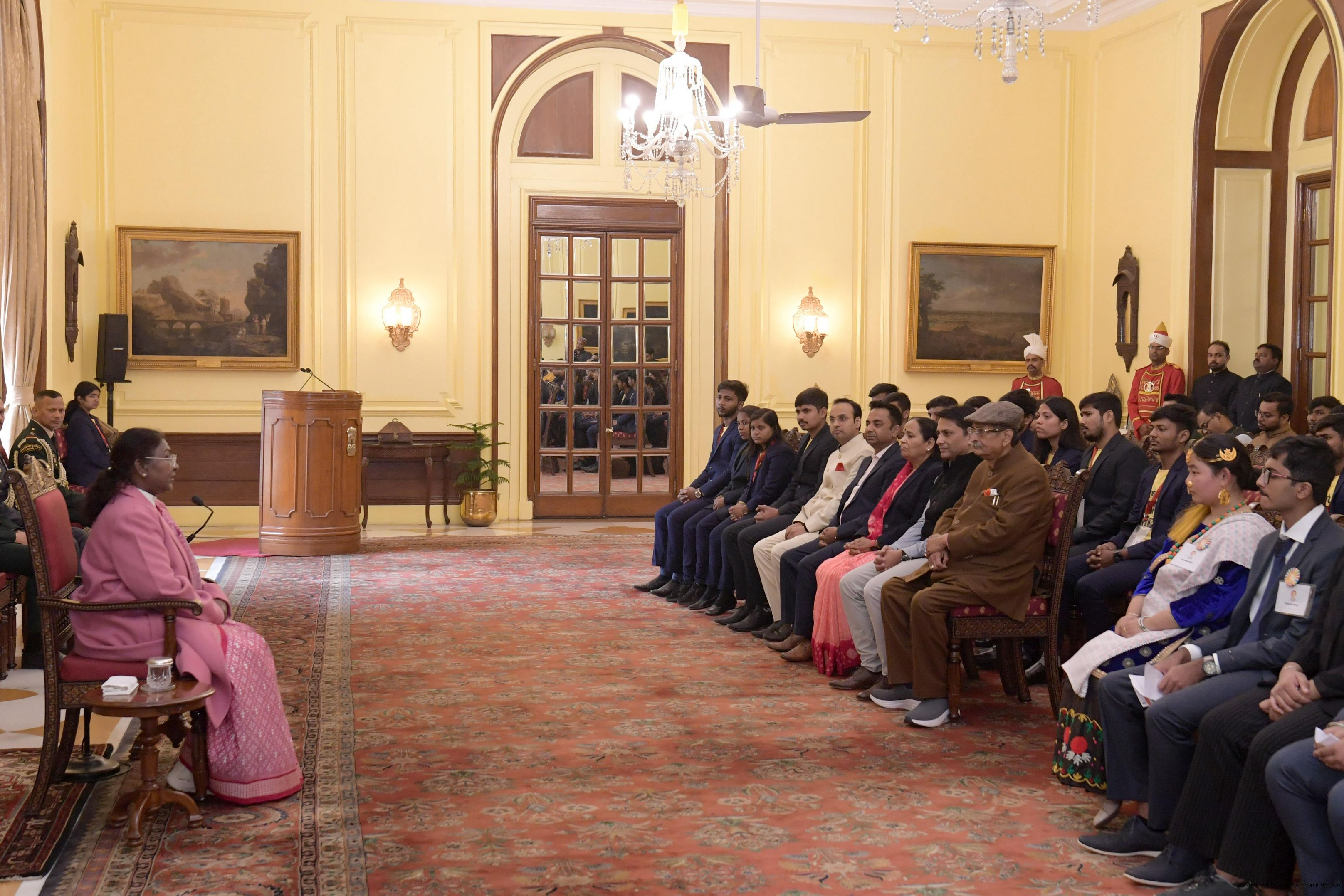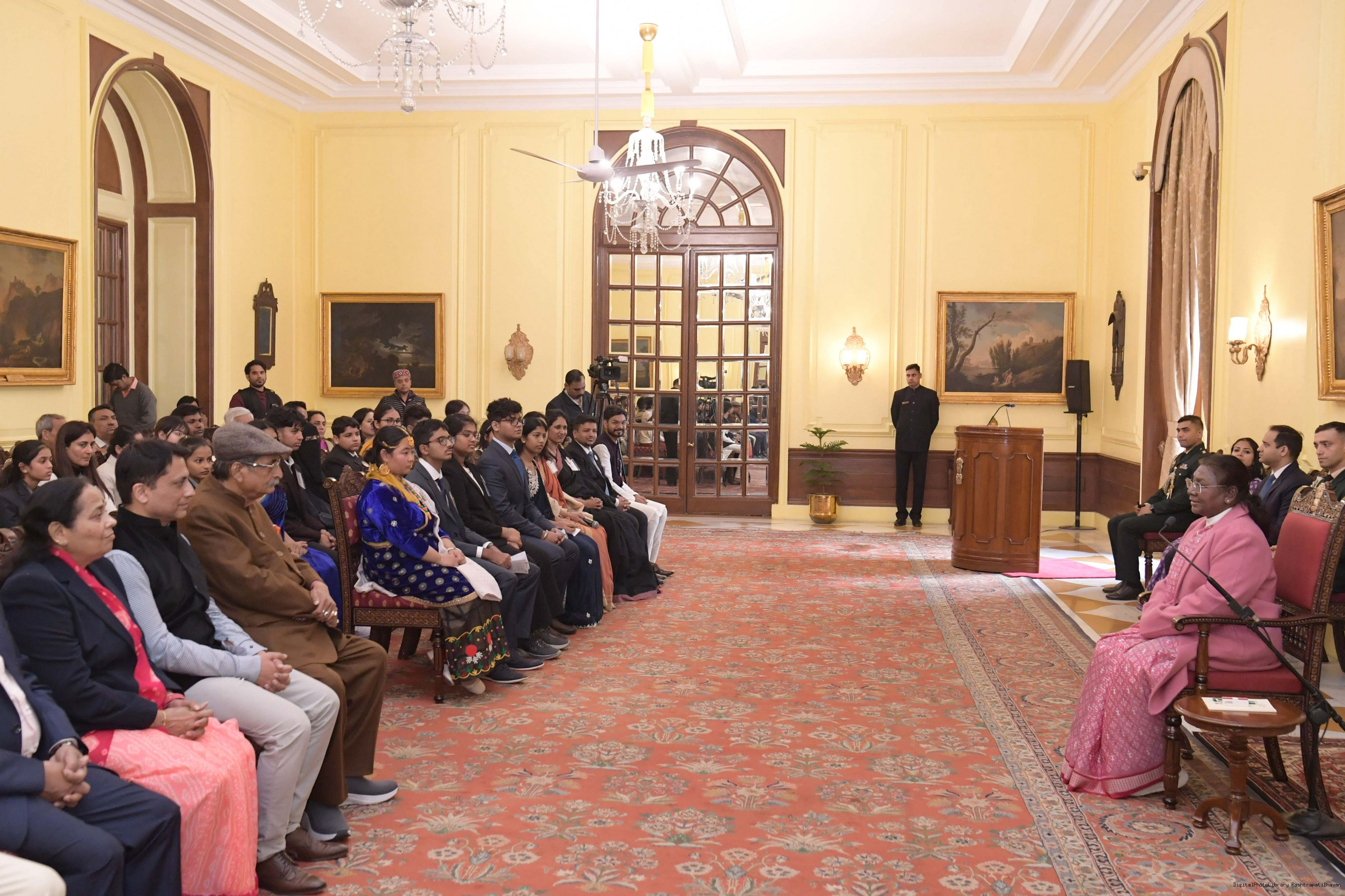 | Caption: | The President of India, Smt Droupadi Murmu met and posing a group photograph opportunity with Two group comprising of Dr.R.K. Sinha, former MP (Rajya Sabha) Ms. Deepika Venkatesh at Rashtrapati Bhavan on December 24, 2024. |