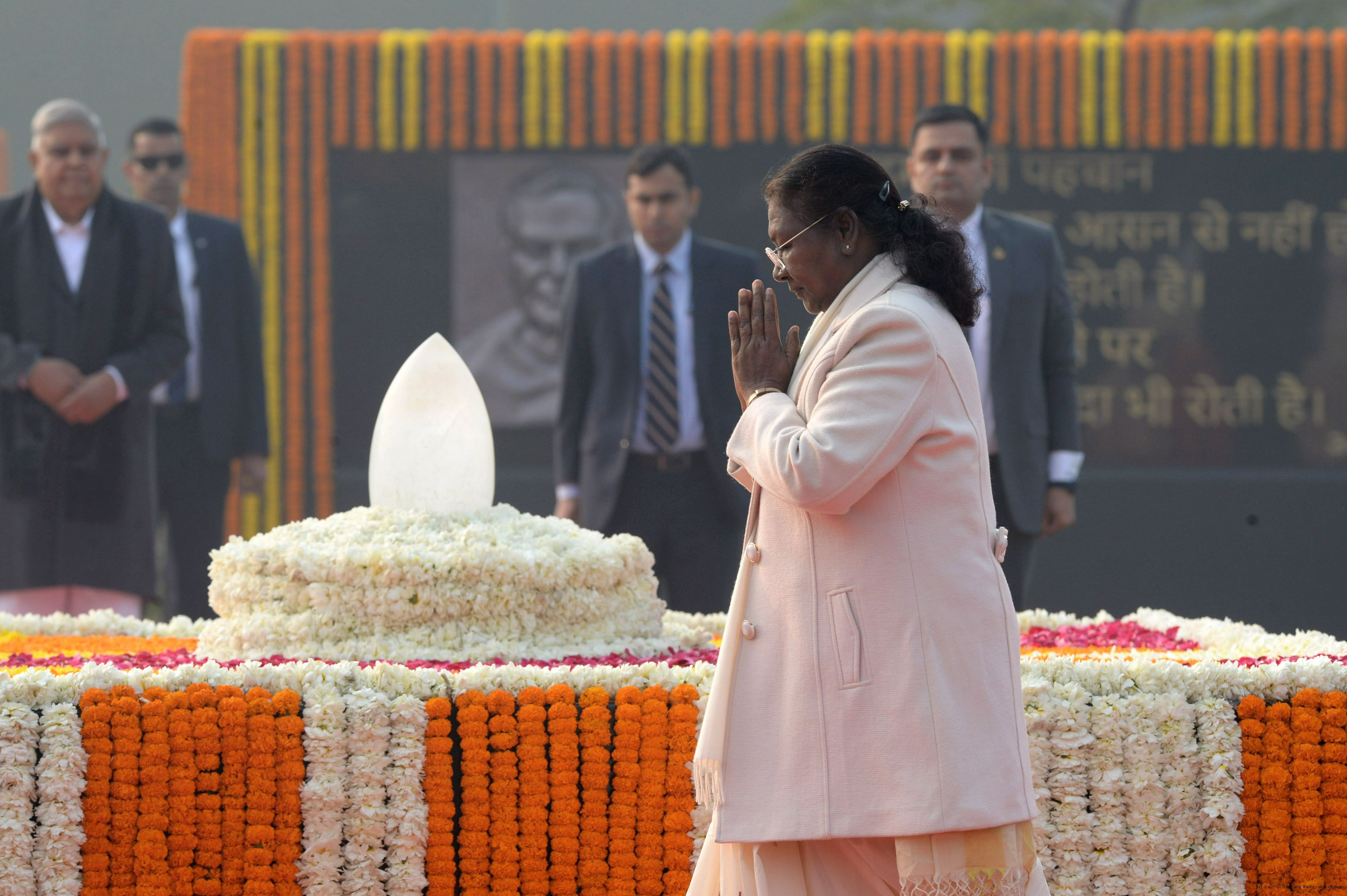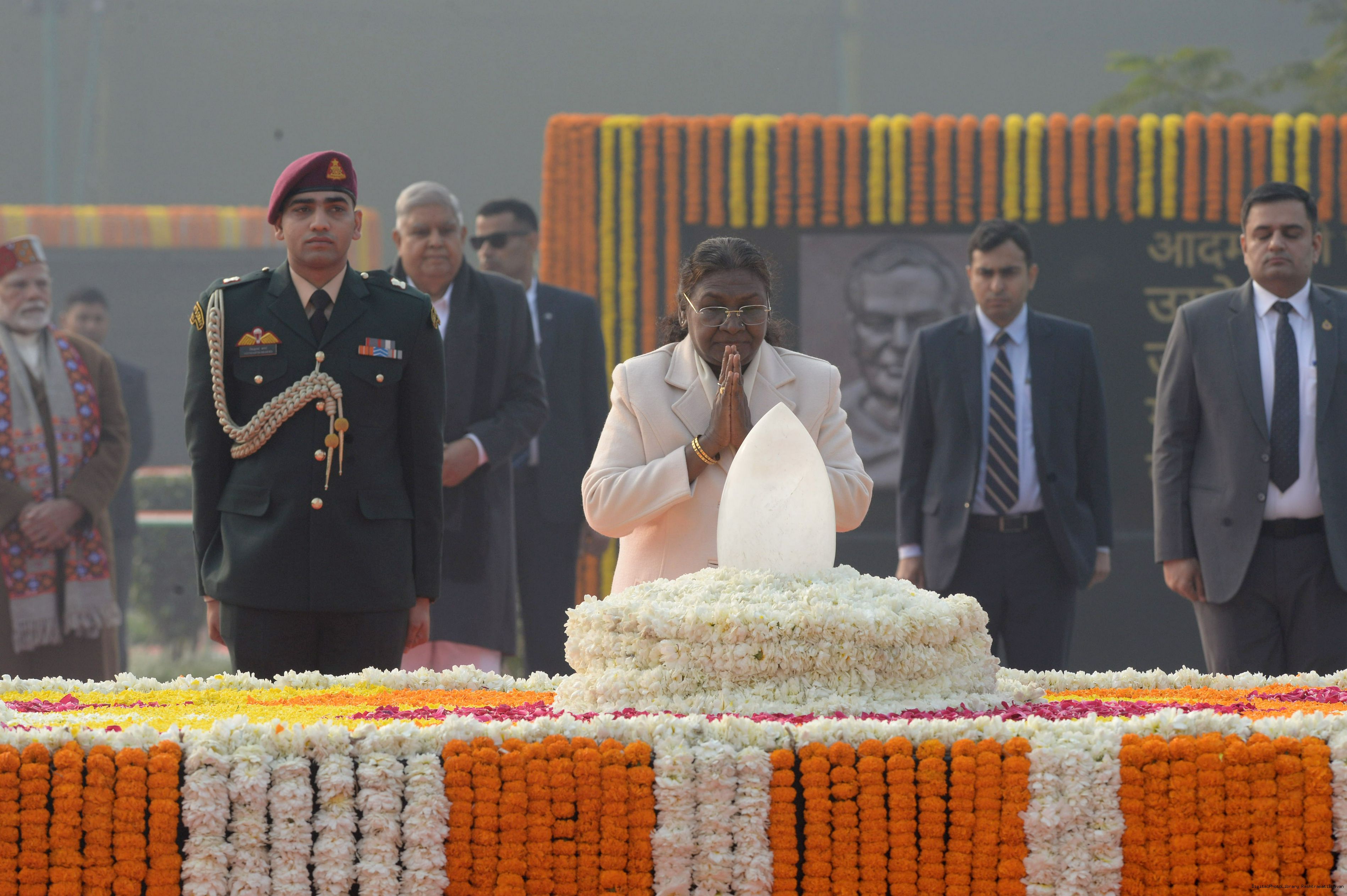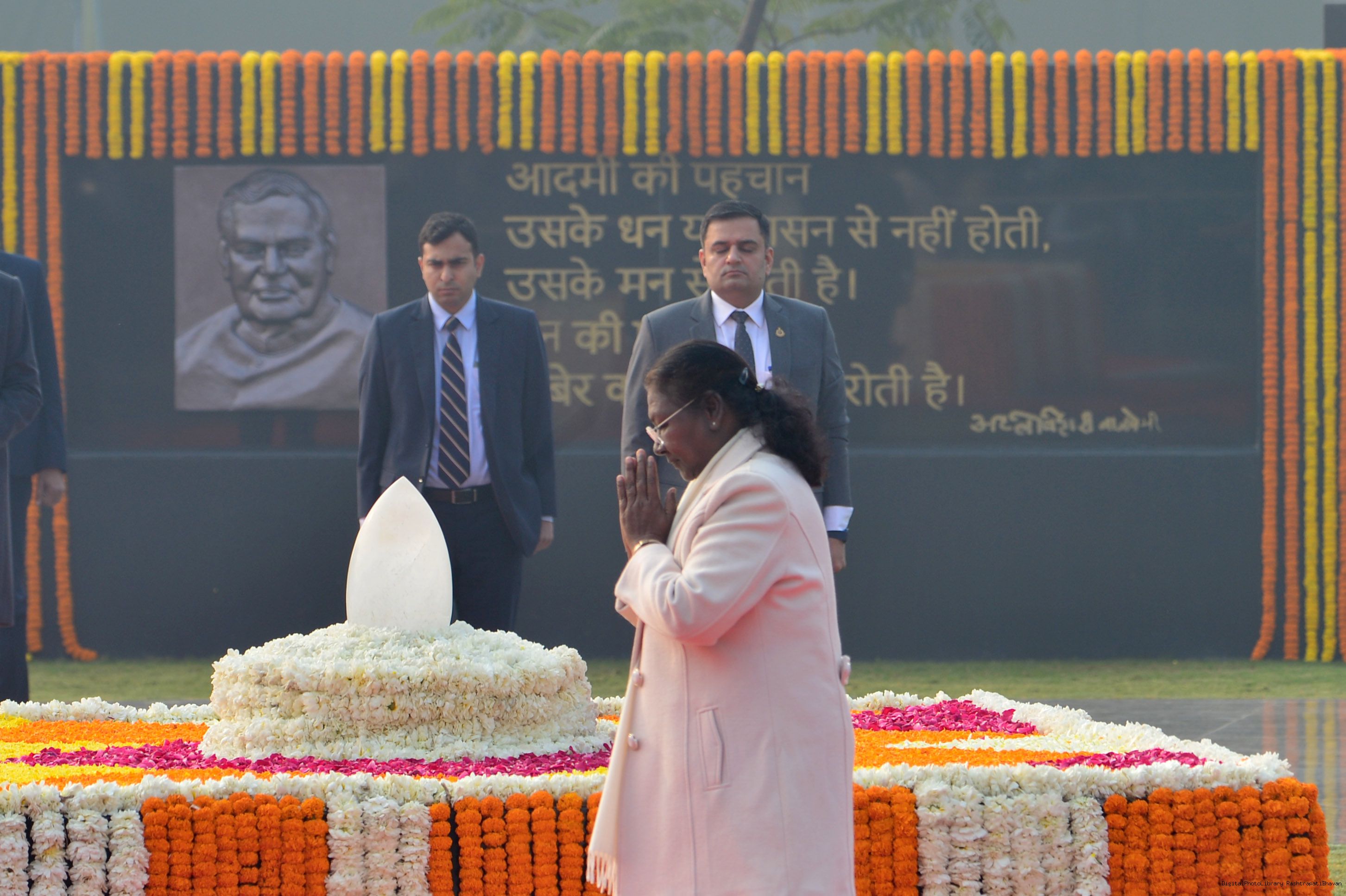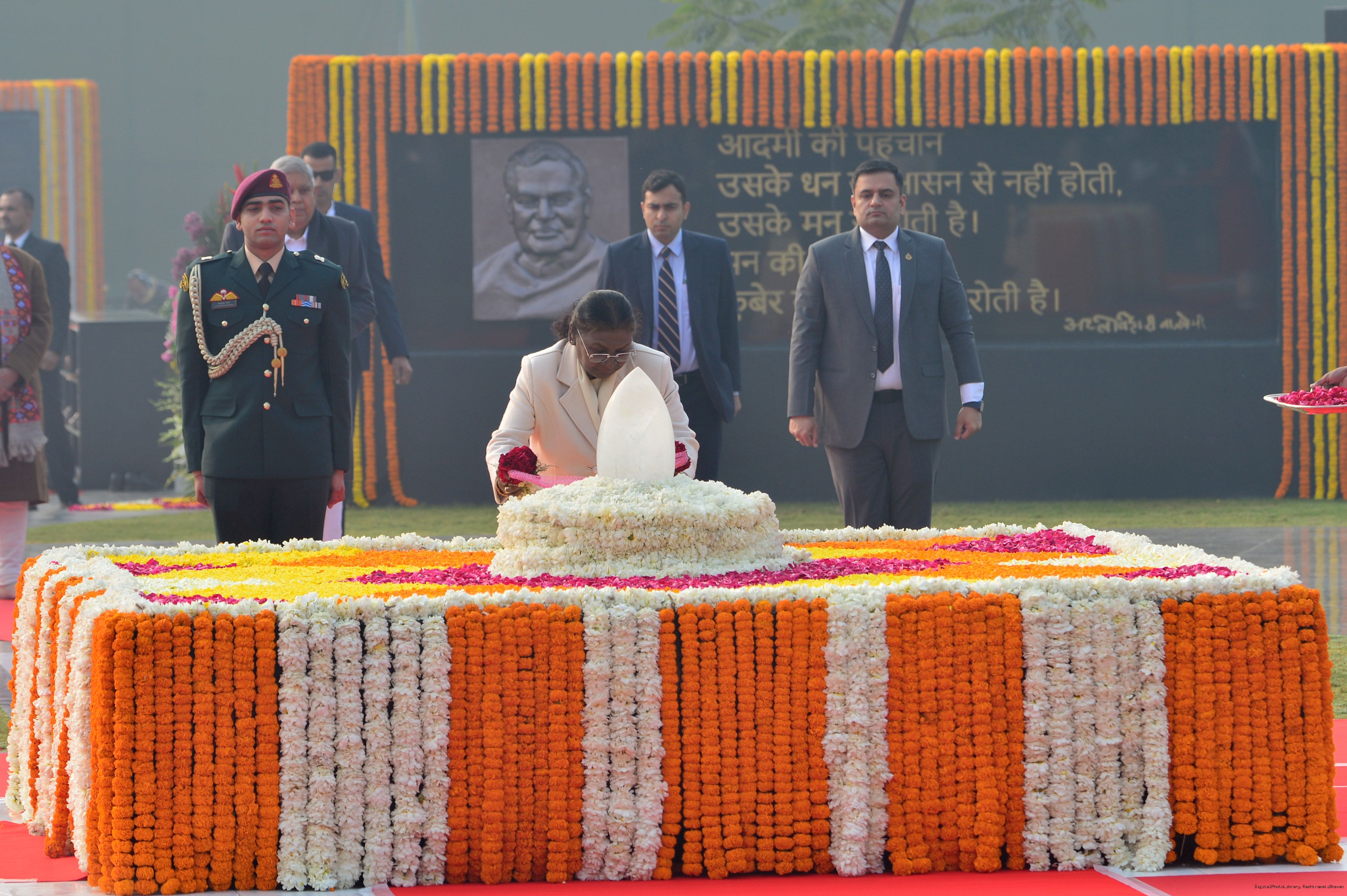 | Caption: | The President of India Smt. Droupadi Murmu paid floral tributes to former Prime Minister of India Shri Atal Bihari Vajpayee on his 100th birth anniversary at his Samadhi 'Sadaiv Atal' in New Delhi on December 25, 2024. |
