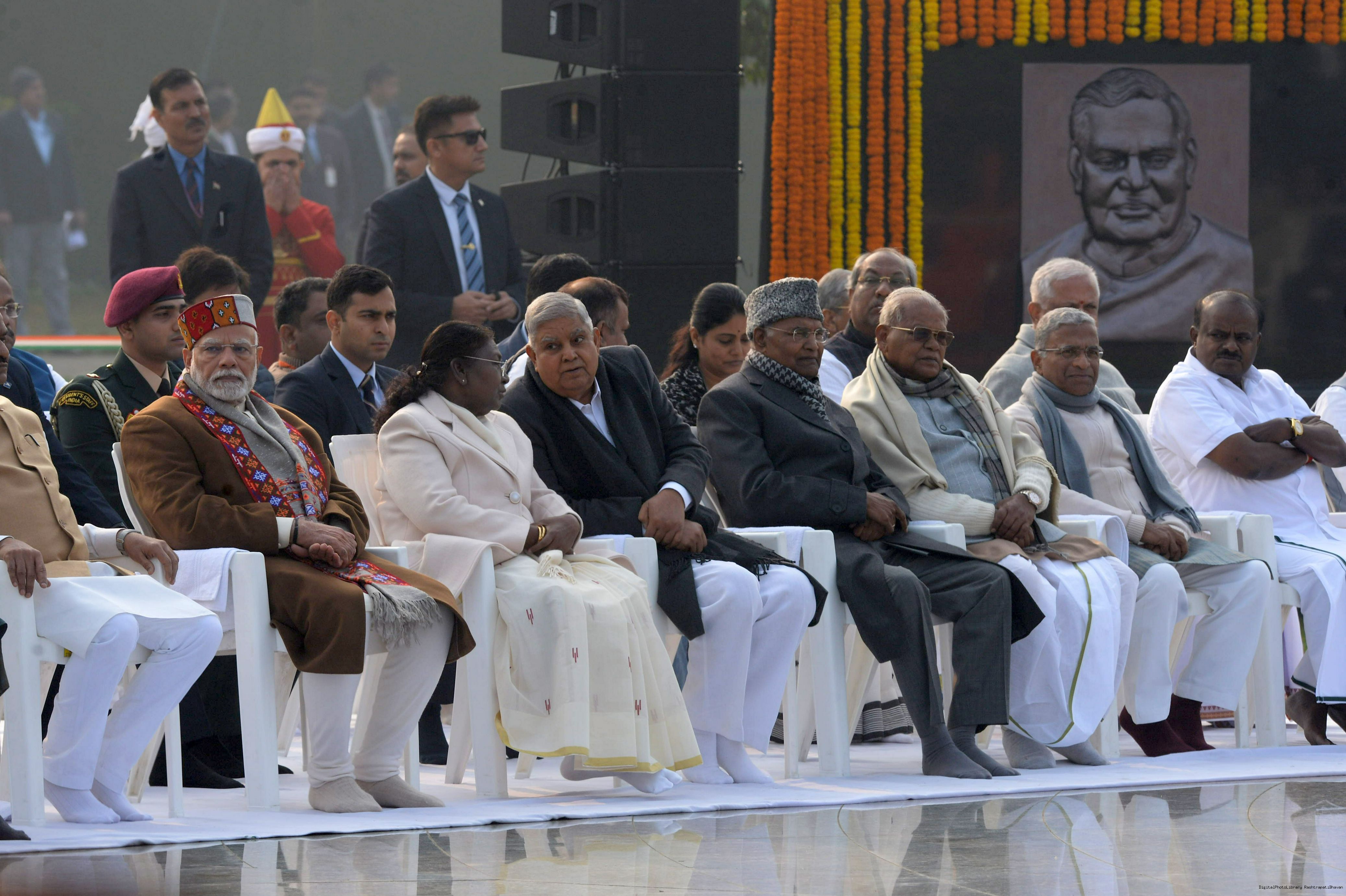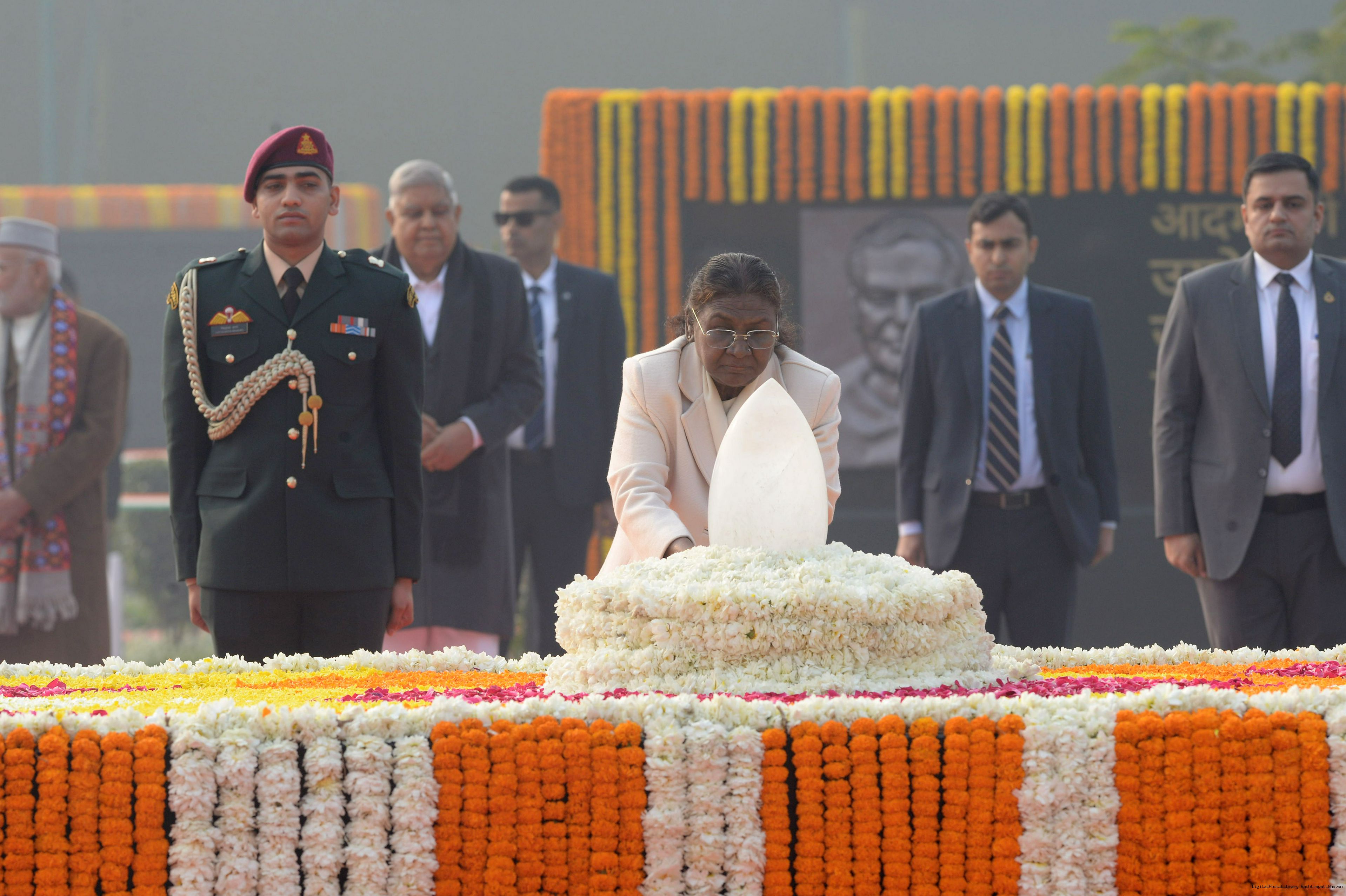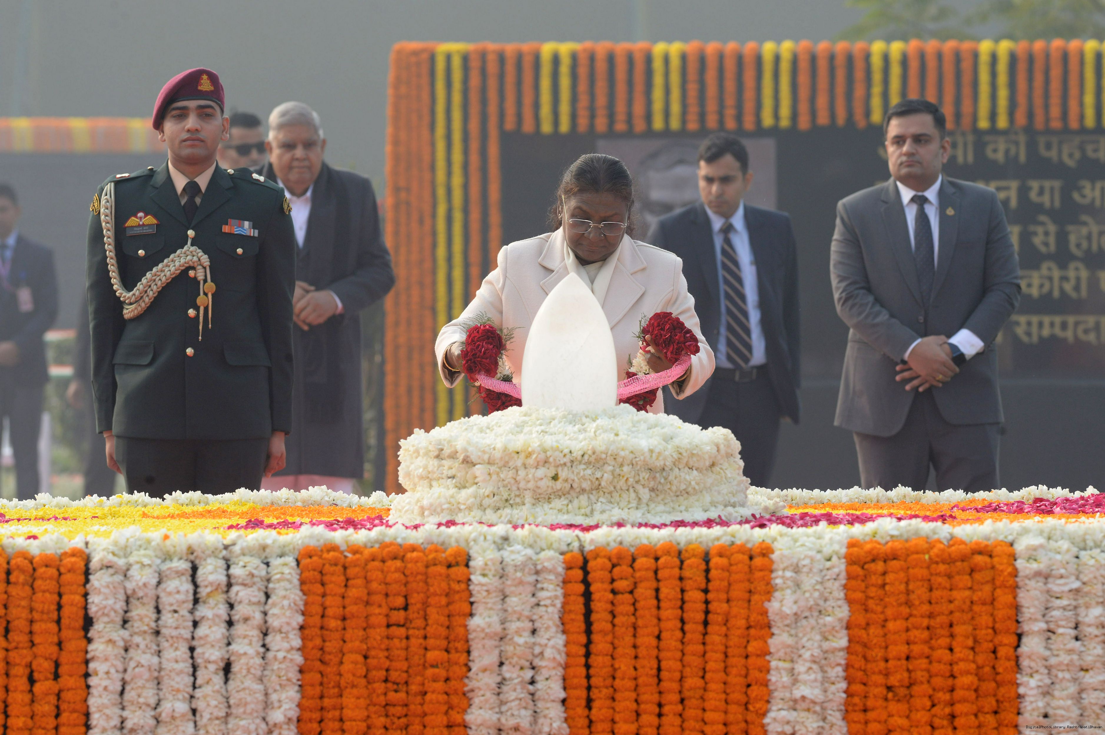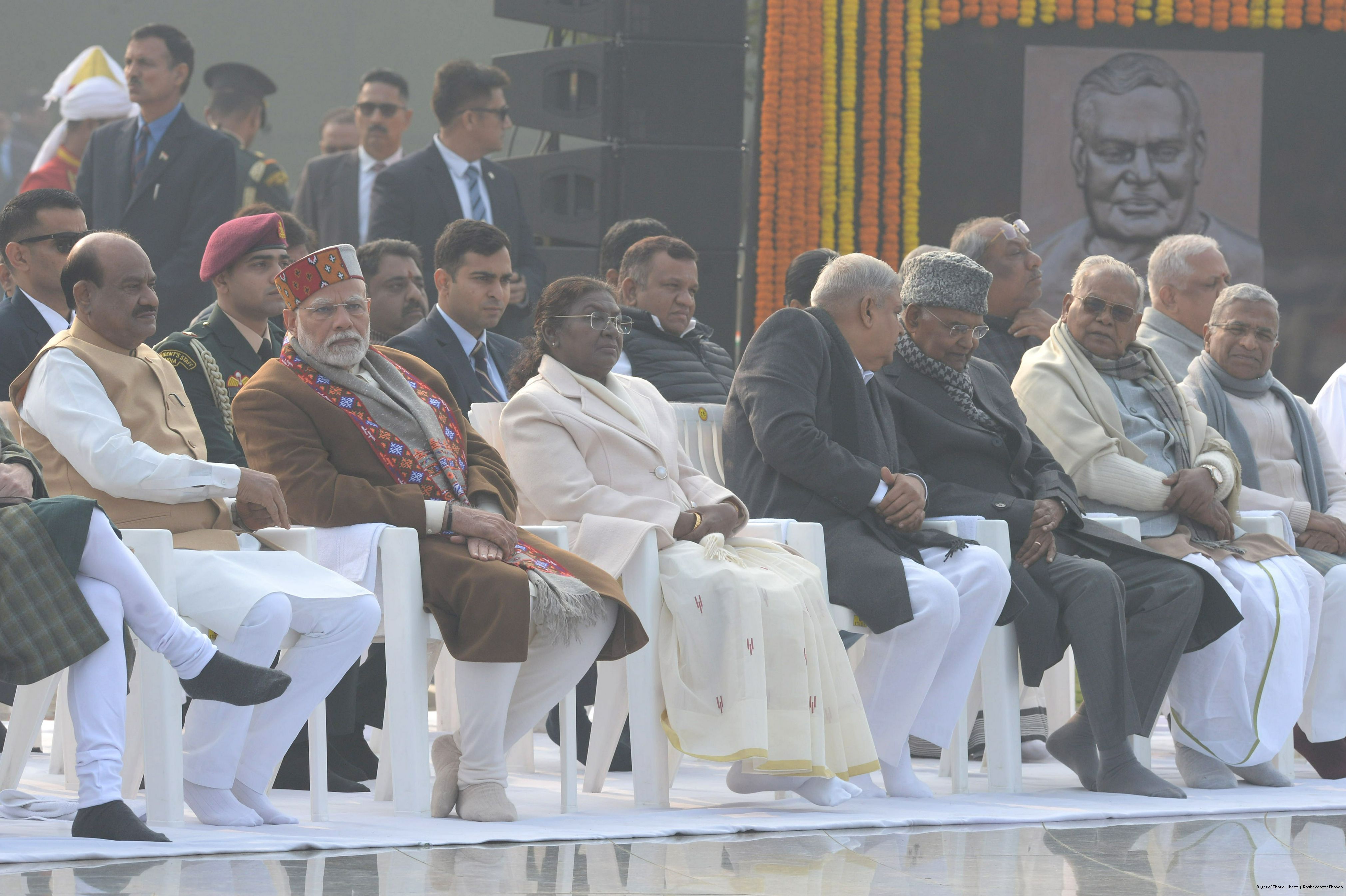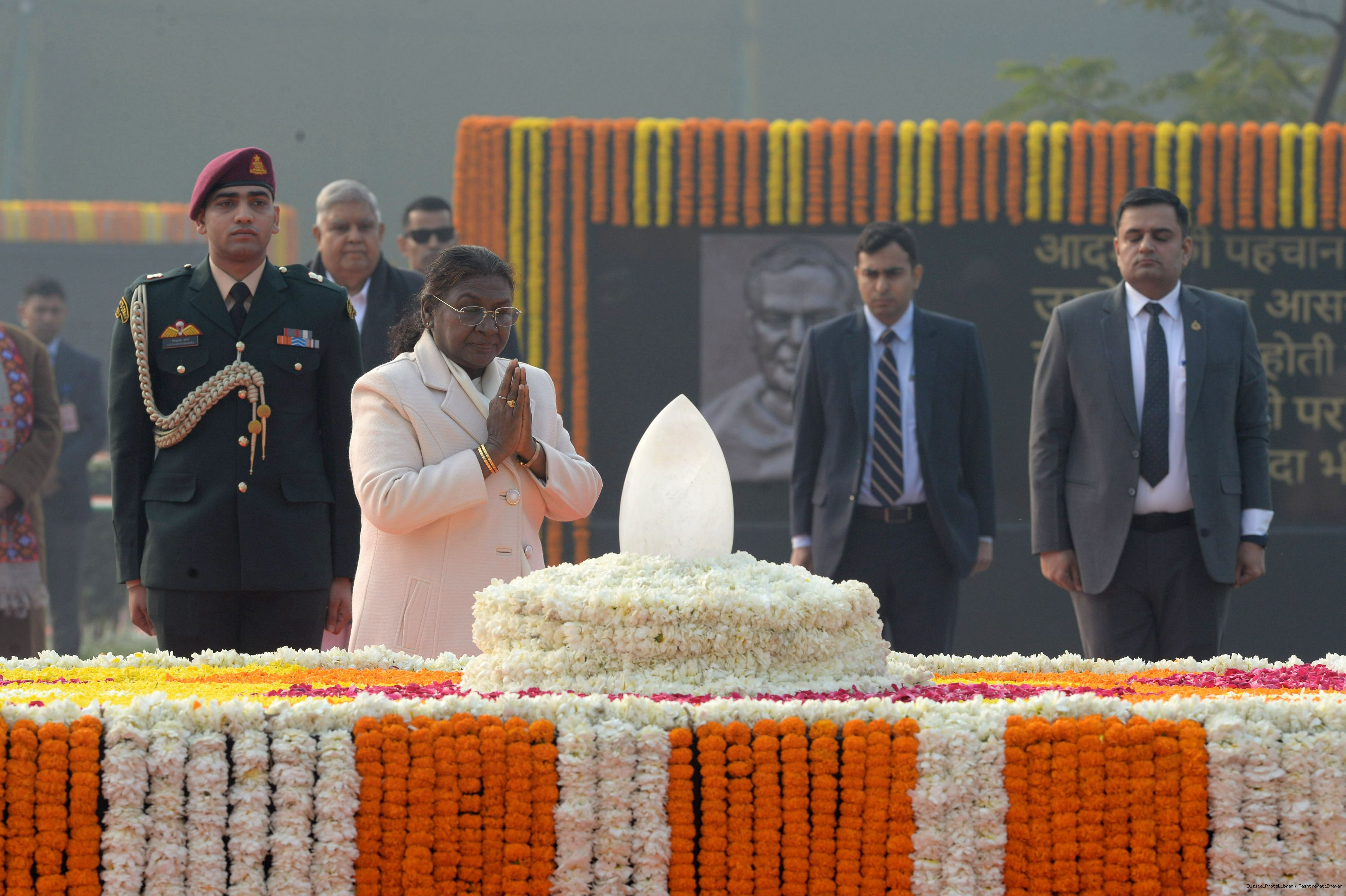 | Caption: | The President of India Smt. Droupadi Murmu paid floral tributes to former Prime Minister of India Shri Atal Bihari Vajpayee on his 100th birth anniversary at his Samadhi 'Sadaiv Atal' in New Delhi on December 25, 2024. |