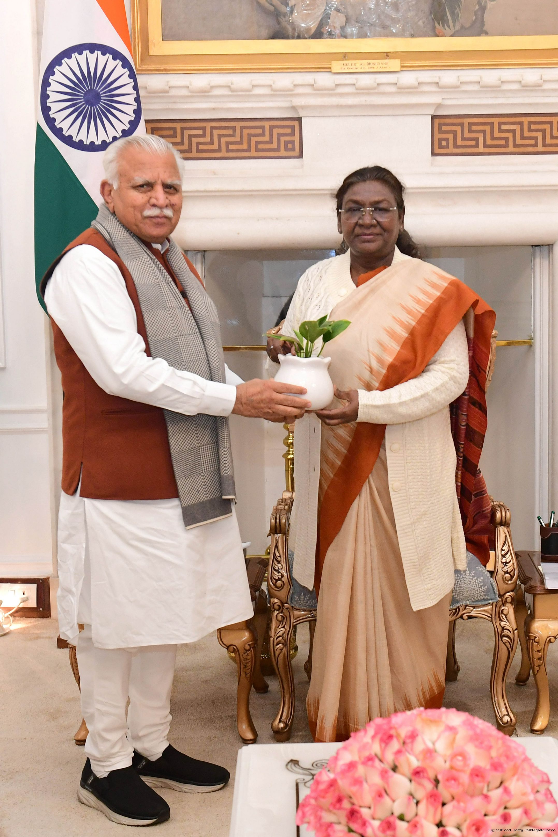 | Caption: | Shri Manohar Lal Khattar, Union Minister of Housing and Urban Affairs and Minister of Power meeting with the President of India Smt. Droupadi Murmu at Rashtrapati Bhavan on December 28, 2024. |