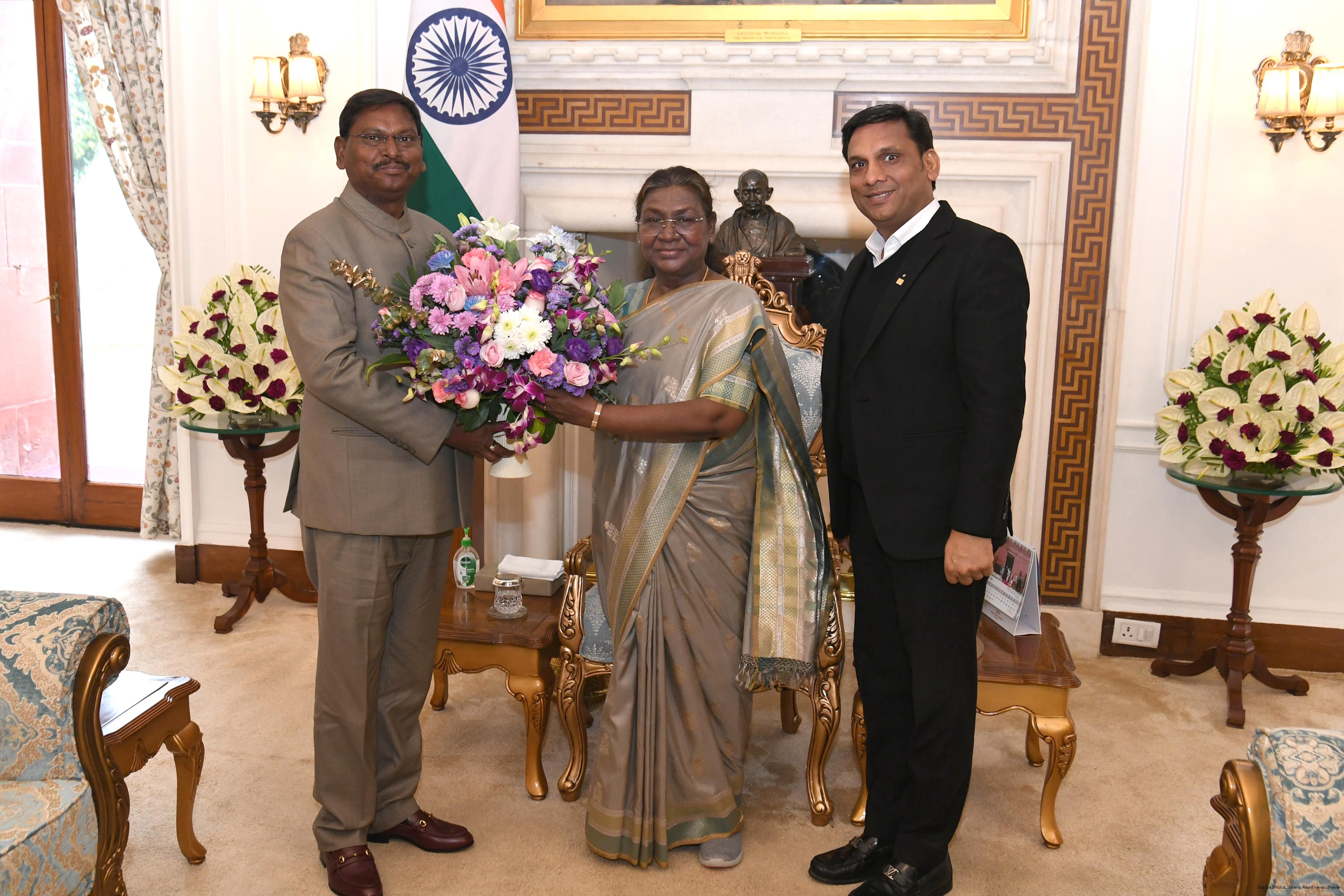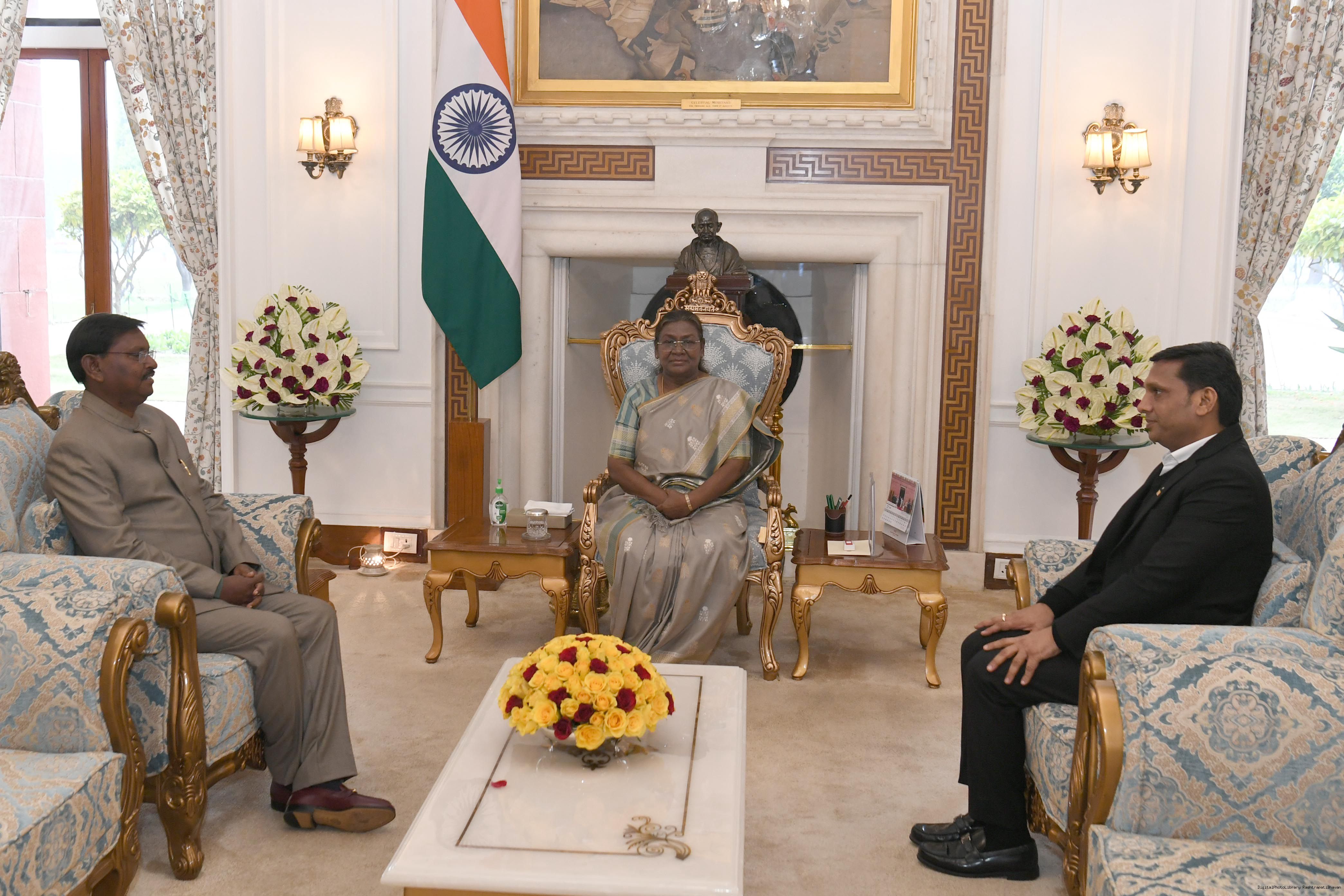| Caption: | Shri Arjun Munda, former Chief Minister of Jharkhand and former Union Minister of Tribal Affairs, Agriculture Farmers Welfare, Govt of India along with Rajesh Gupta called on the President of India Smt. Droupadi Murmu at Rashtrapati Bhavan on January 7, 2025. |