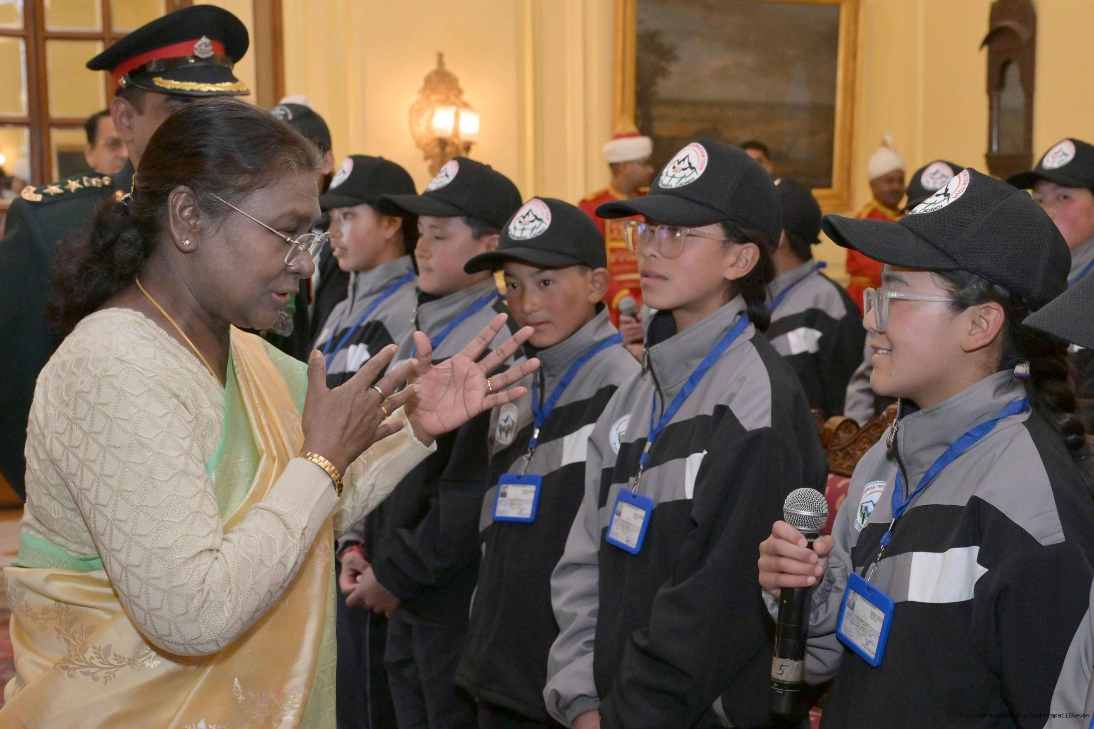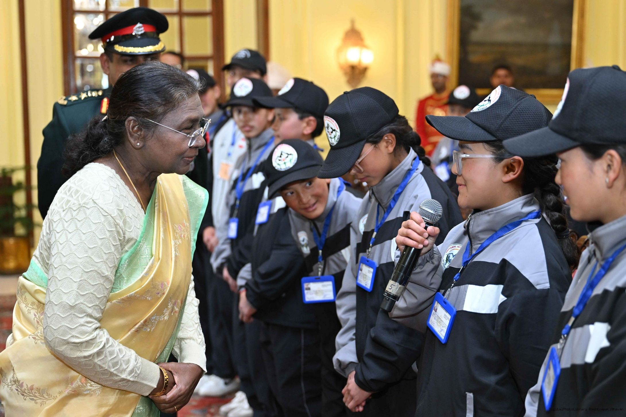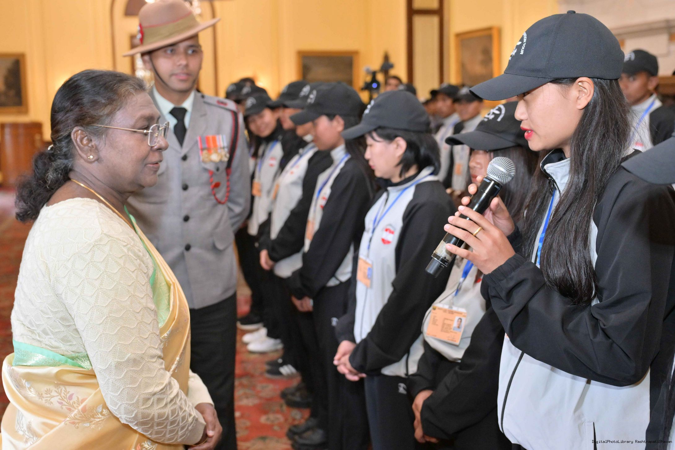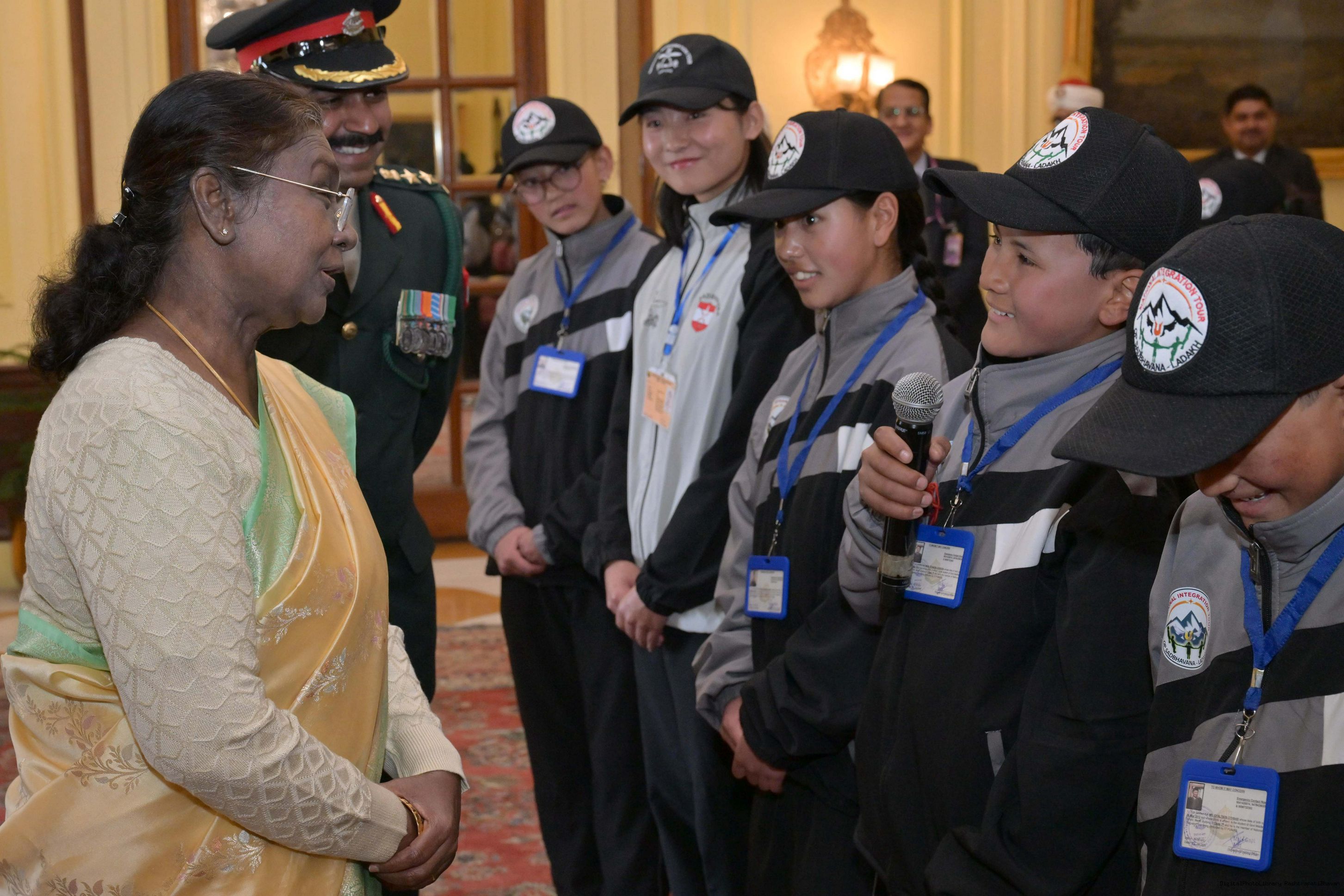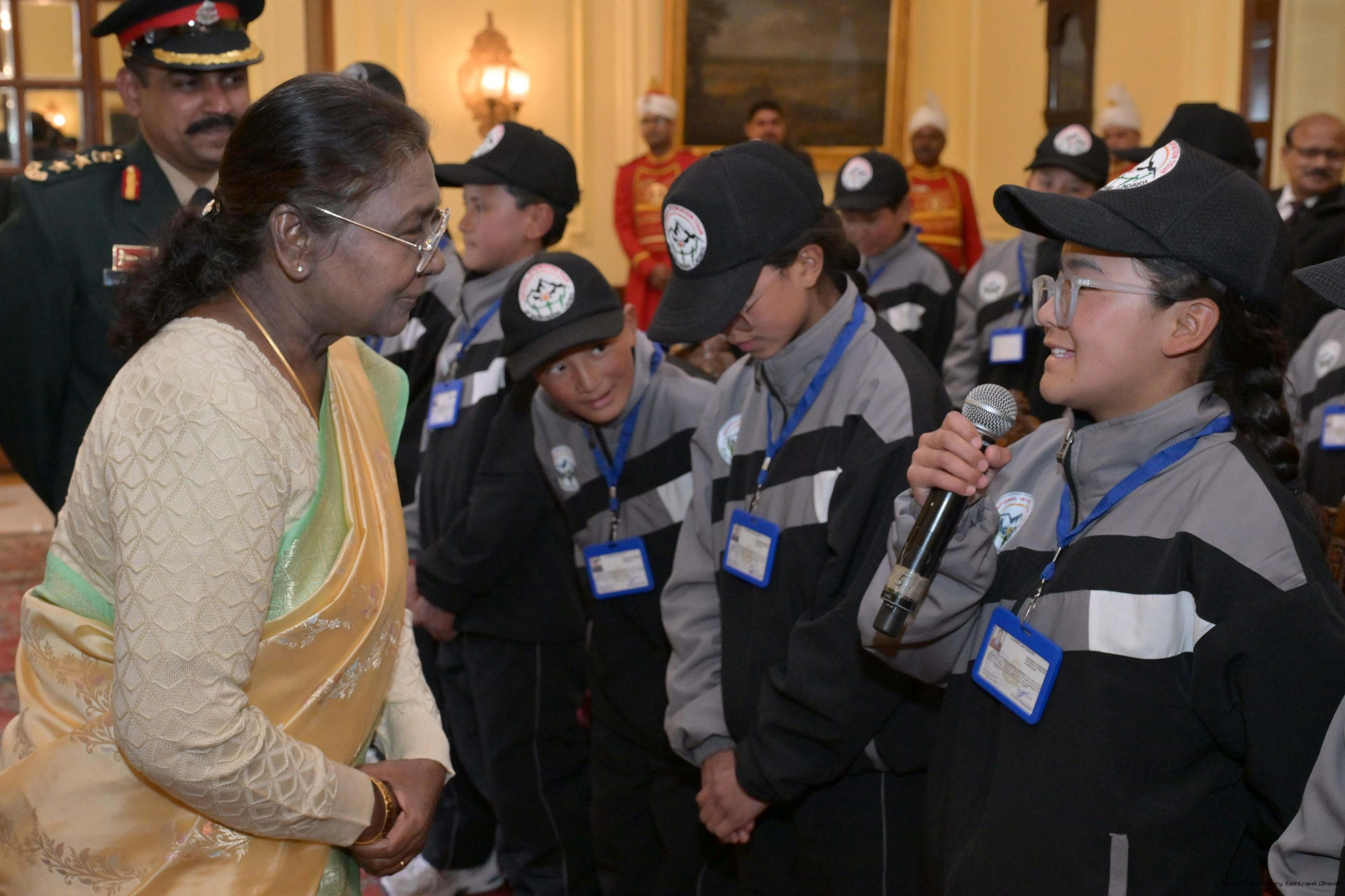 | Caption: | The President of India, Smt. Droupadi Murmu met a group of students from Nagaland and Ladakh of the National Integration Tour at Rashtrapati Bhavan on January 17, 2025. |