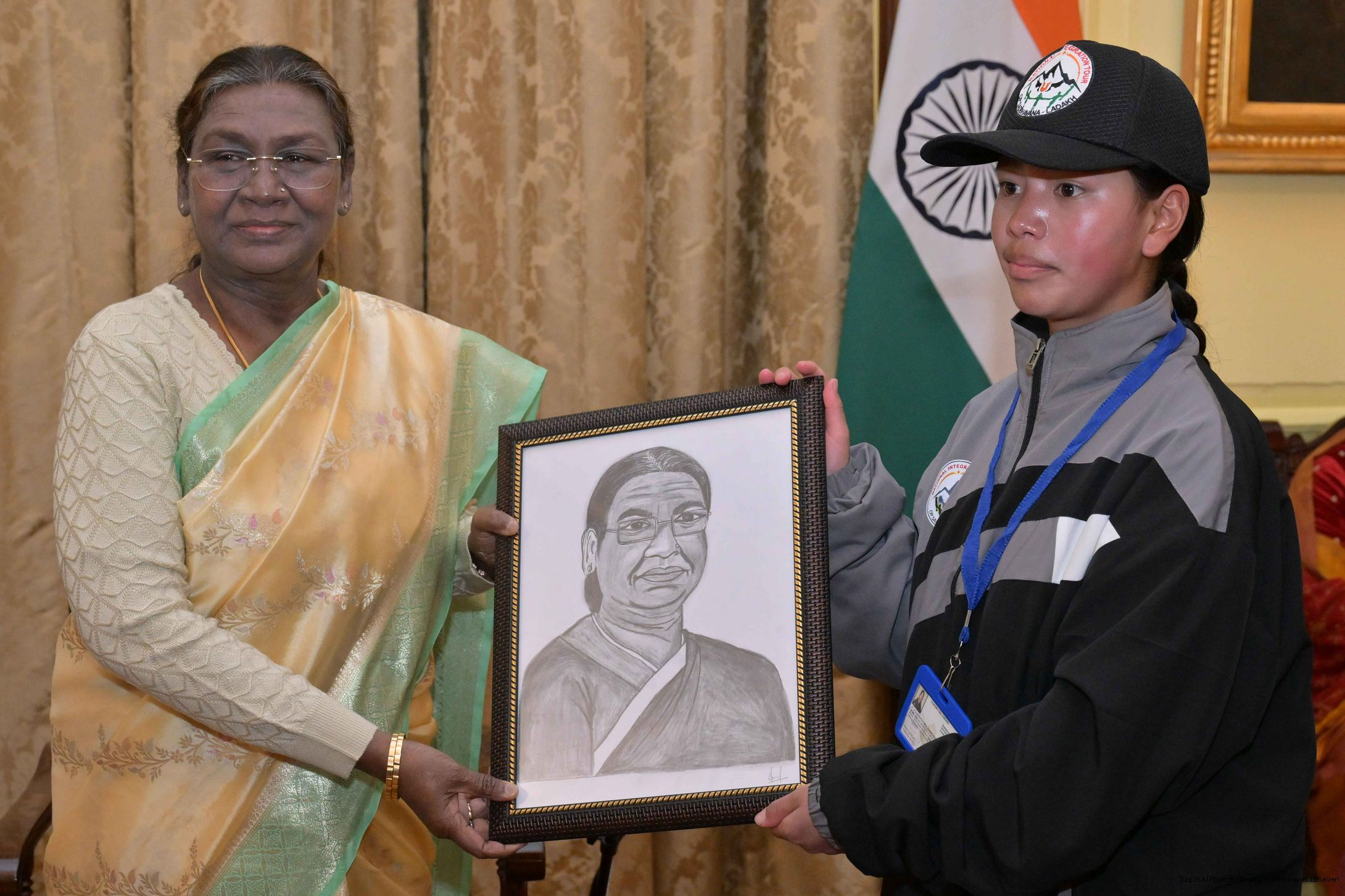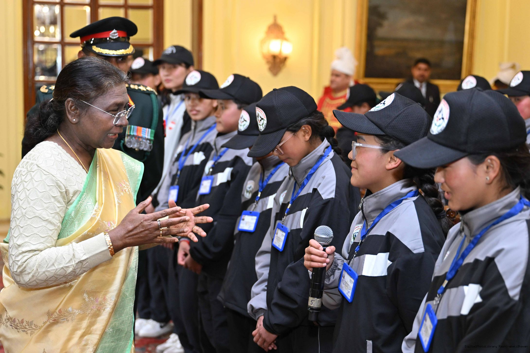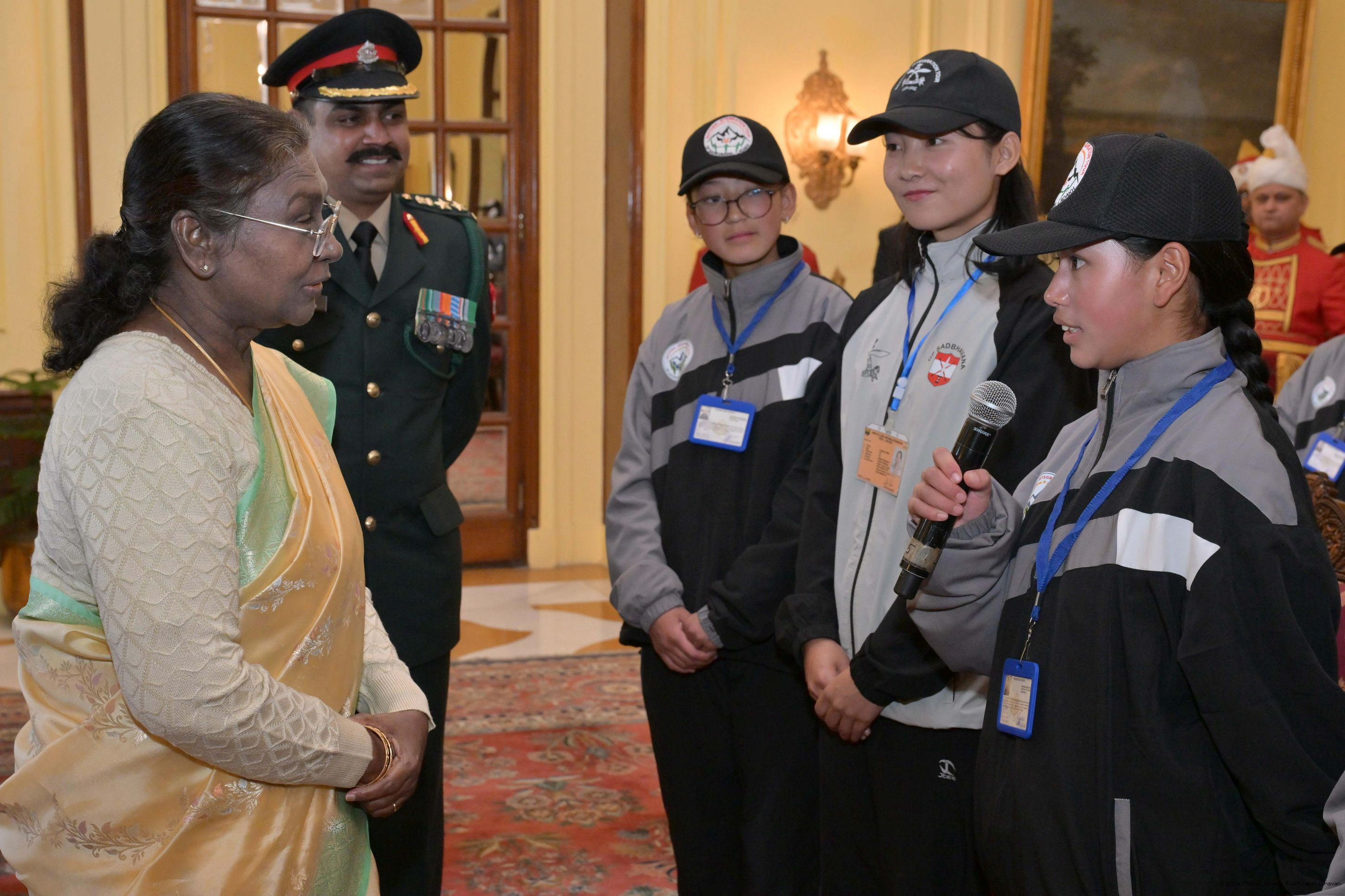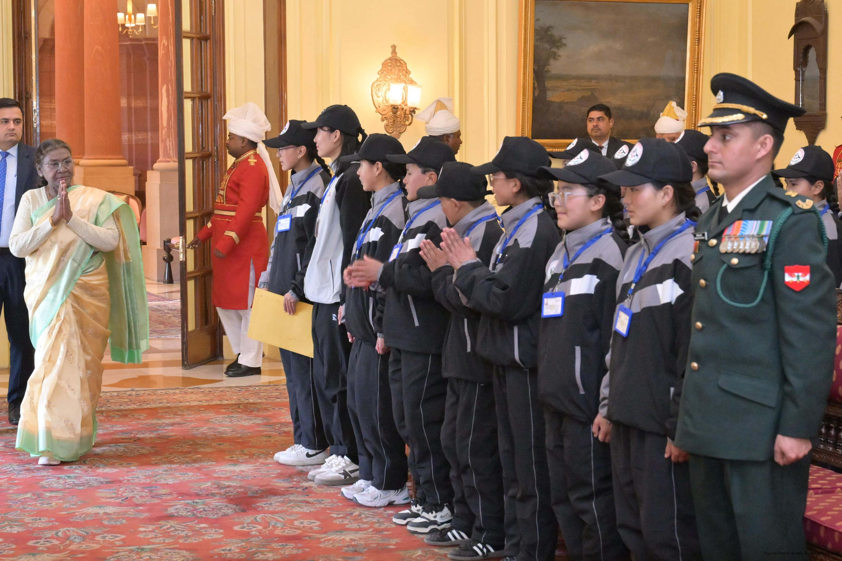 | Caption: | The President of India, Smt. Droupadi Murmu met a group of students from Nagaland and Ladakh of the National Integration Tour at Rashtrapati Bhavan on January 17, 2025. |