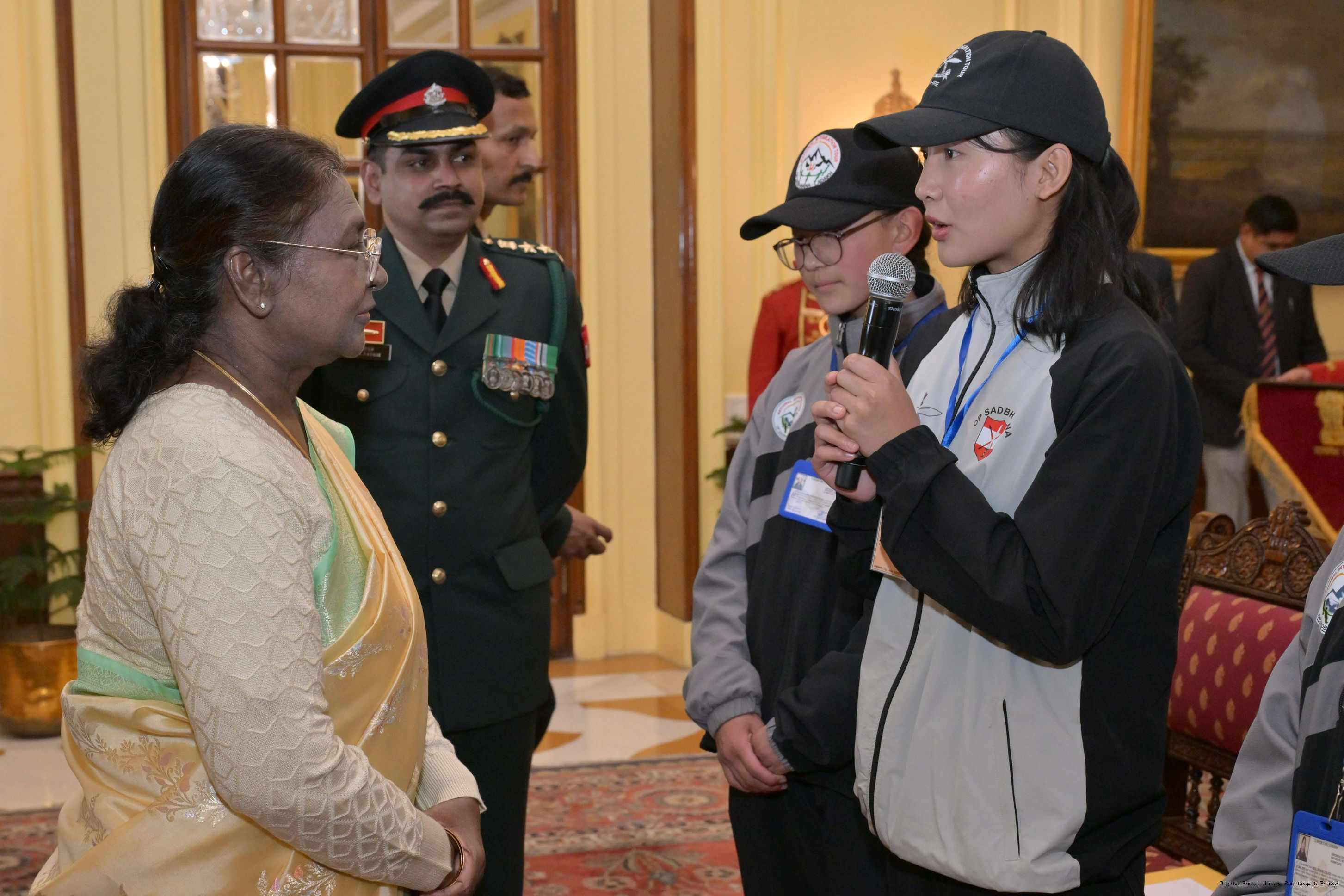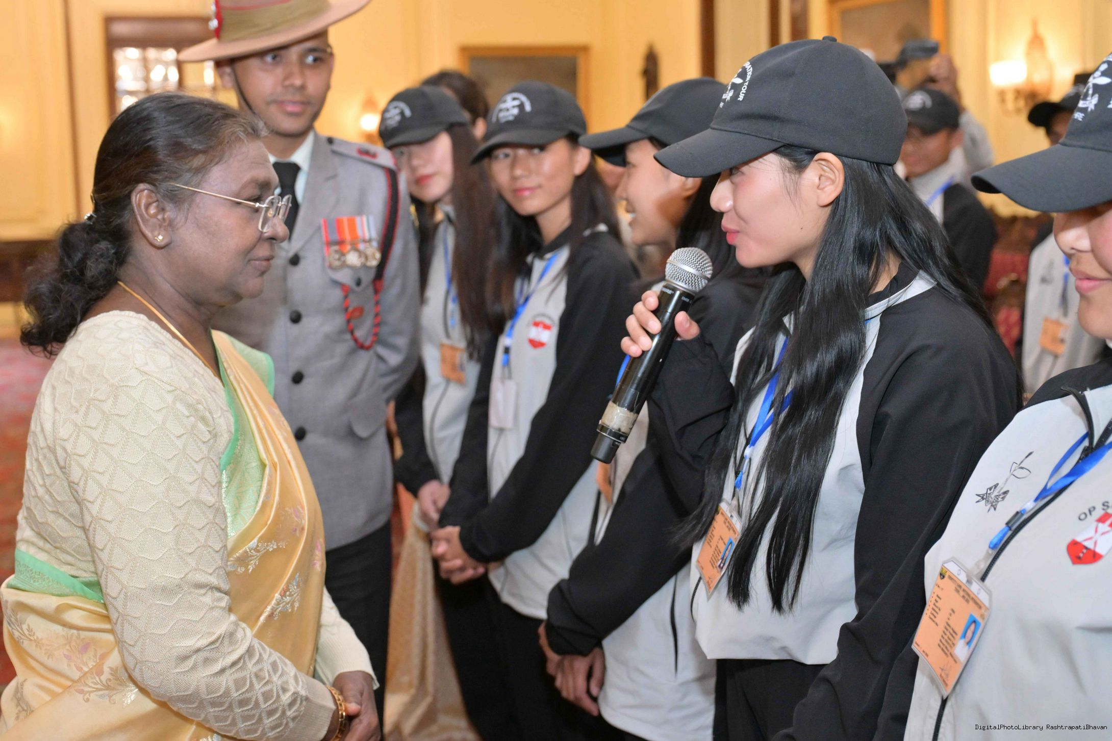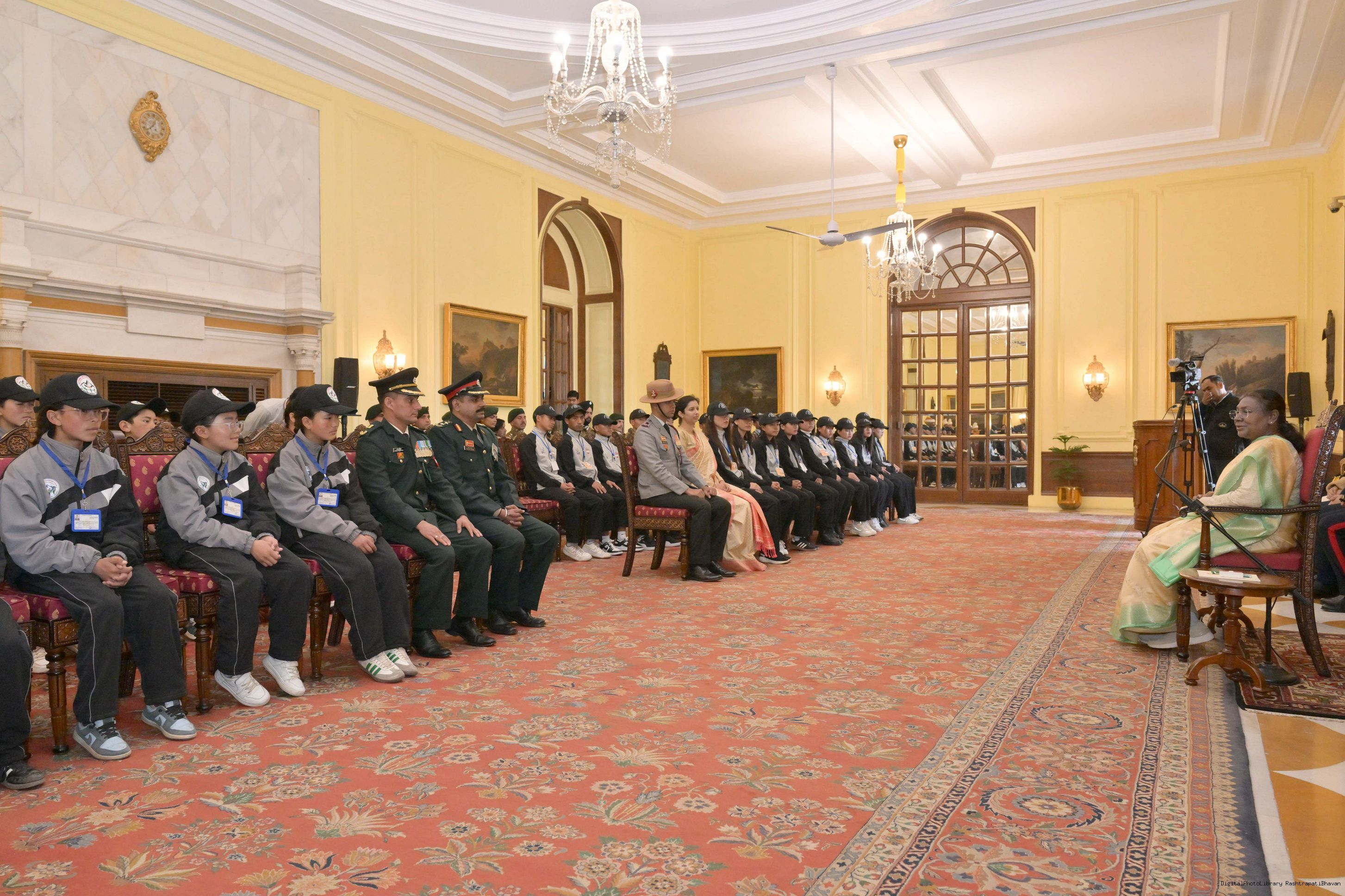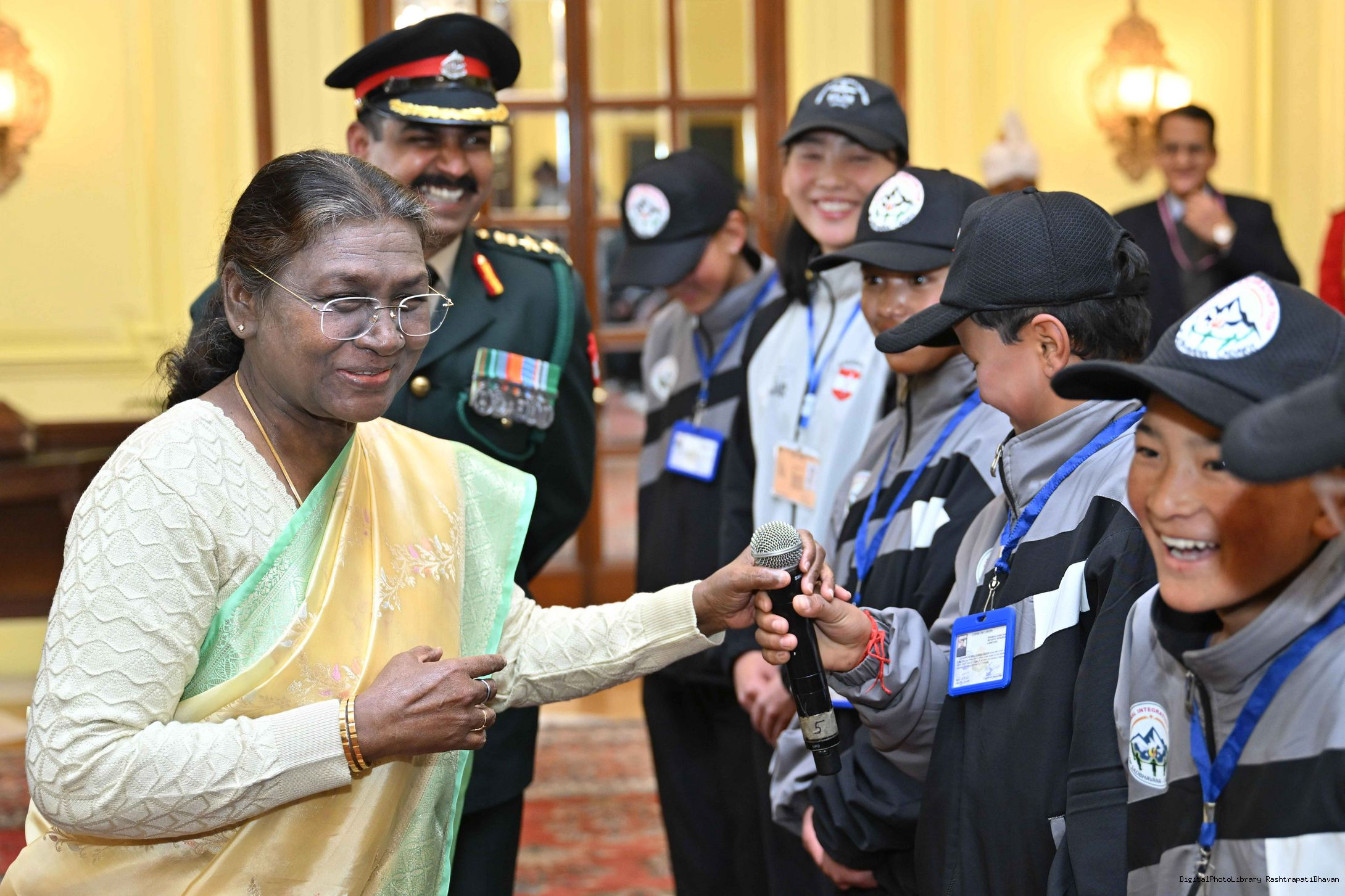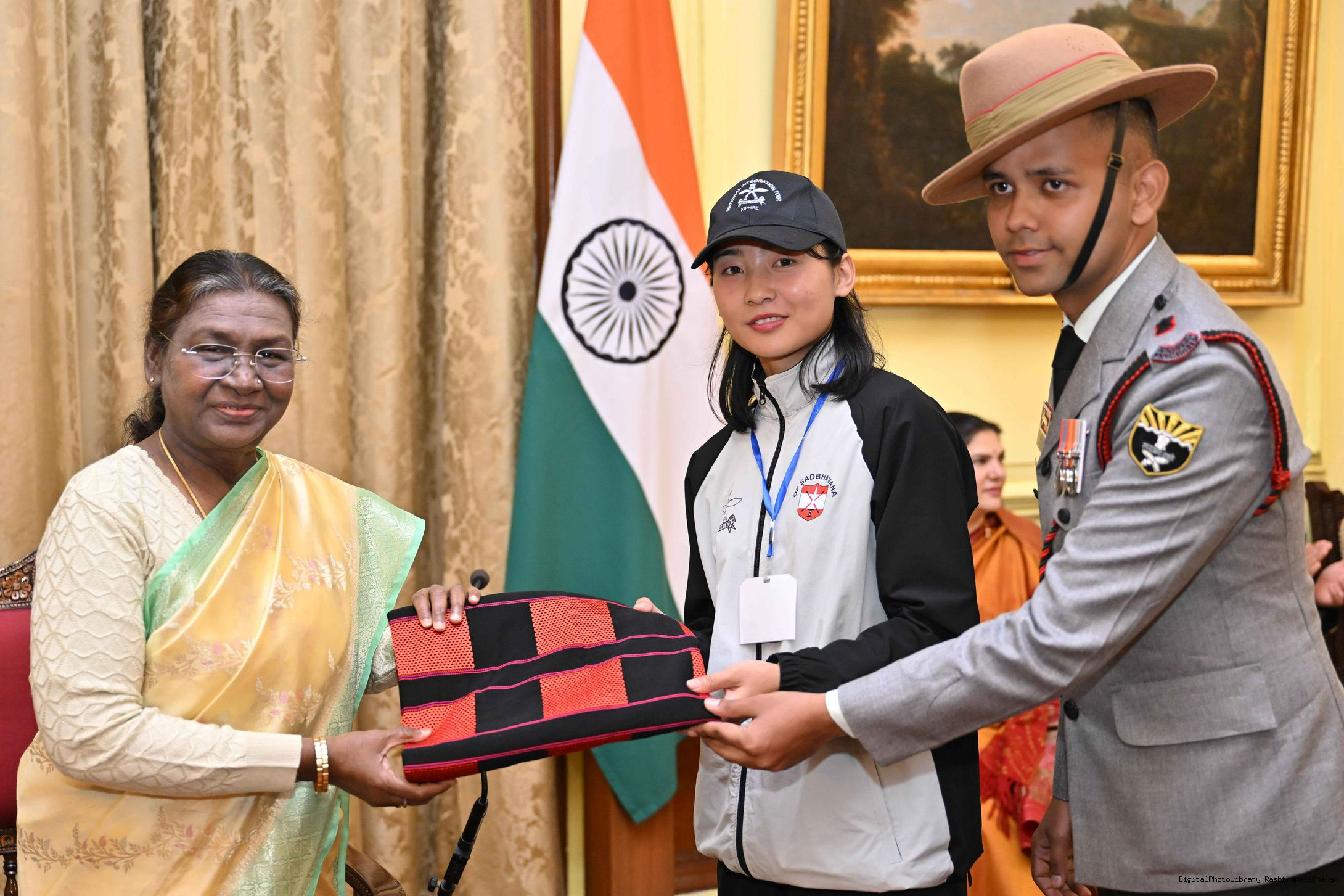 | Caption: | The President of India, Smt. Droupadi Murmu met a group of students from Nagaland and Ladakh of the National Integration Tour at Rashtrapati Bhavan on January 17, 2025. |