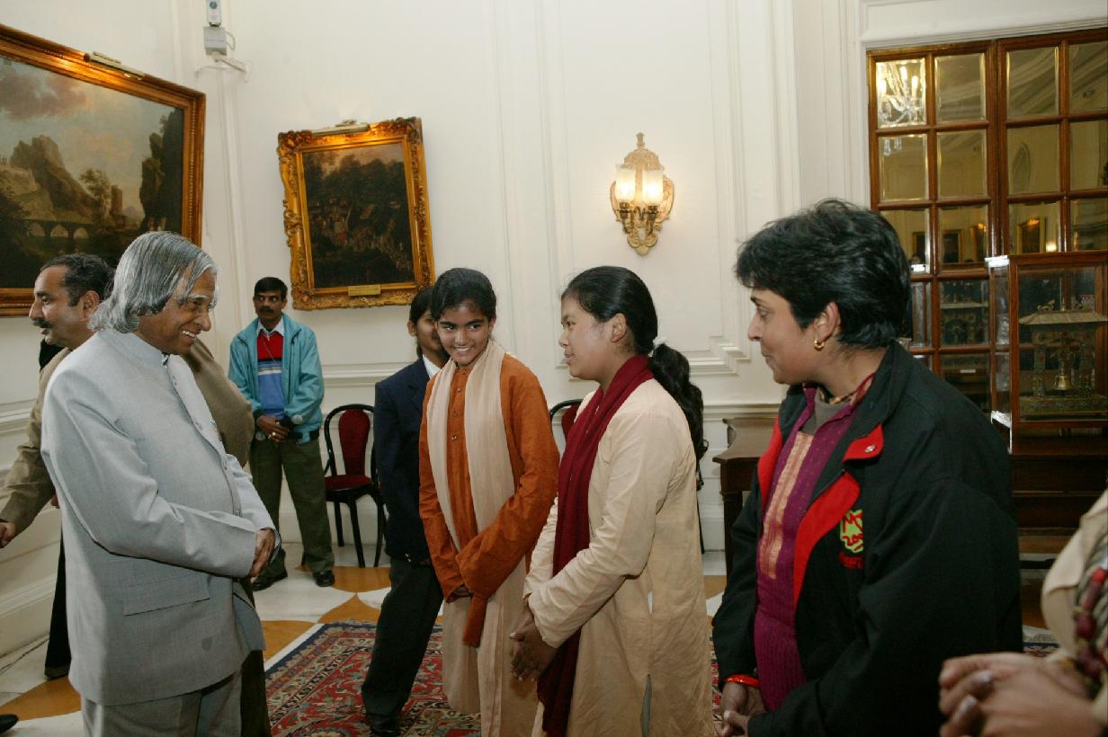 | Caption: | The Students from Mayo College Girls School Ajmer Kottayam calling on the President of India, Dr A P J Abdul Kalam at the Yellow Drawing Room of Rashtrapati Bhavan in New Delhi on Jan 30, 2004 |