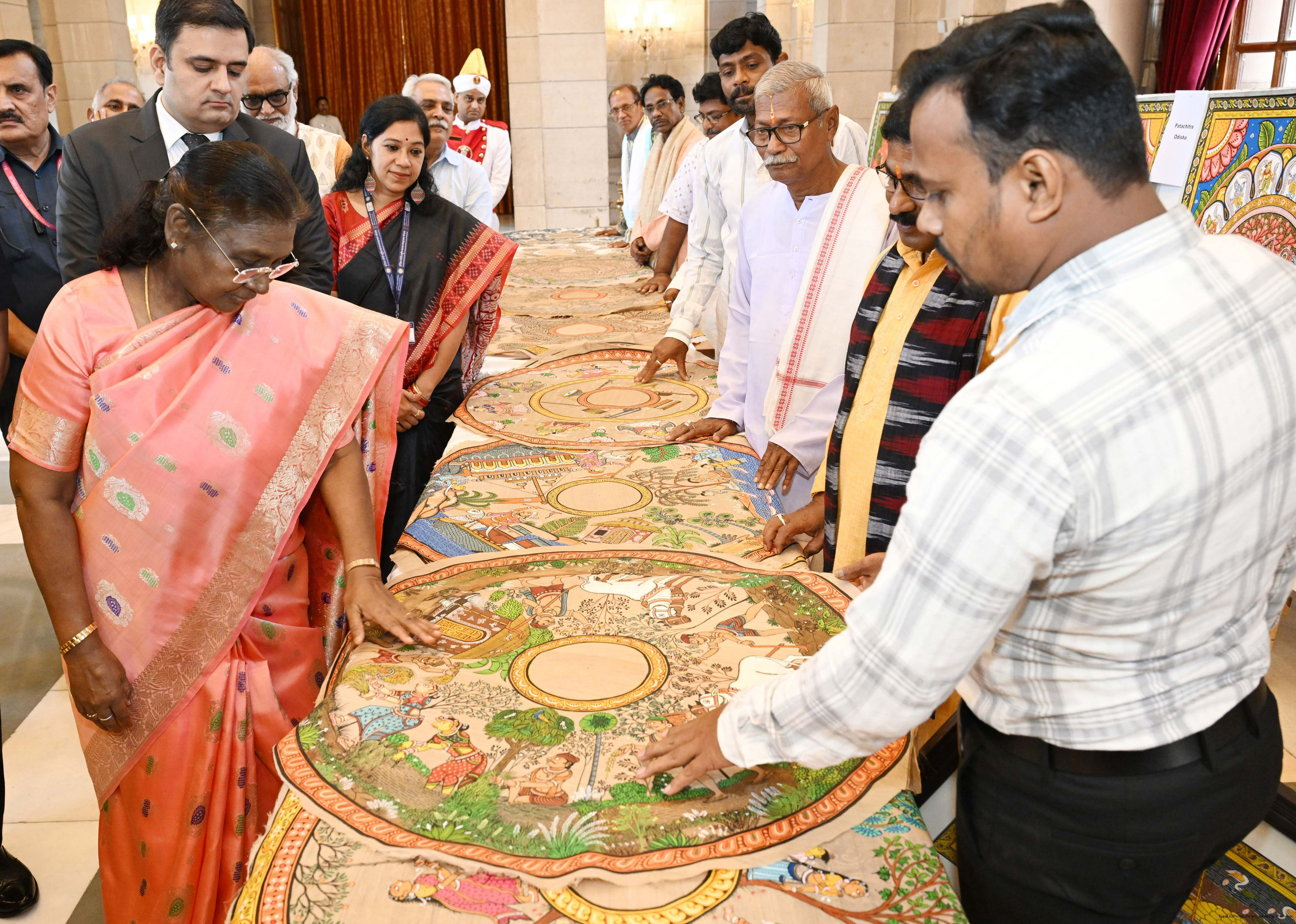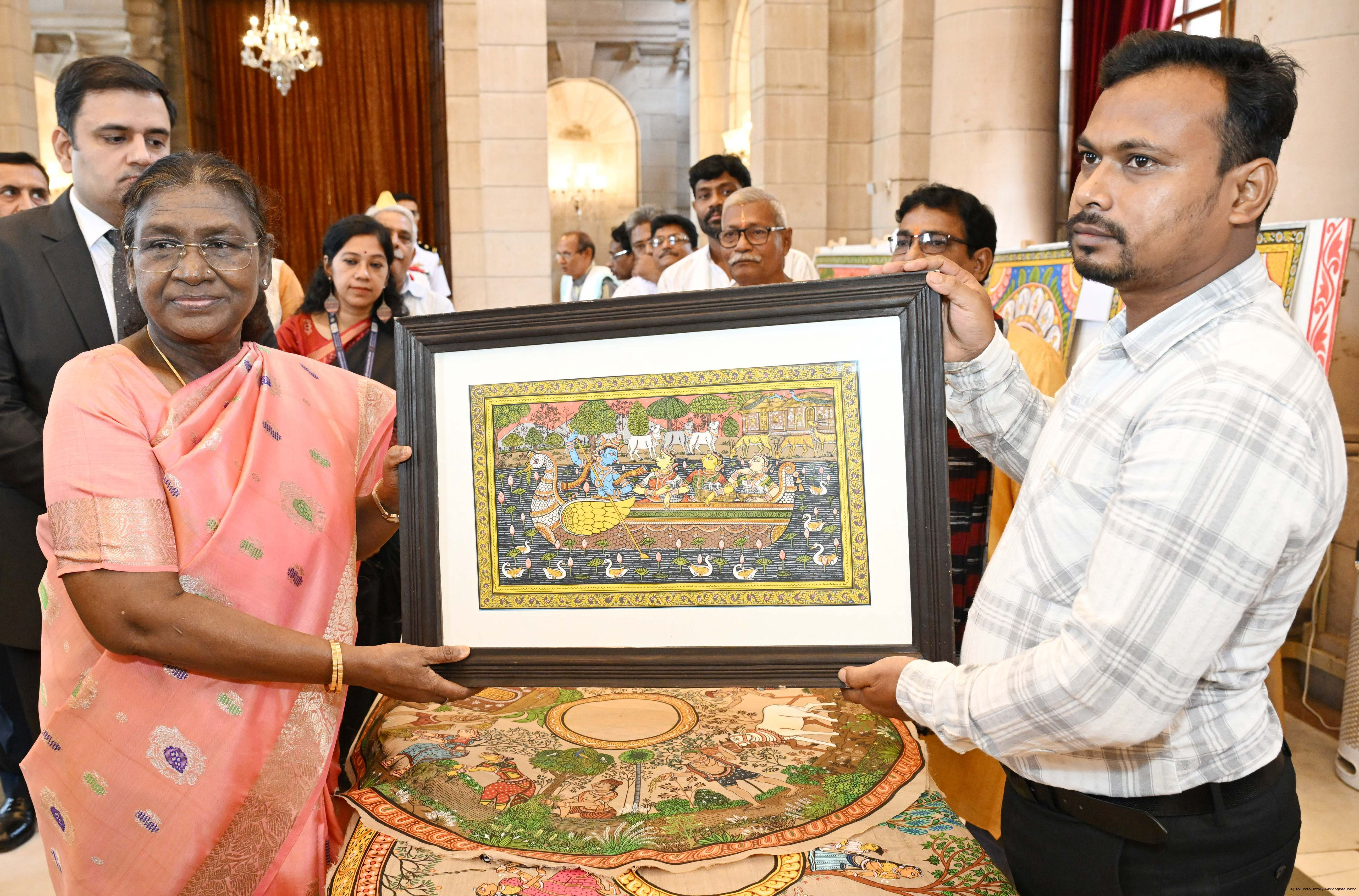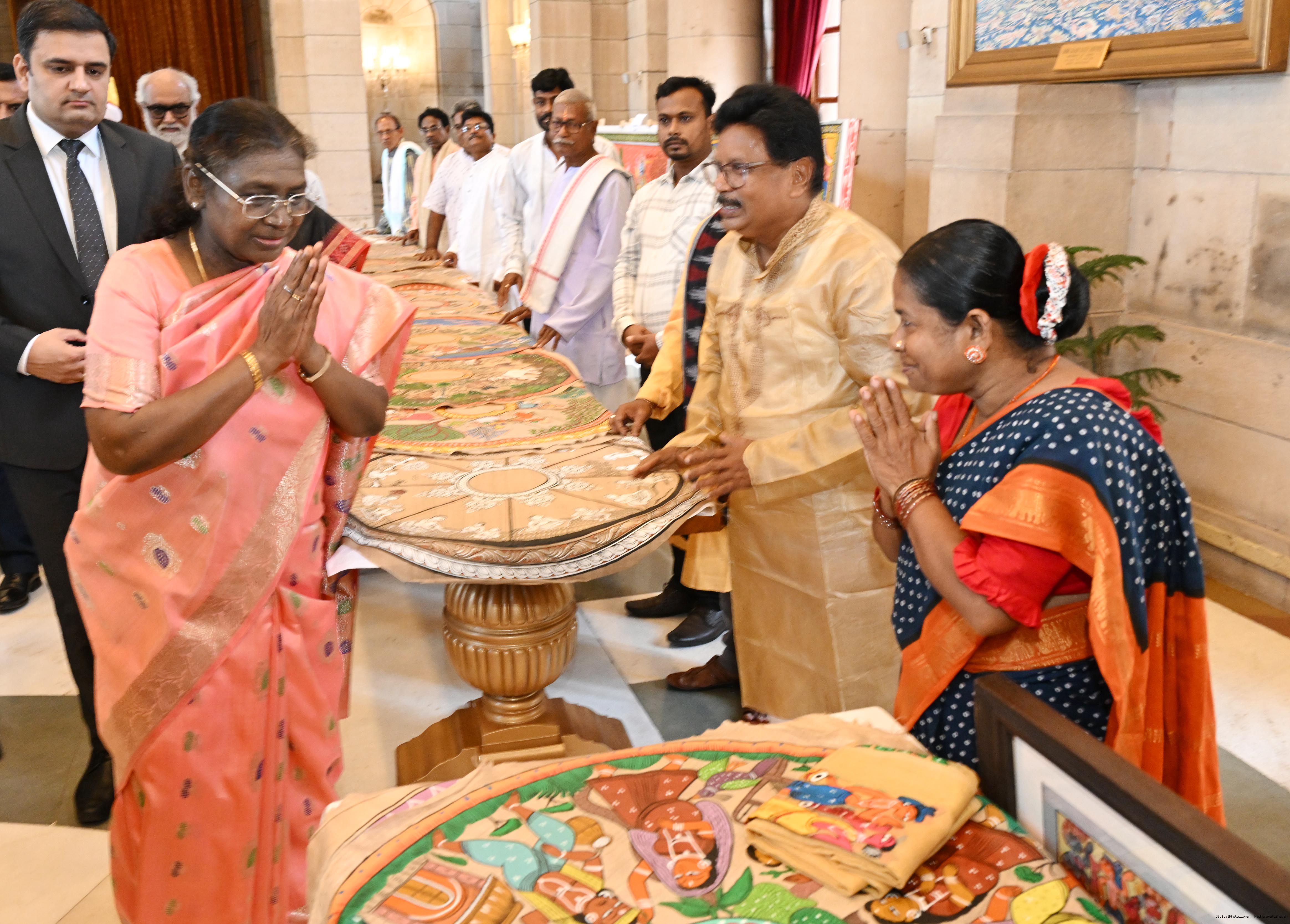 | Caption: | A group of Artists of Sohrai, Pattachitra and Patua art forms called on the President of India, Smt. Droupadi Murmu at Rashtrapati Bhavan on July 24, 2025. |