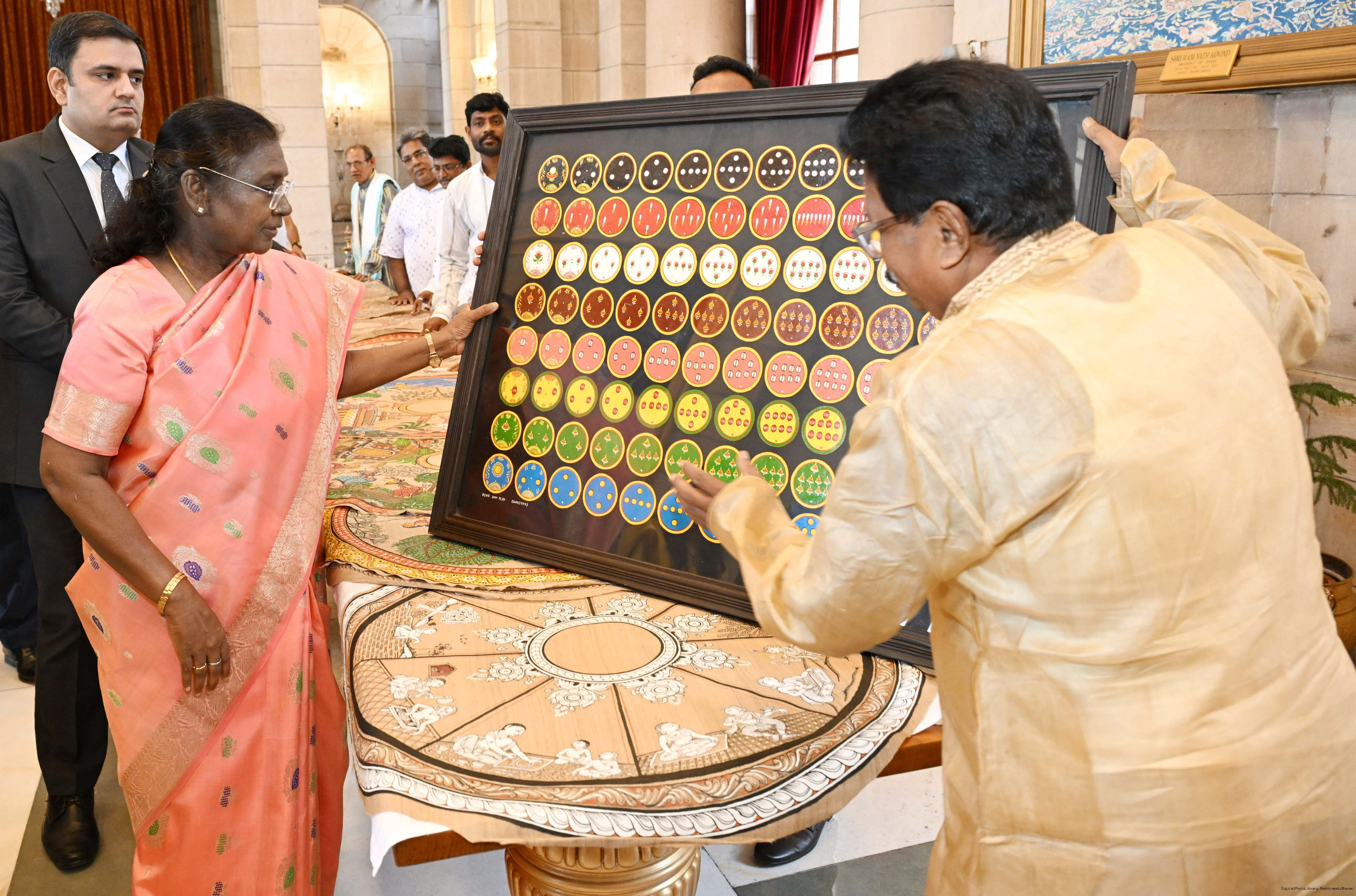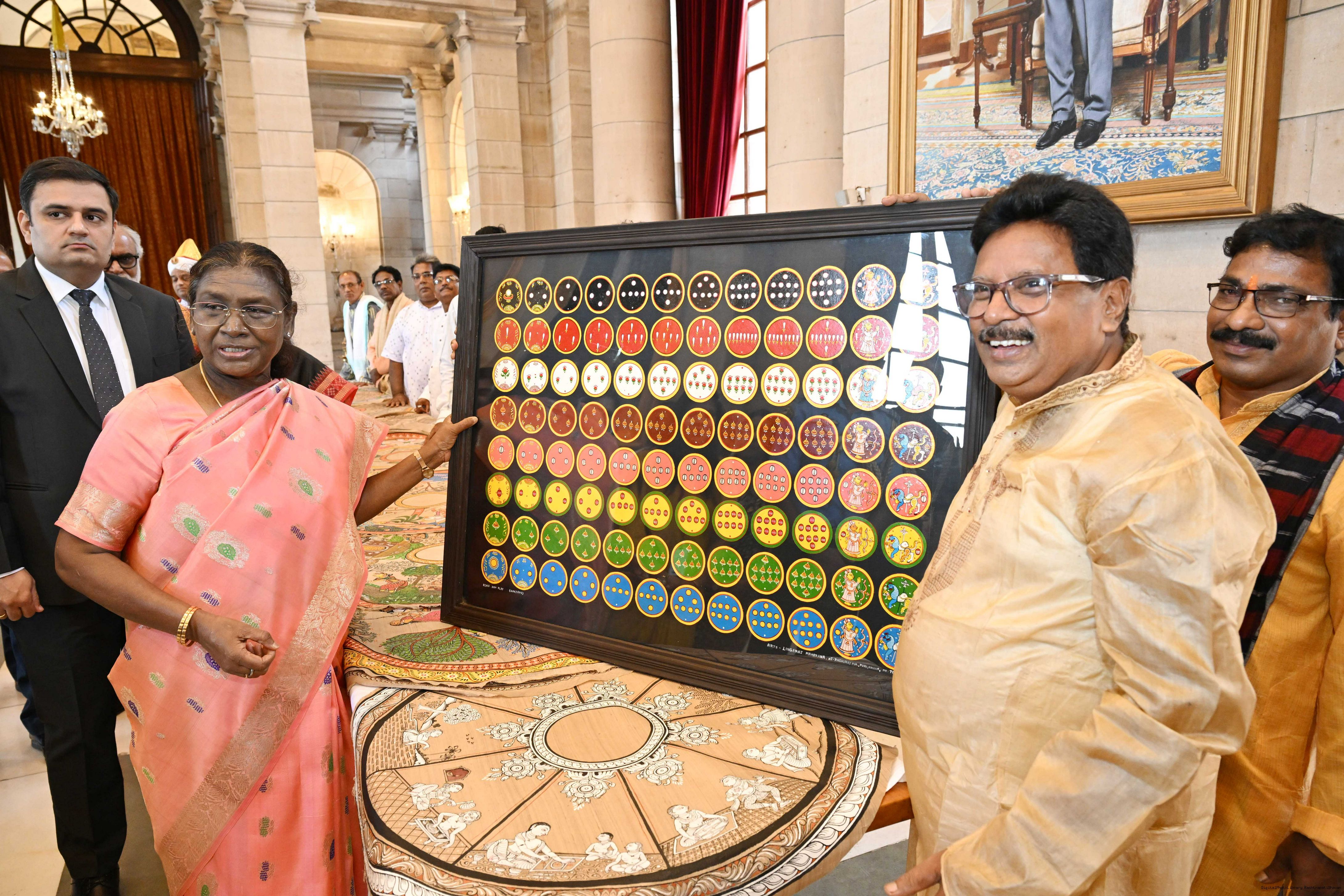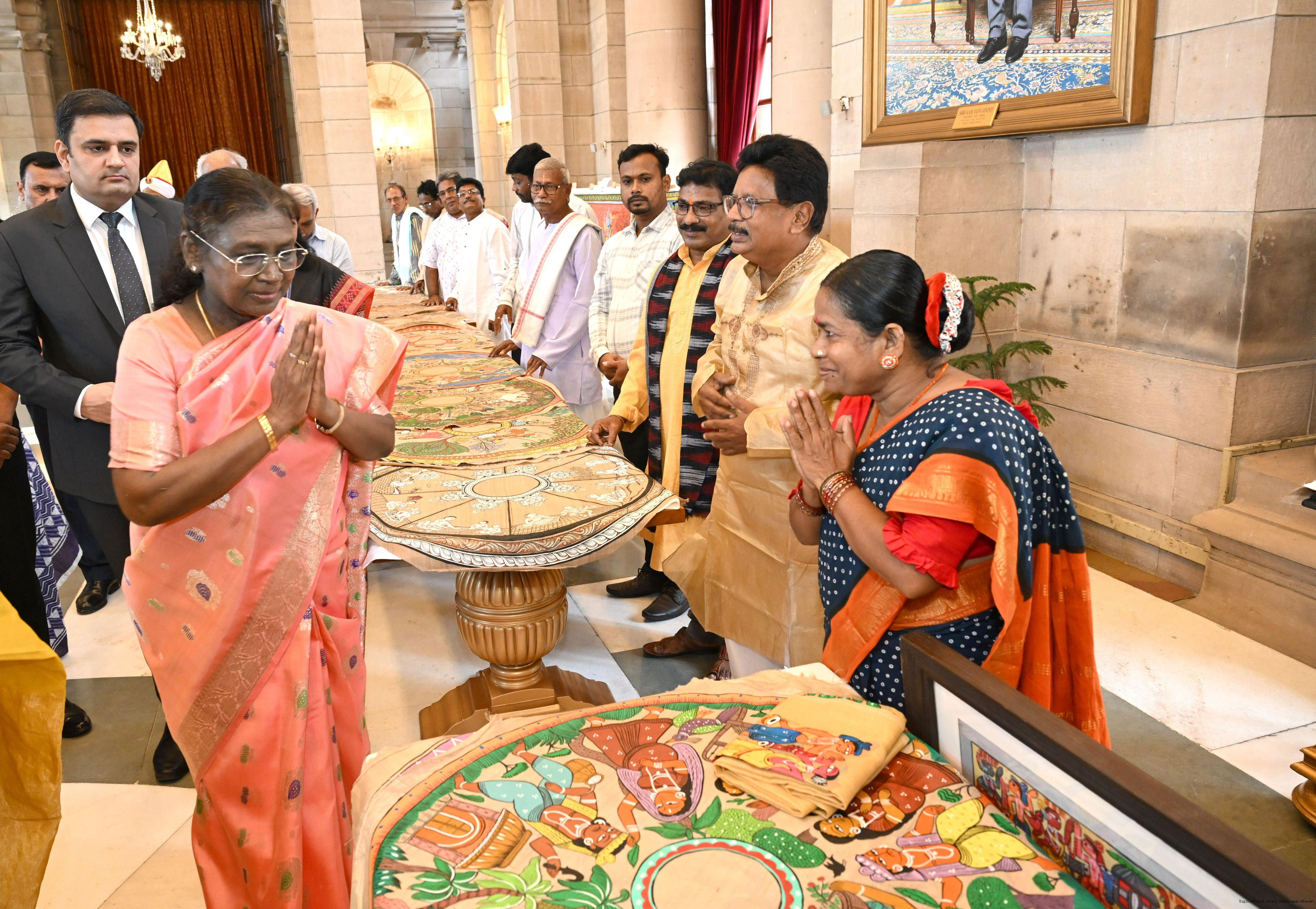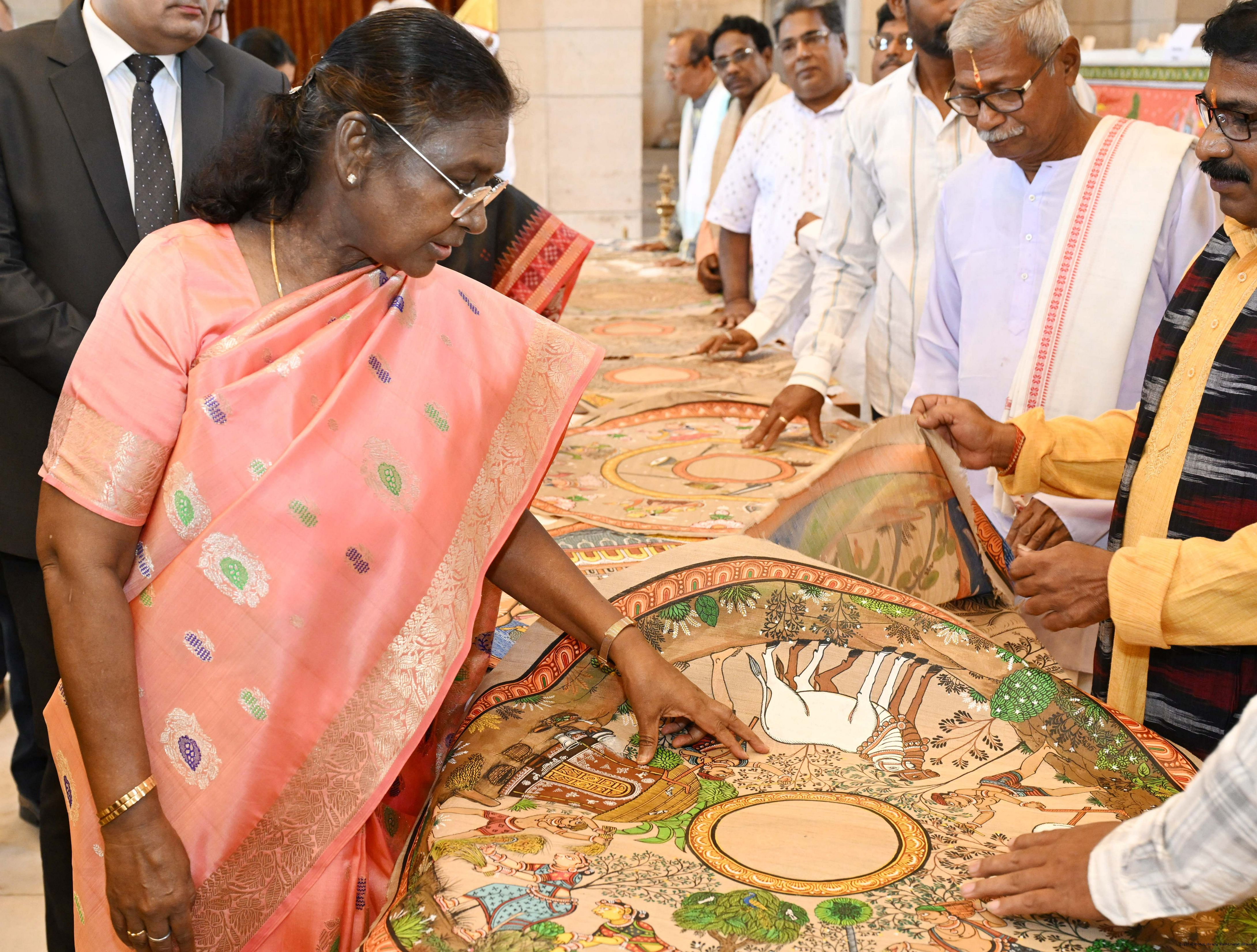 | Caption: | A group of Artists of Sohrai, Pattachitra and Patua art forms called on the President of India, Smt. Droupadi Murmu at Rashtrapati Bhavan on July 24, 2025. |