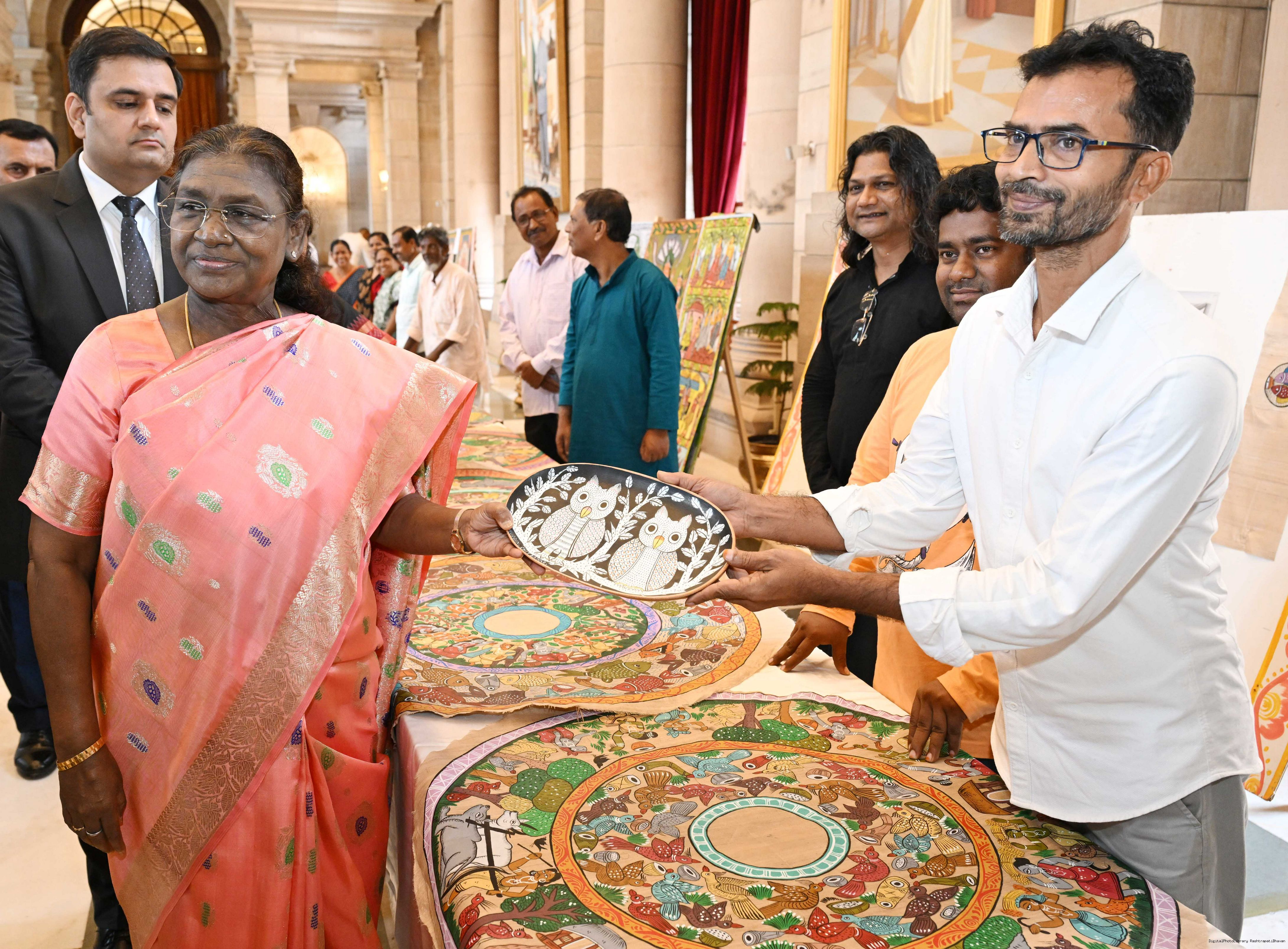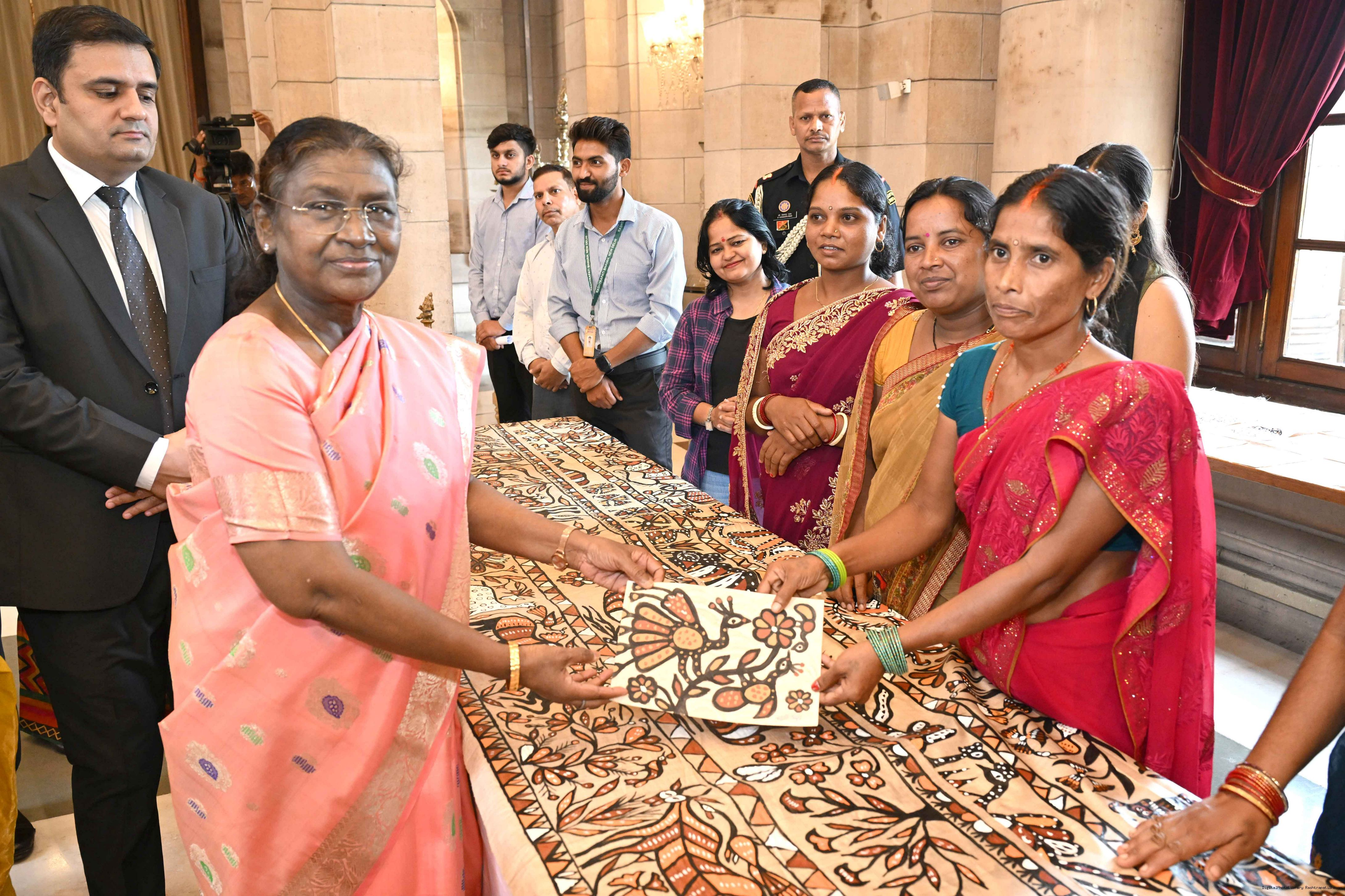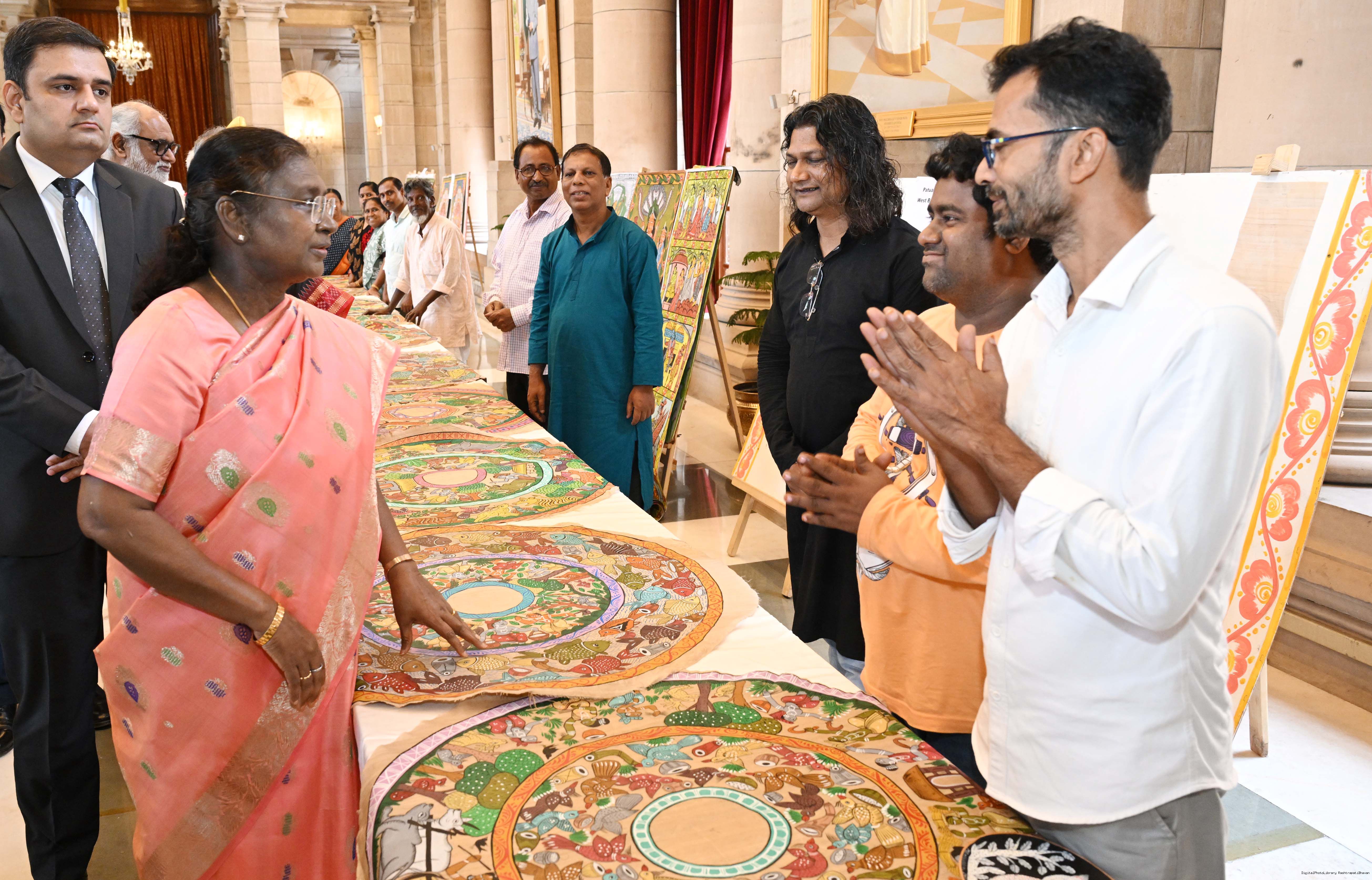 | Caption: | A group of Artists of Sohrai, Pattachitra and Patua art forms called on the President of India, Smt. Droupadi Murmu at Rashtrapati Bhavan on July 24, 2025. |