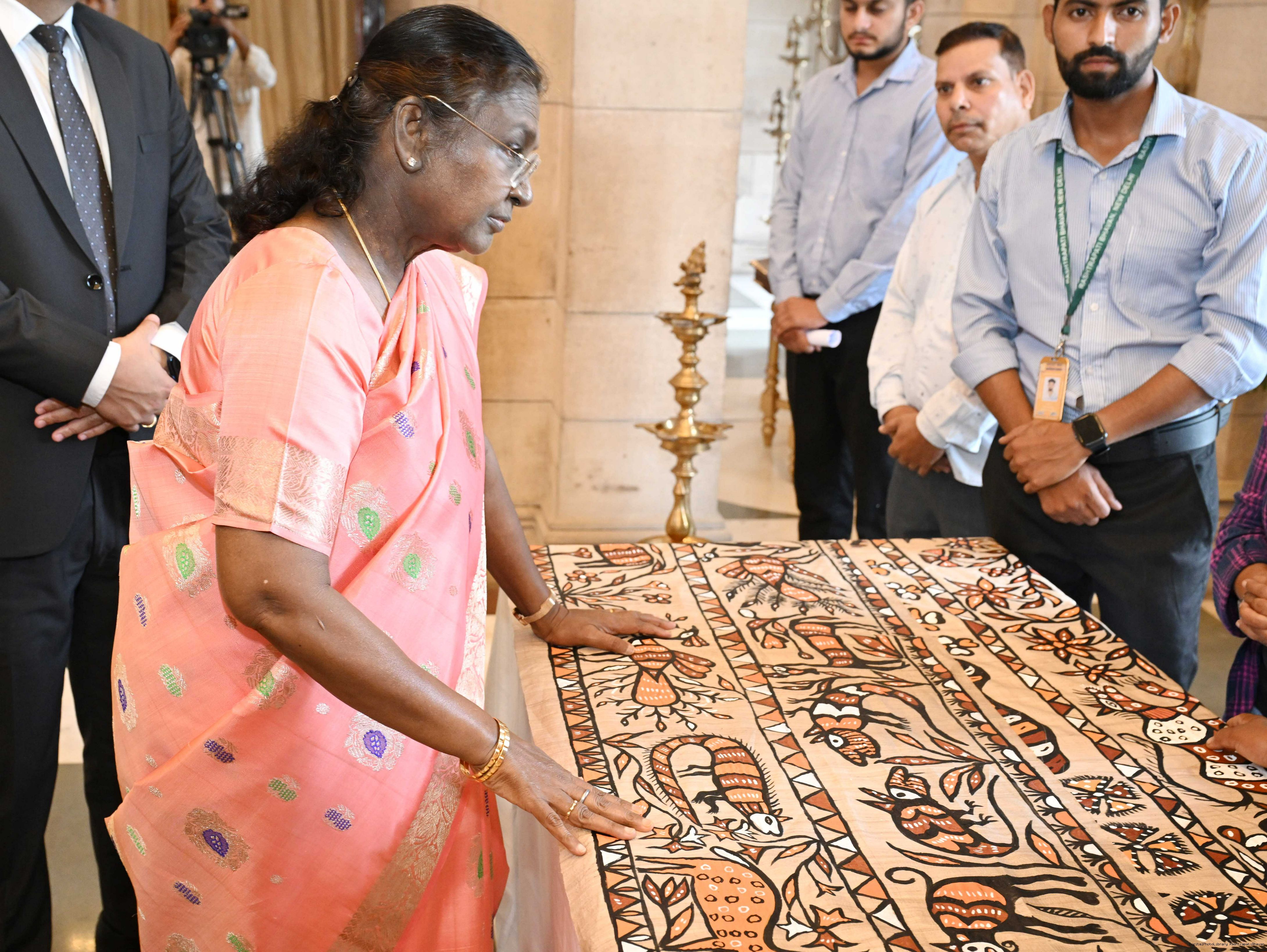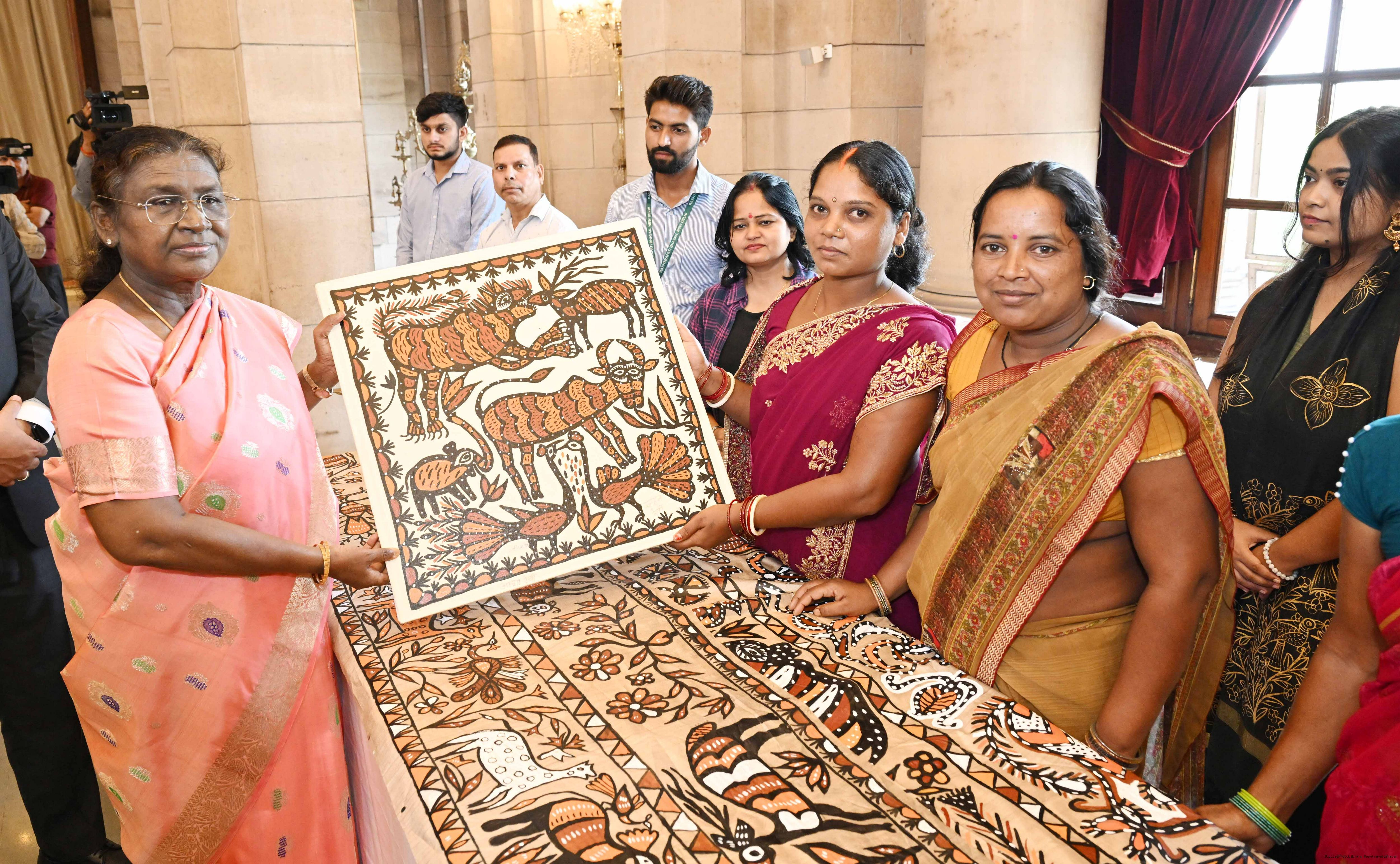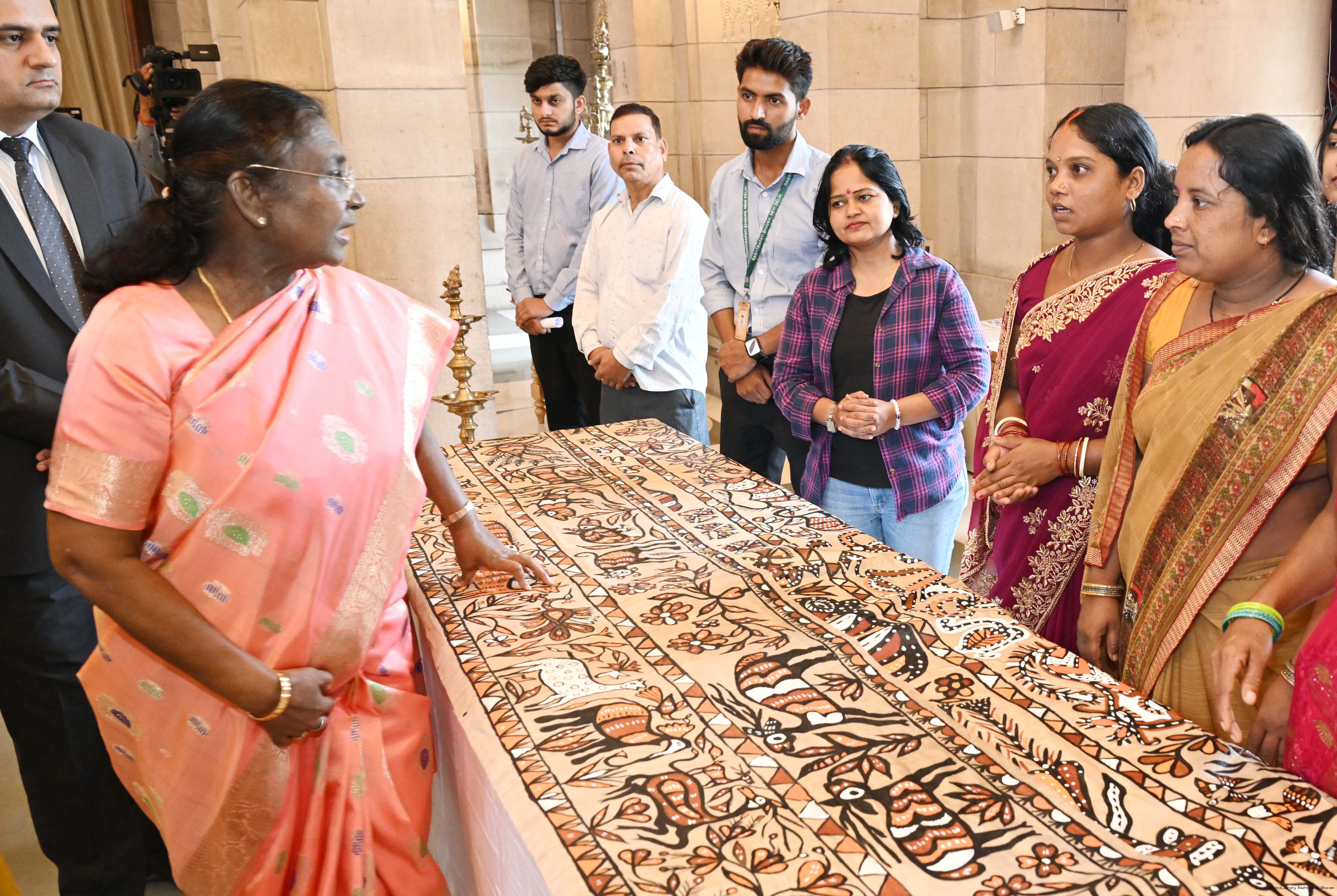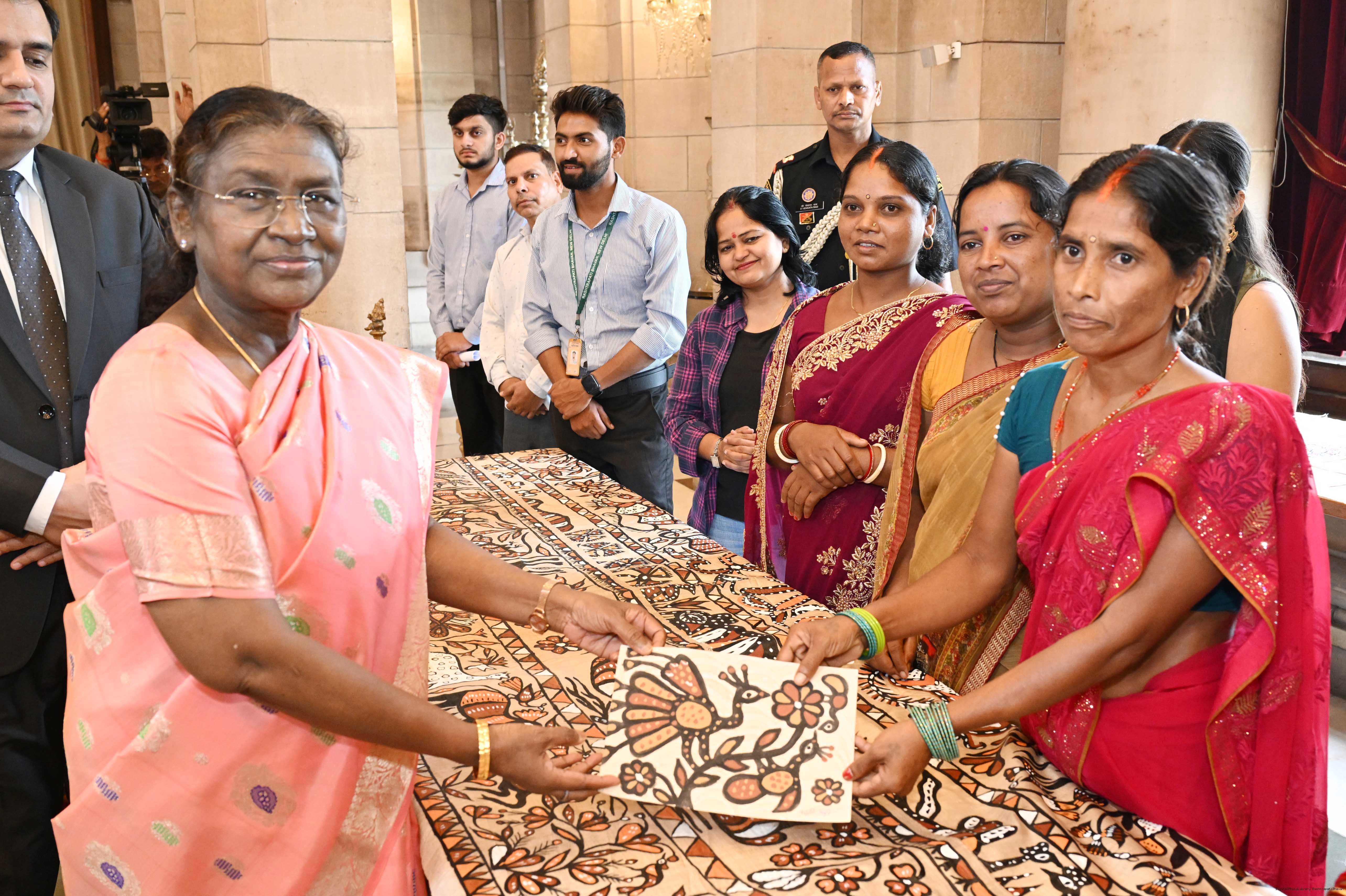 | Caption: | A group of Artists of Sohrai, Pattachitra and Patua art forms called on the President of India, Smt. Droupadi Murmu at Rashtrapati Bhavan on July 24, 2025. |