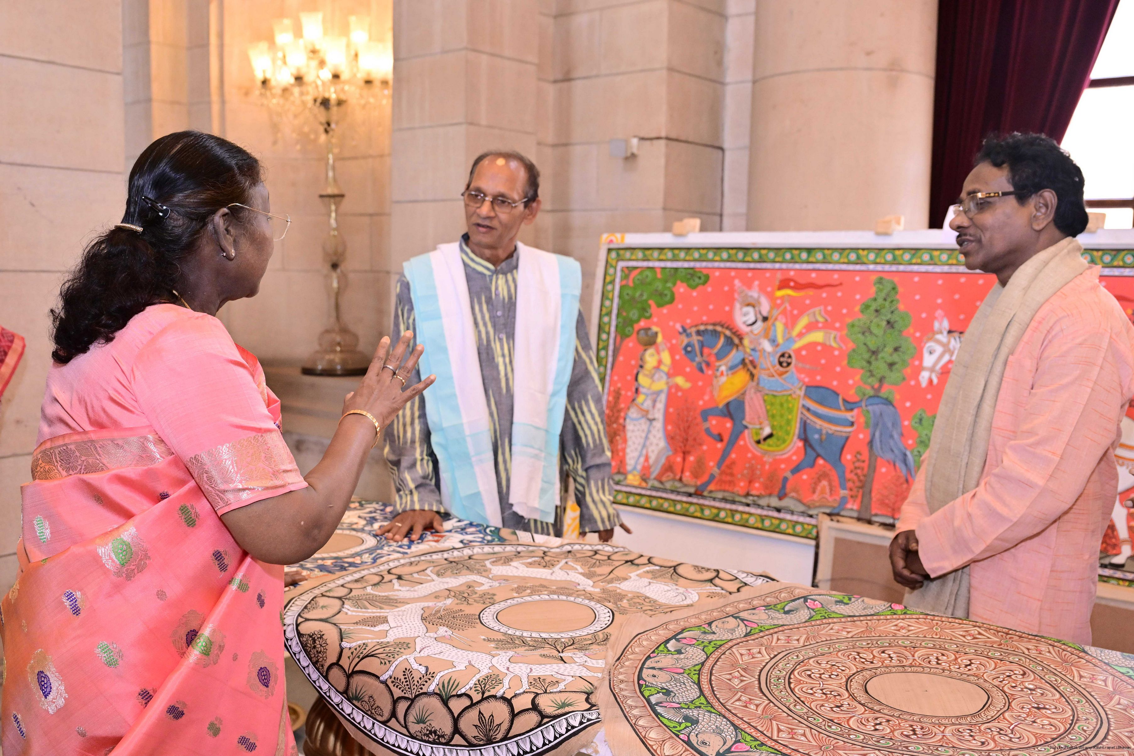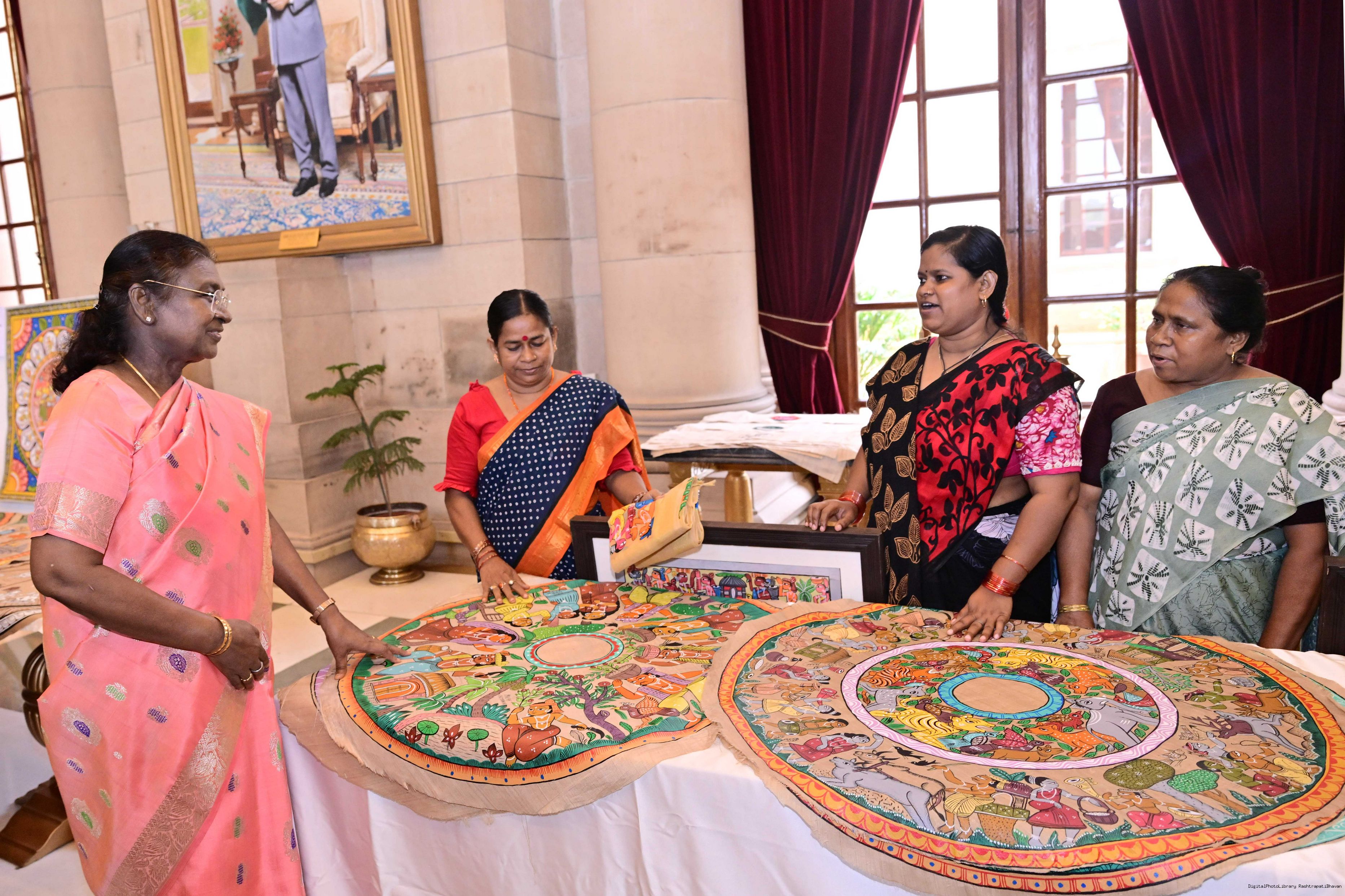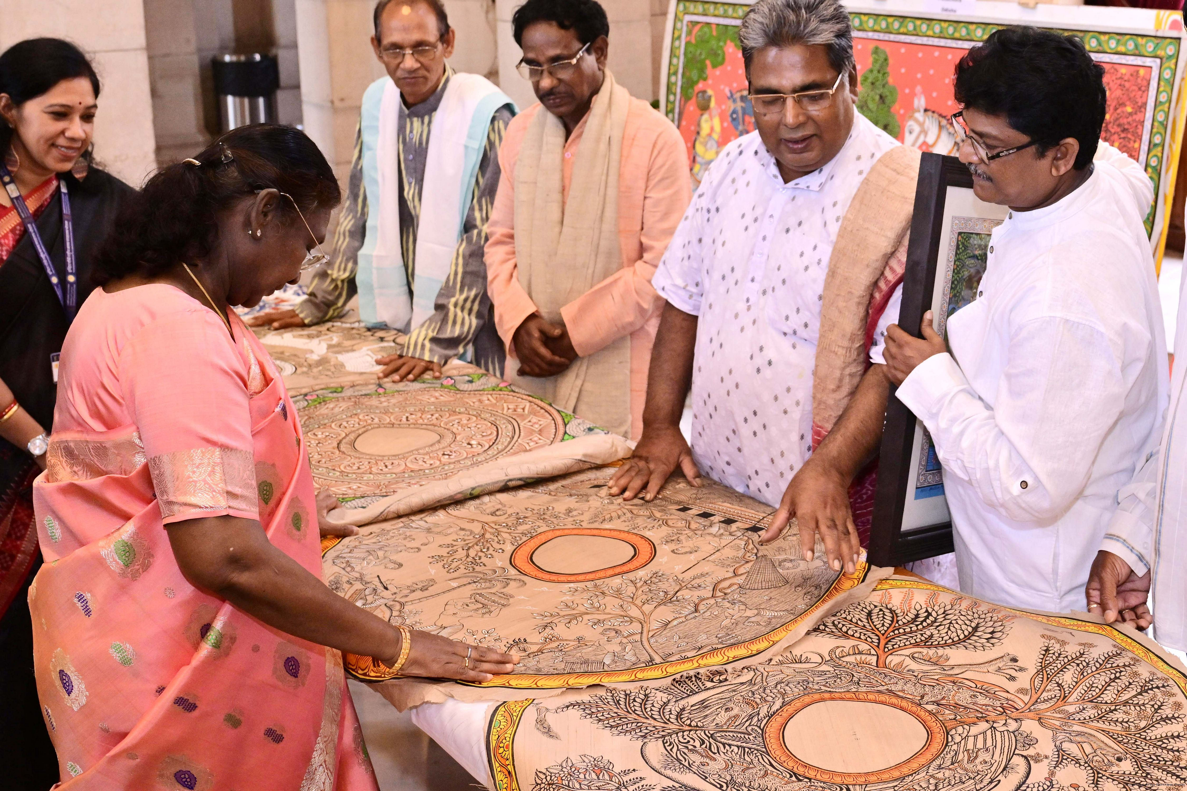 | Caption: | A group of Artists of Sohrai, Pattachitra and Patua art forms called on the President of India, Smt. Droupadi Murmu at Rashtrapati Bhavan on July 24, 2025. |
