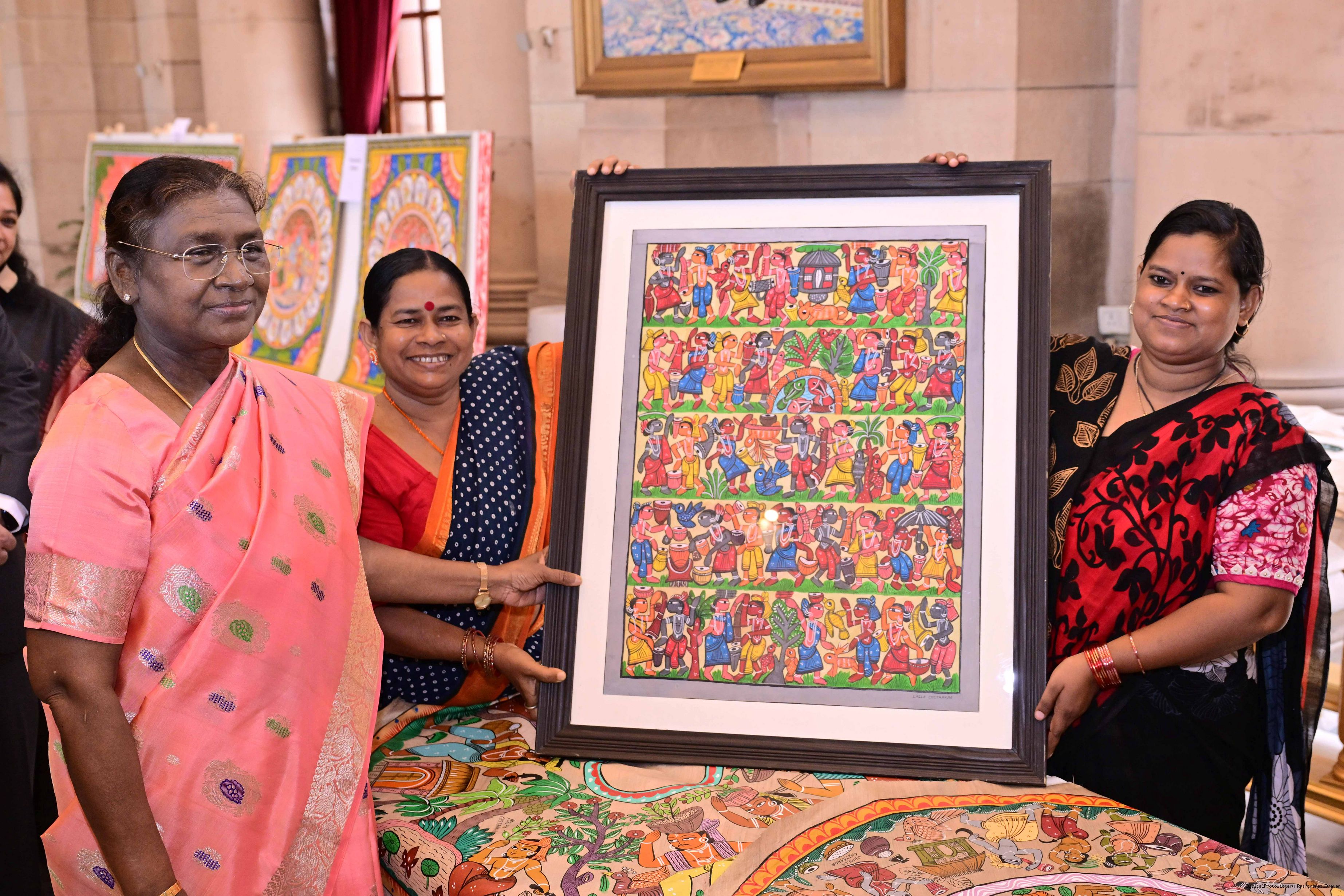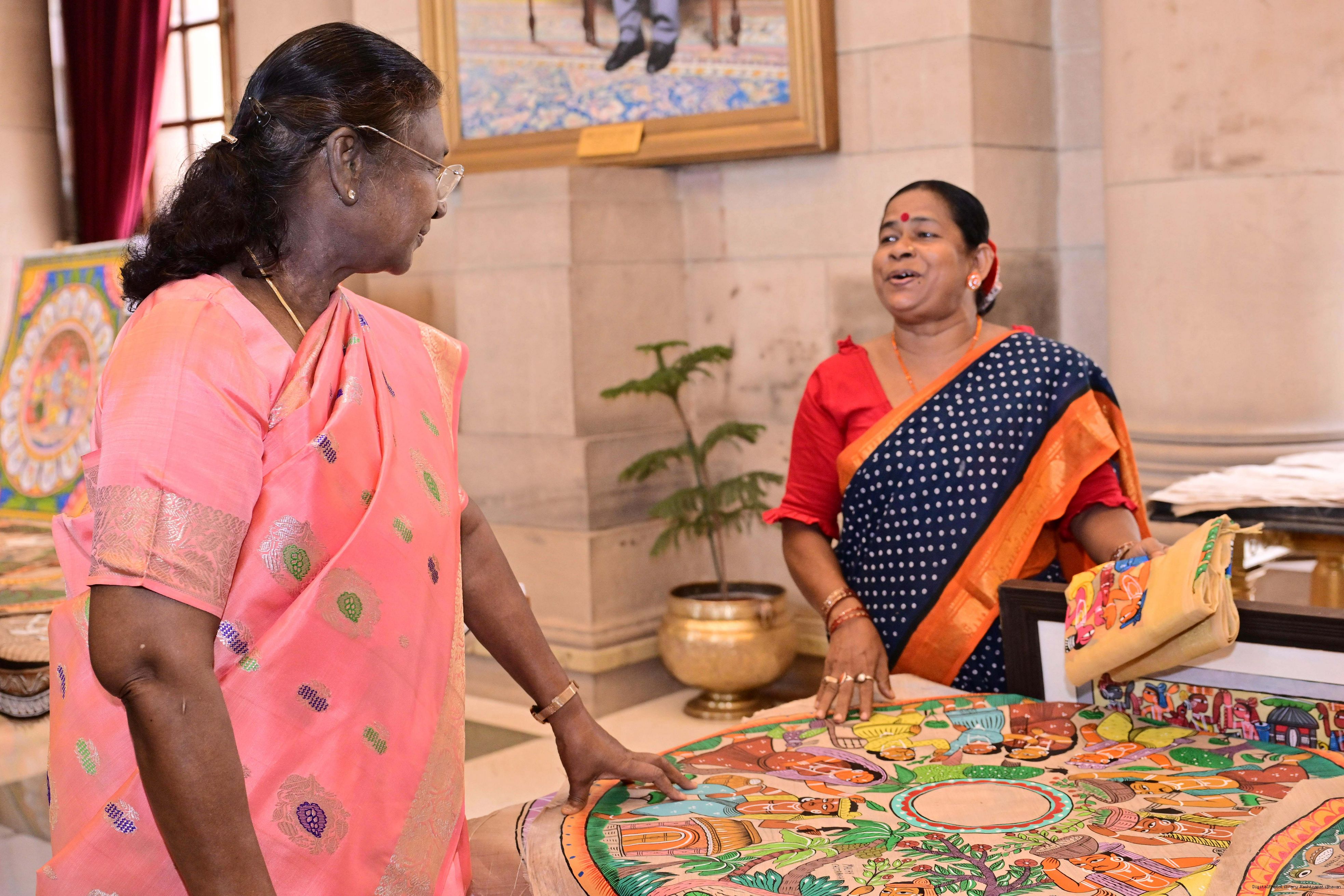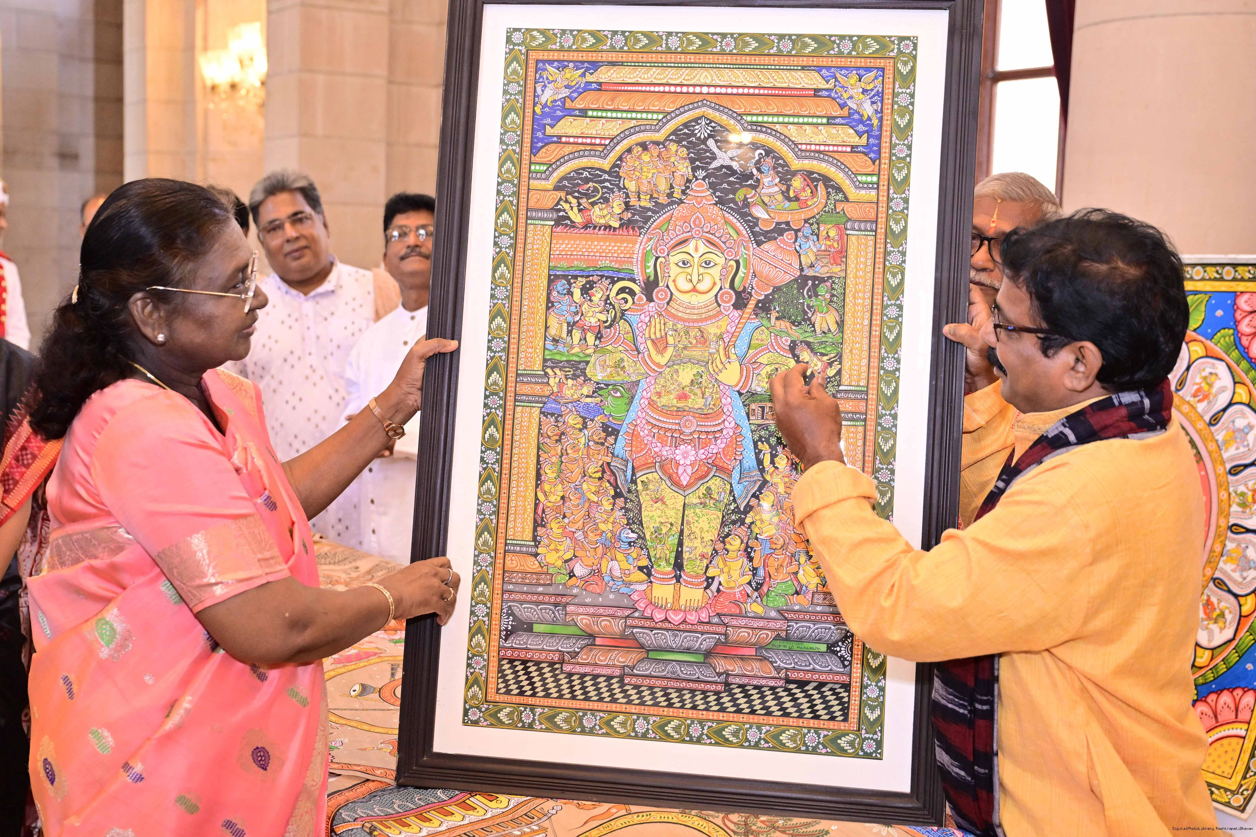 | Caption: | A group of Artists of Sohrai, Pattachitra and Patua art forms called on the President of India, Smt. Droupadi Murmu at Rashtrapati Bhavan on July 24, 2025. |