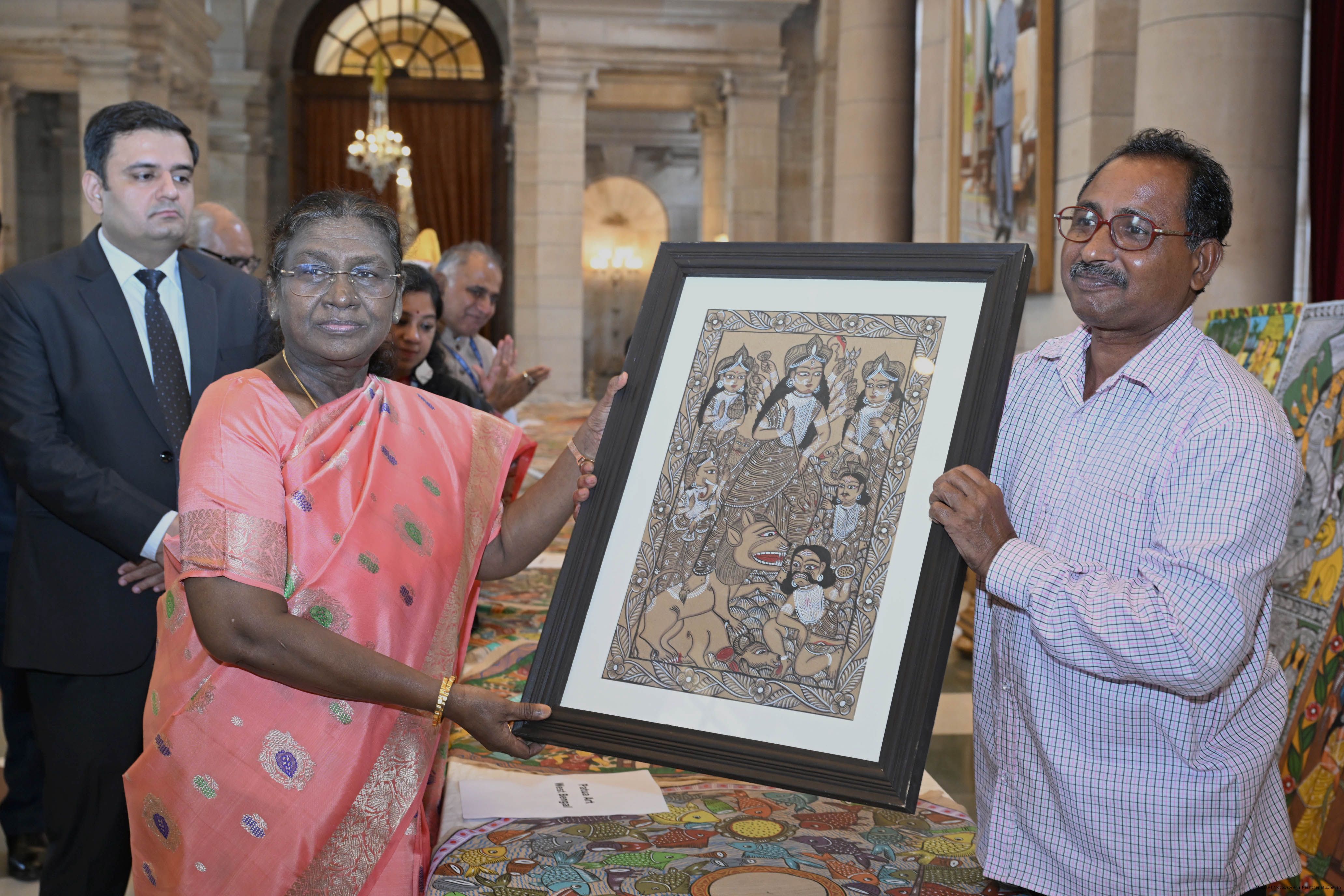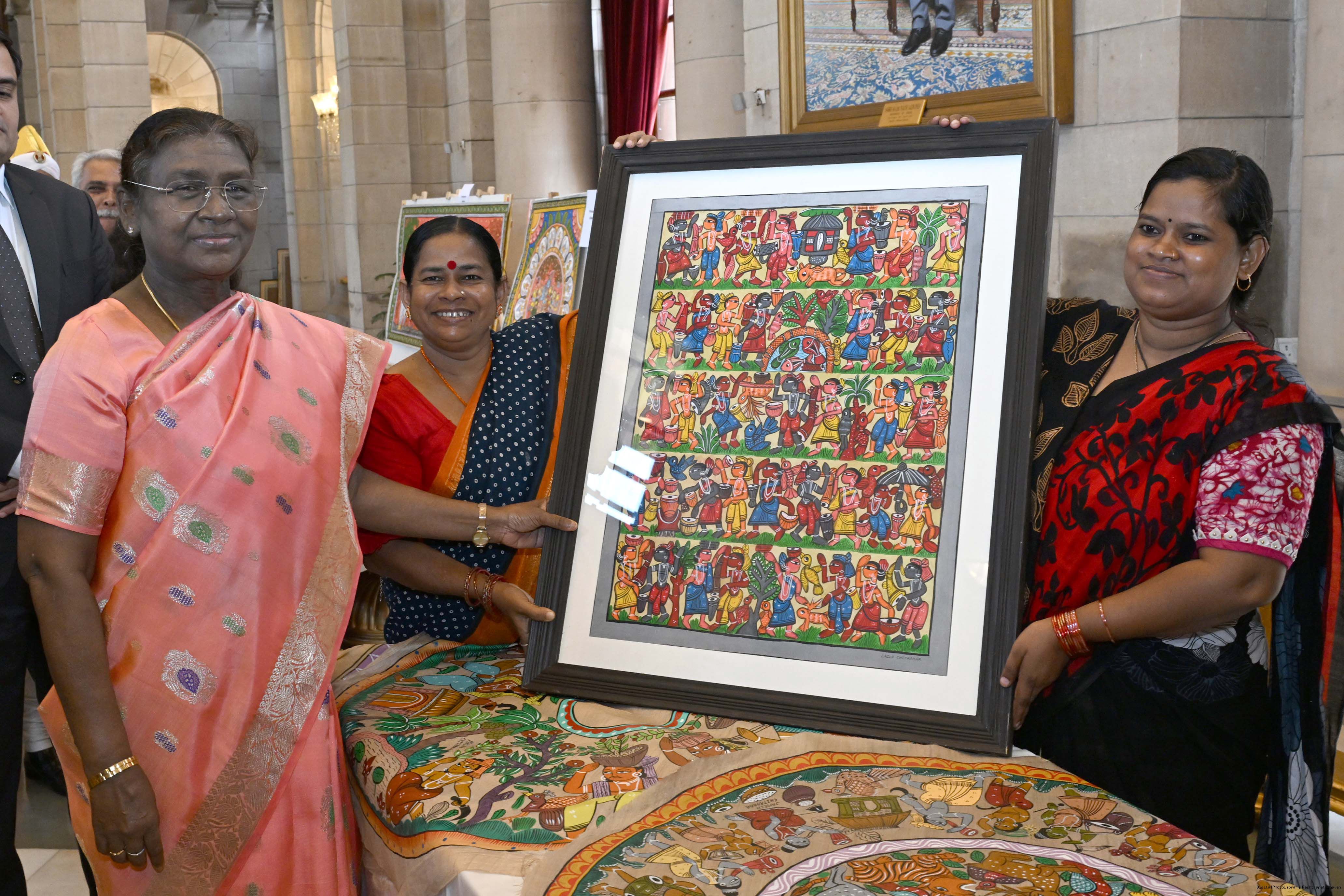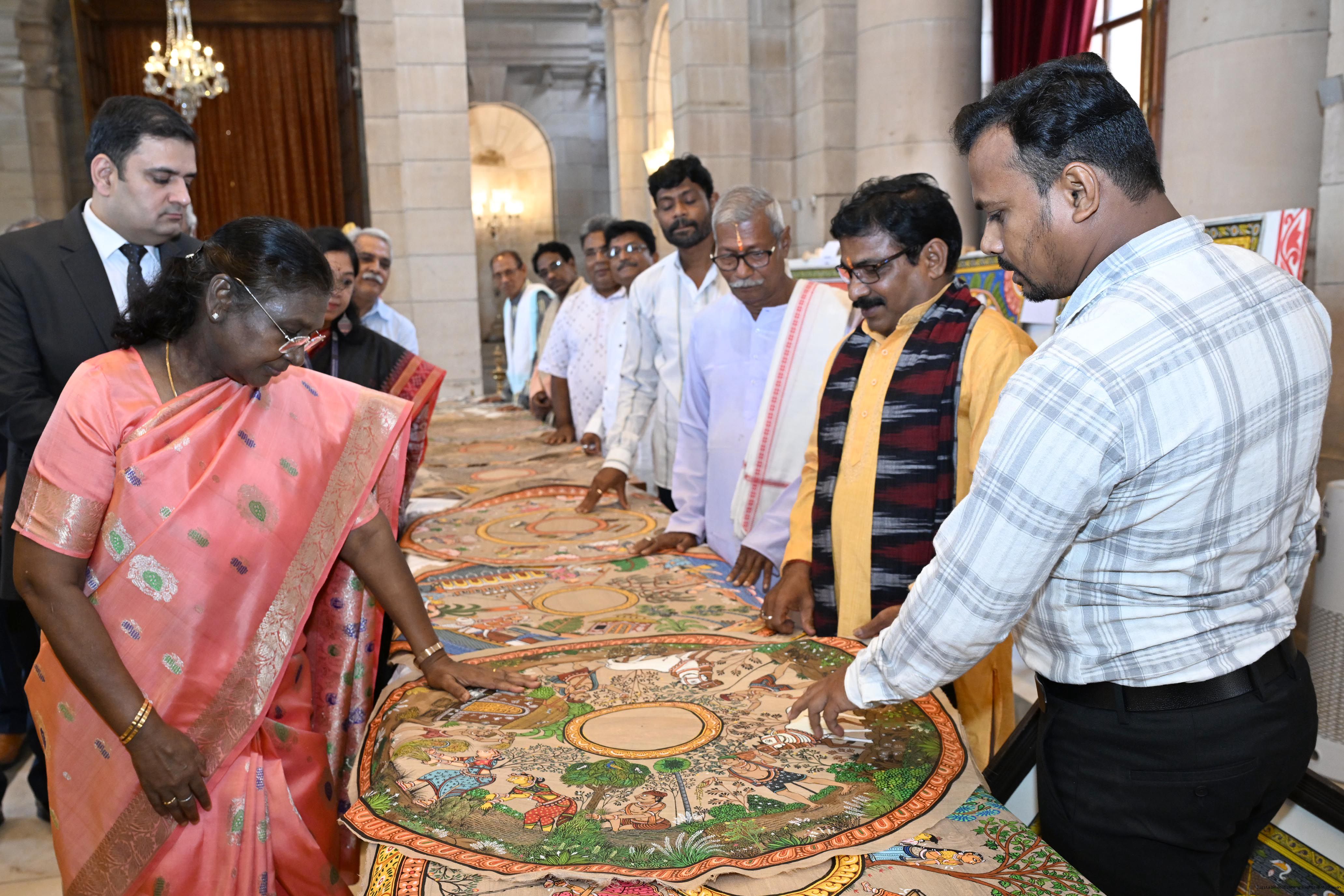 | Caption: | A group of Artists of Sohrai, Pattachitra and Patua art forms called on the President of India, Smt. Droupadi Murmu at Rashtrapati Bhavan on July 24, 2025. |