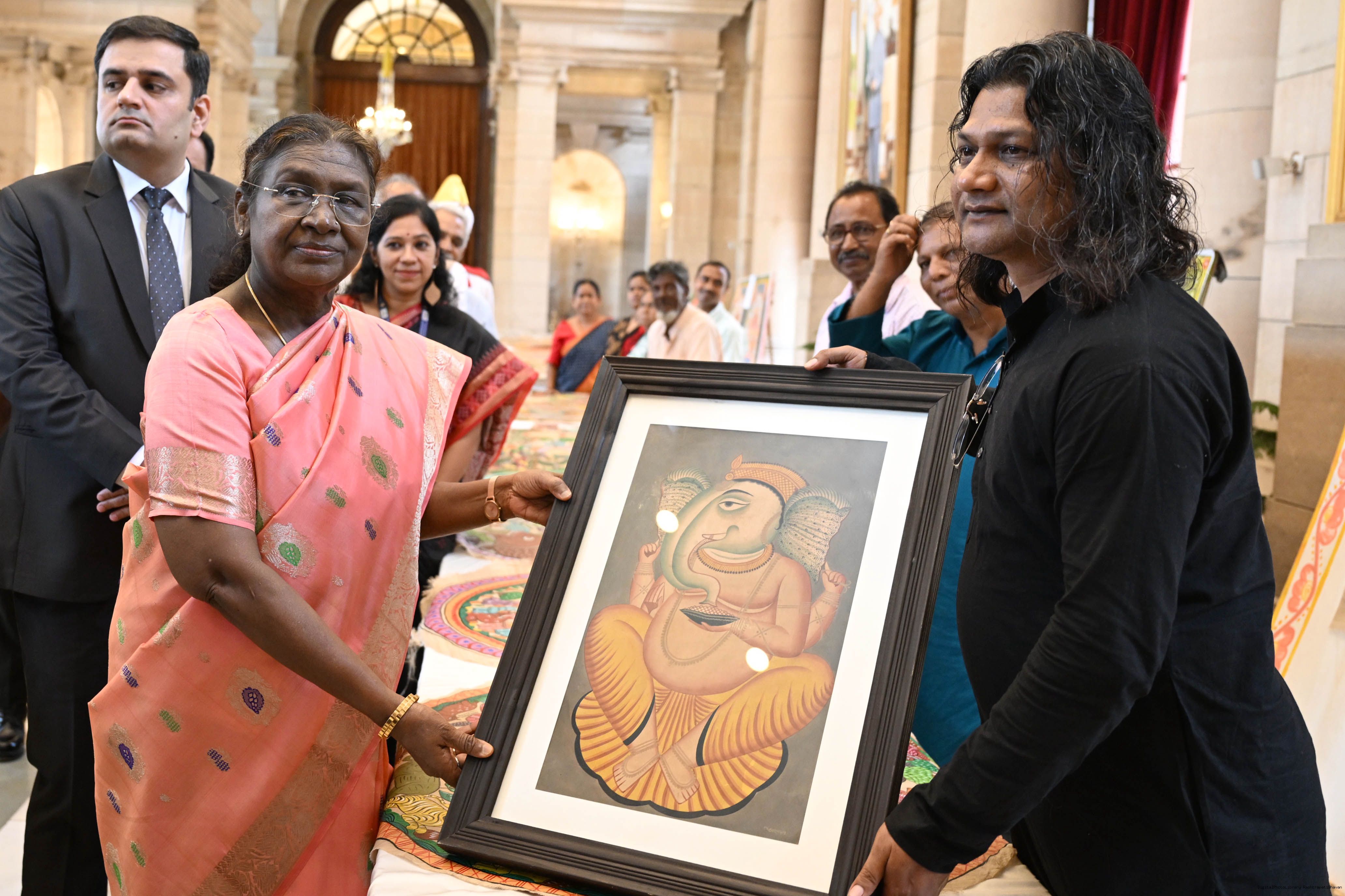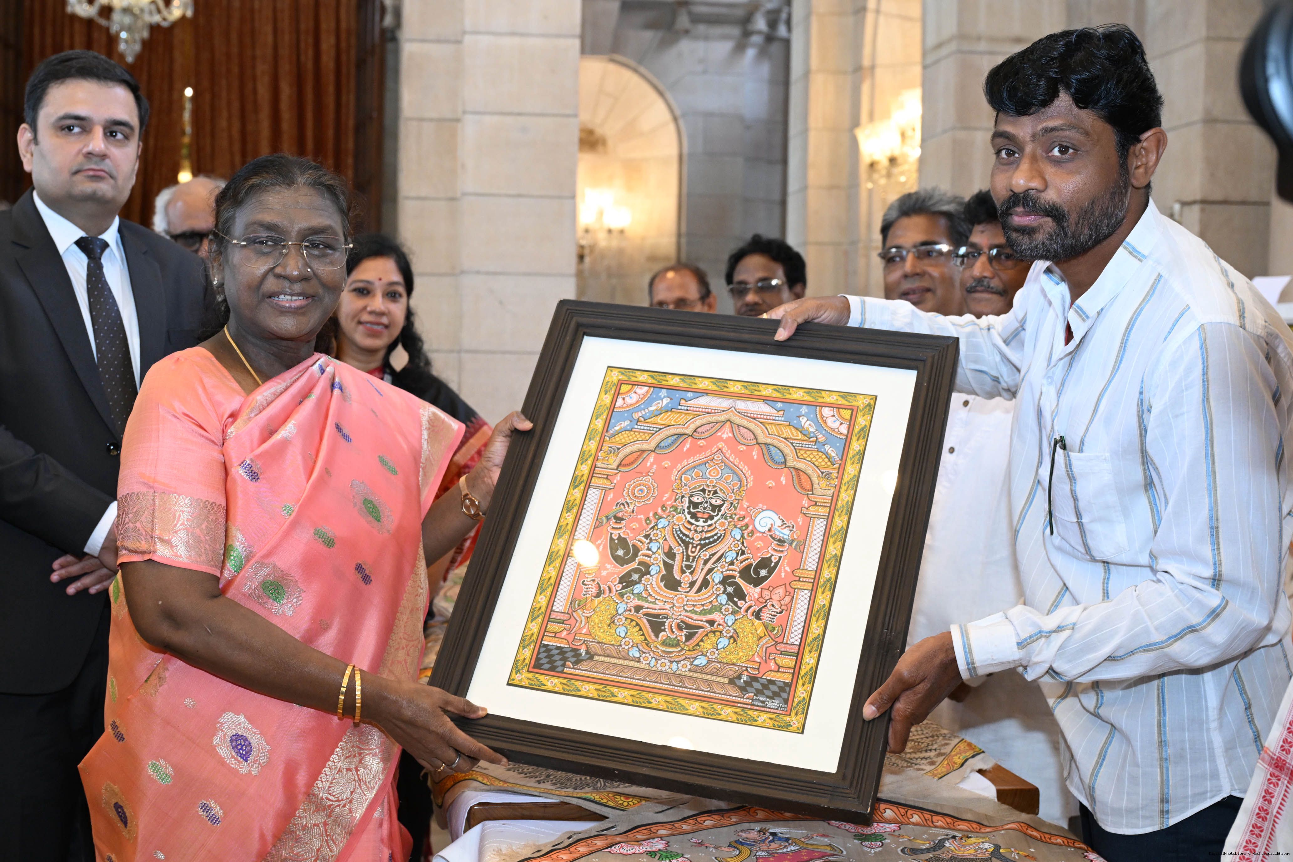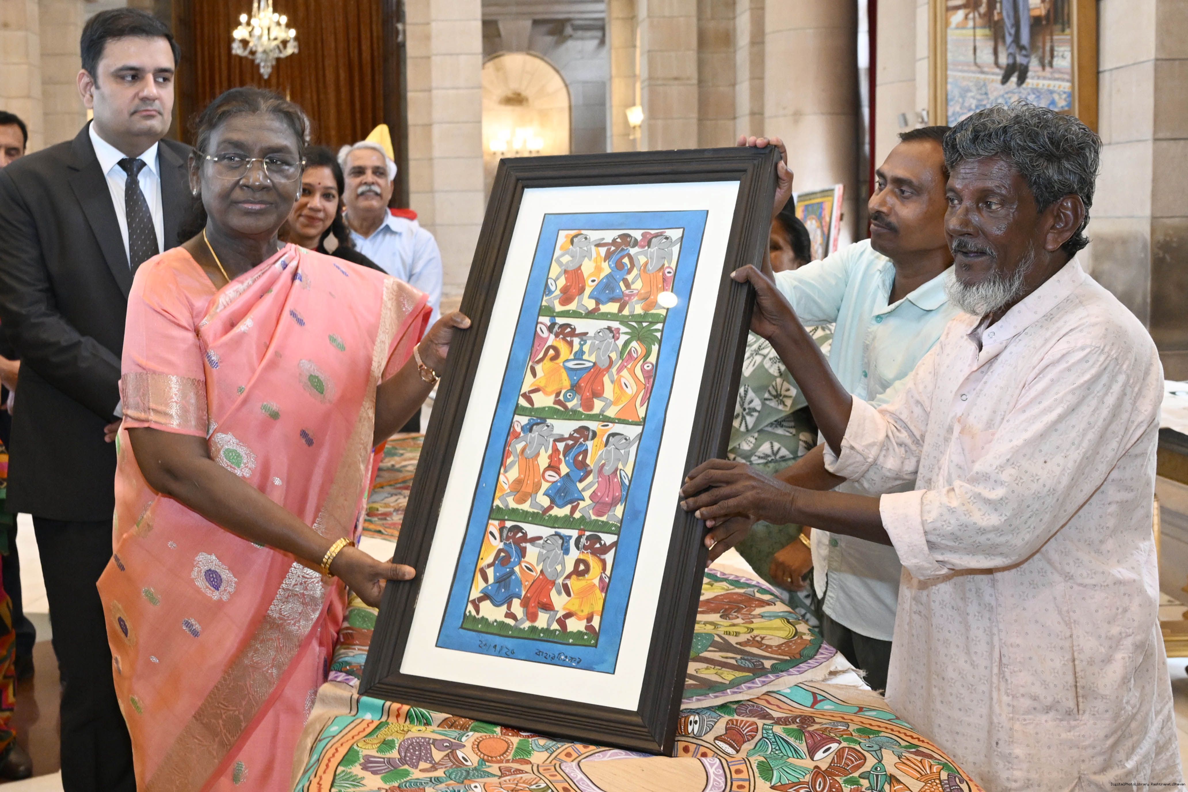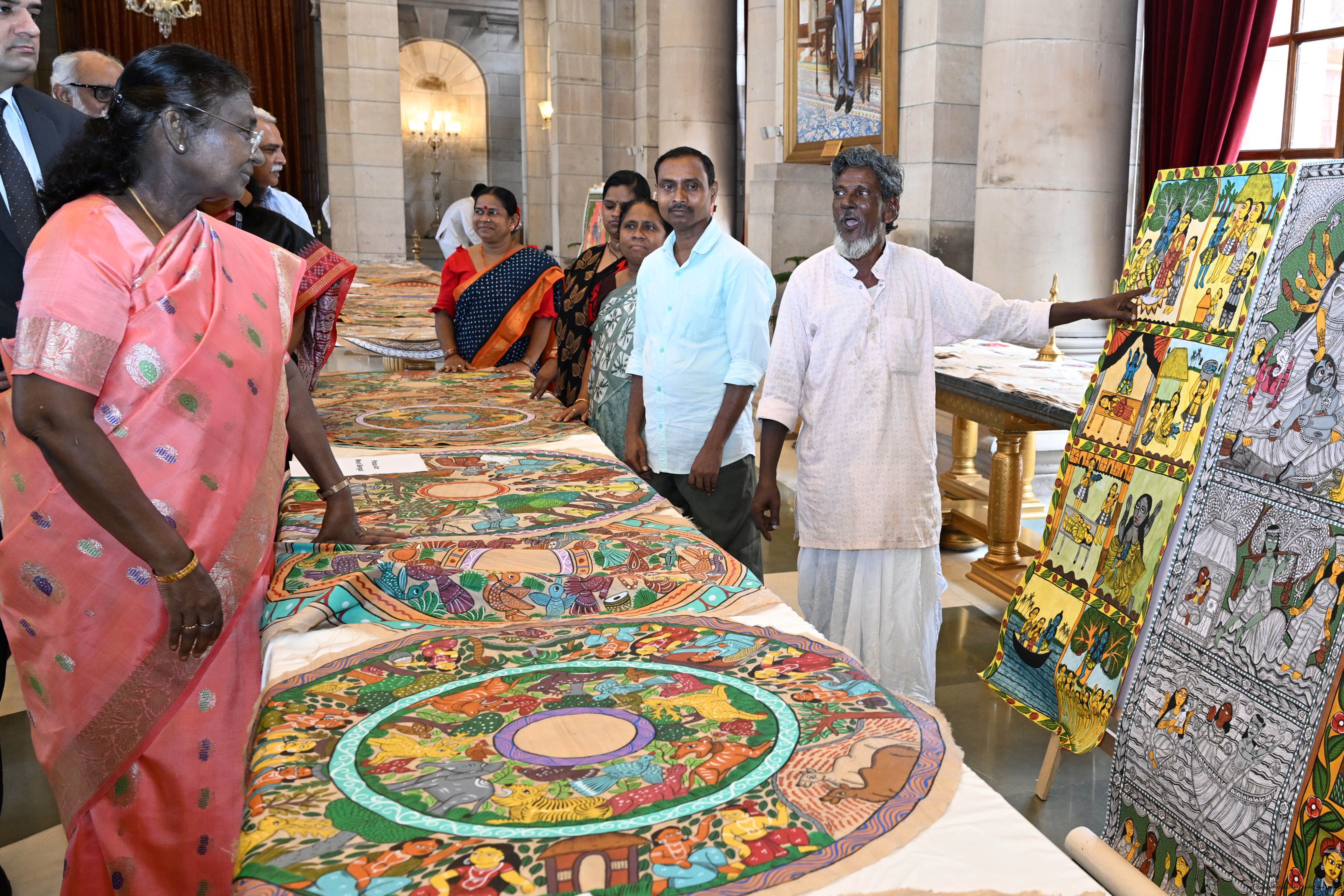 | Caption: | A group of Artists of Sohrai, Pattachitra and Patua art forms called on the President of India, Smt. Droupadi Murmu at Rashtrapati Bhavan on July 24, 2025. |
