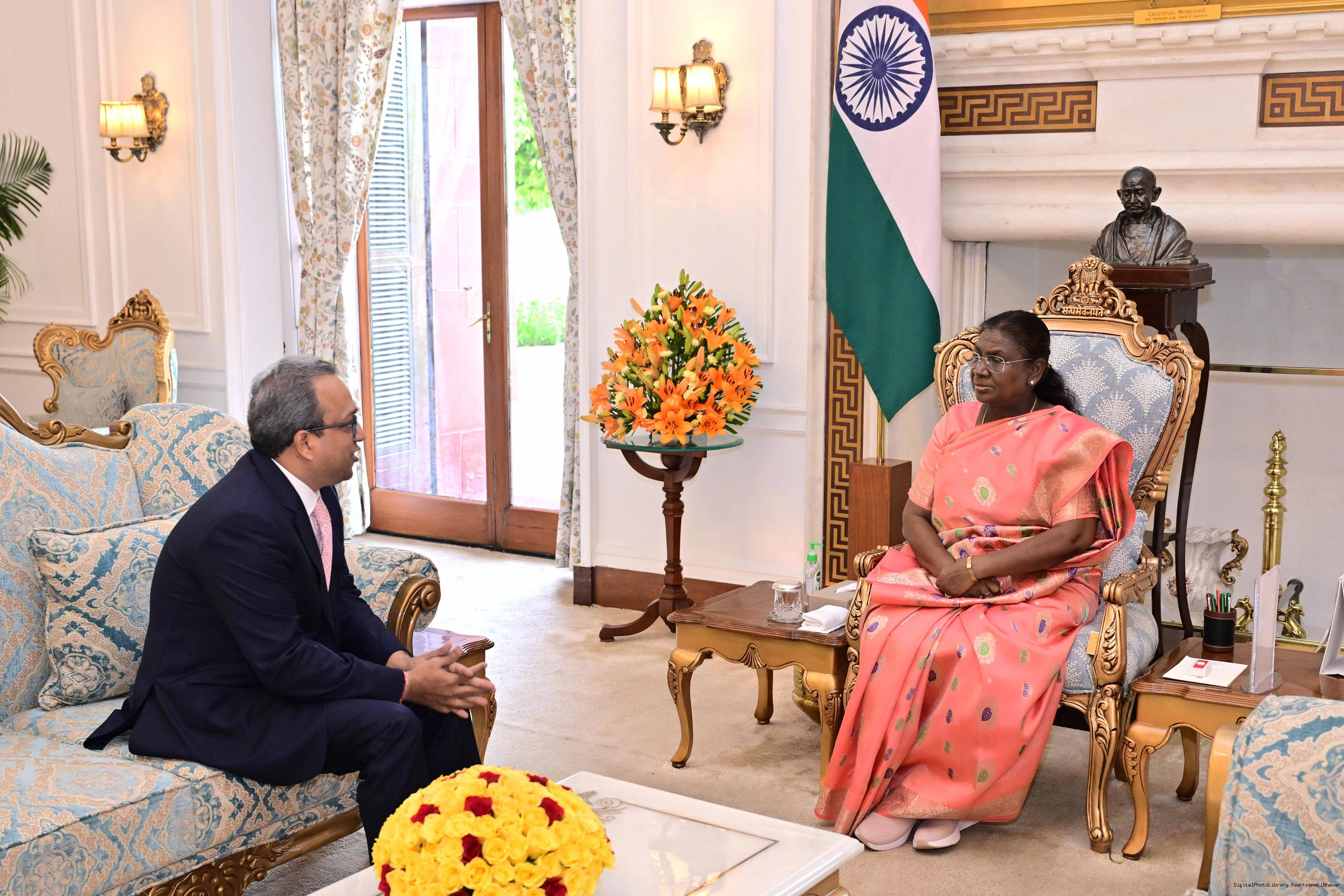| Caption: | Shri Harsha Vardhan Agarwal, President of FICCI, meeting with the President of India, Smt Droupadi Murmu at Rashtrapati Bhavan on July 24, 2025. |