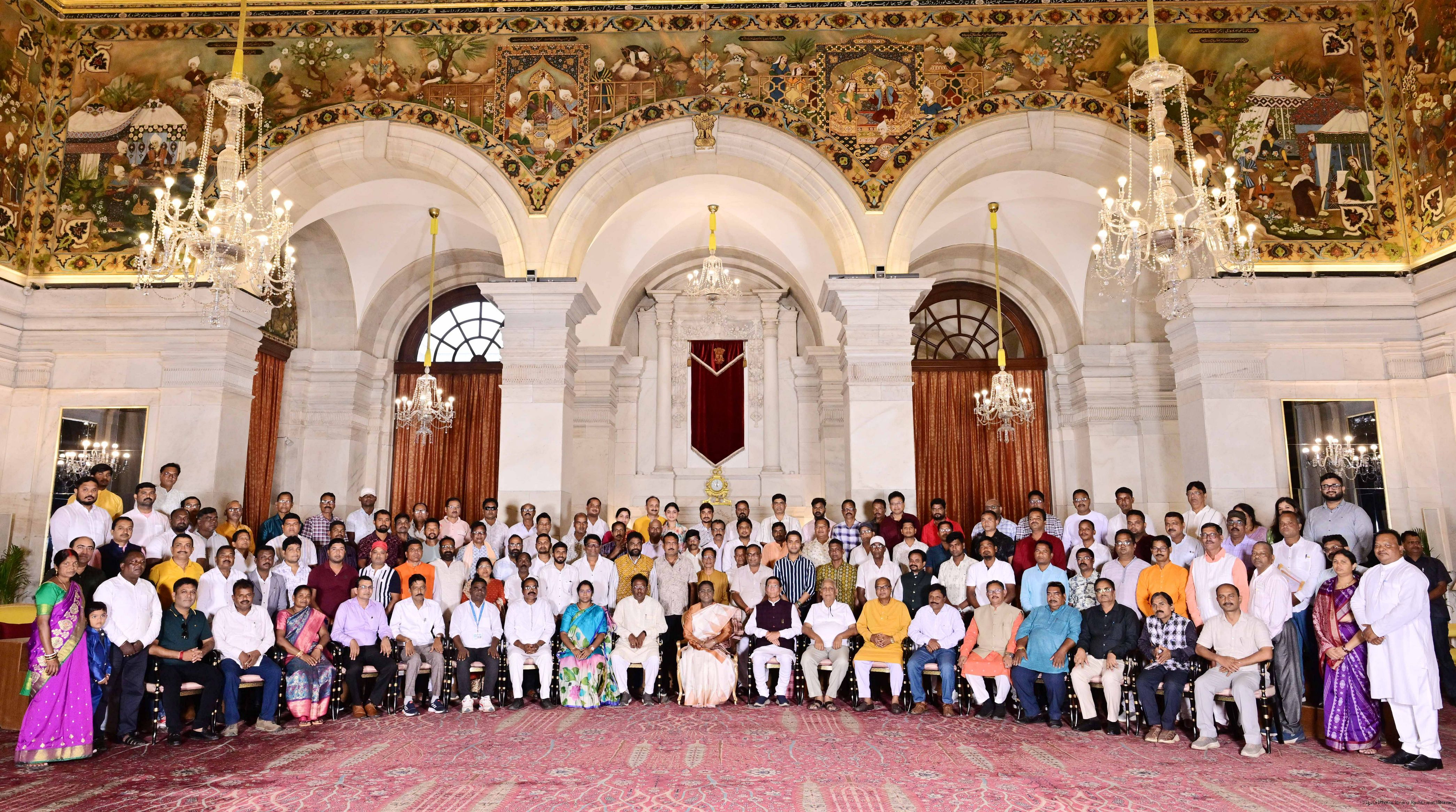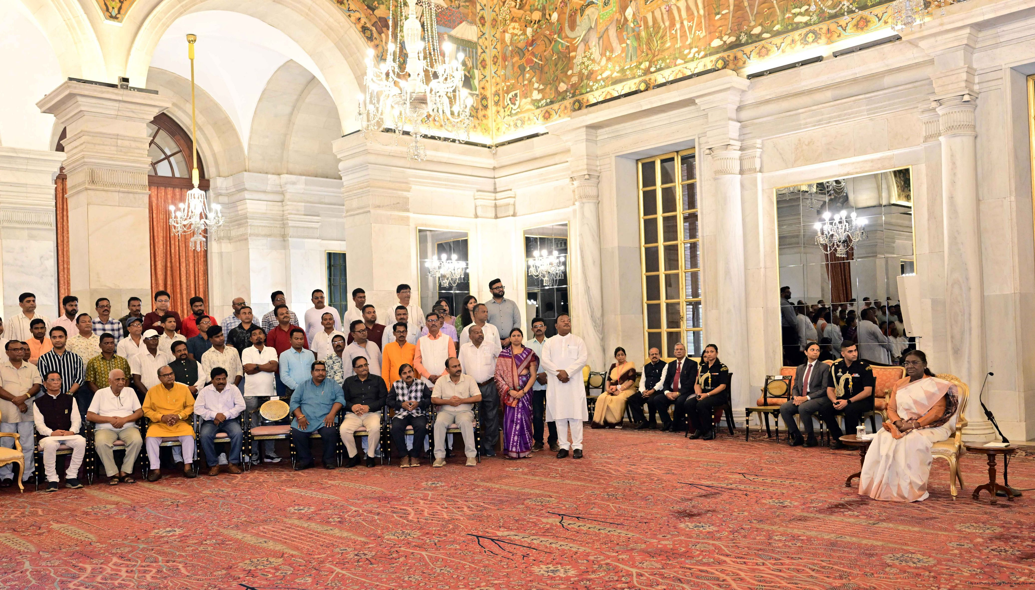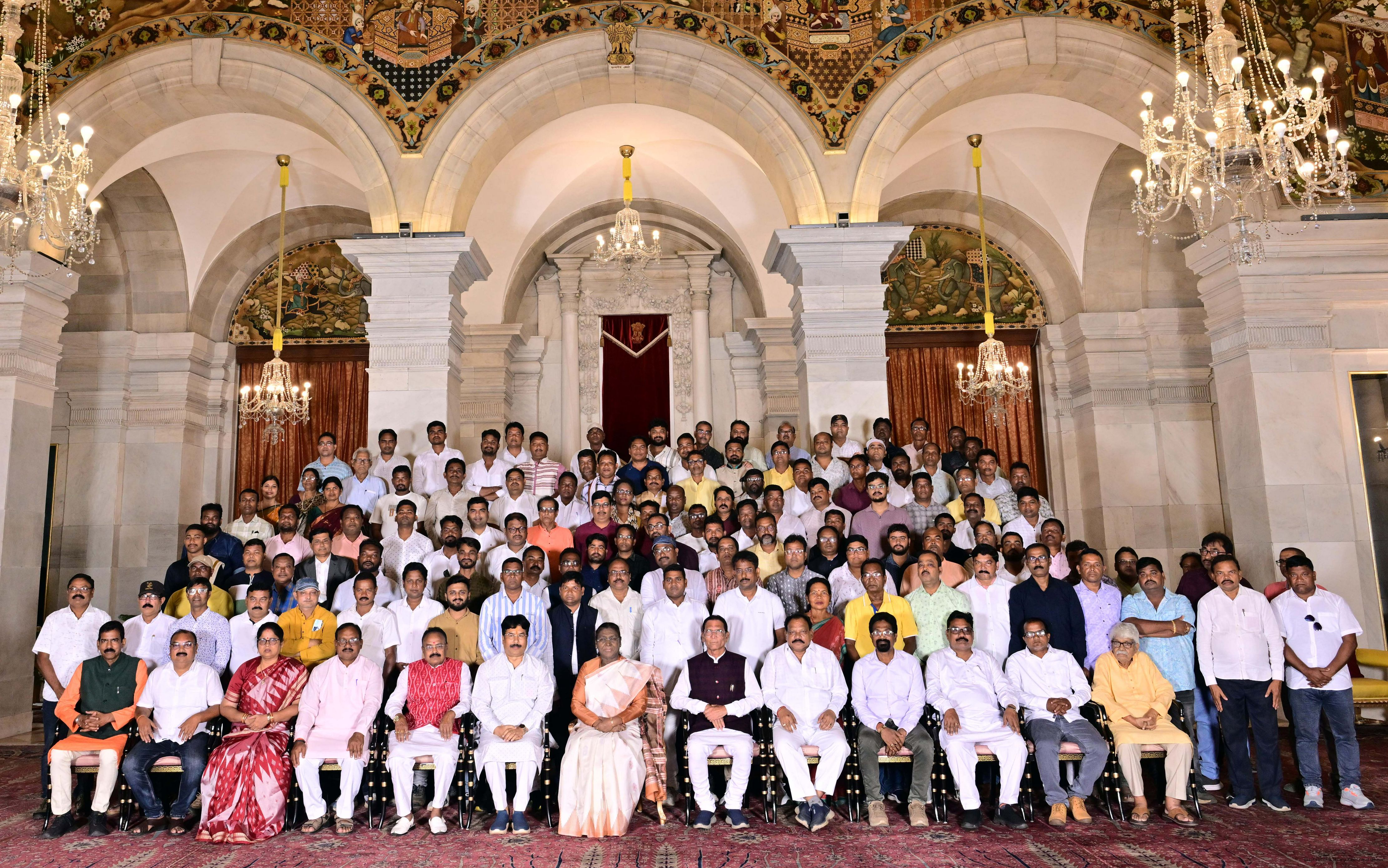 | Caption: | The President of India, Smt. Droupadi Murmu met and interacted a group of persons from Mayurbhanj Odisha including Shri Naba Charan Majhi, MP(LS), Smt. Mamata Mohanta, MP (RS) along with others Rashtrapati Bhavan on July 29, 2025. |