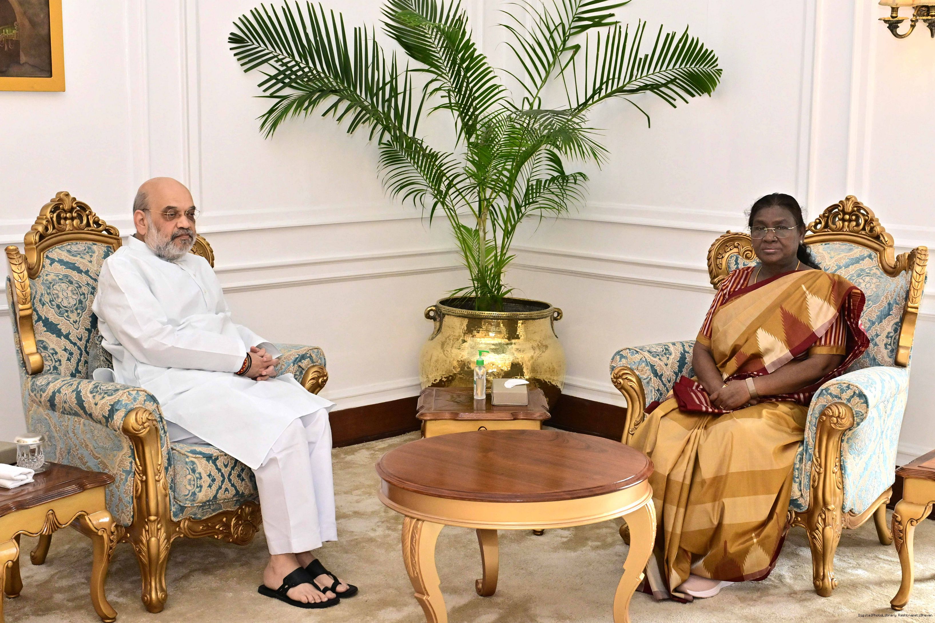 | Caption: | The Union Minister for Home Affairs and Cooperation, Shri Amit Shah called on the President of India, Smt. Droupadi Murmu at Rashtrapati Bhavan on August 03, 2025. |