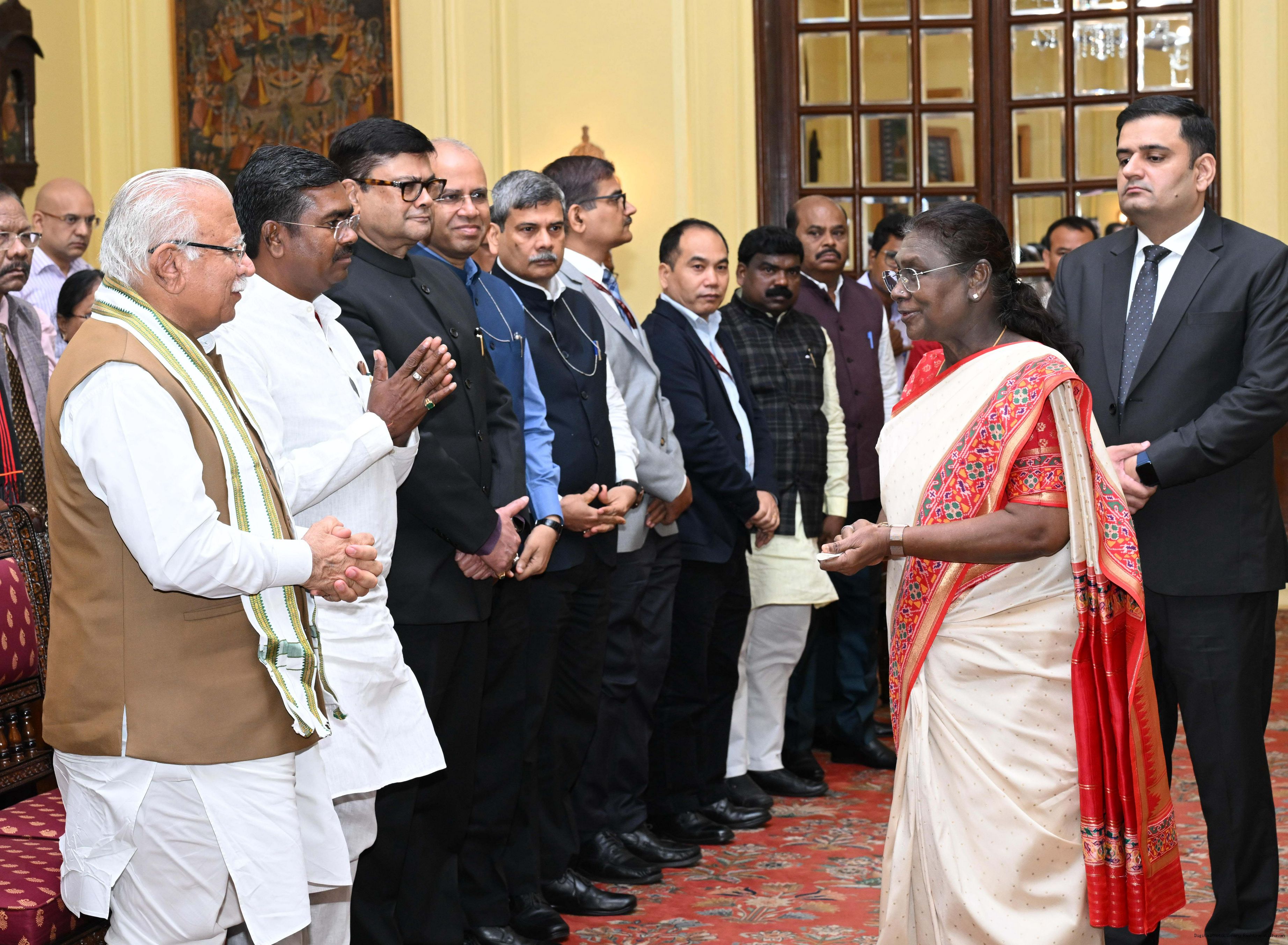 | Caption: | A group of eminent tribal people from various states representing different sectors called on the President of India, Smt. Droupadi Murmu at Rashtrapati Bhavan on August 4, 2025. |