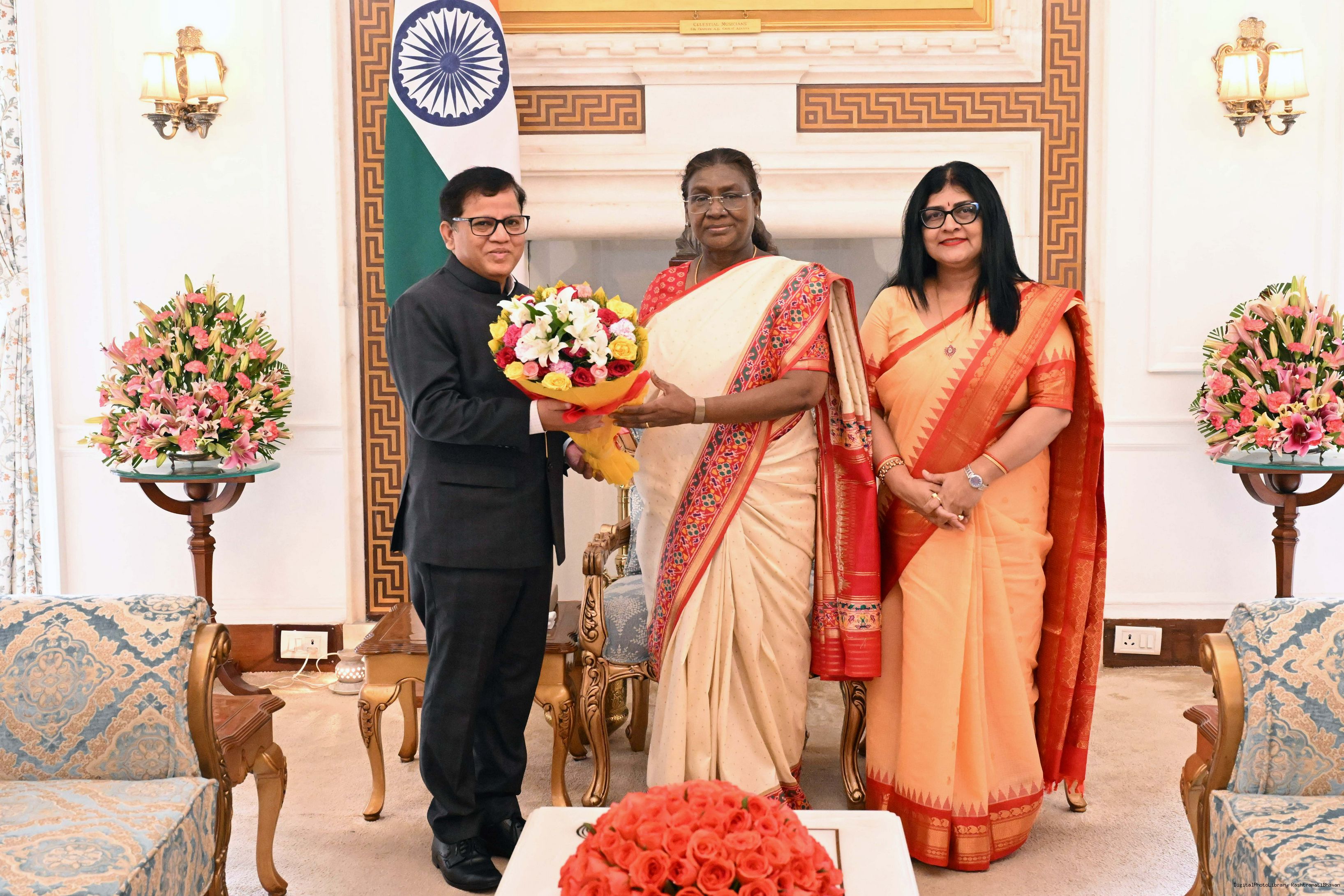 | Caption: | Shri Nikunja Bihari Dhal, Secy, Ministry of Parliamentary Affairs, along with spouse meeting with the President of India, Smt. Droupadi Murmu at Rashtrapati Bhavan on August 4, 2025. |