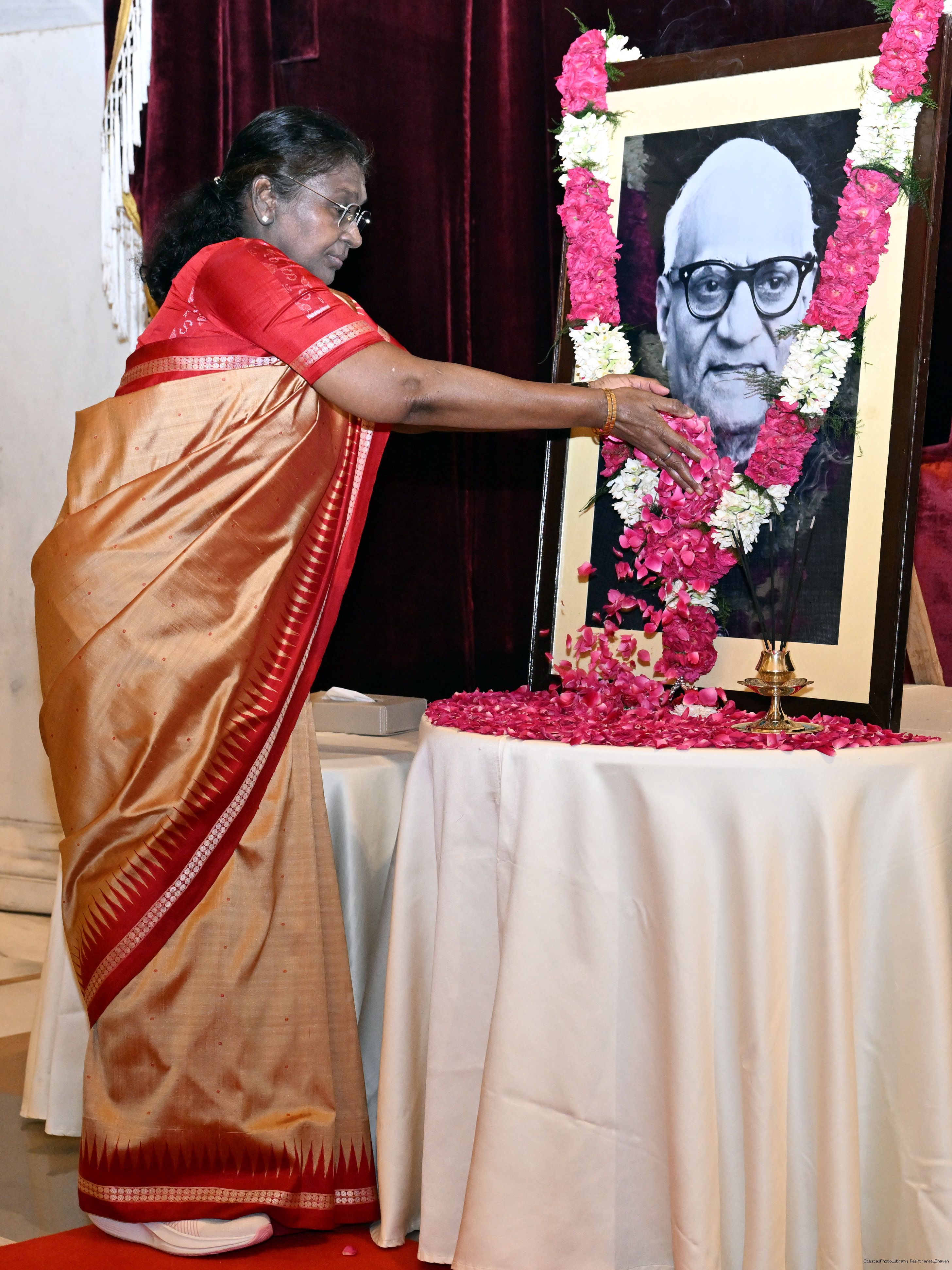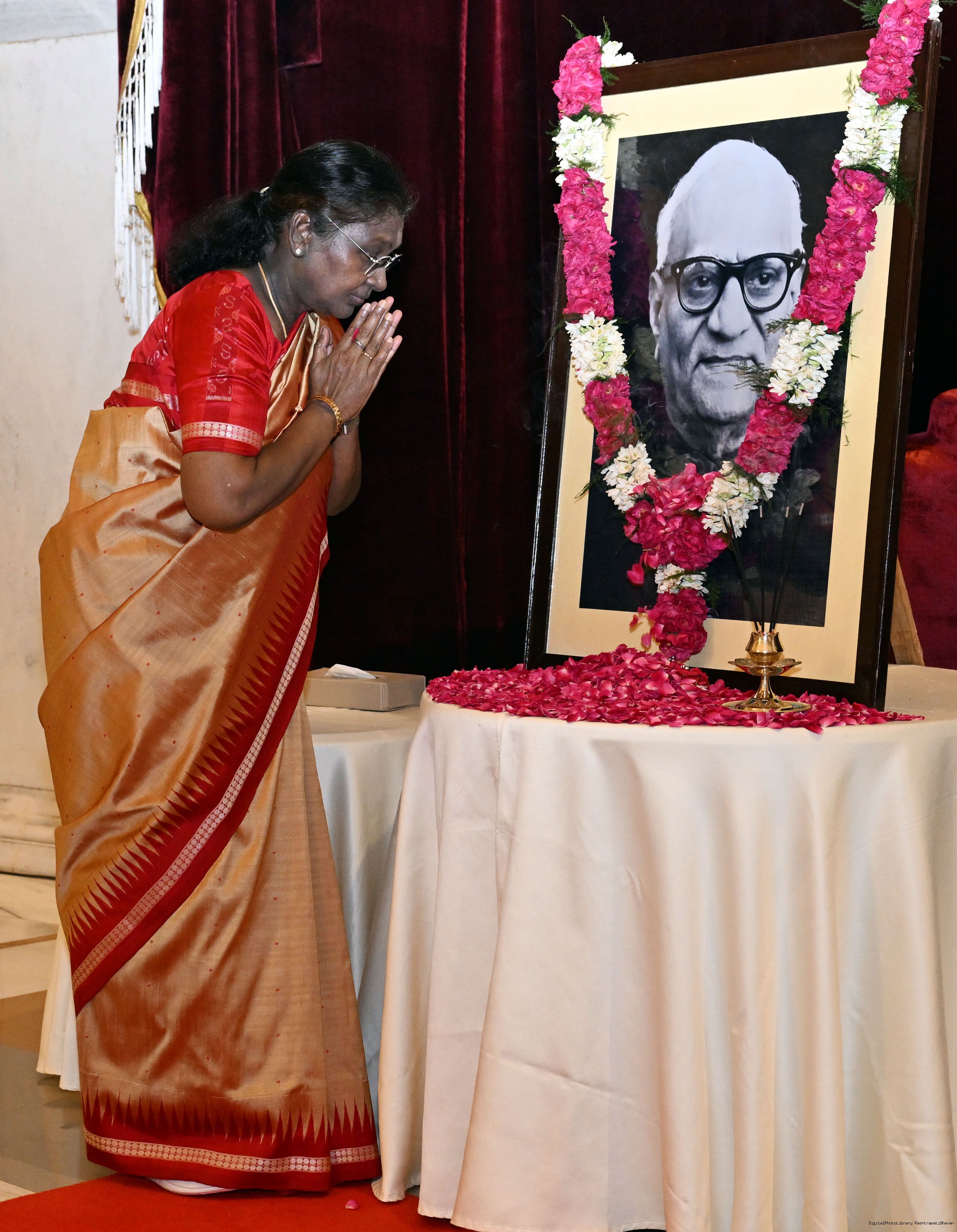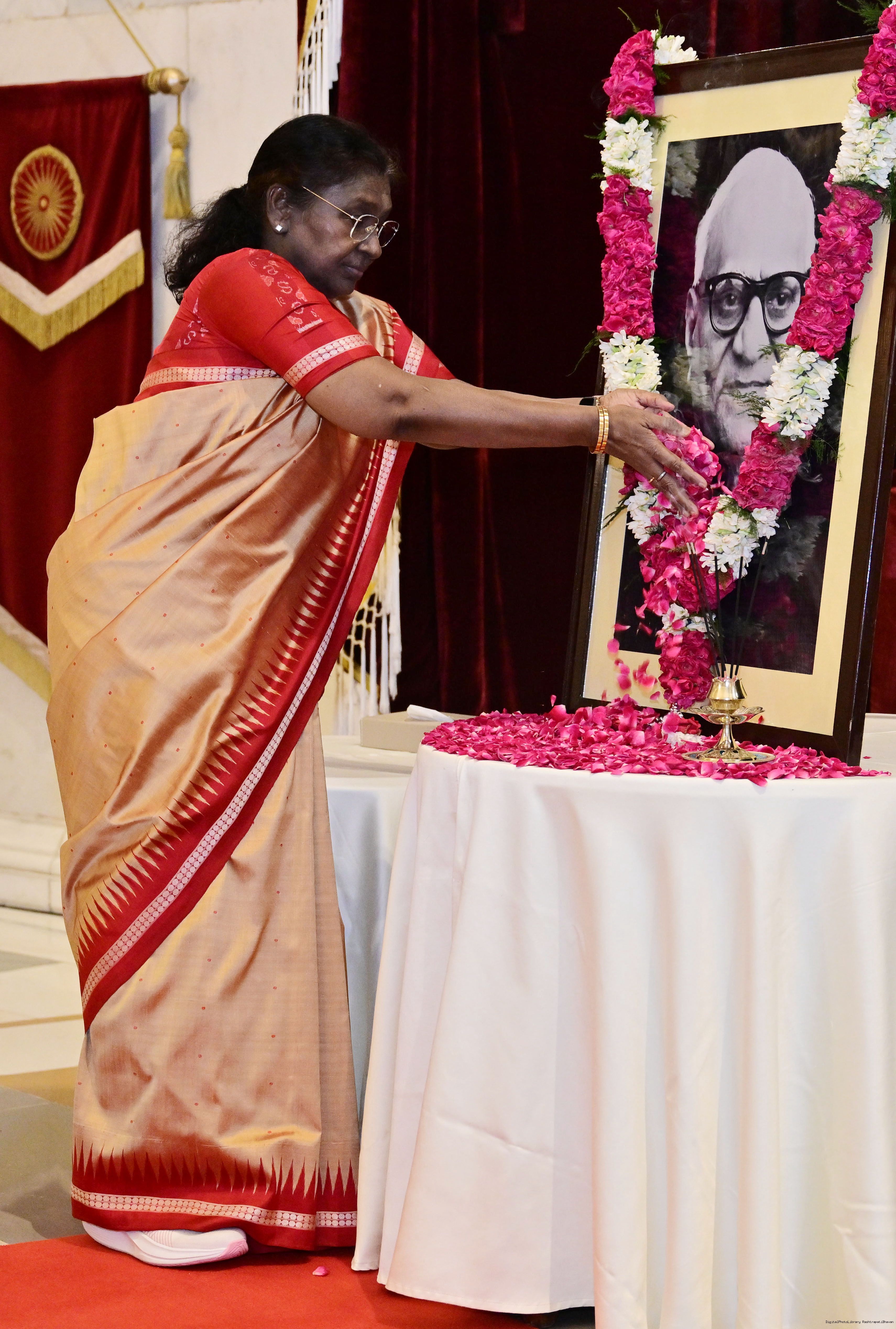 | Caption: | The President of India, Smt Droupadi Murmu paid floral tributes to Shri V.V. Giri, former President of India on his birth anniversary at Rashtrapati Bhavan on August 10, 2025. |