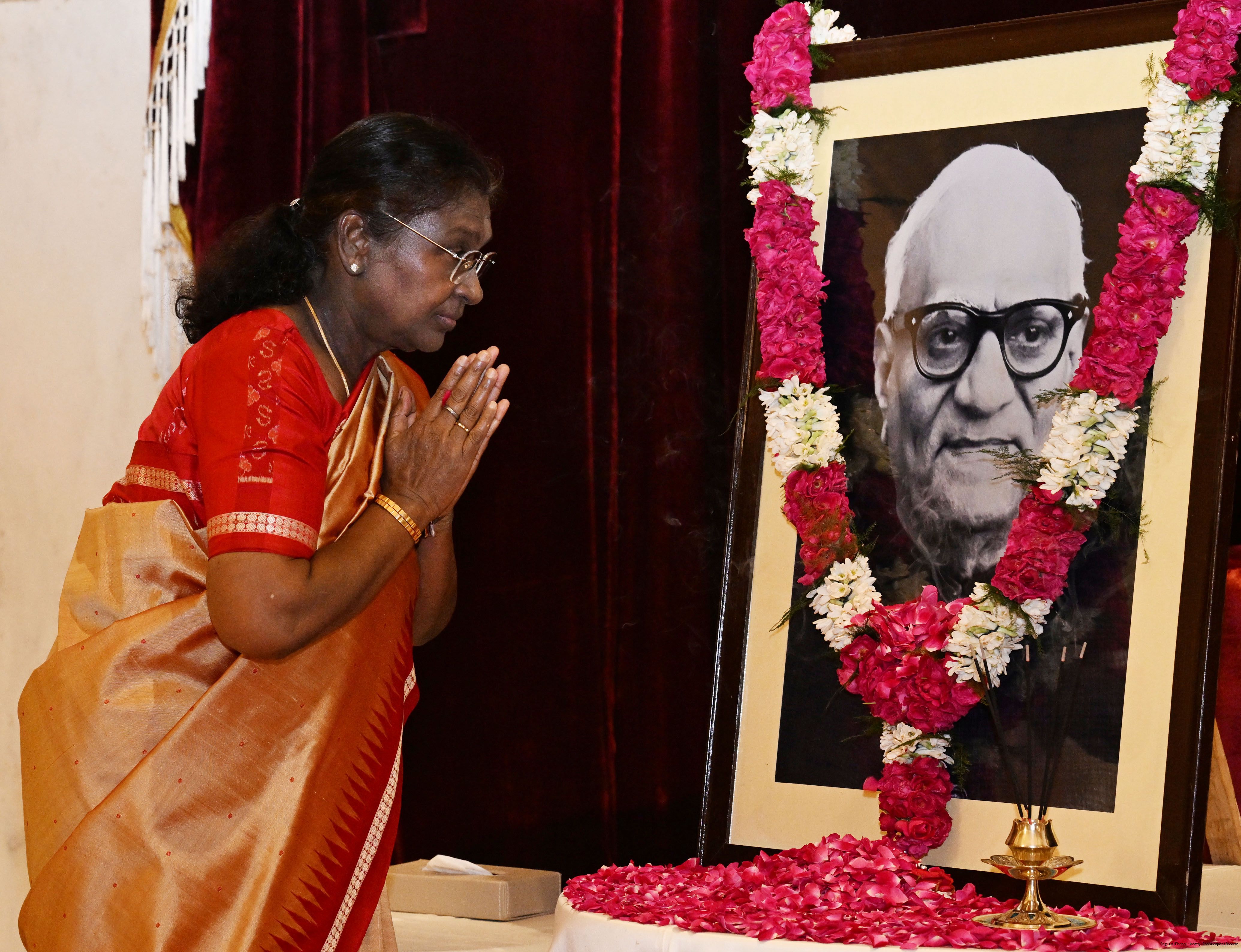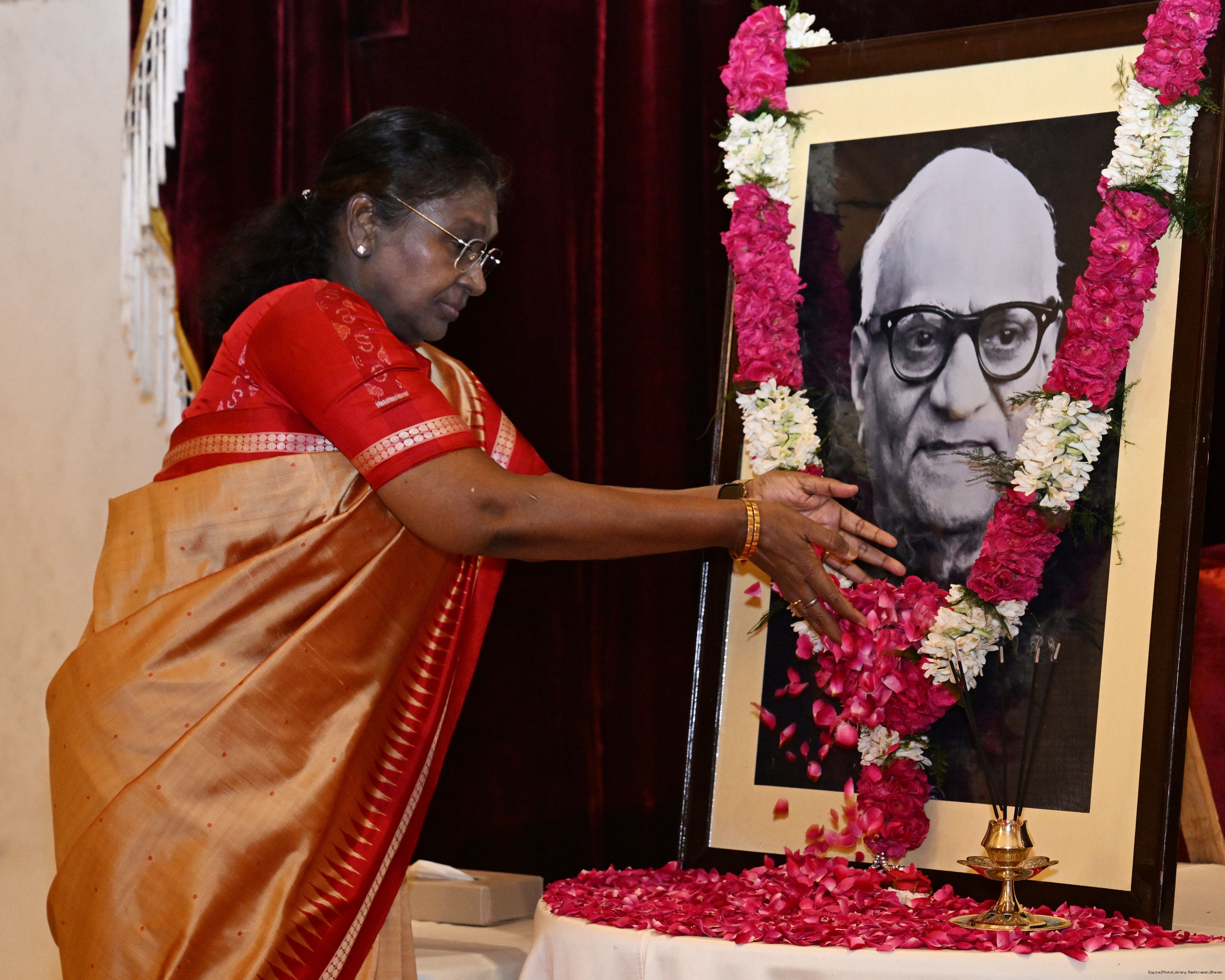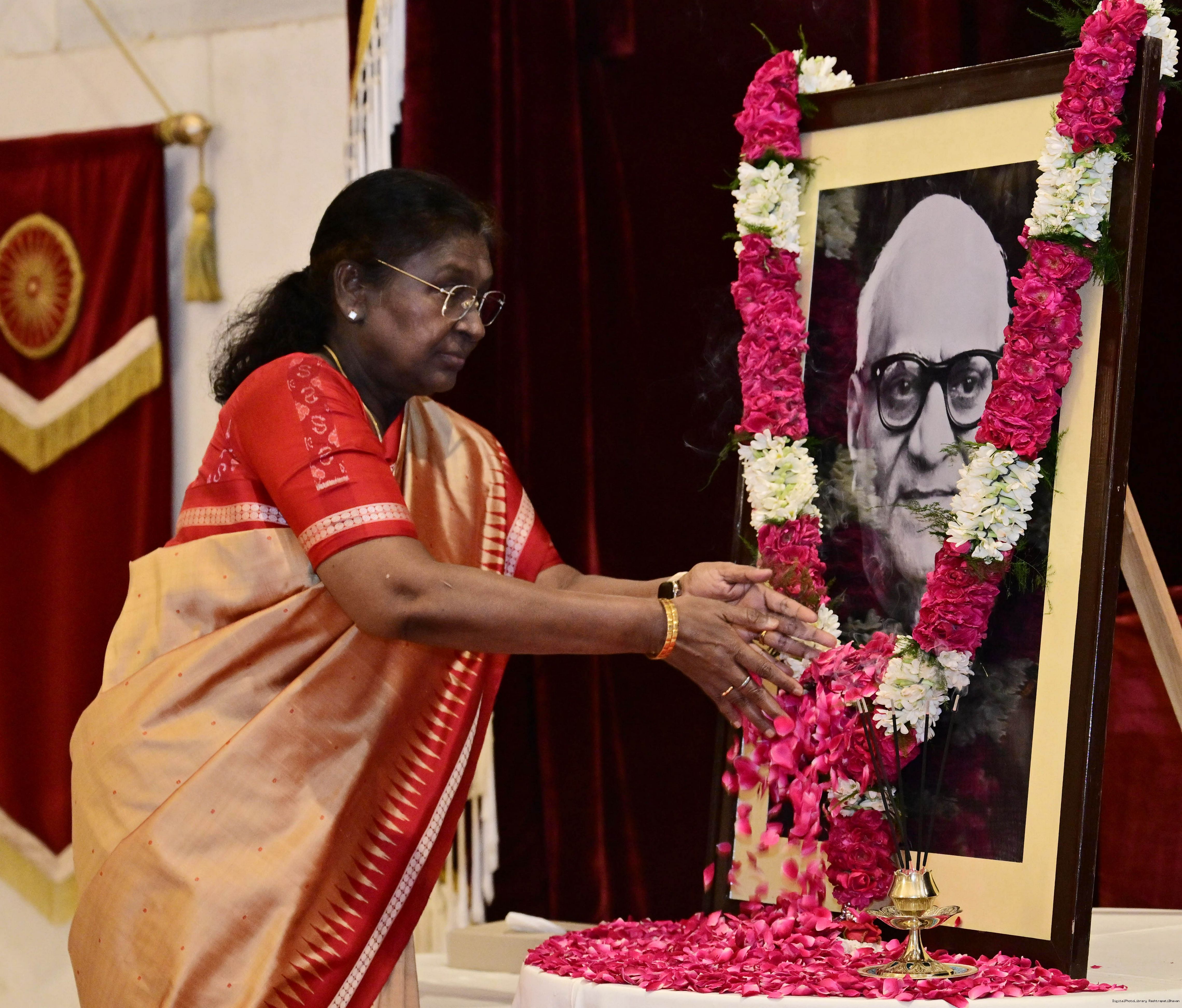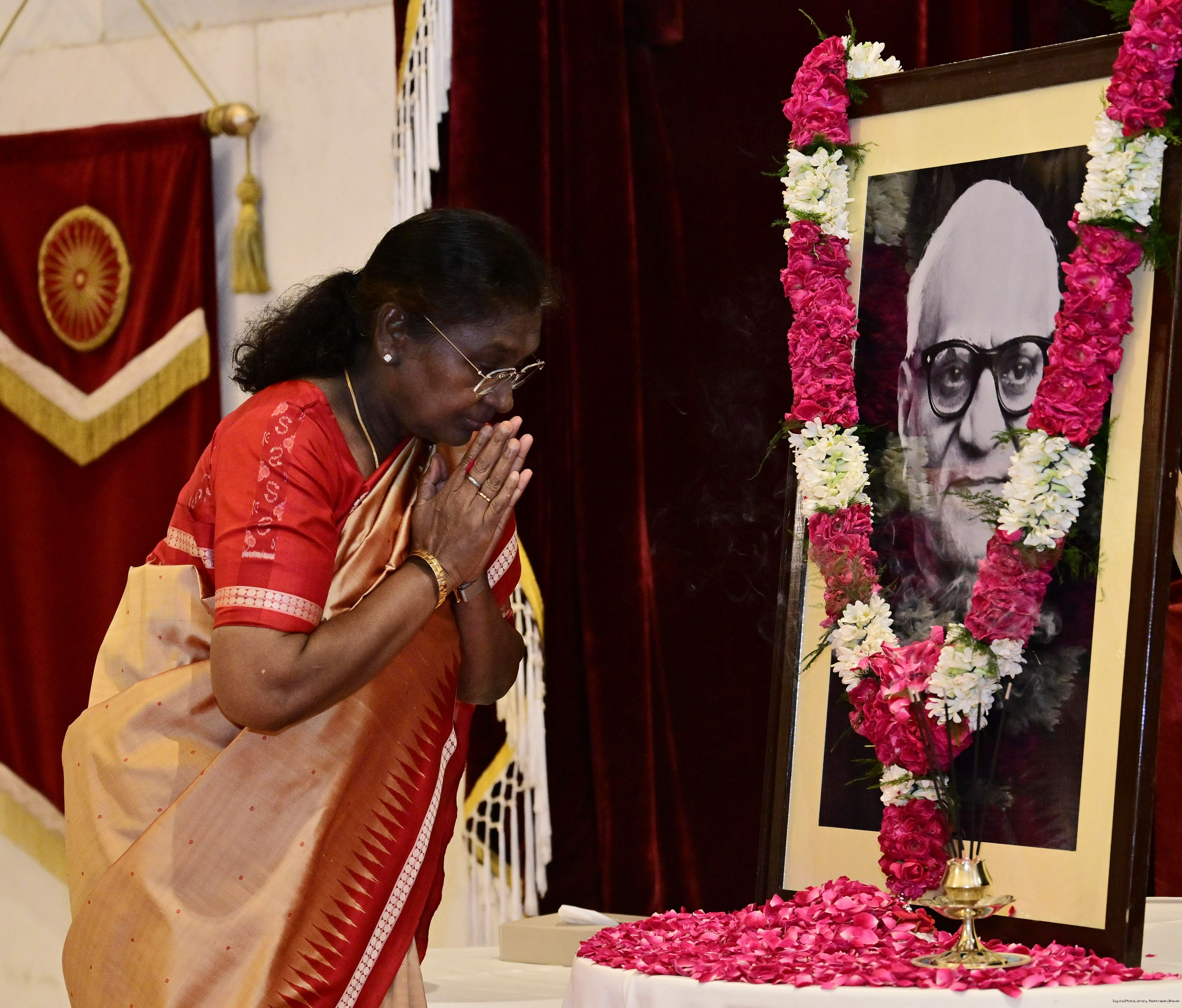 | Caption: | The President of India, Smt Droupadi Murmu paid floral tributes to Shri V.V. Giri, former President of India on his birth anniversary at Rashtrapati Bhavan on August 10, 2025. |