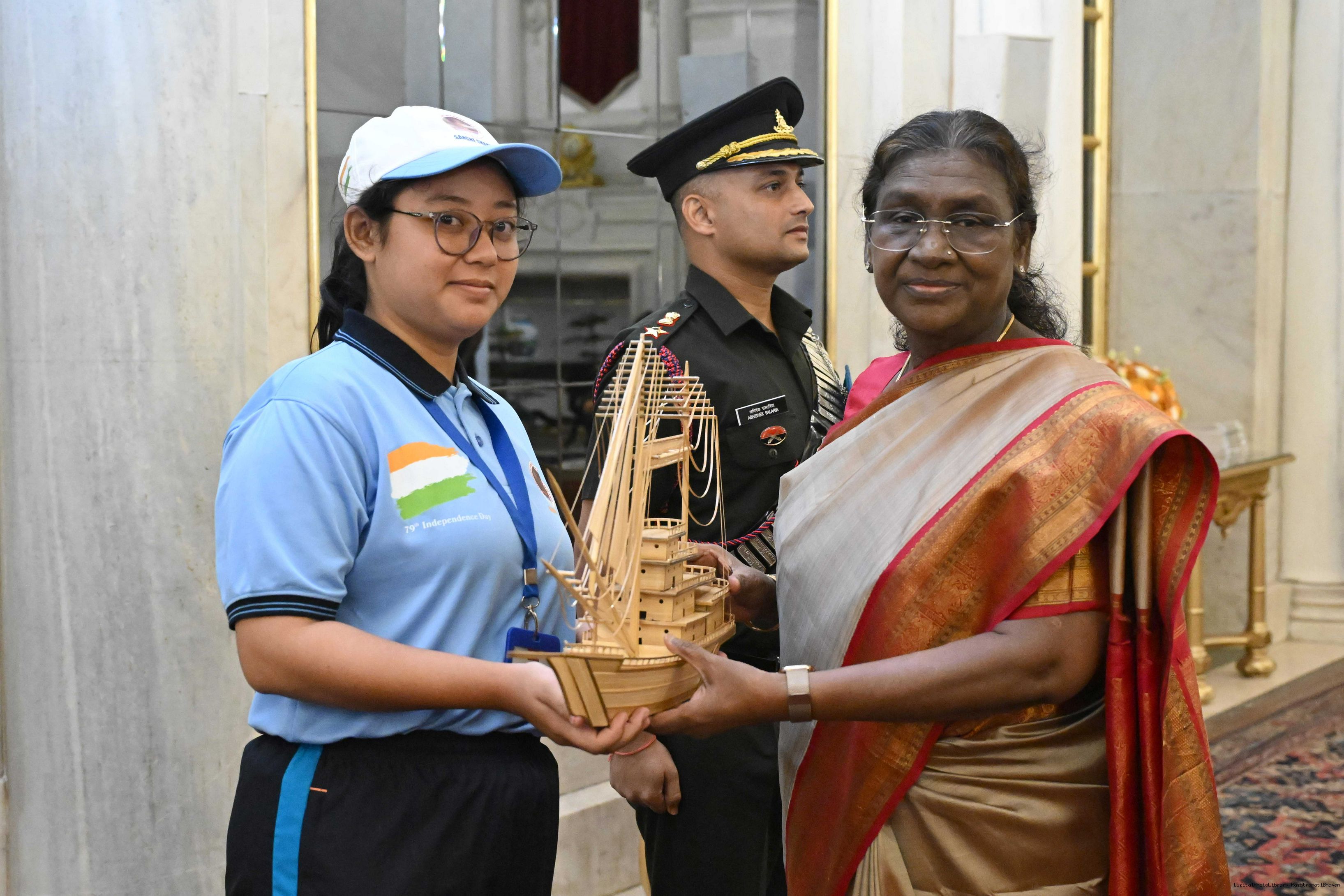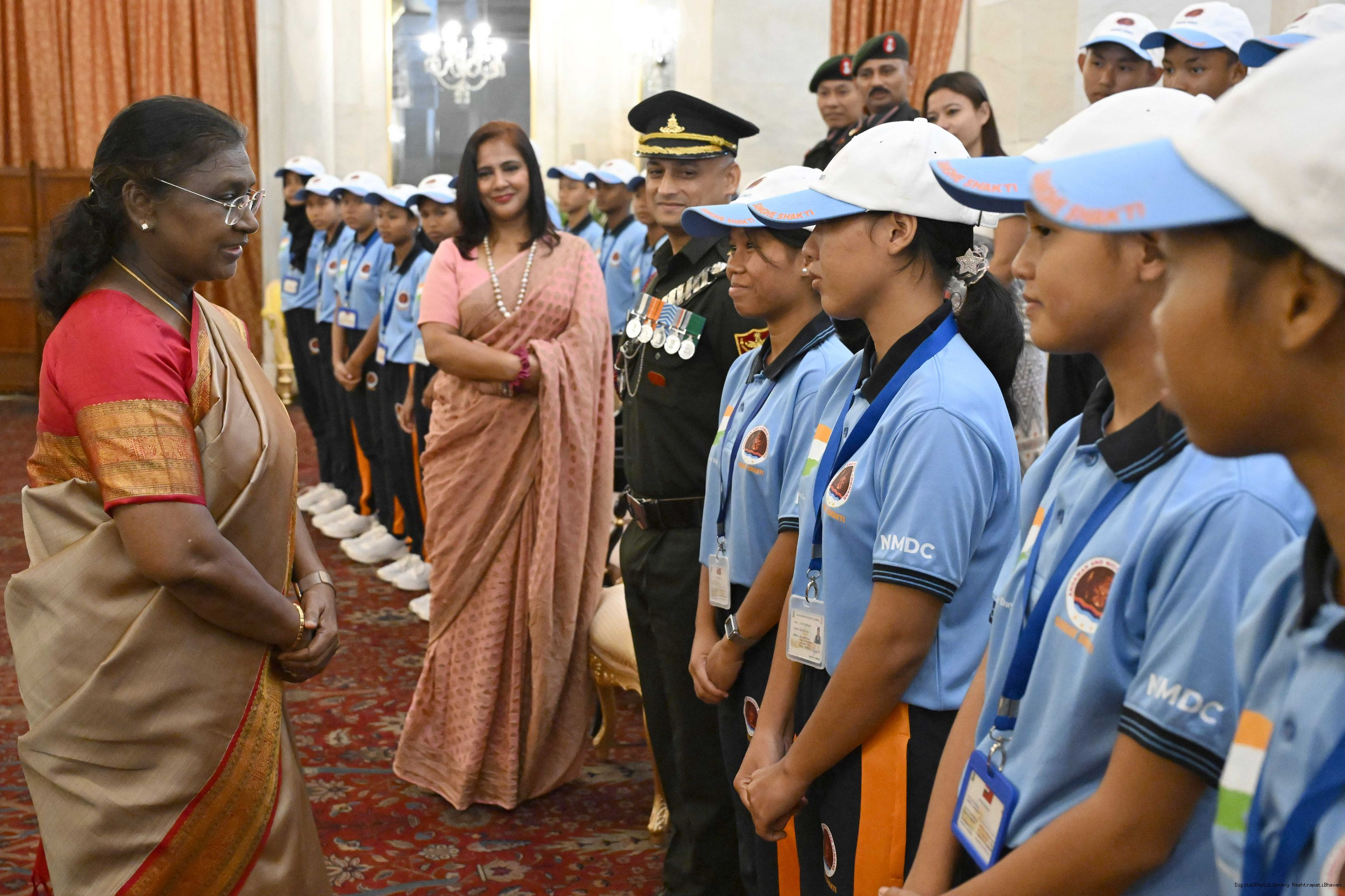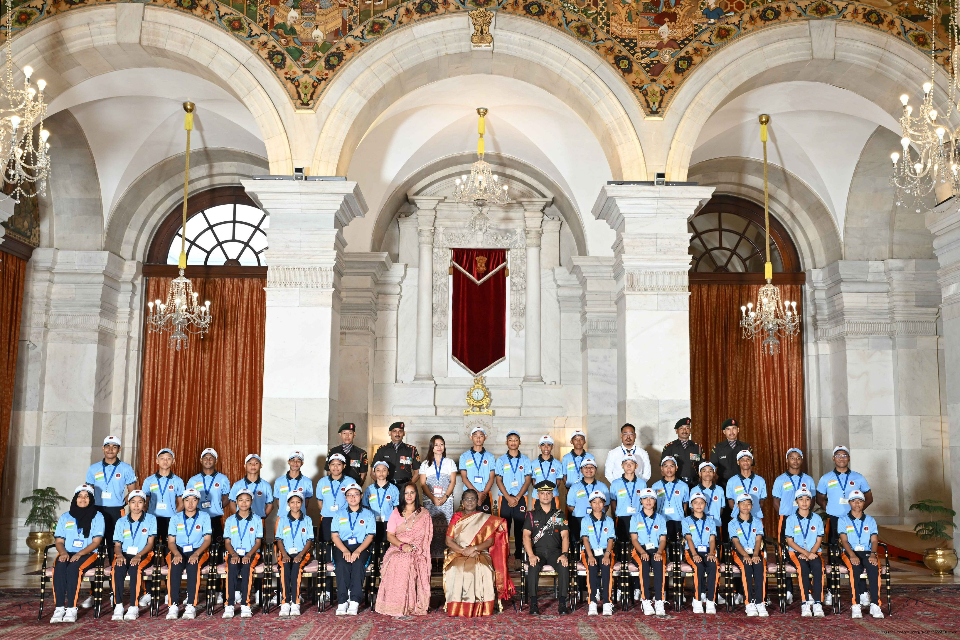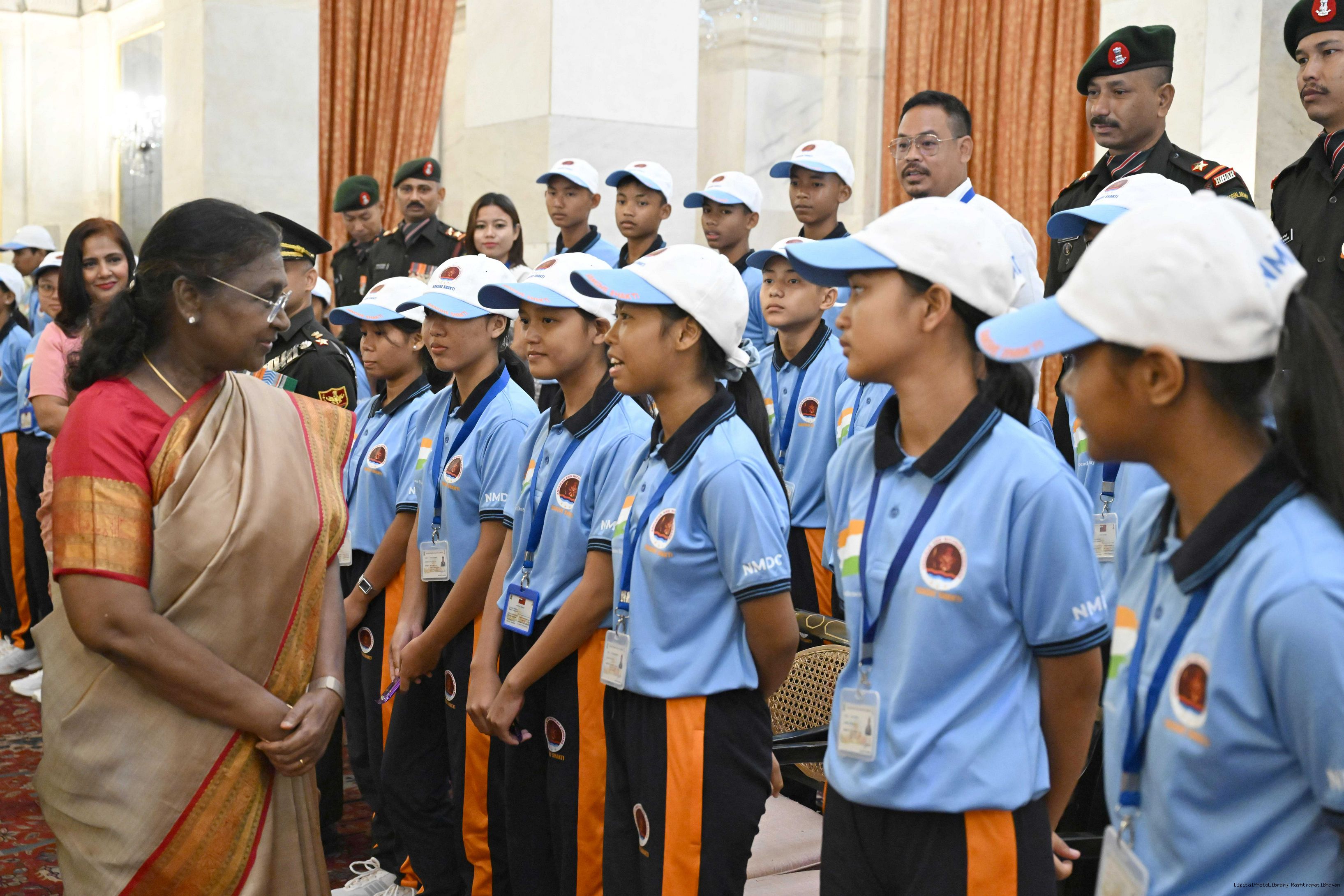 | Caption: | The President of India, Smt Droupadi Murmu met and posing a group photograph with 32 children from Local Tribes of Andaman Nicobar Islands (ANI) along with 11 defence personnel on the occasion of Independence Day Celebrations, 2025 at Rashtrapati Bhavan on August 14, 2025. |
