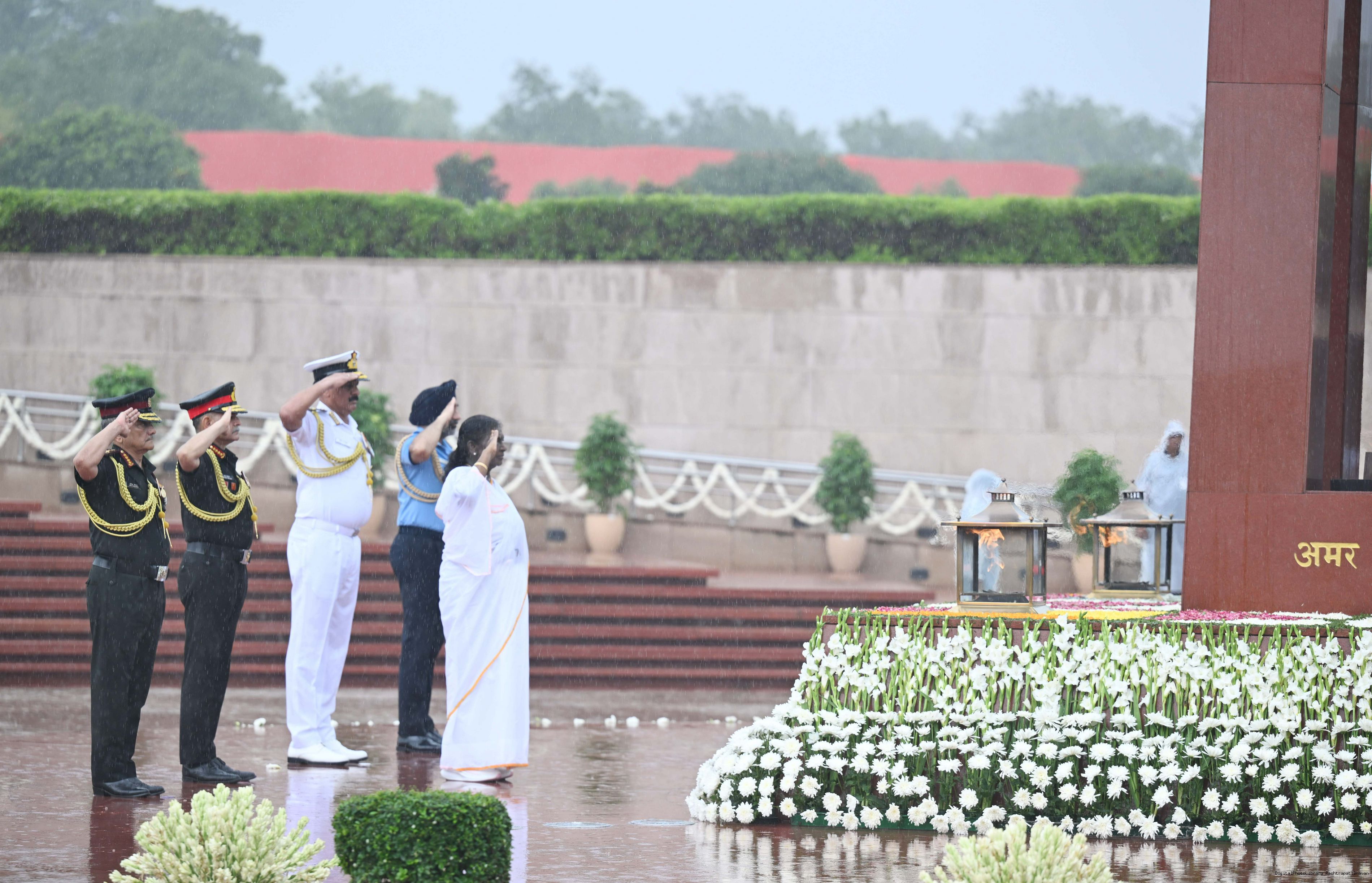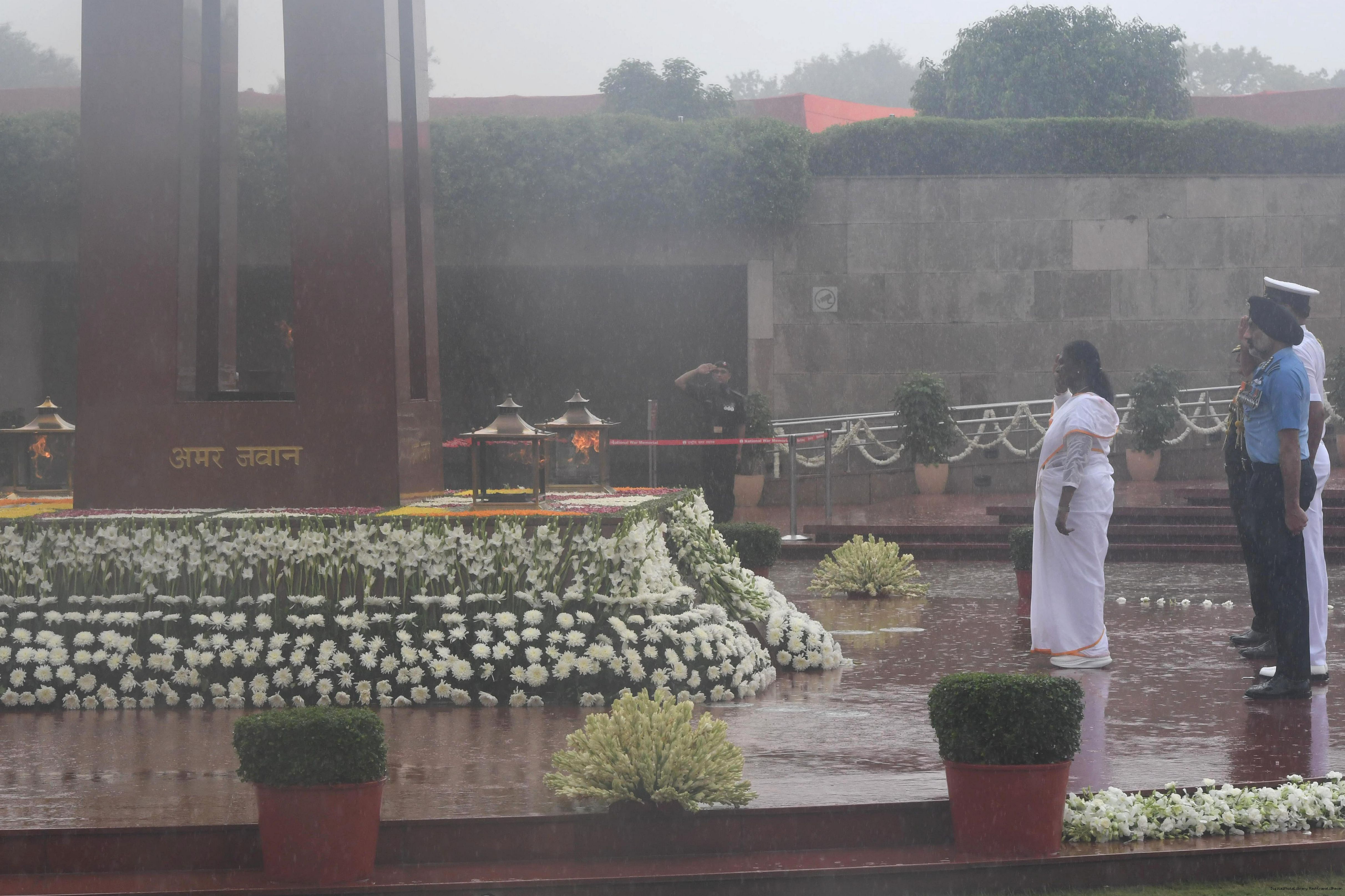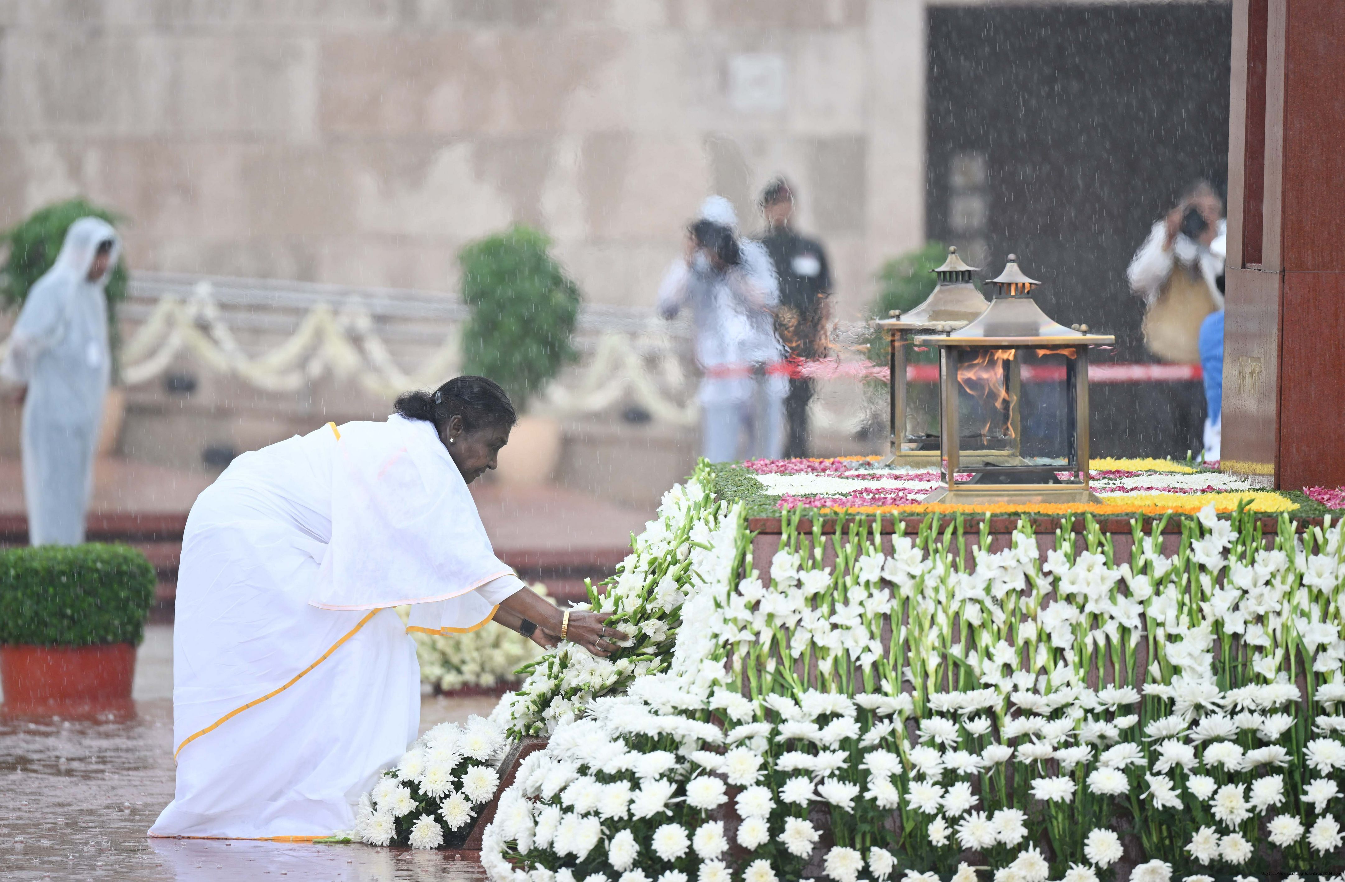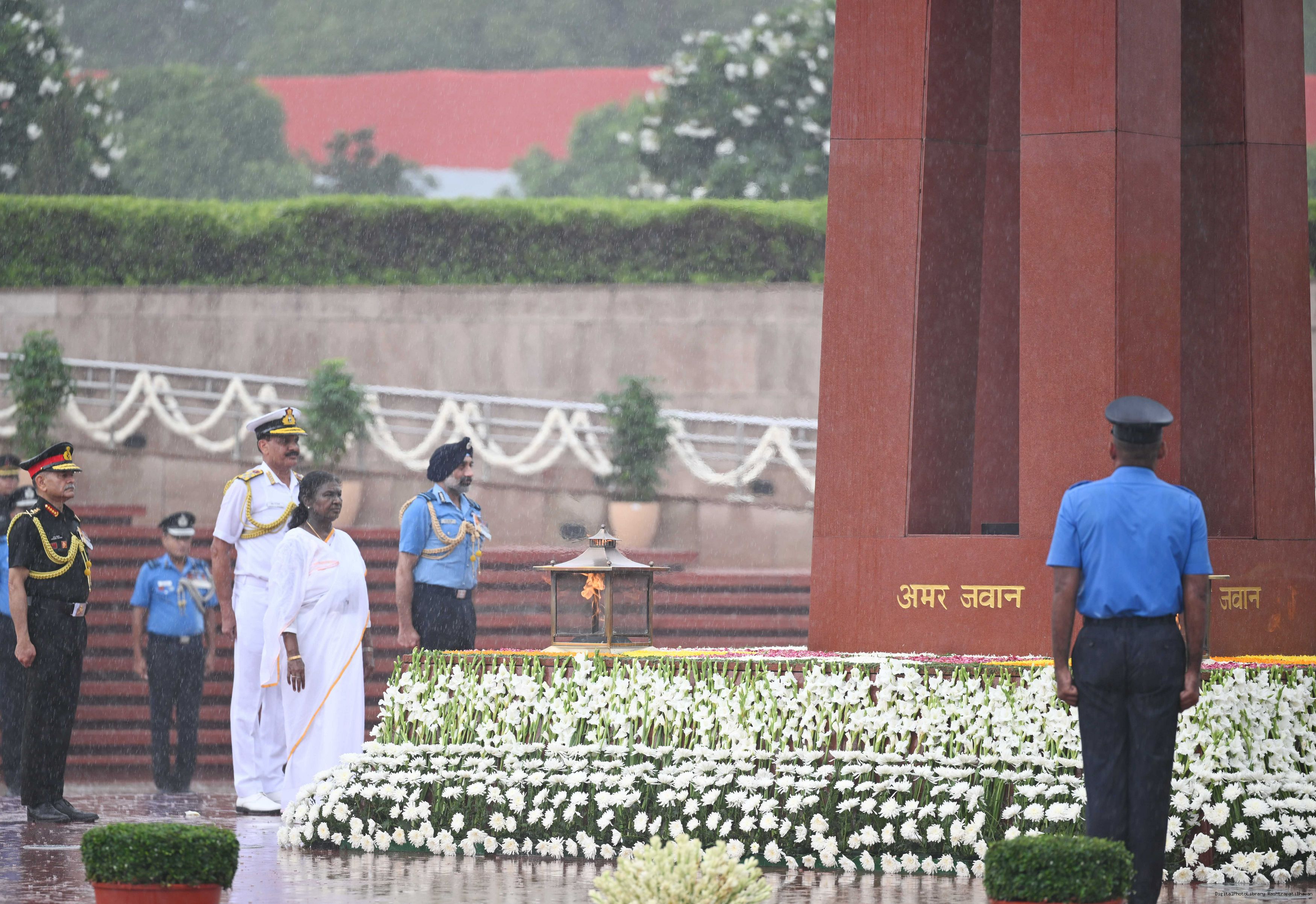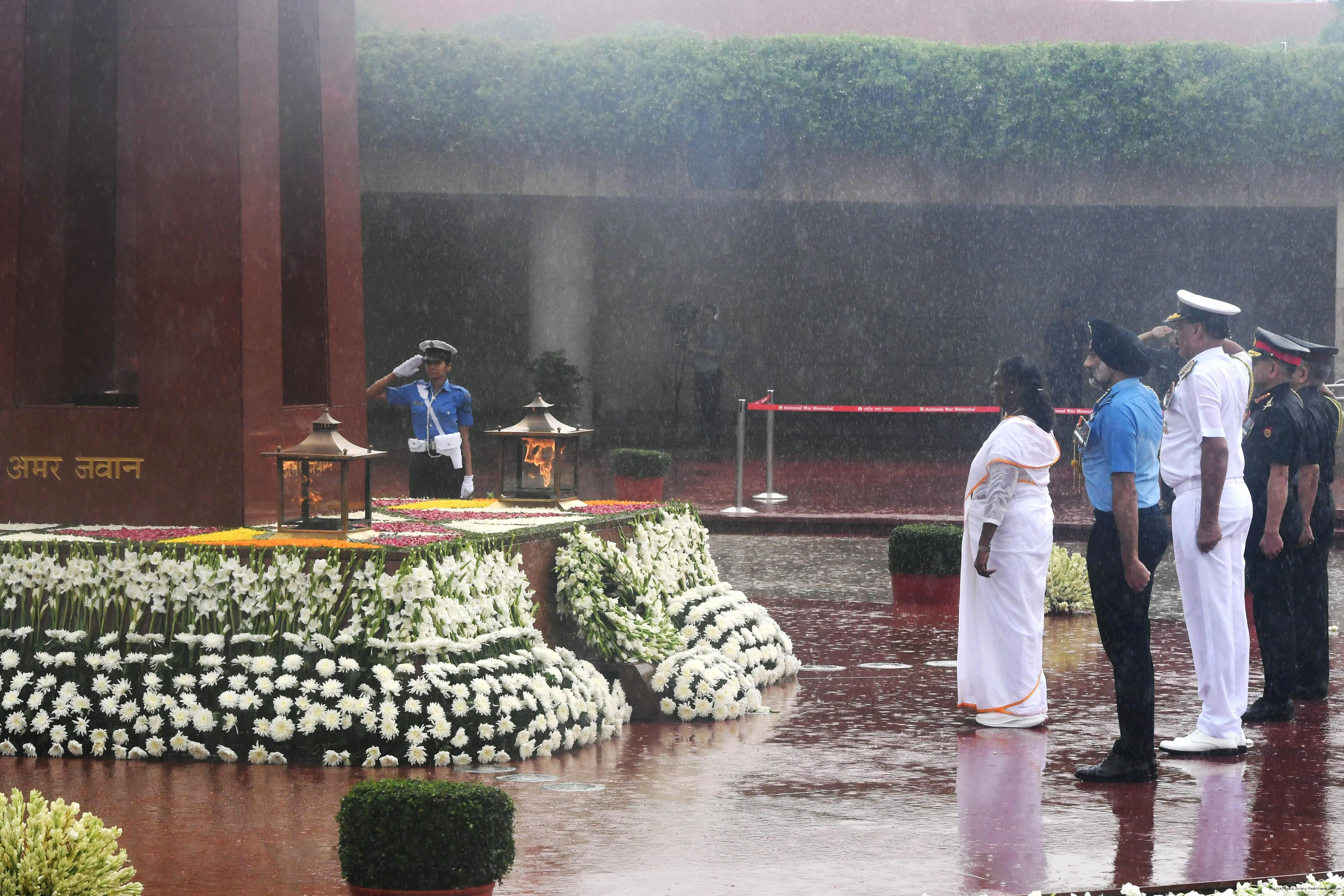 | Caption: | The President of India, Smt. Droupadi wreath laid the National War Memorial and paid homage to the martyrs, on the occasion of 79th Independence Day, in New Delhi on August 15, 2025. |
