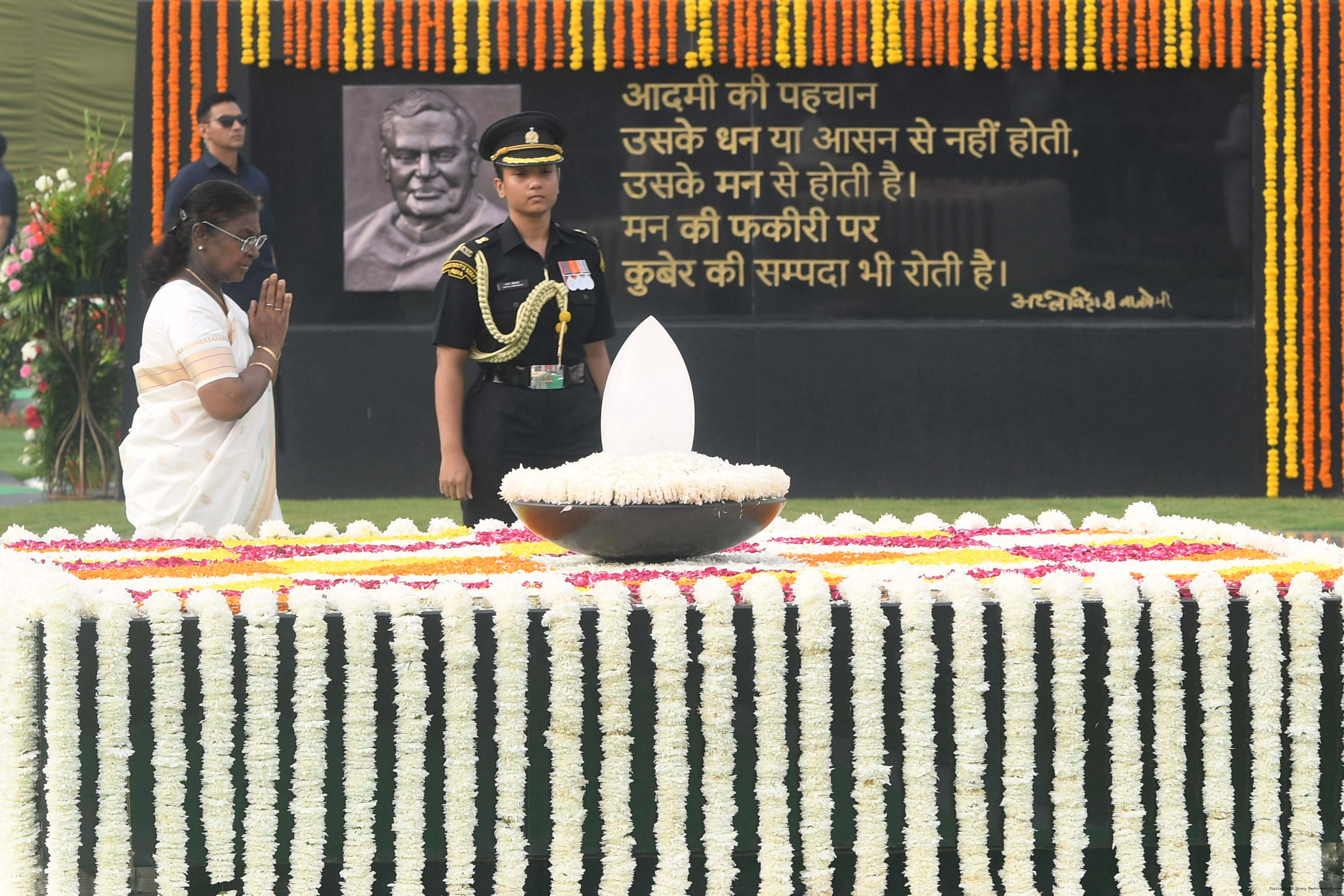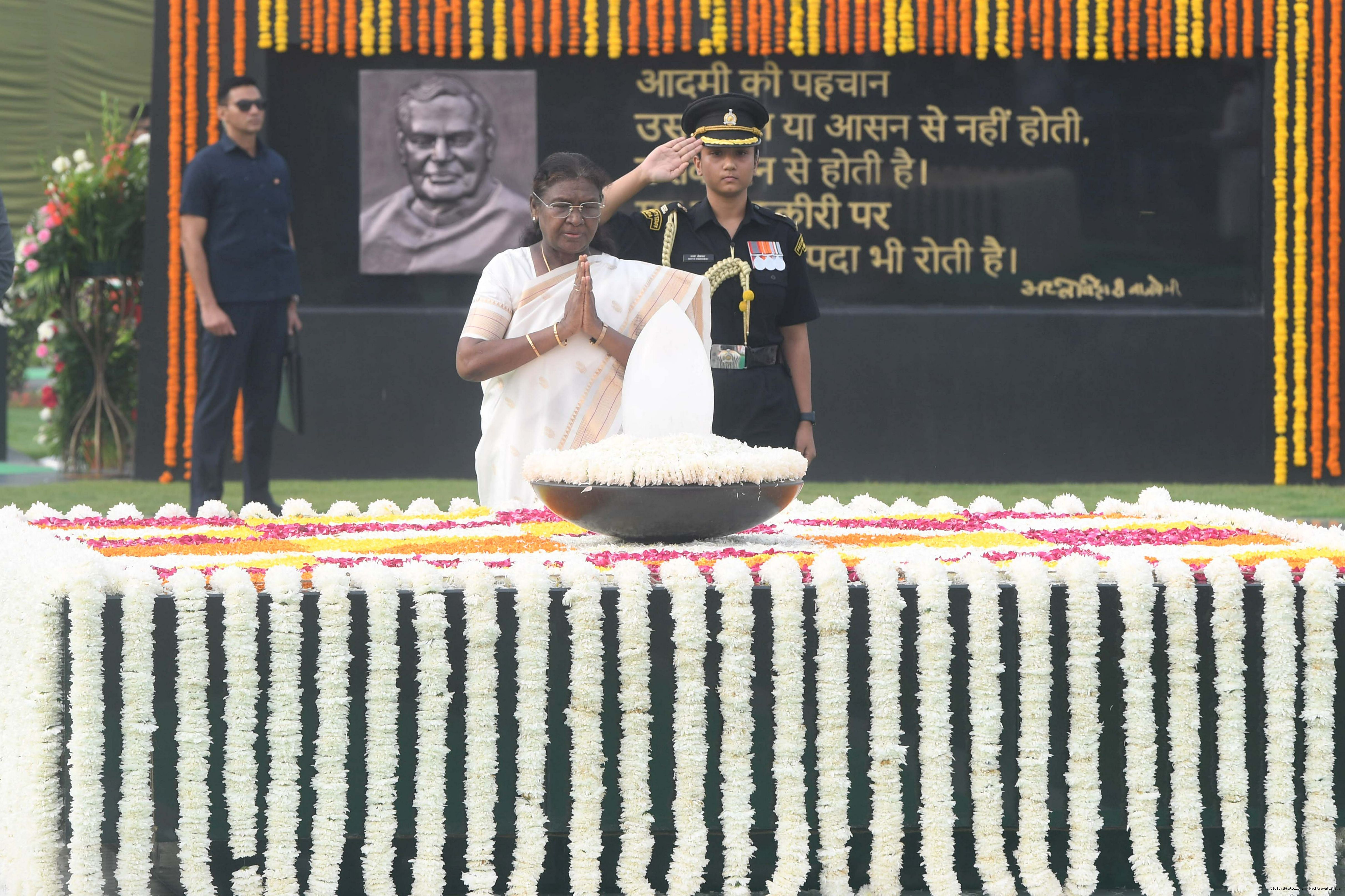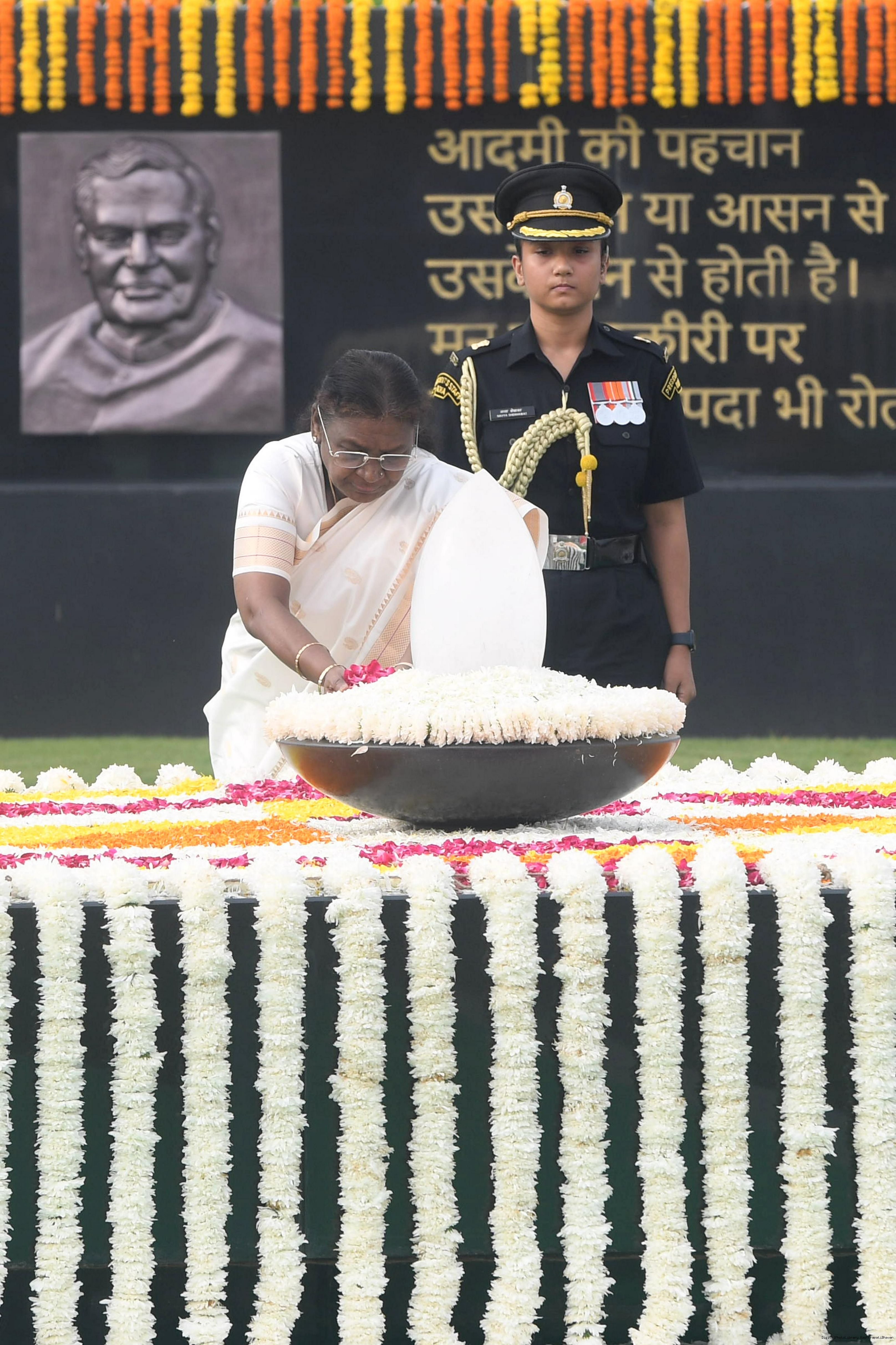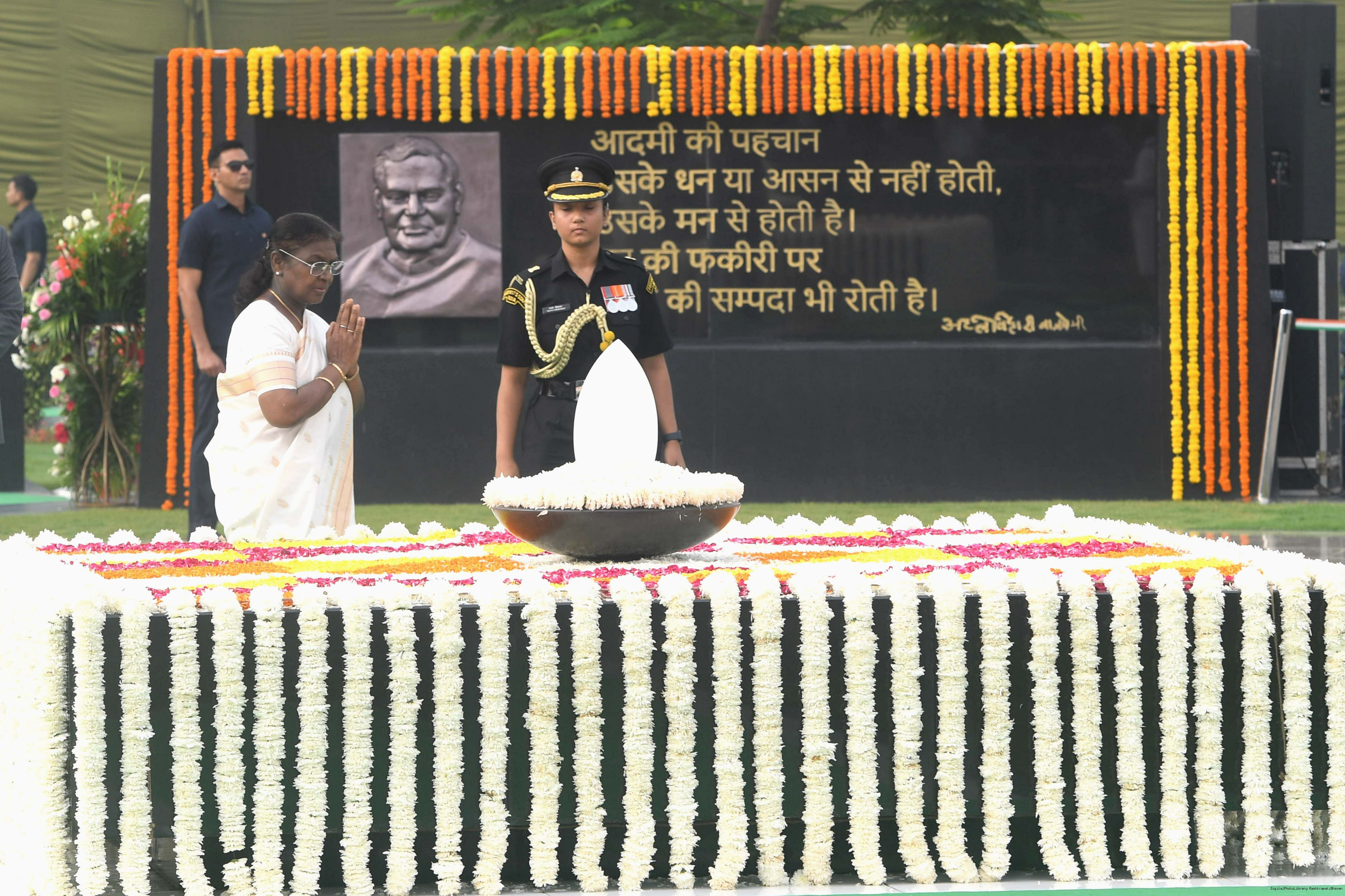 | Caption: | The President of India, Smt Droupadi Murmu paid homage to former Prime Minister of India, Shri Atal Bihari Vajpayee on his death anniversary at his Samadhi 'Sadaiv Atal' in New Delhi on August 16, 2025. |