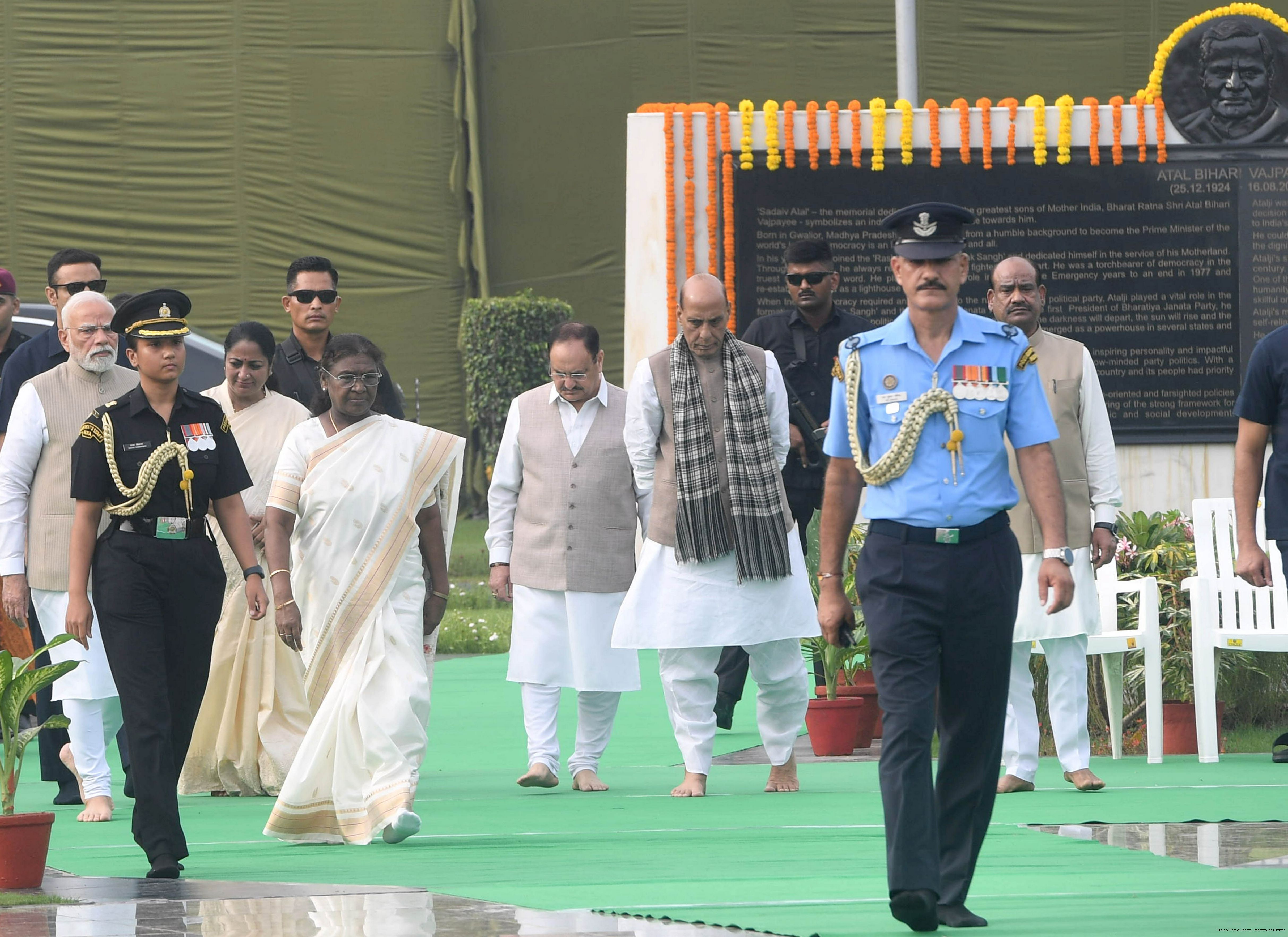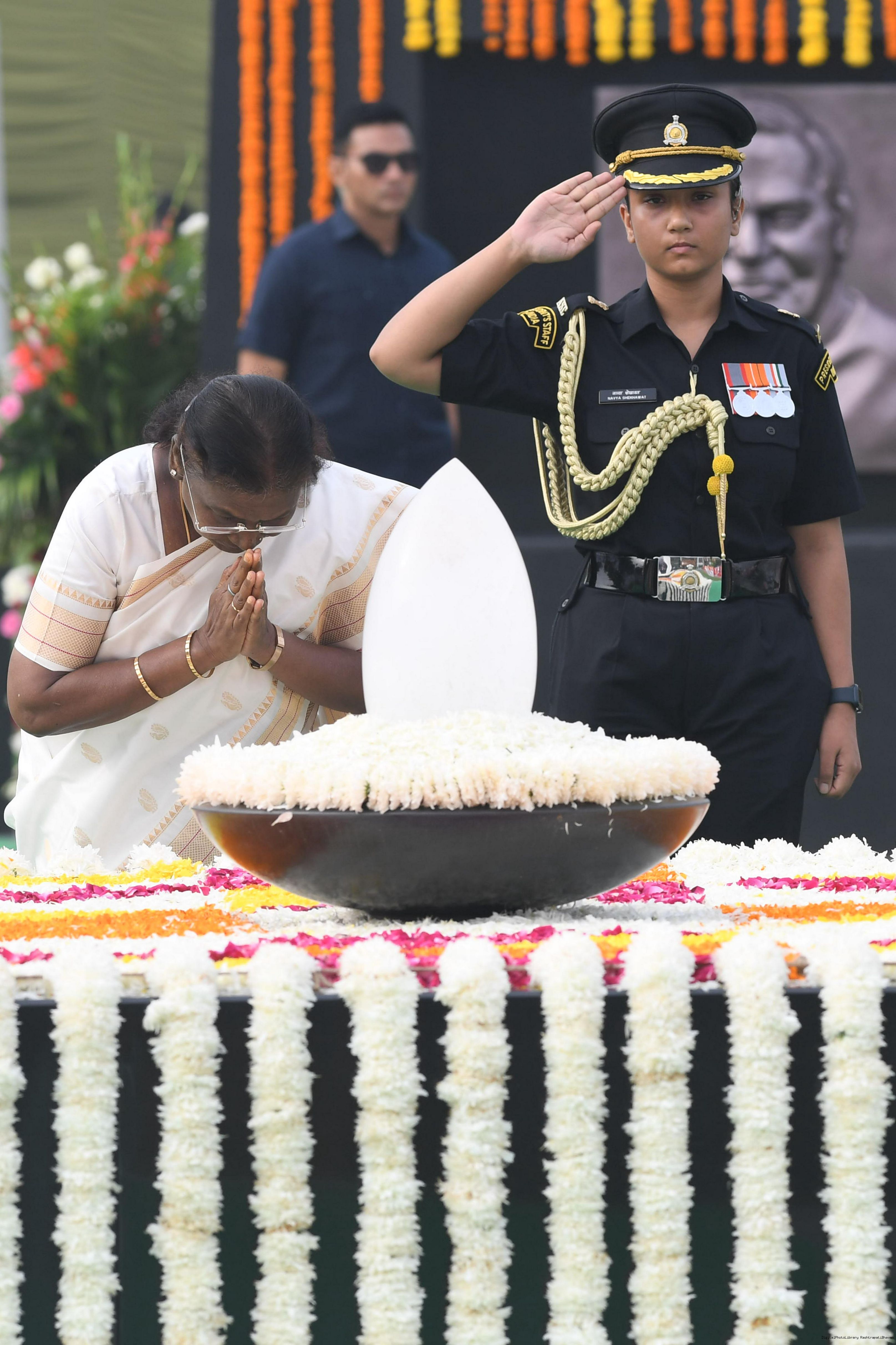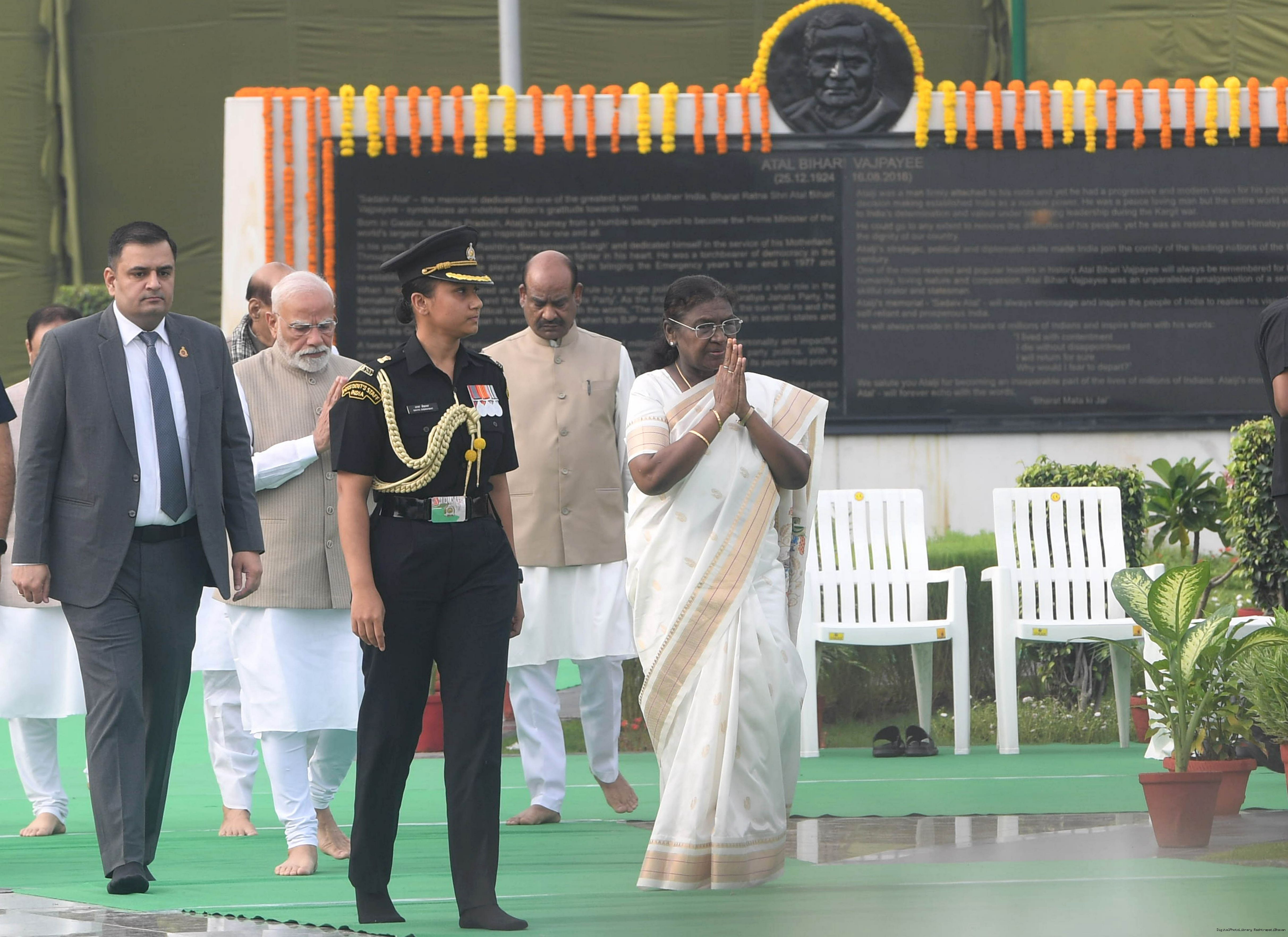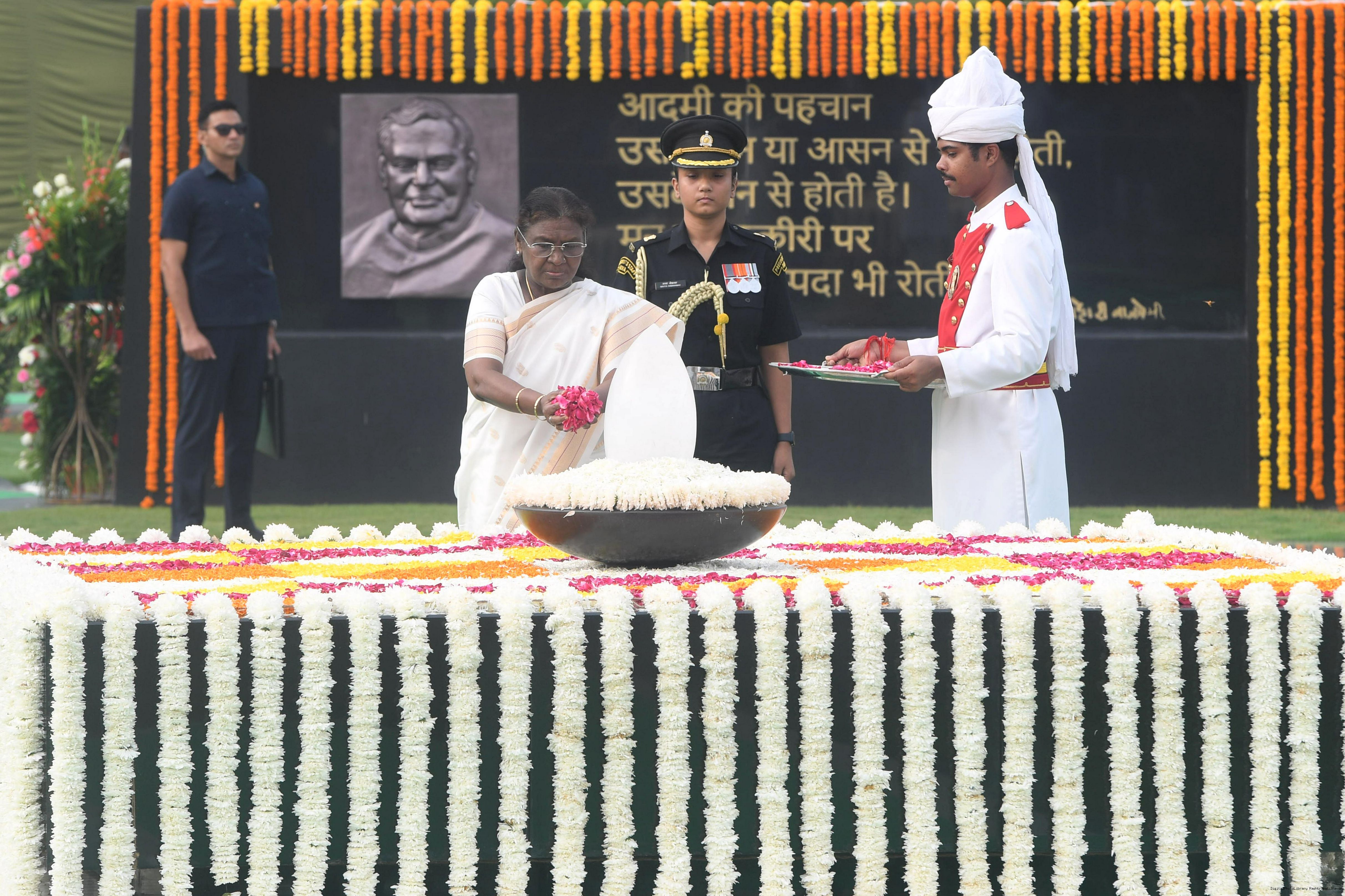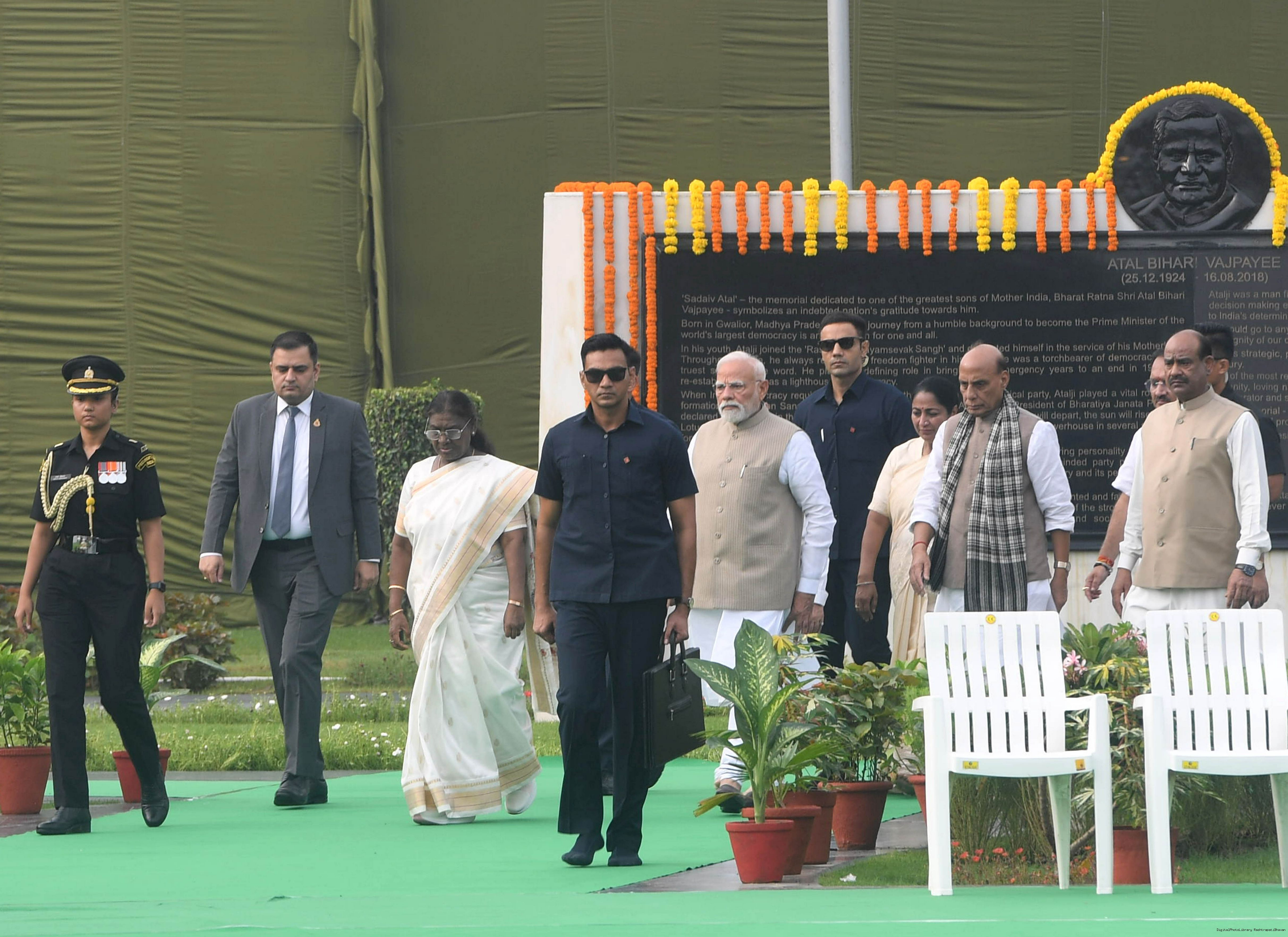 | Caption: | The President of India, Smt Droupadi Murmu paid homage to former Prime Minister of India, Shri Atal Bihari Vajpayee on his death anniversary at his Samadhi 'Sadaiv Atal' in New Delhi on August 16, 2025. |