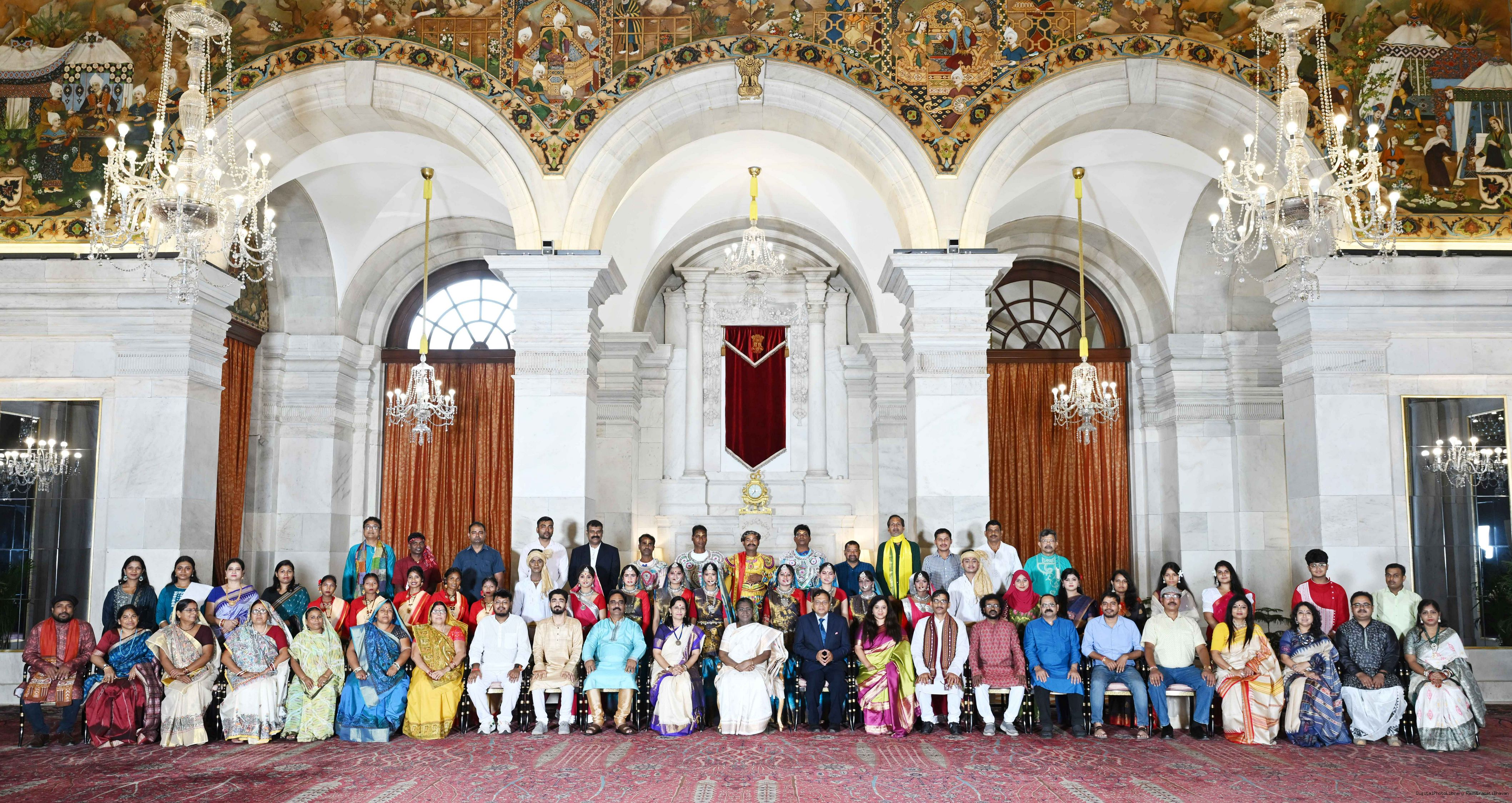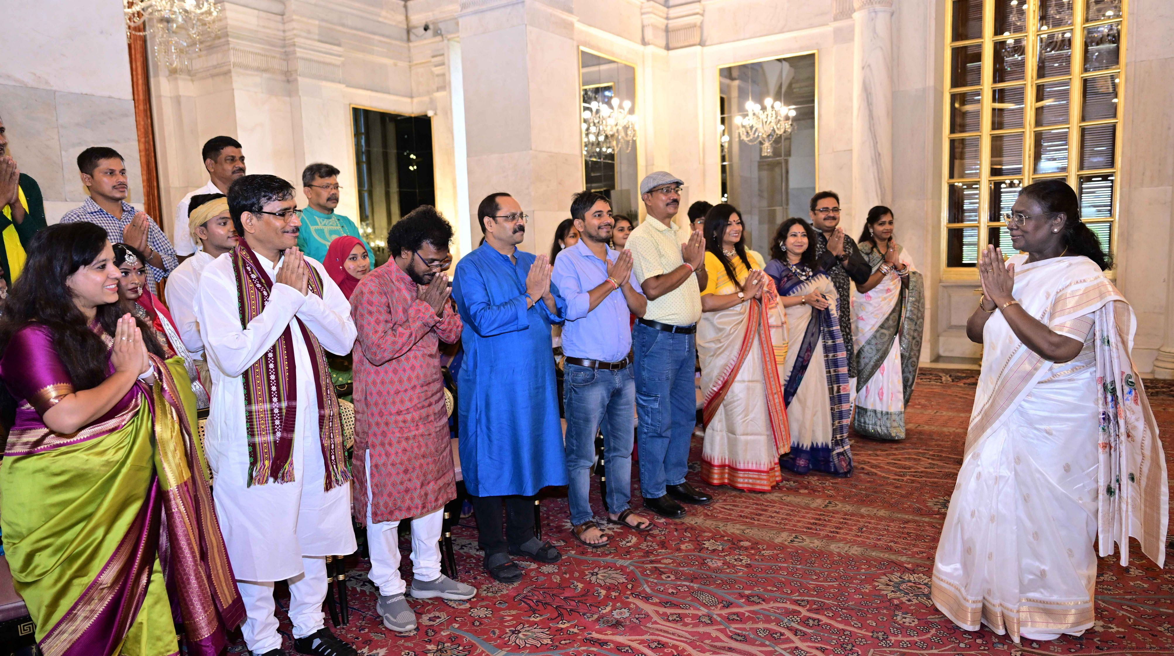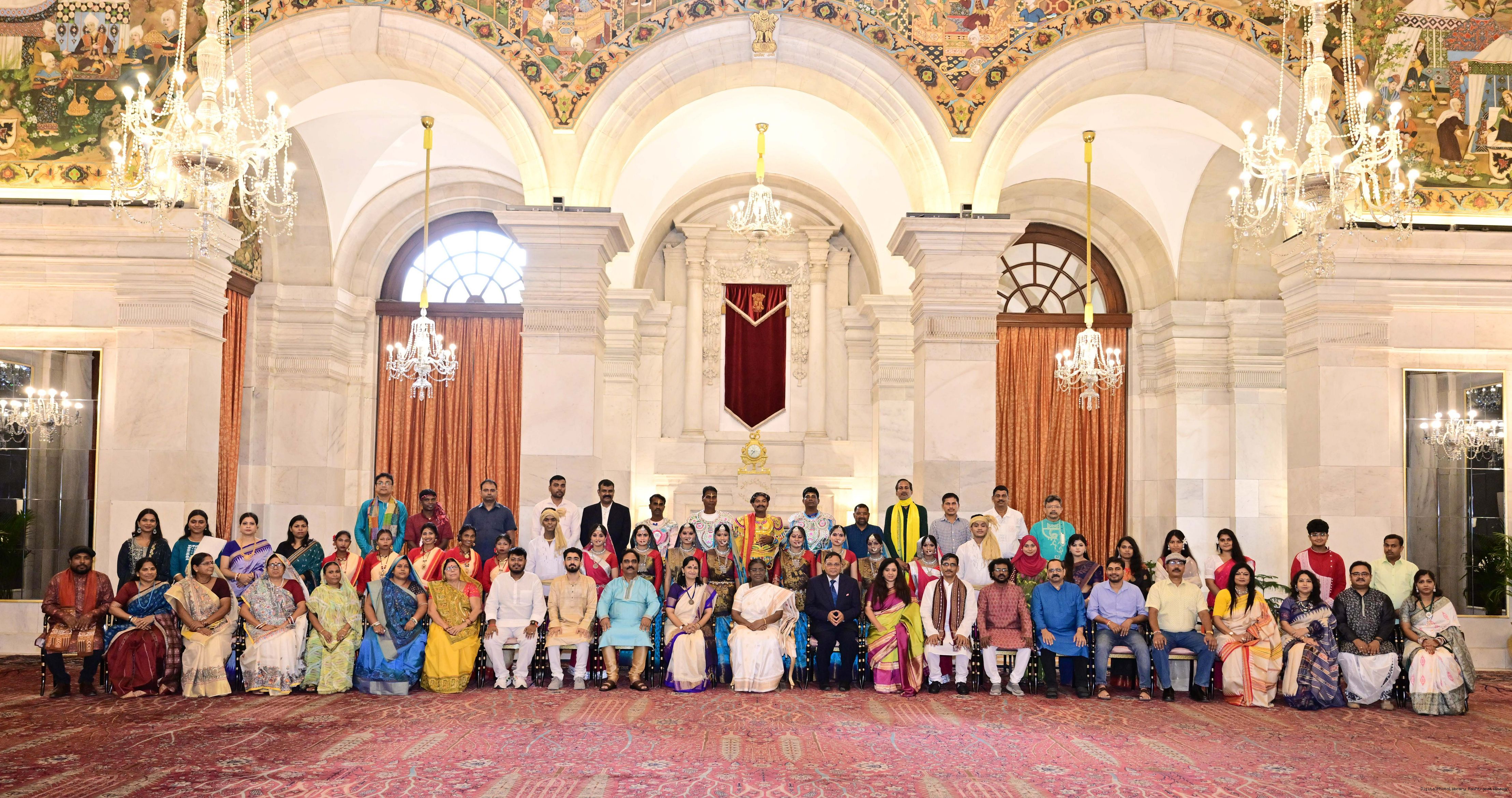 | Caption: | The President of India, Smt Droupadi Murmu met and posing a group photograph with members of collaborating institutions J(viz State Bhavans, SNA and EZCC etc.) contributing to the theme of the 'At Home' event being held at RBCC on the Occasion of Independence Day 25 Rashtrapati Bhavan on August 15, 2025. |