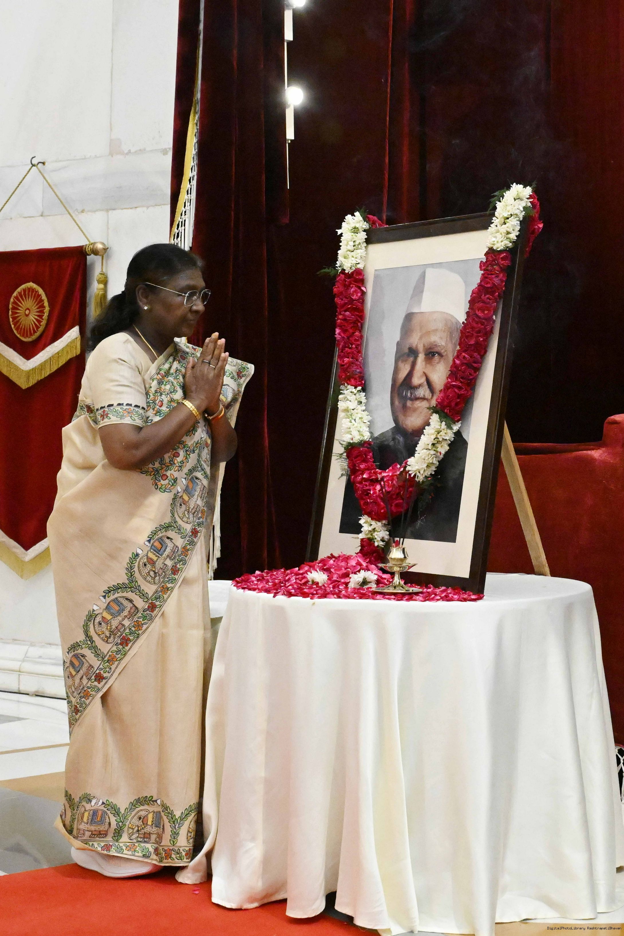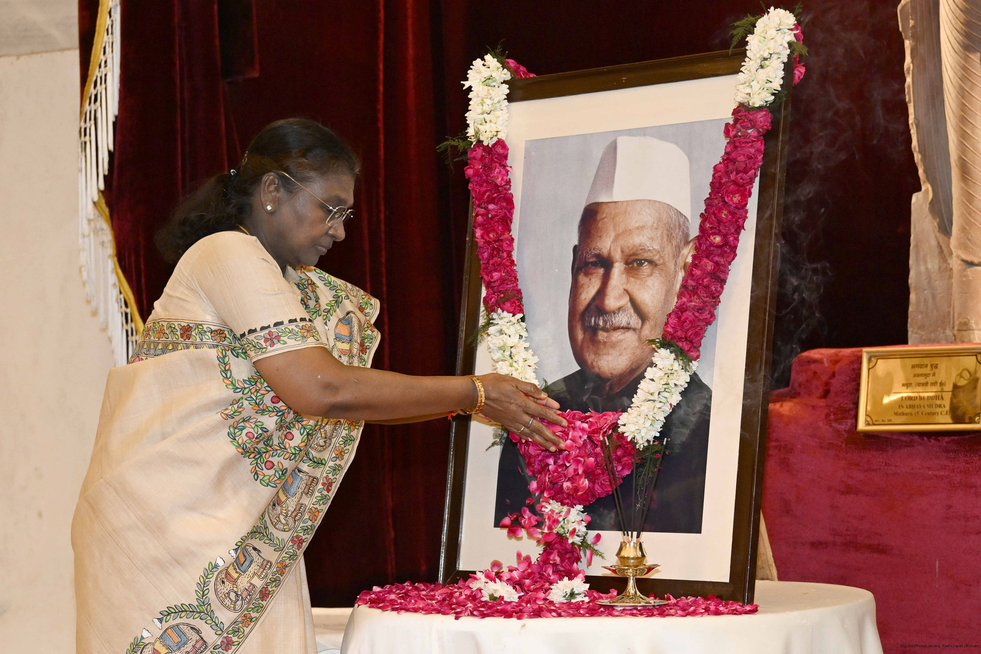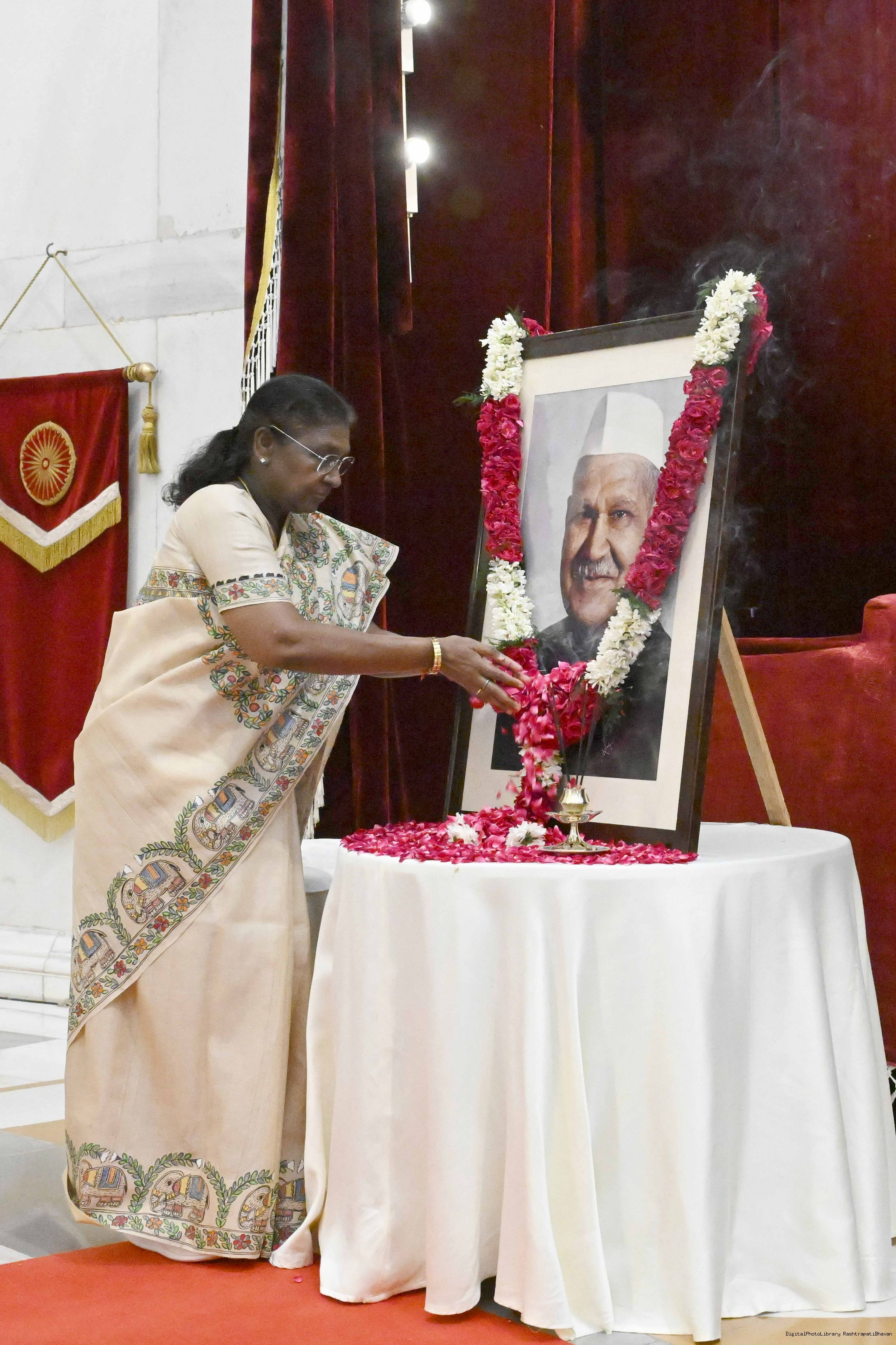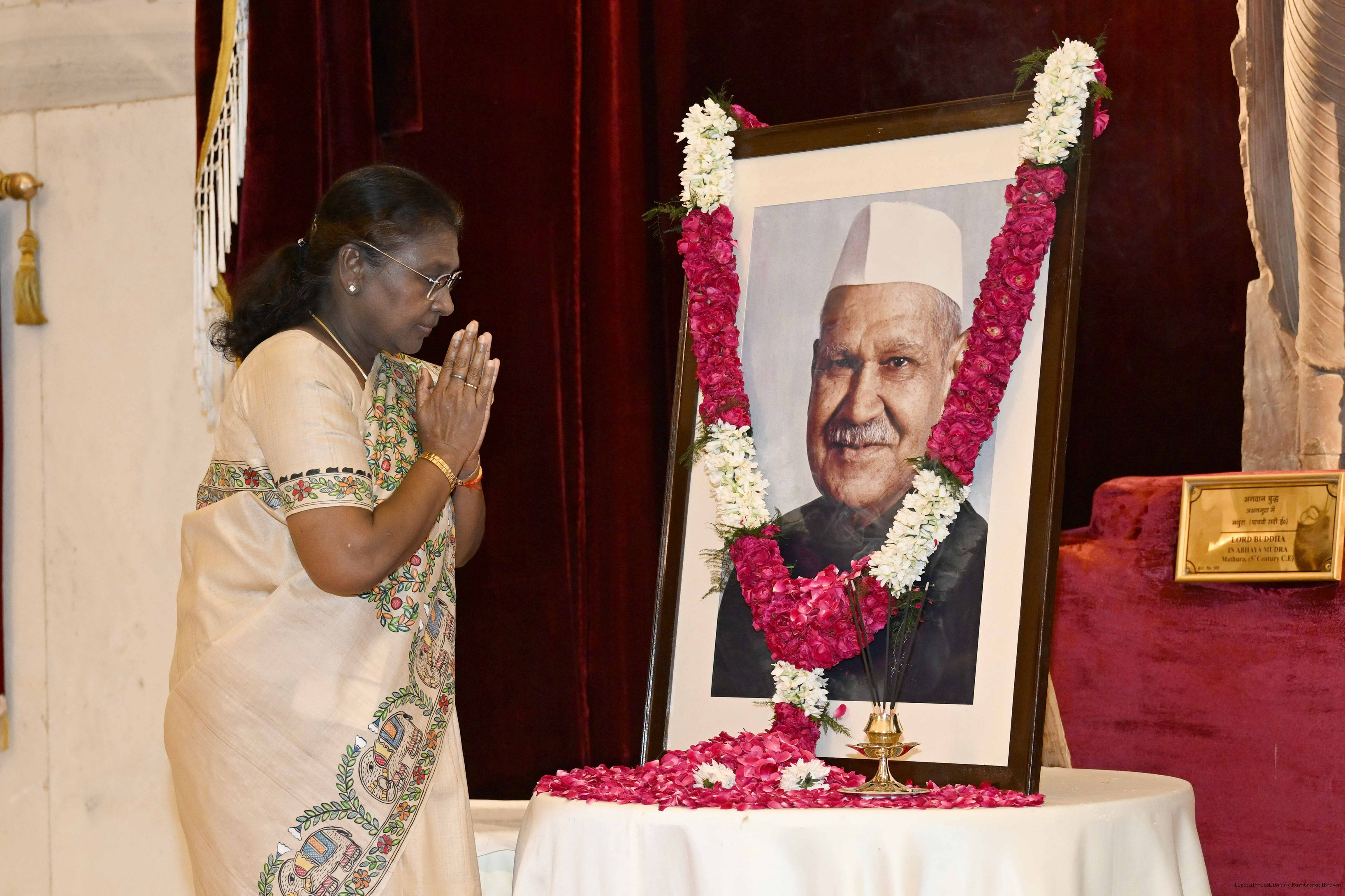 | Caption: | The President of India, Smt Droupadi Murmu paid floral tributes to Dr Shanker Dayal Sharma, former President of India on his birth anniversary at Rashtrapati Bhavan on August 19, 2025. |