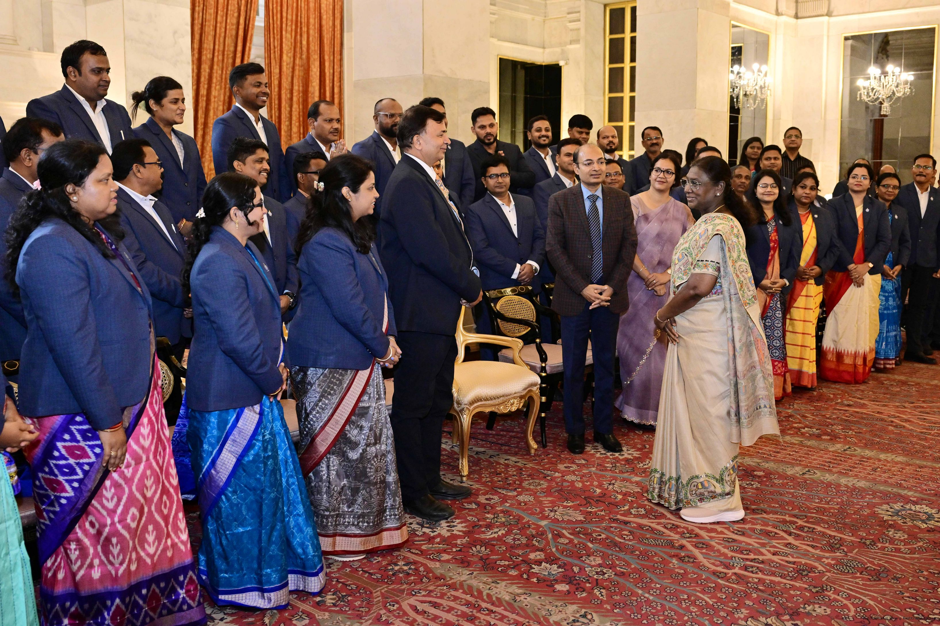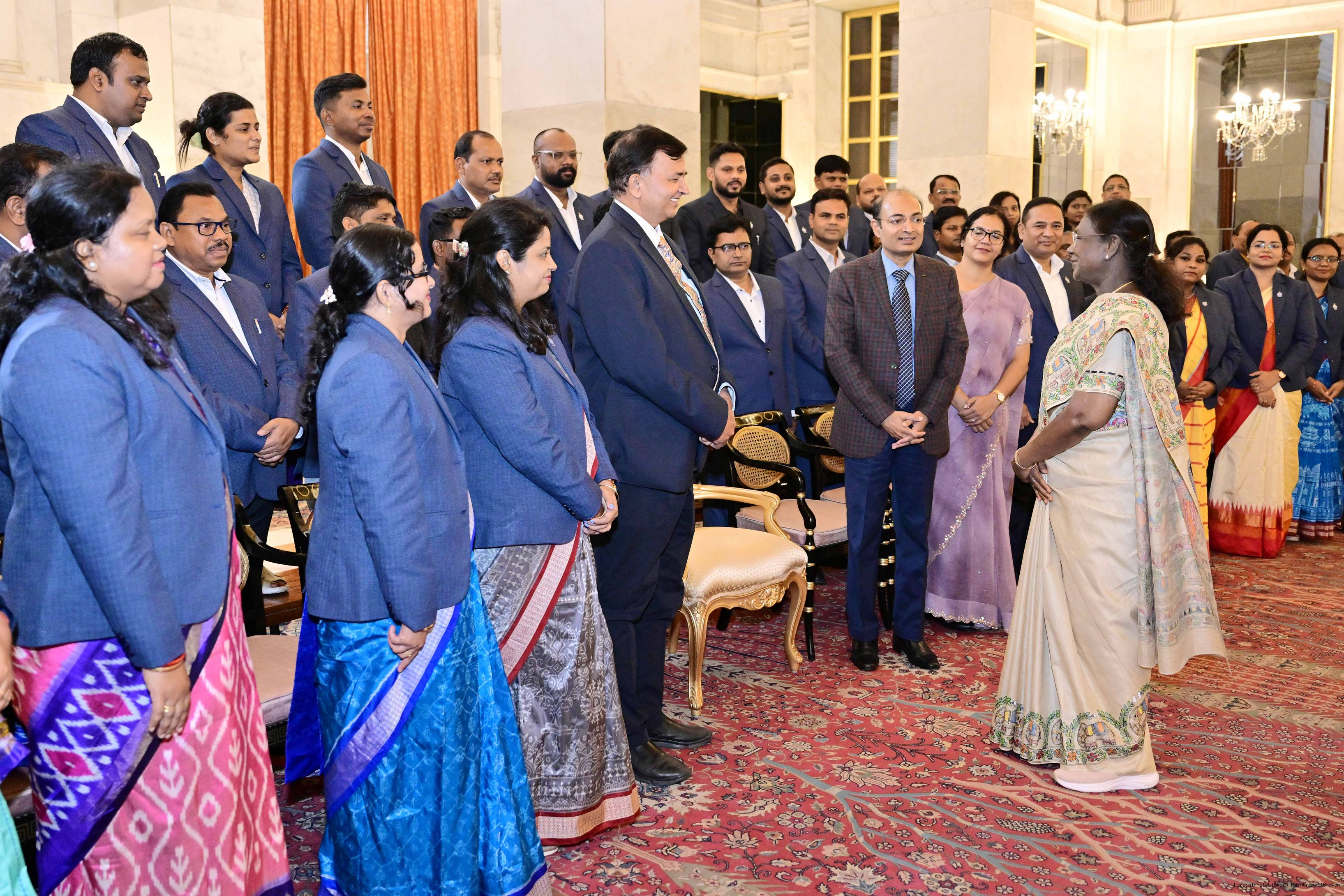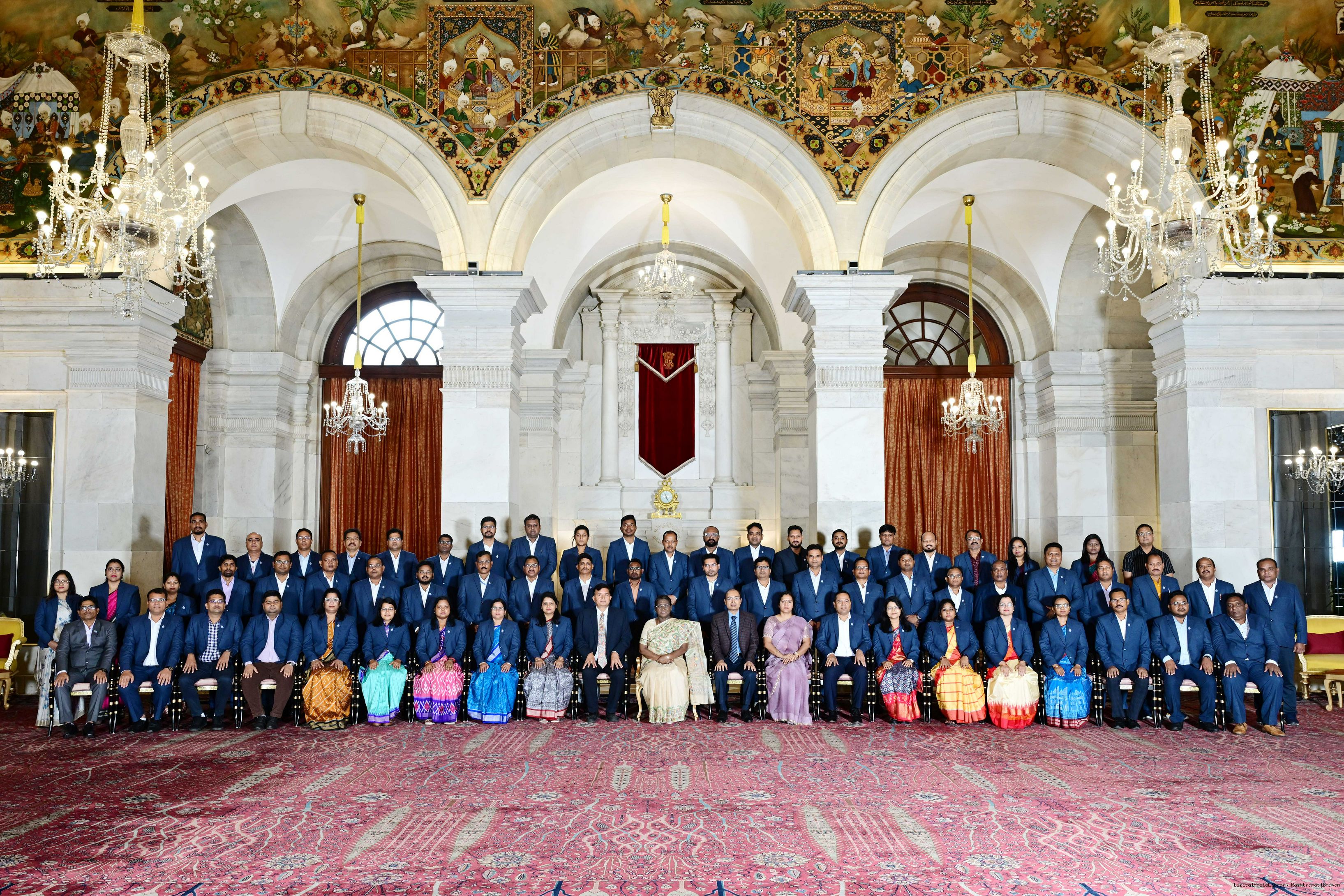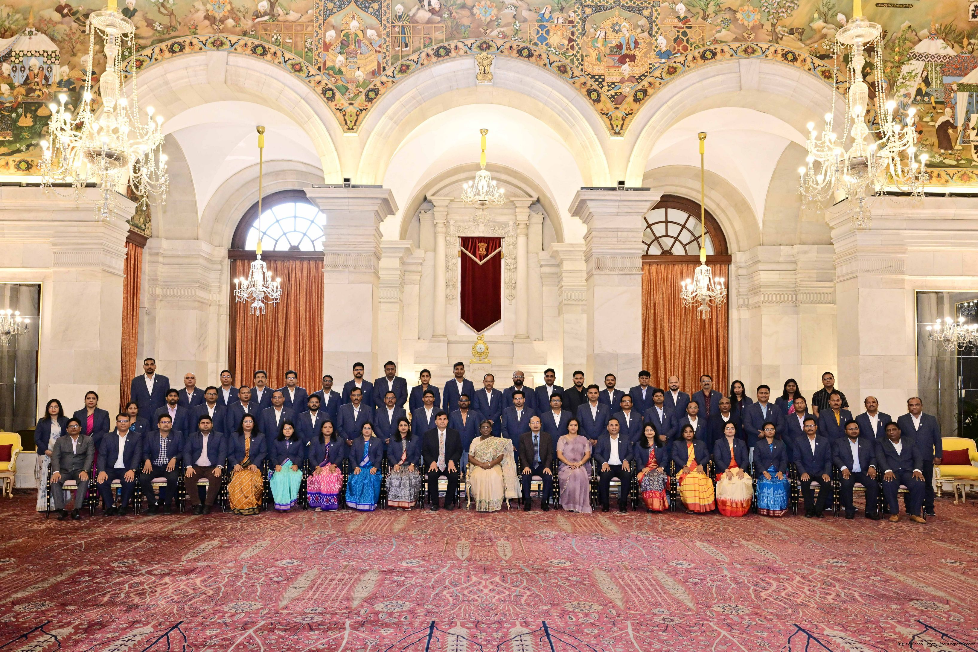 | Caption: | The President of India, Smt Droupadi Murmu posing a group photograph with 62 officer Trainees of the Odisha Administrative Service (OAS), PR Batch of participants of (IT) programme at Gopabandhu Academy of Admn at Rashtrapati Bhavan on August 26, 2025. |