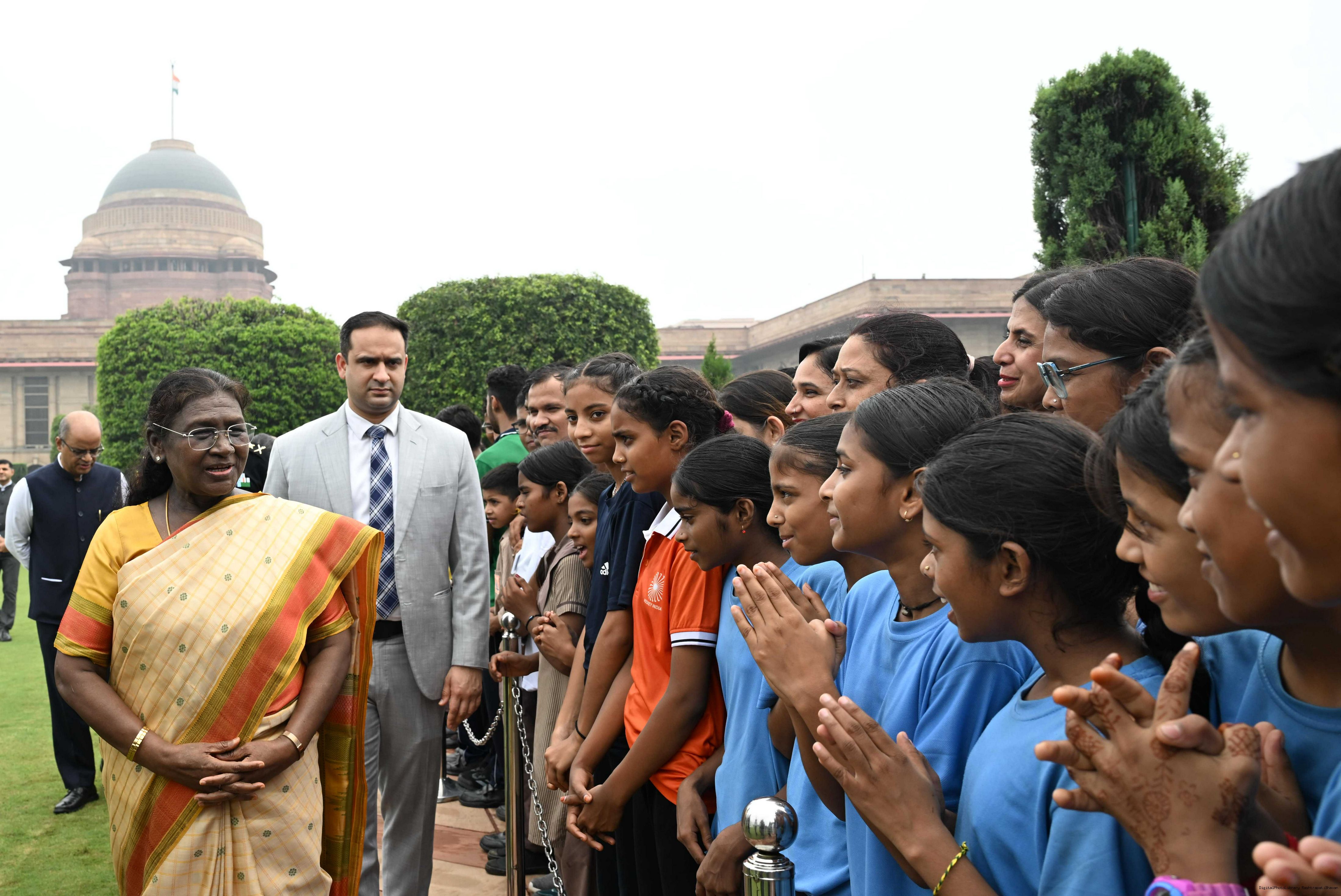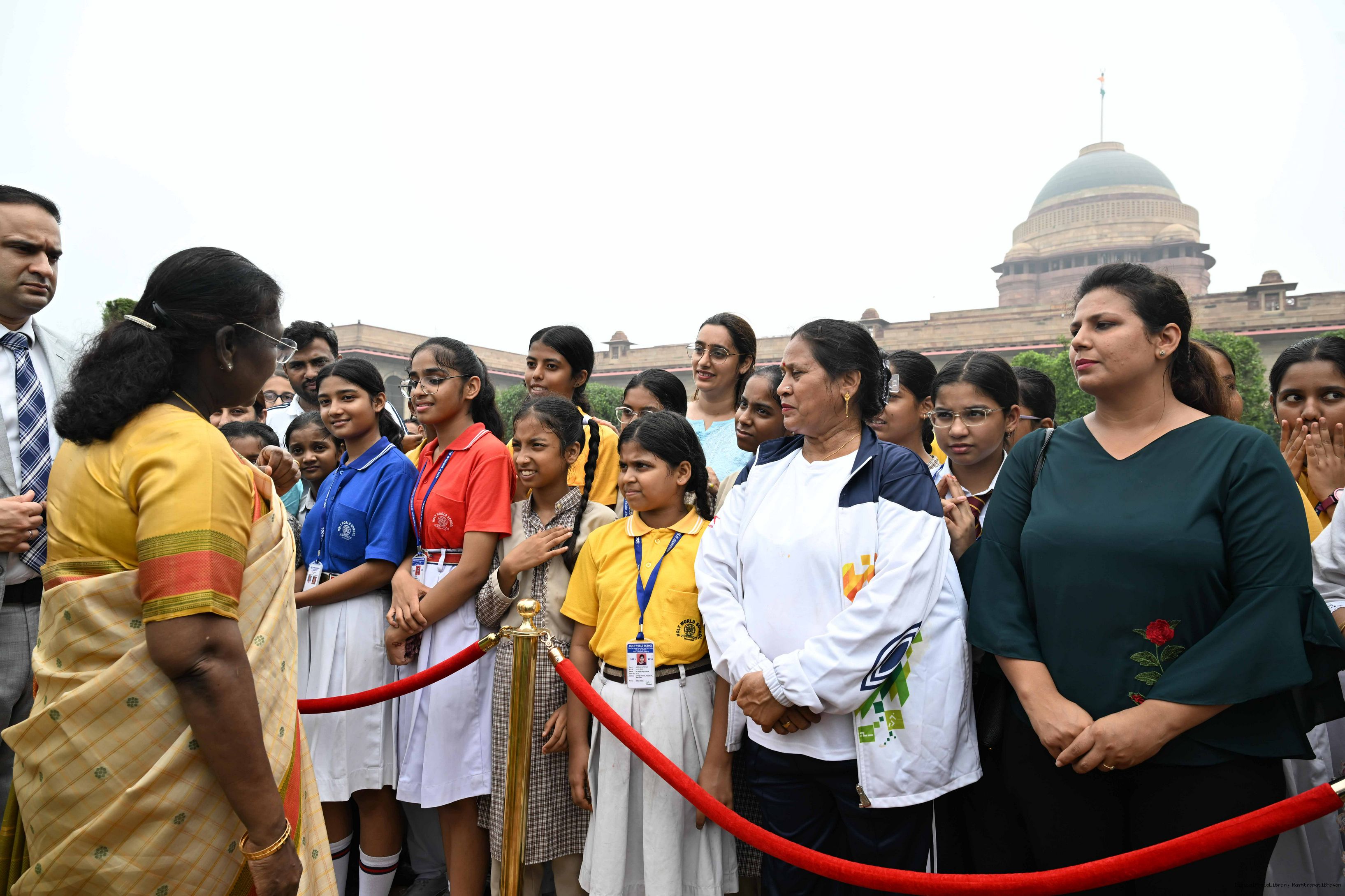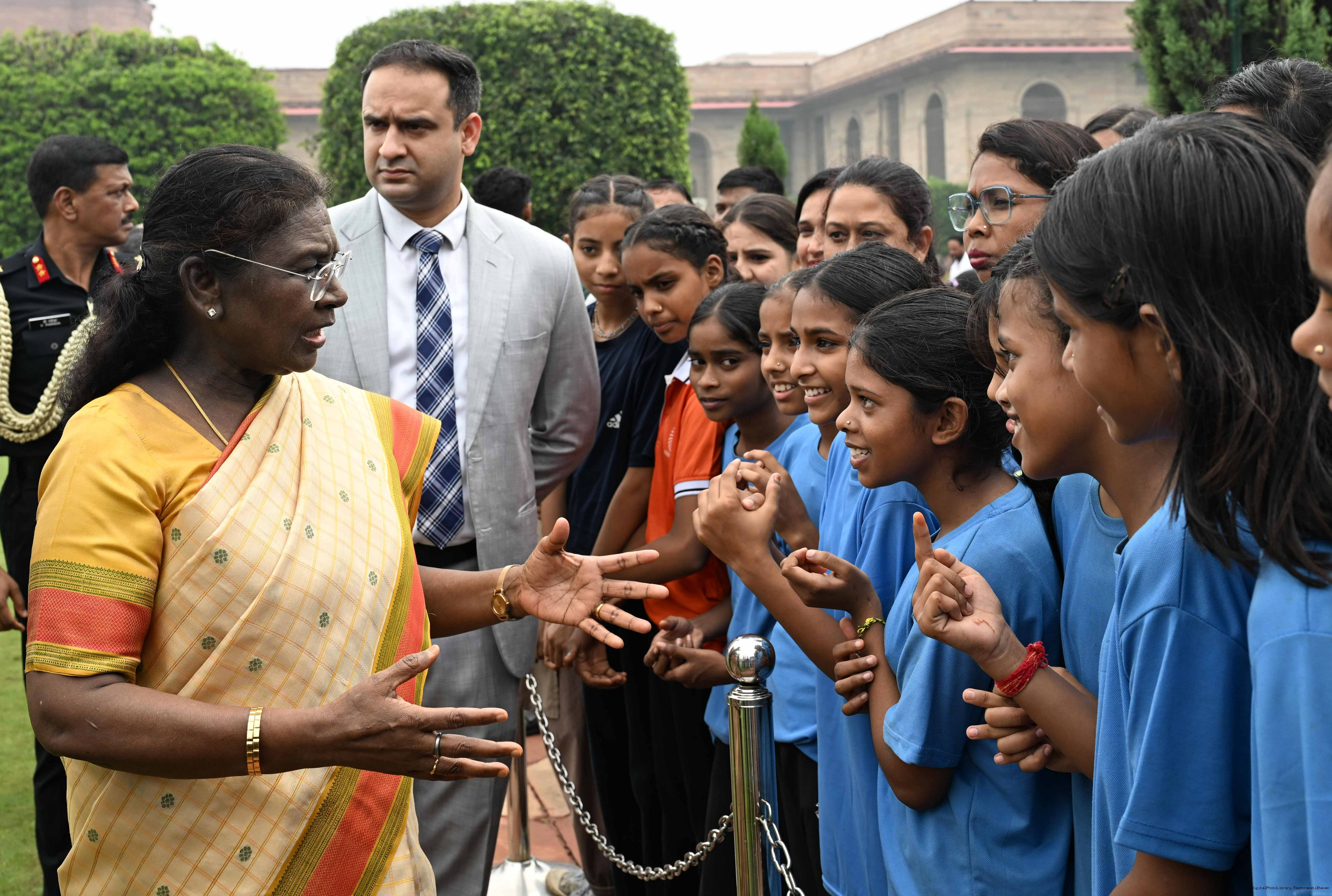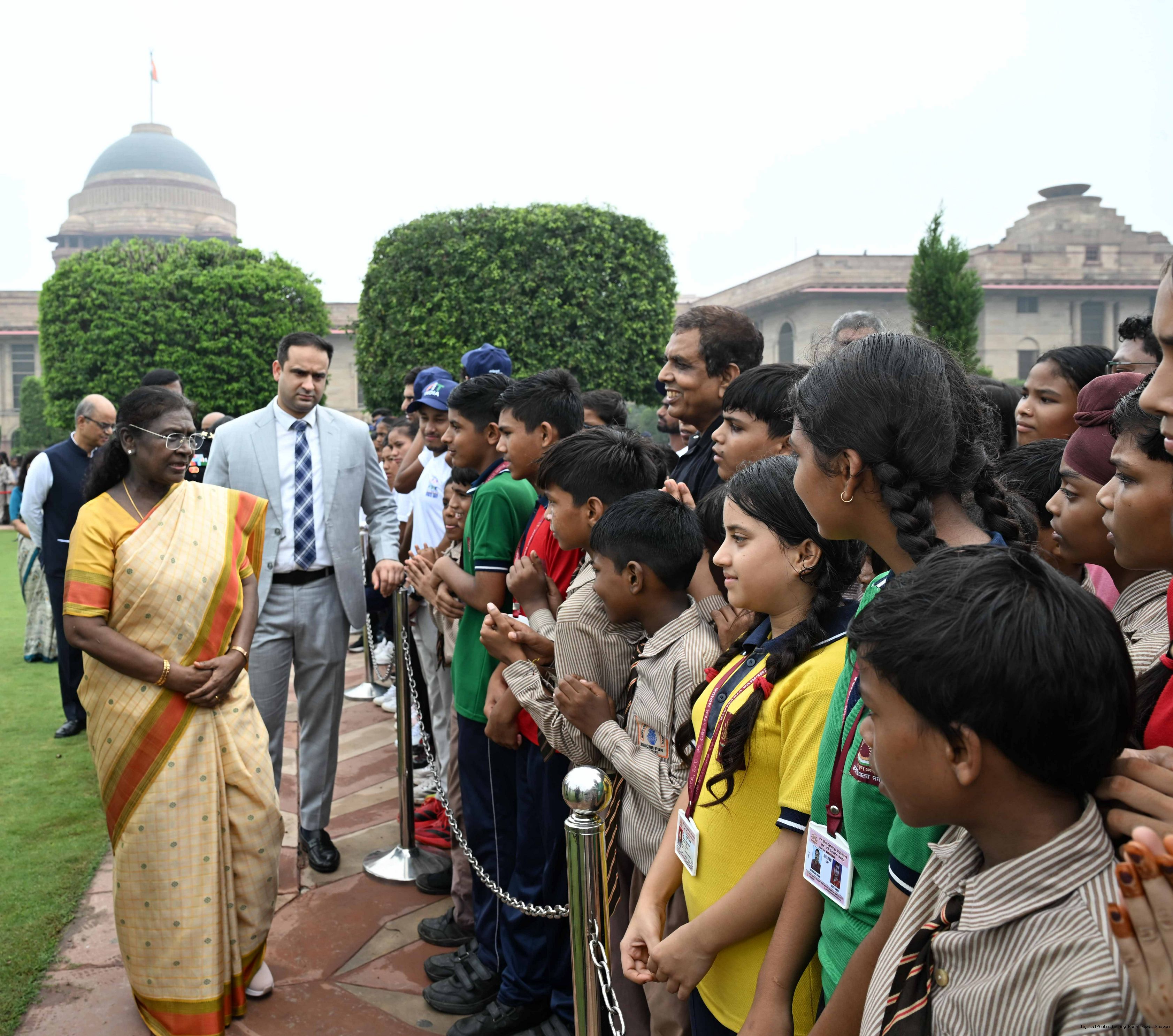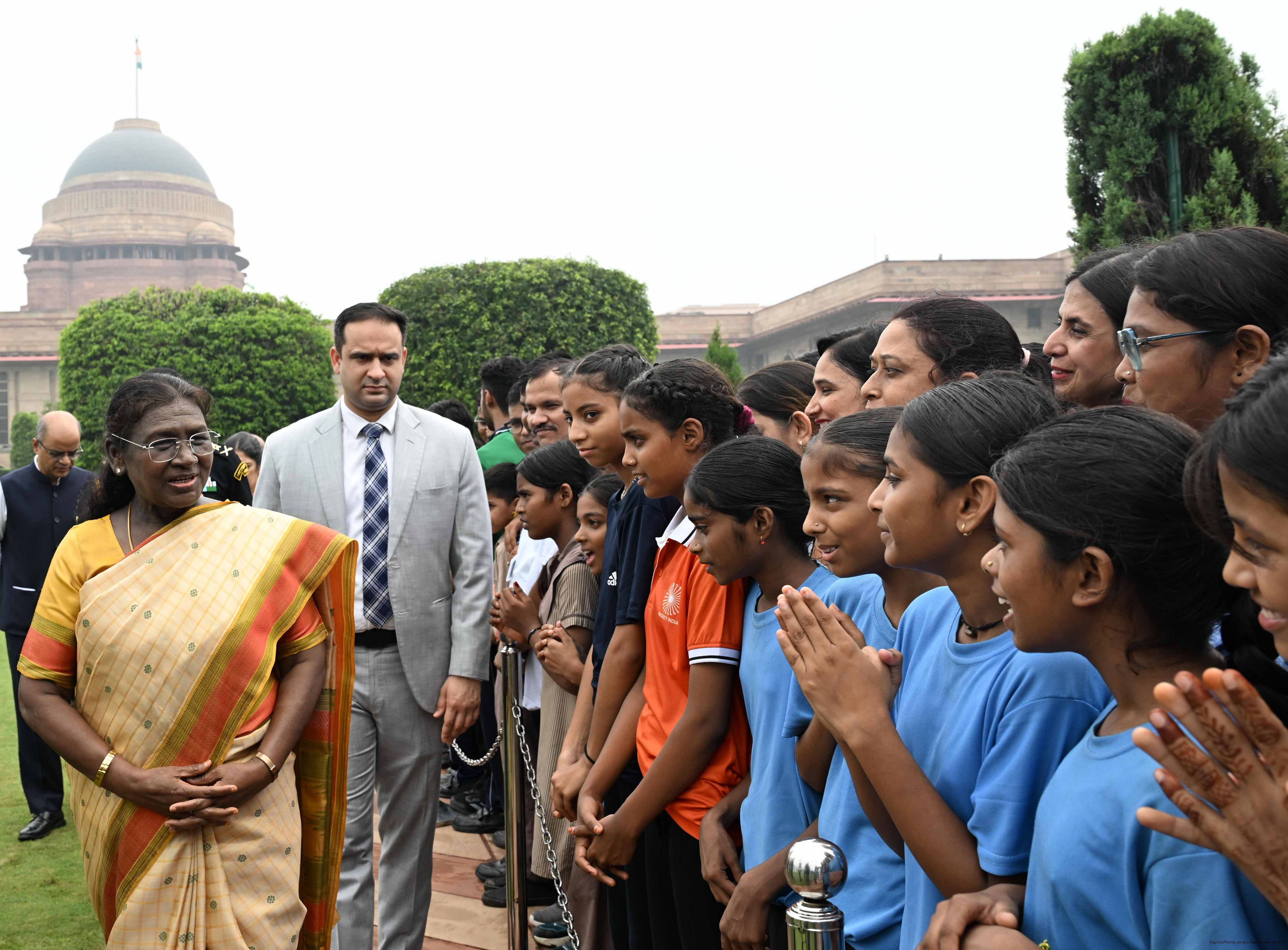 | Caption: | The President of India, Smt Droupadi Murmu interacted with sportspersons who visited Amrit Udyan on National Sports Day at Rashtrapati Bhavan on August 29, 2025. |