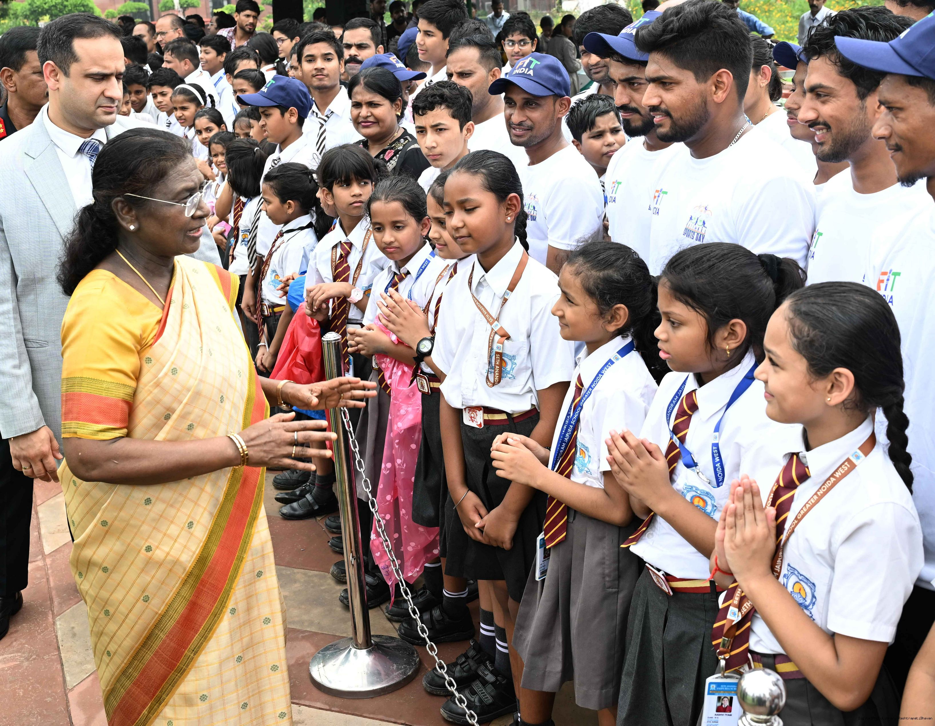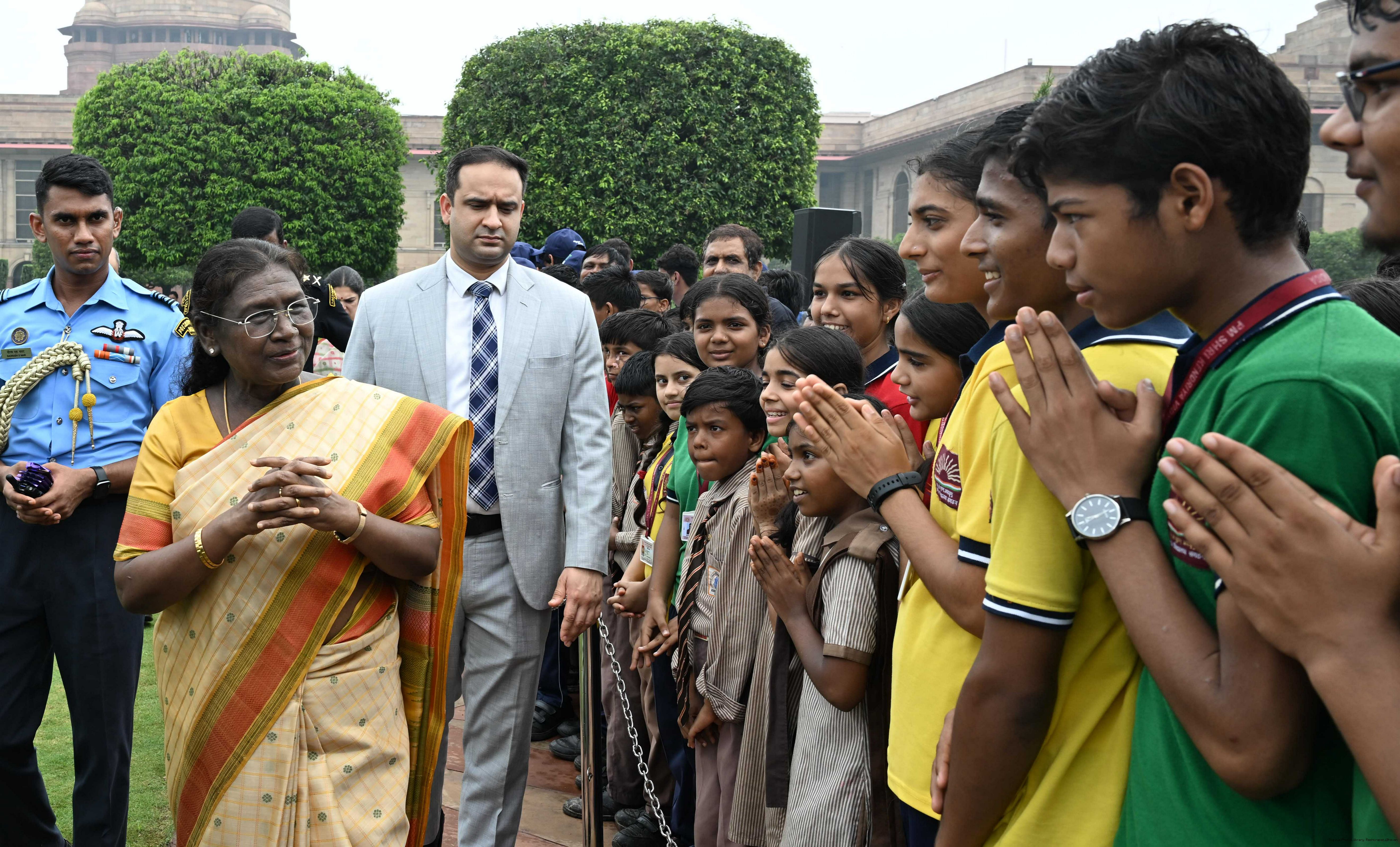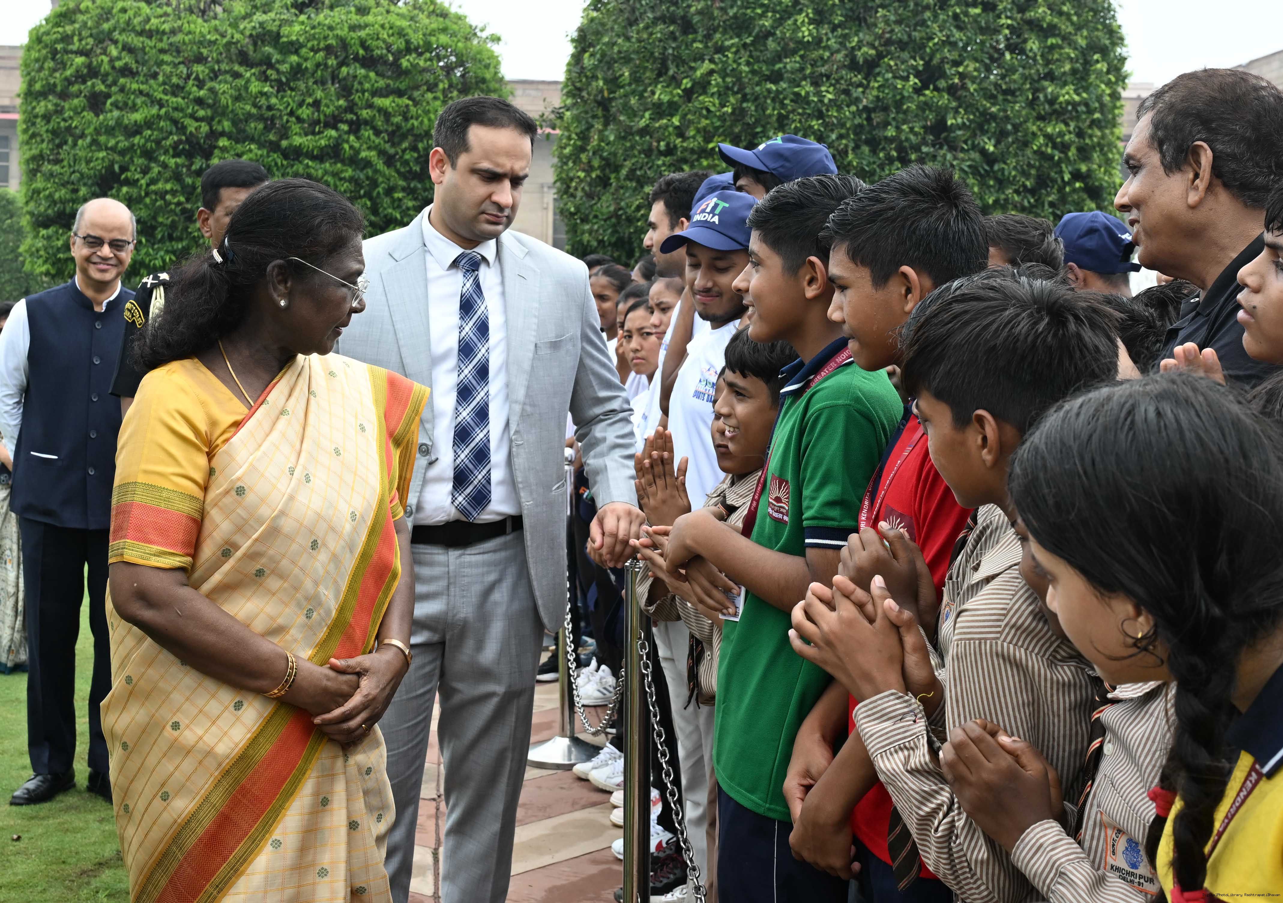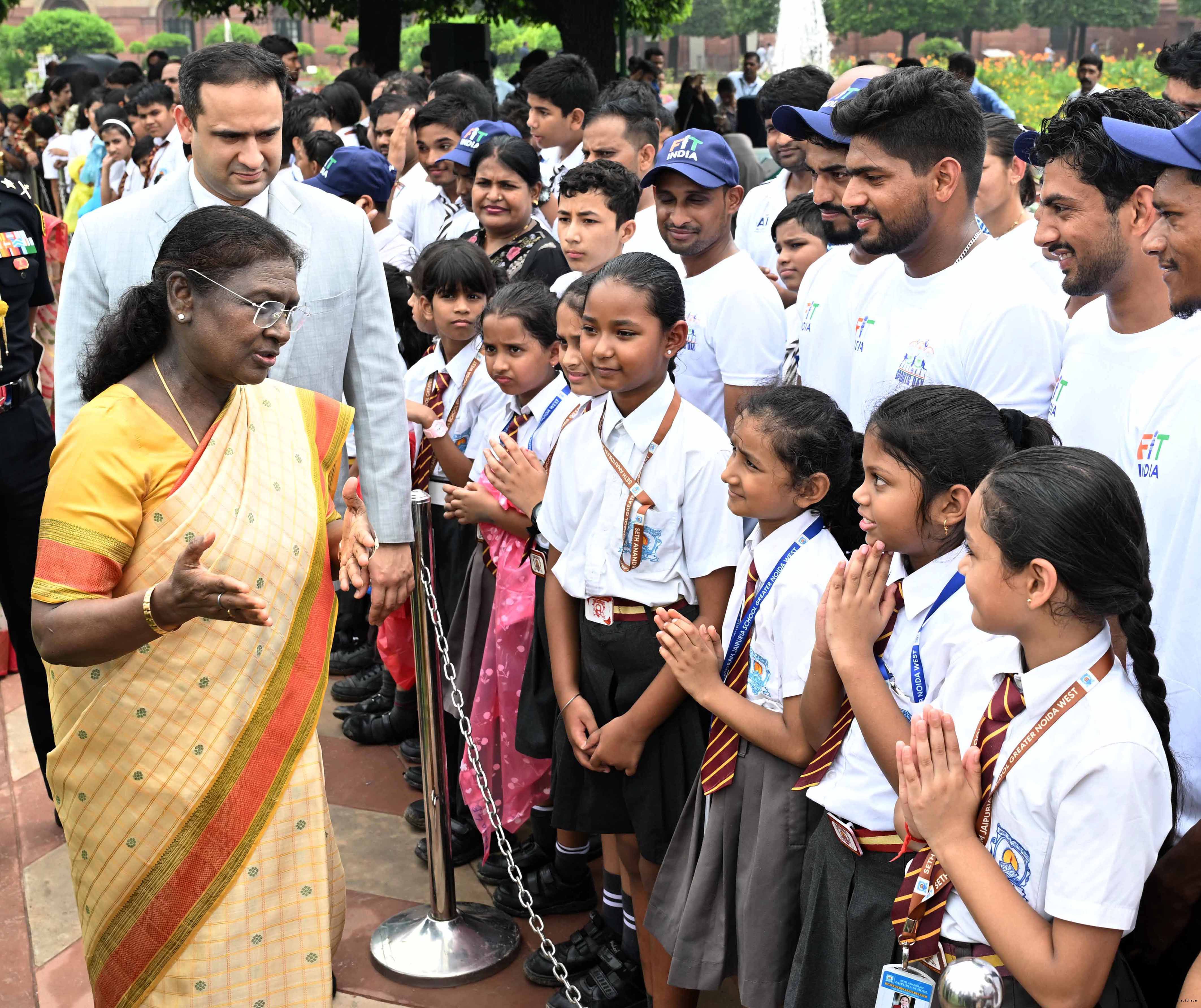 | Caption: | The President of India, Smt Droupadi Murmu interacted with sportspersons who visited Amrit Udyan on National Sports Day at Rashtrapati Bhavan on August 29, 2025. |