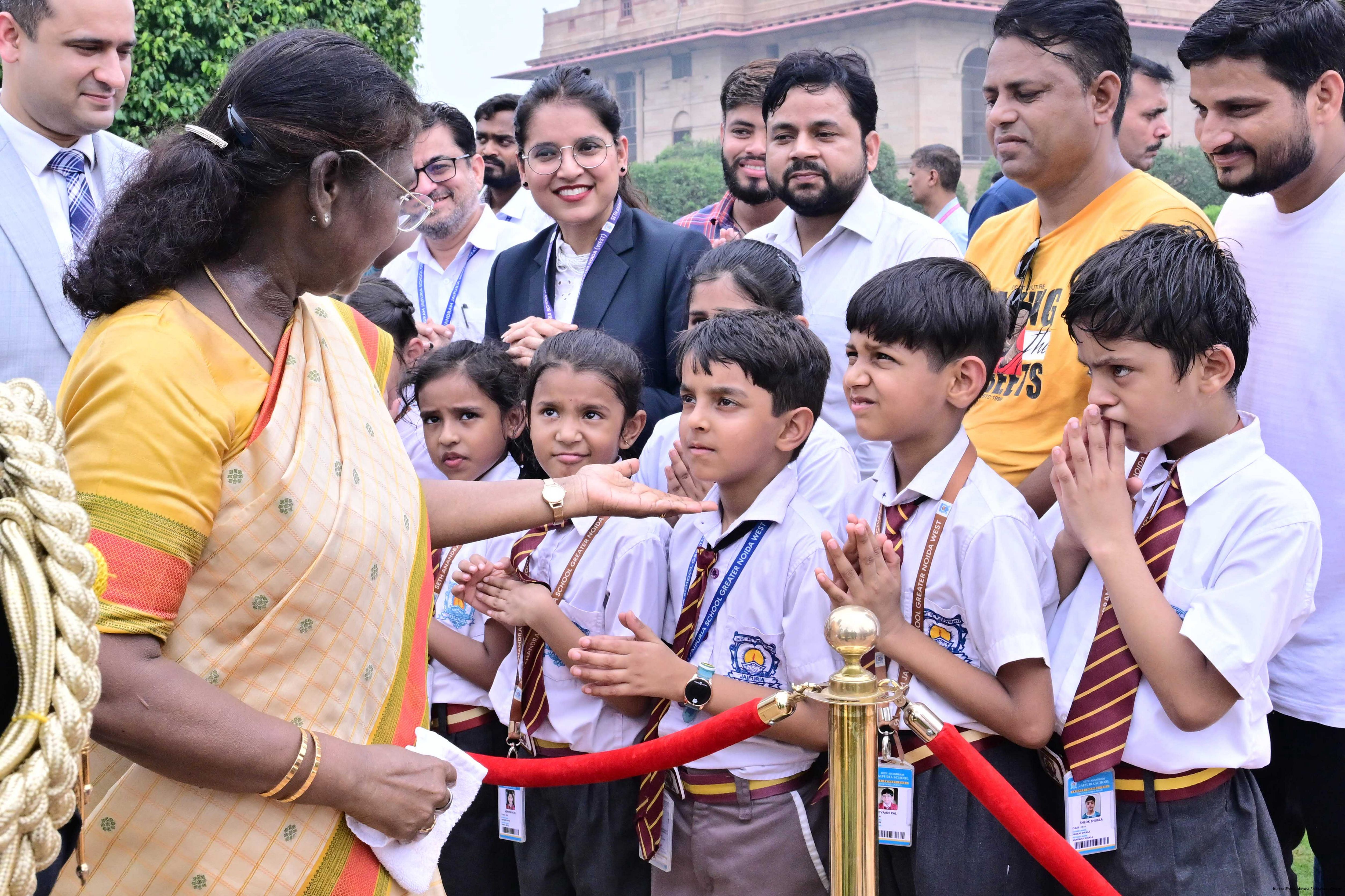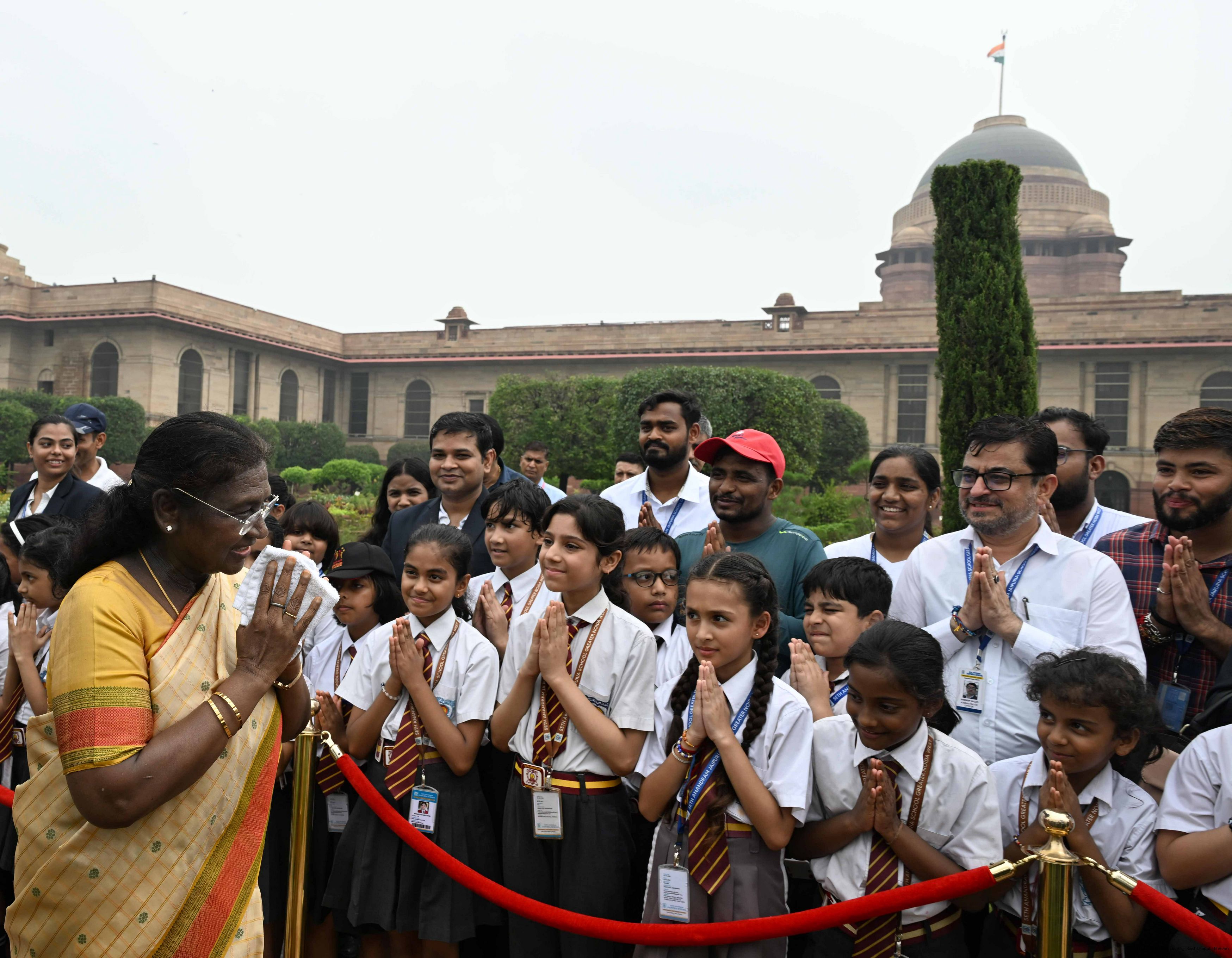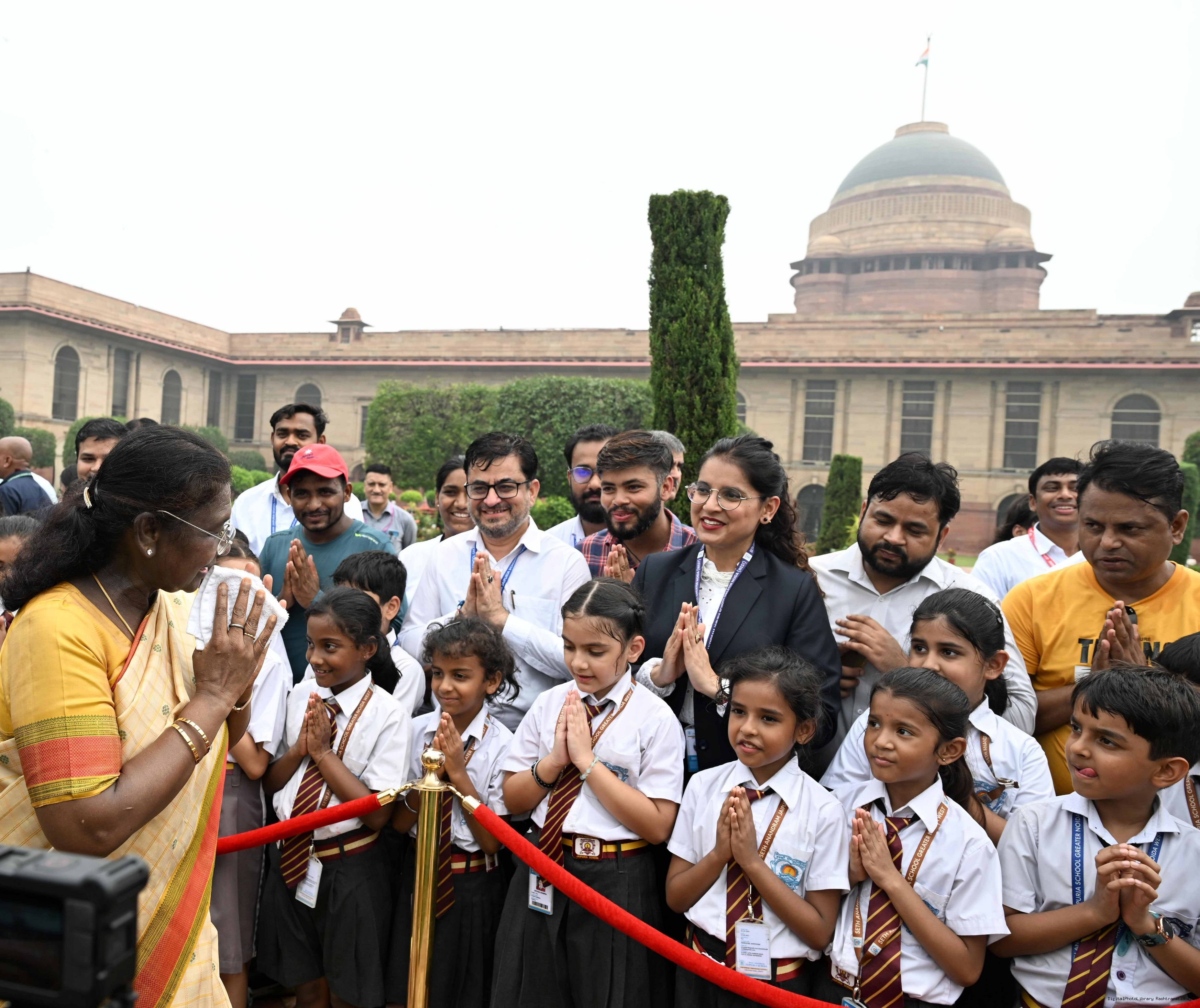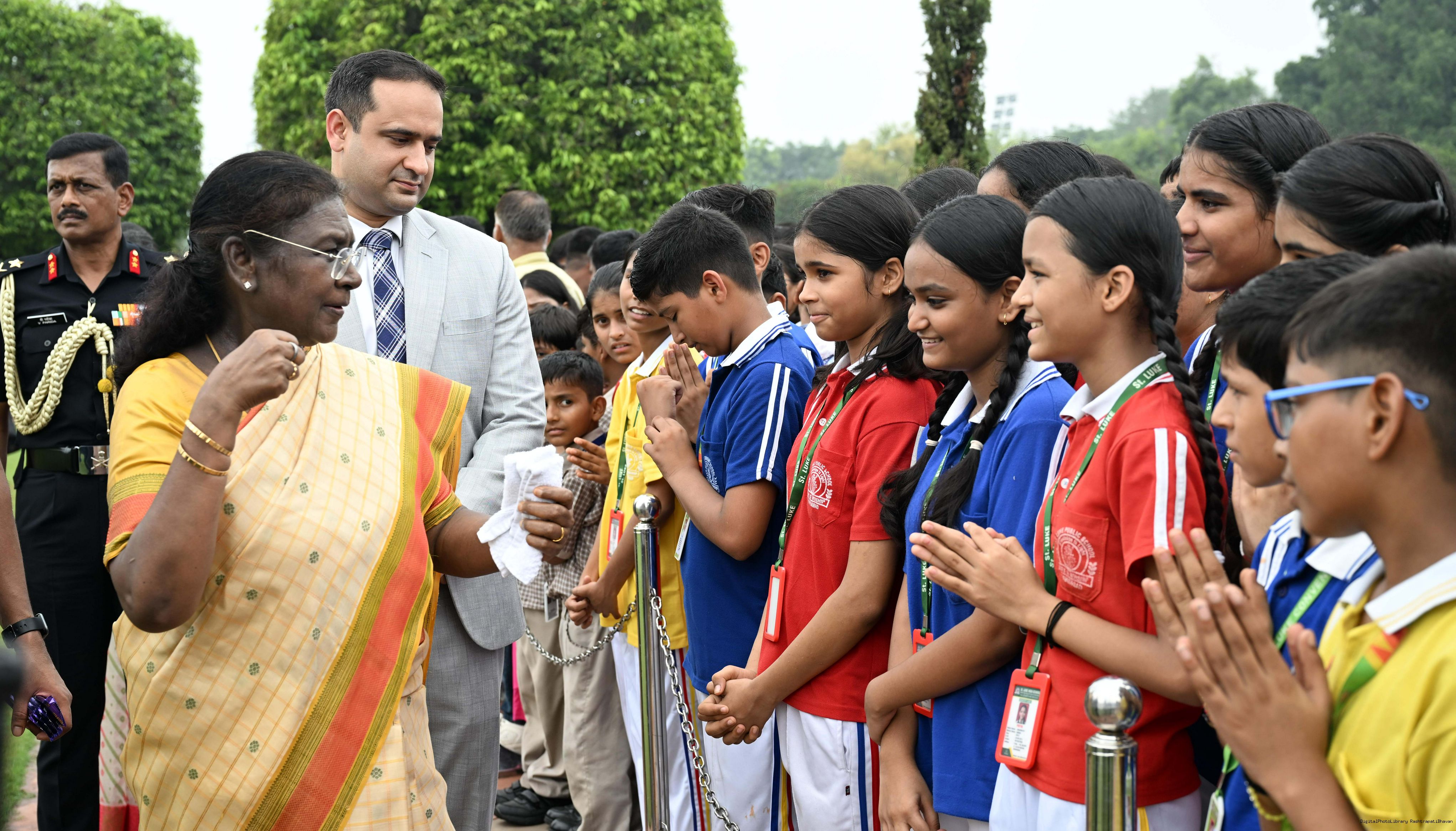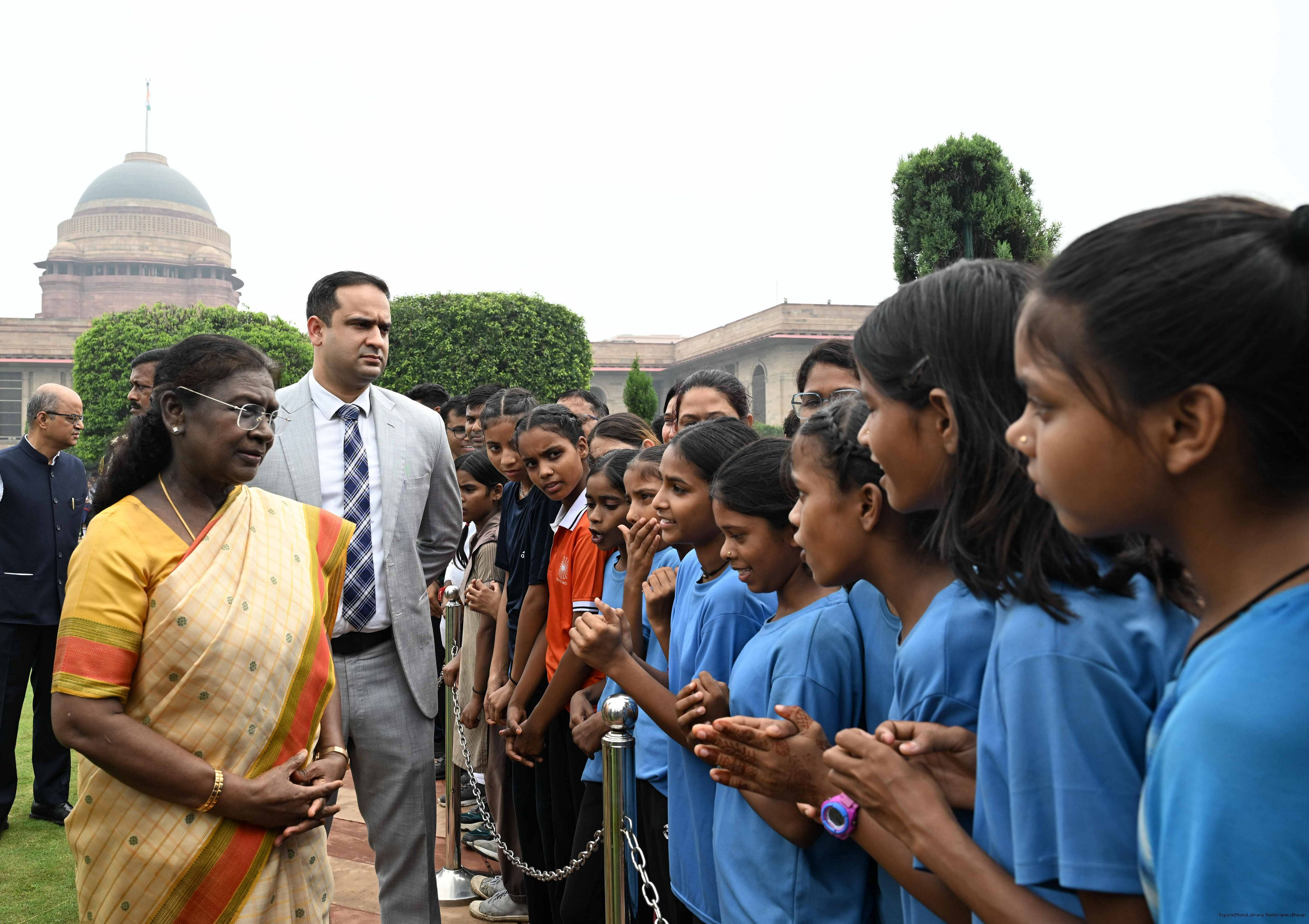 | Caption: | The President of India, Smt Droupadi Murmu interacted with sportspersons who visited Amrit Udyan on National Sports Day at Rashtrapati Bhavan on August 29, 2025. |