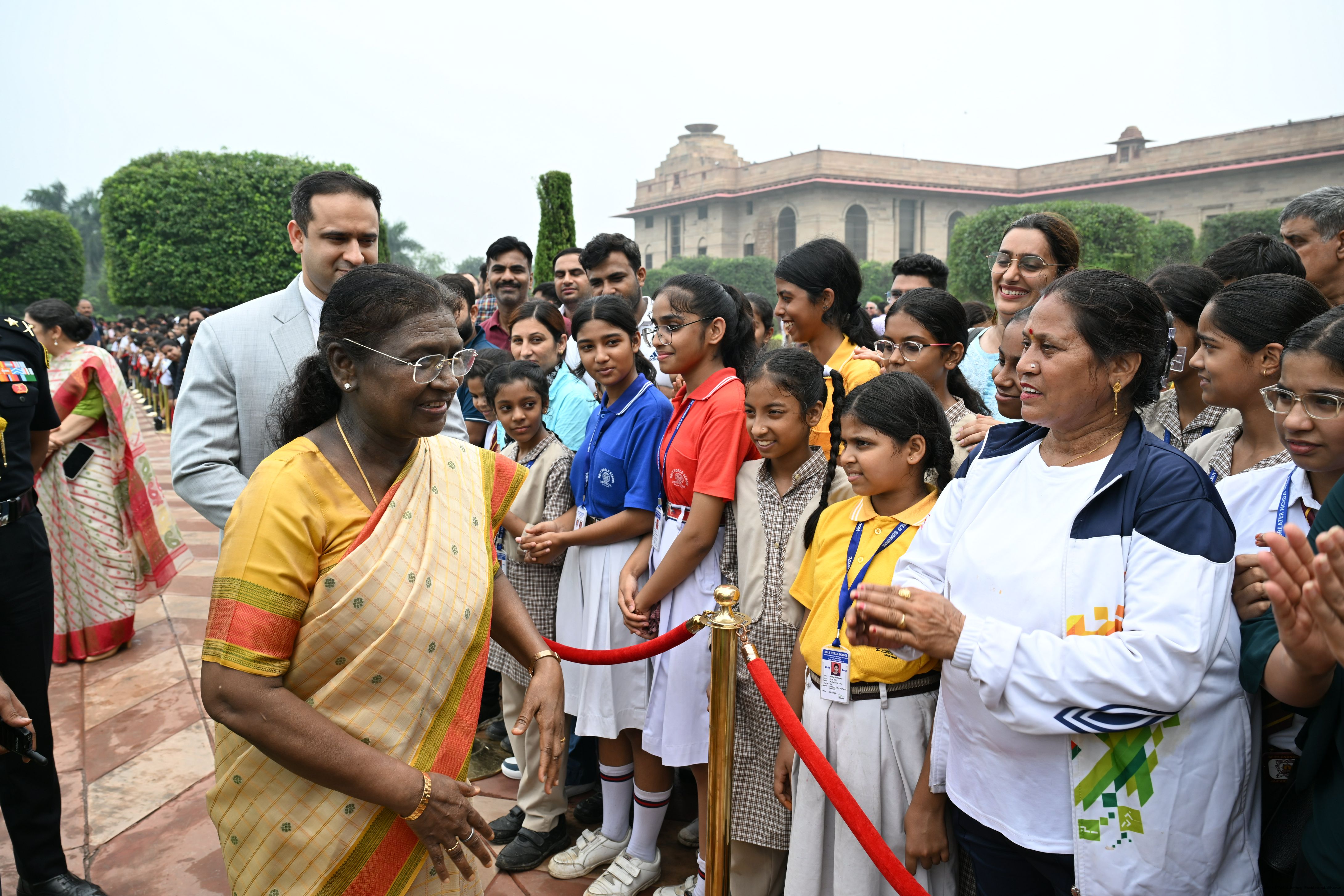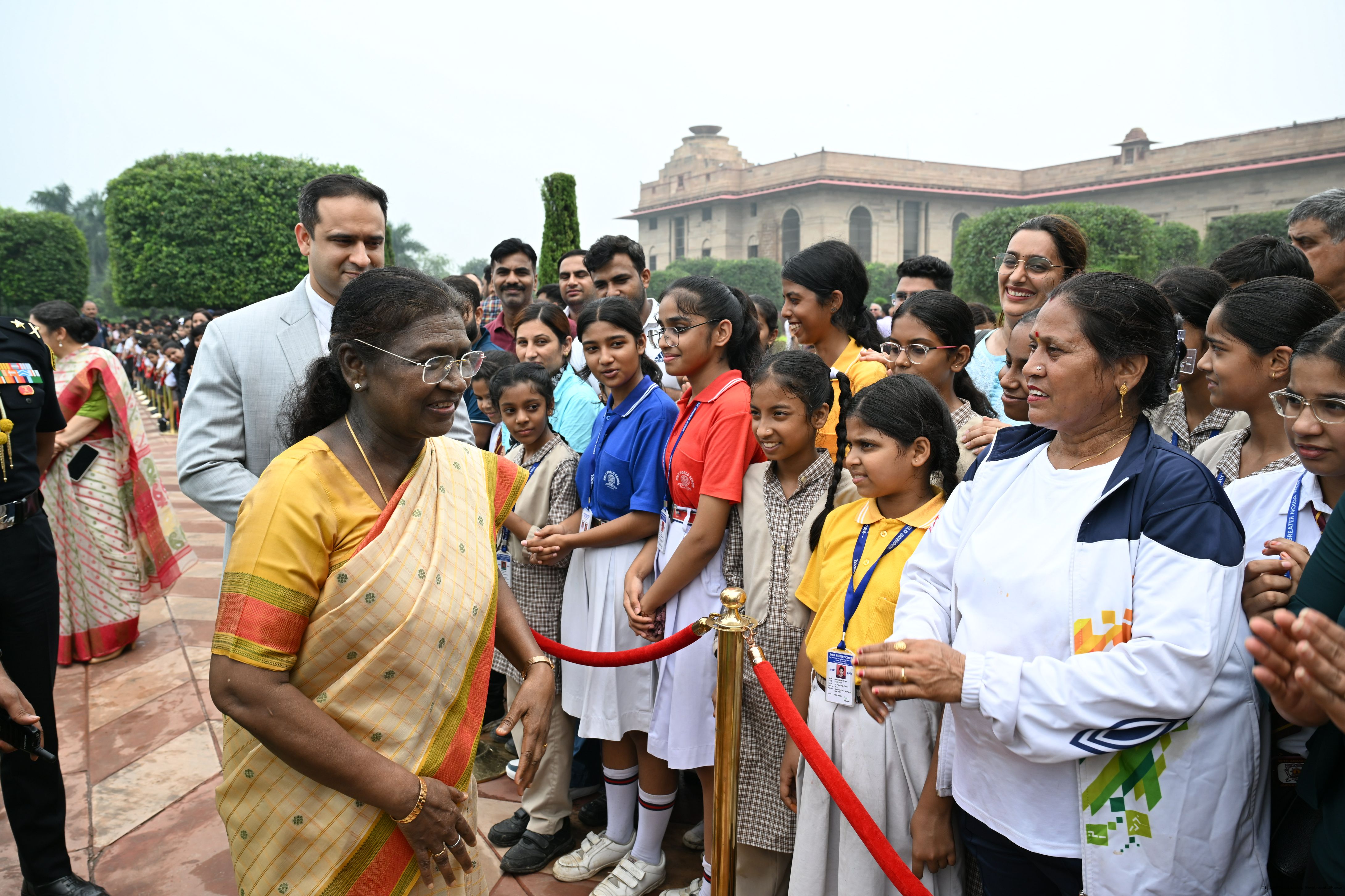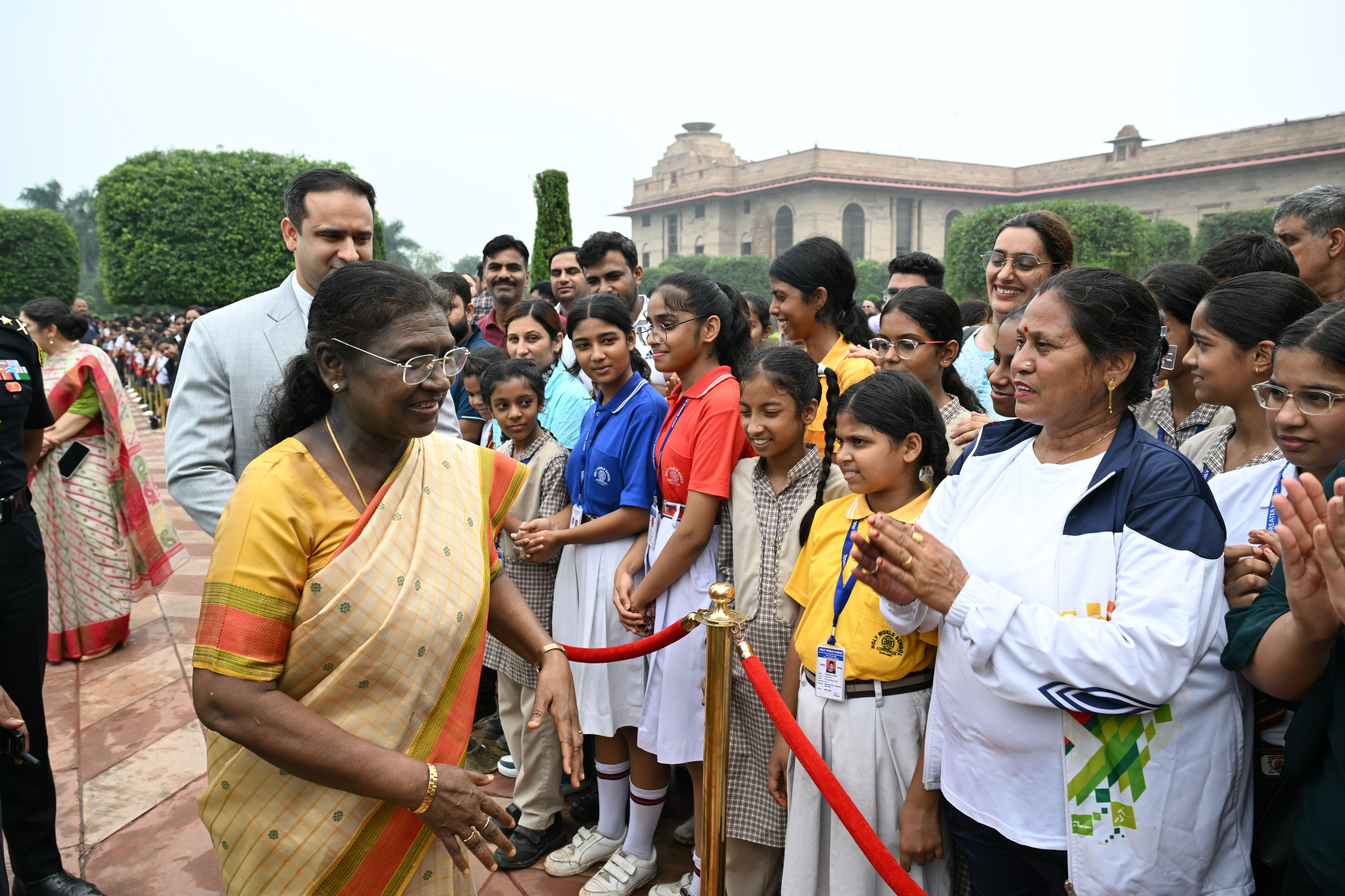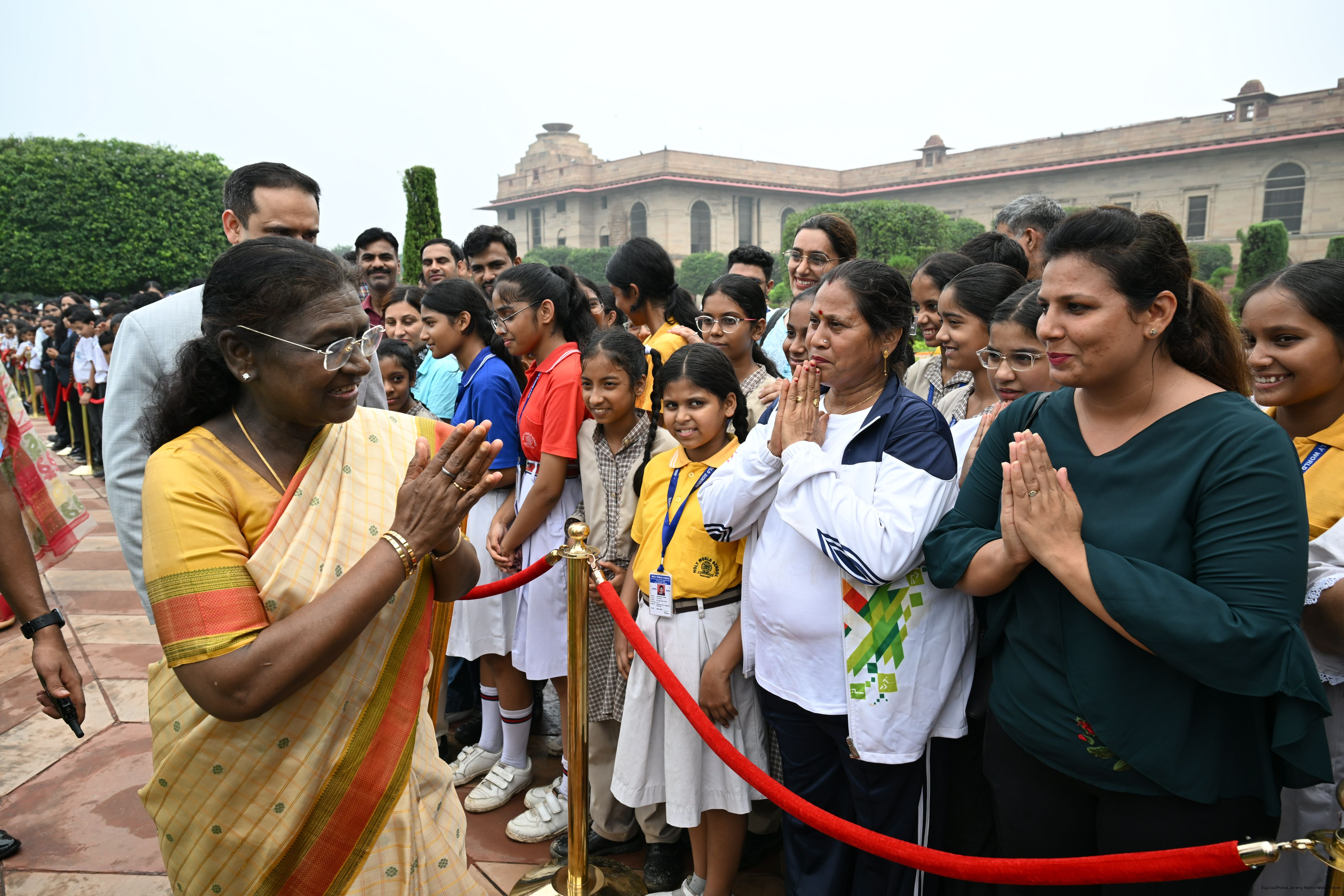 | Caption: | The President of India, Smt Droupadi Murmu interacted with sportspersons who visited Amrit Udyan on National Sports Day at Rashtrapati Bhavan on August 29, 2025. |