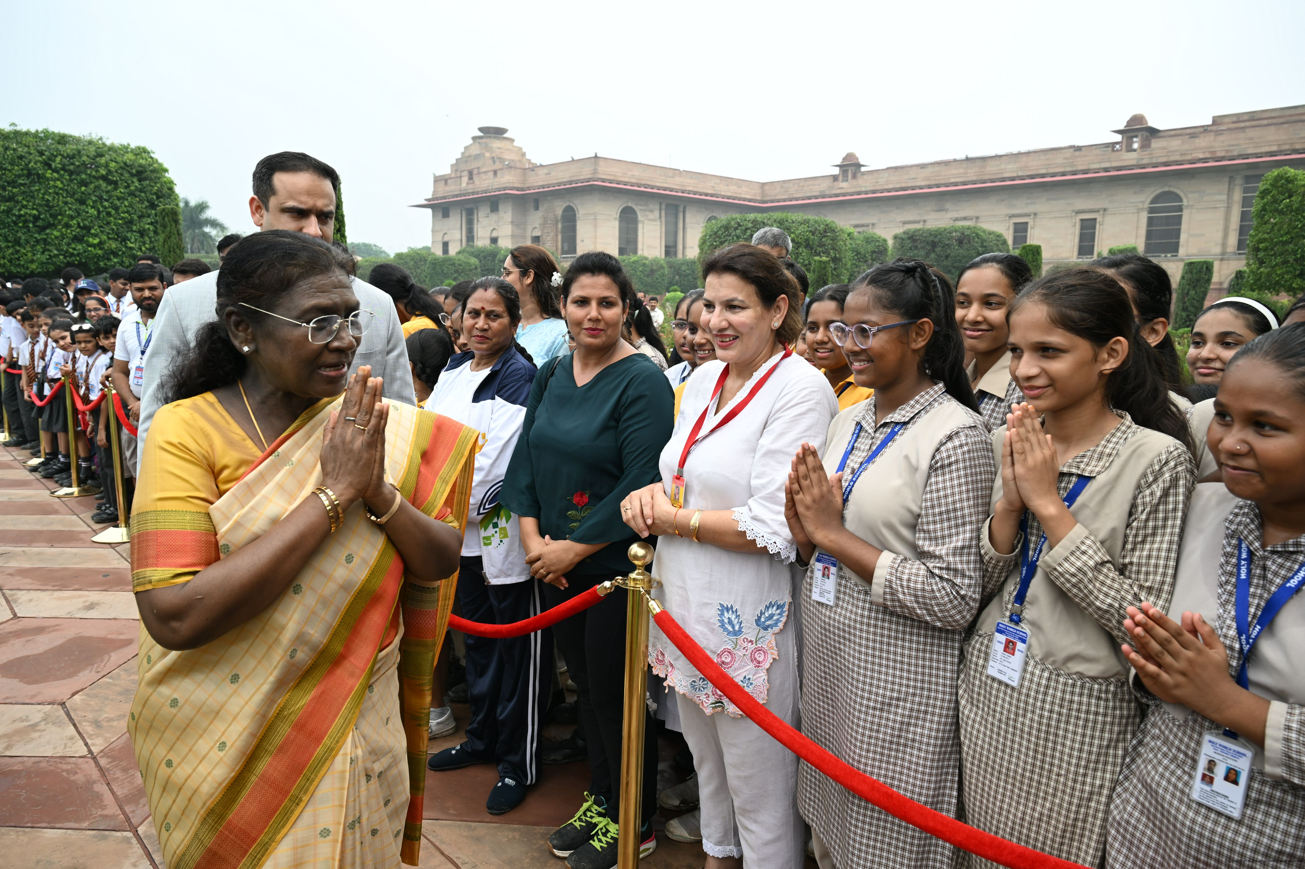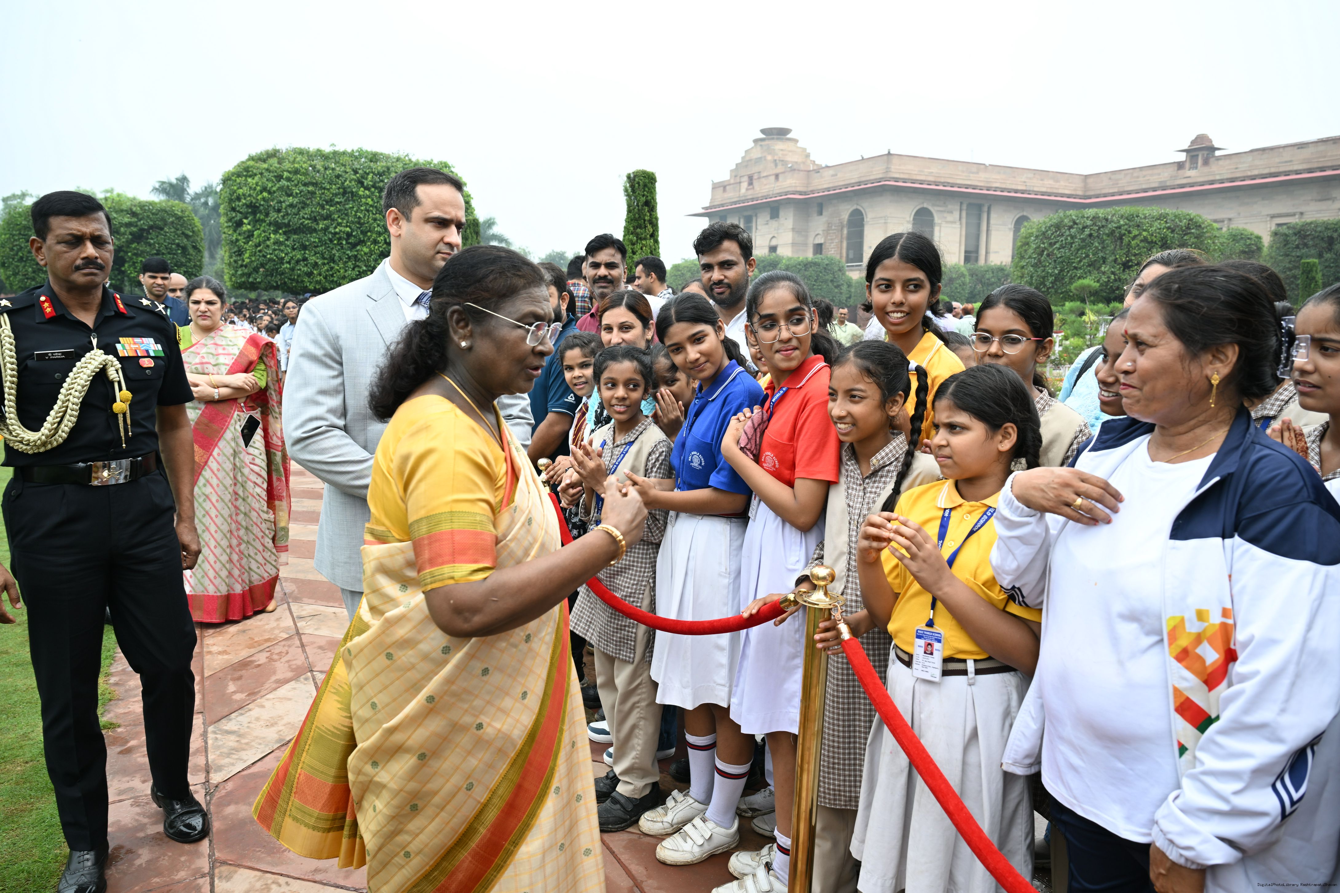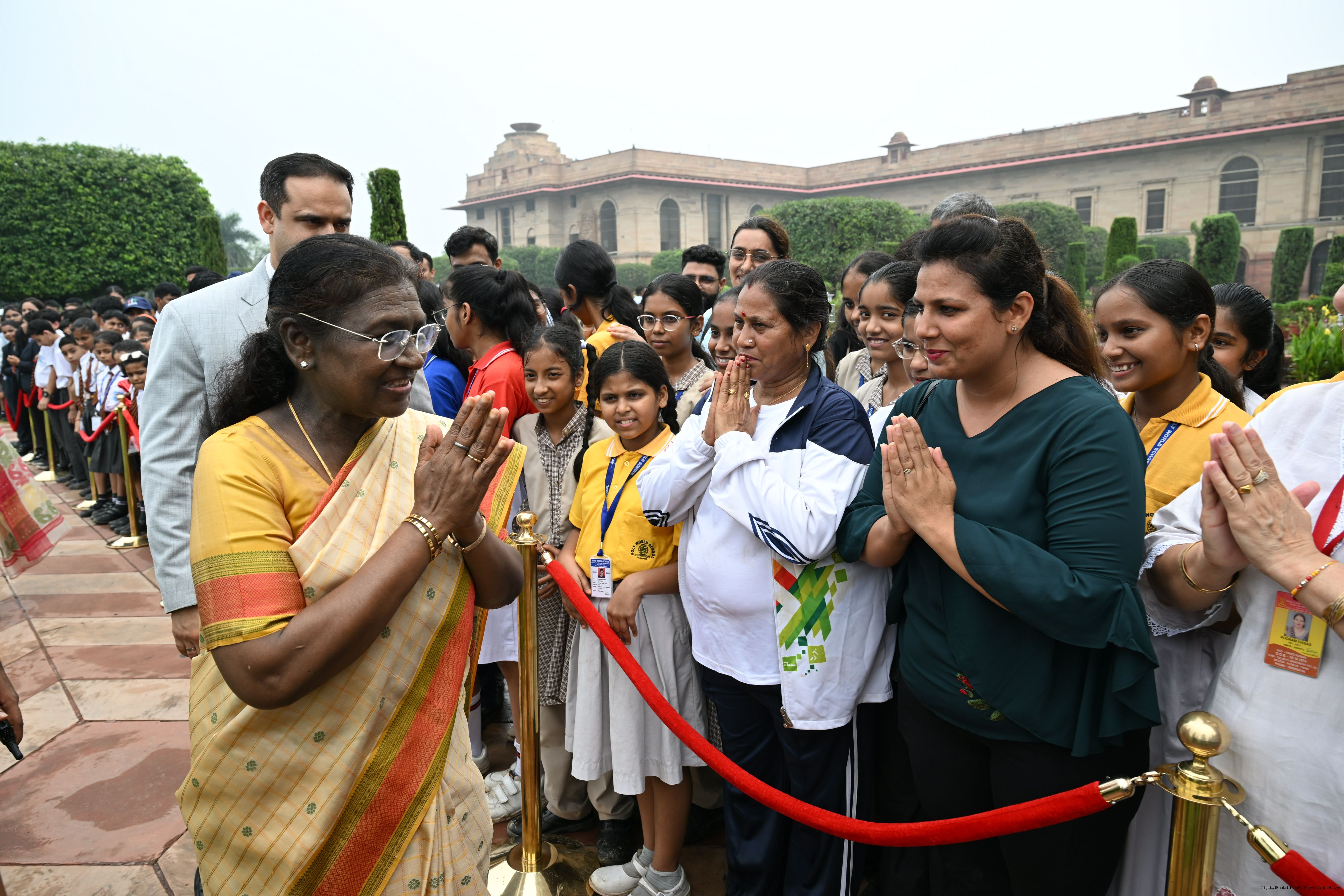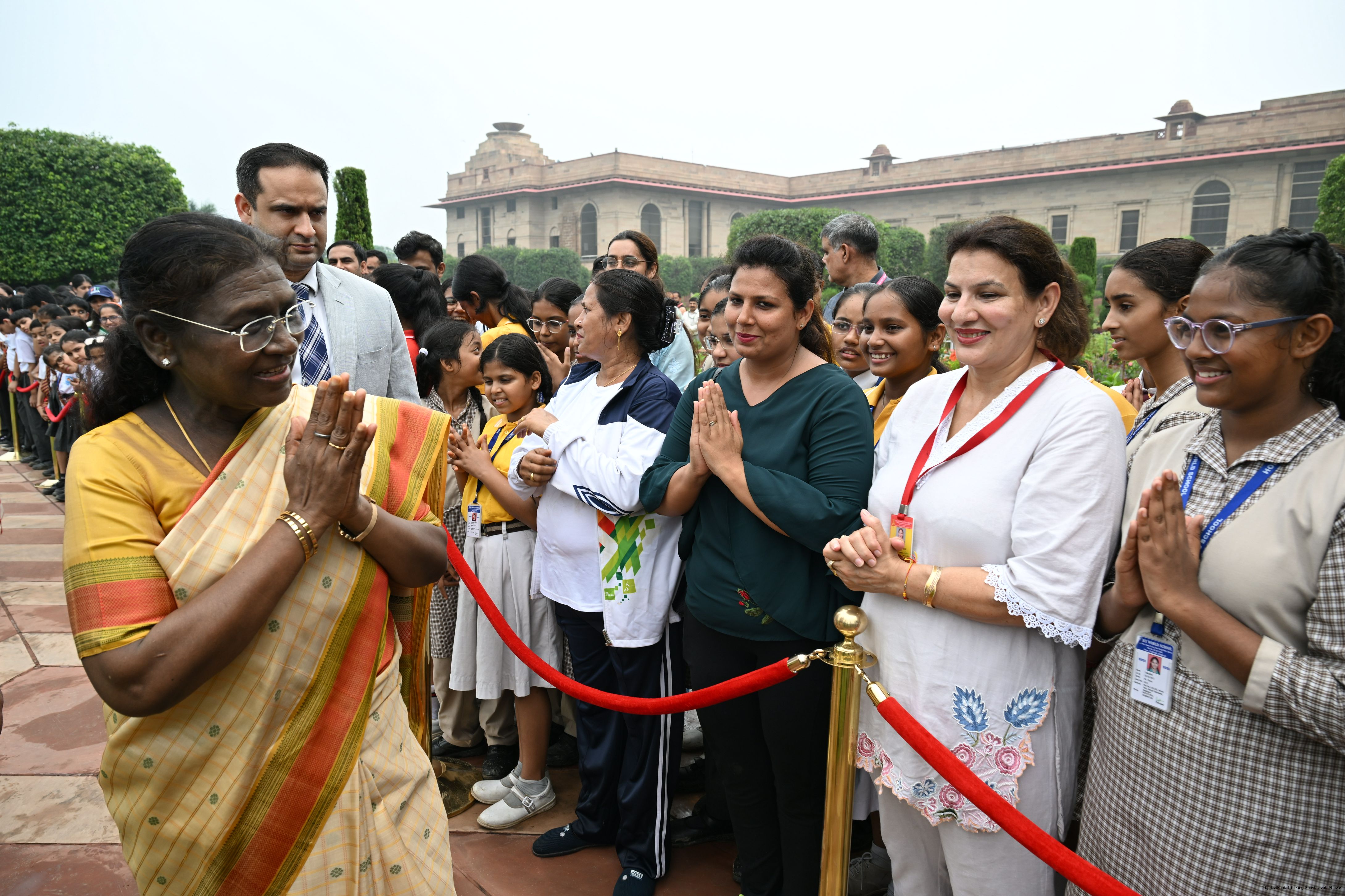 | Caption: | The President of India, Smt Droupadi Murmu interacted with sportspersons who visited Amrit Udyan on National Sports Day at Rashtrapati Bhavan on August 29, 2025. |