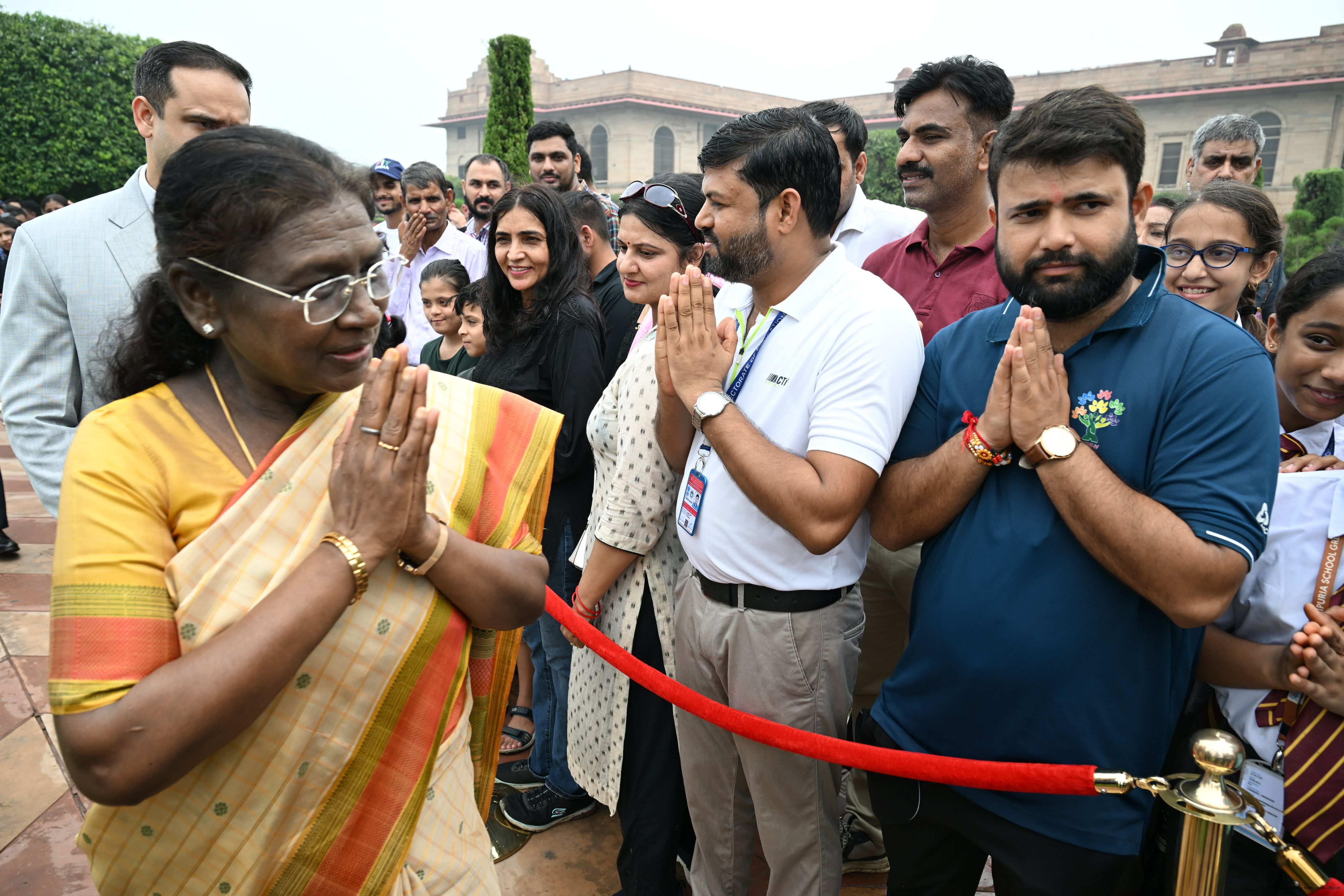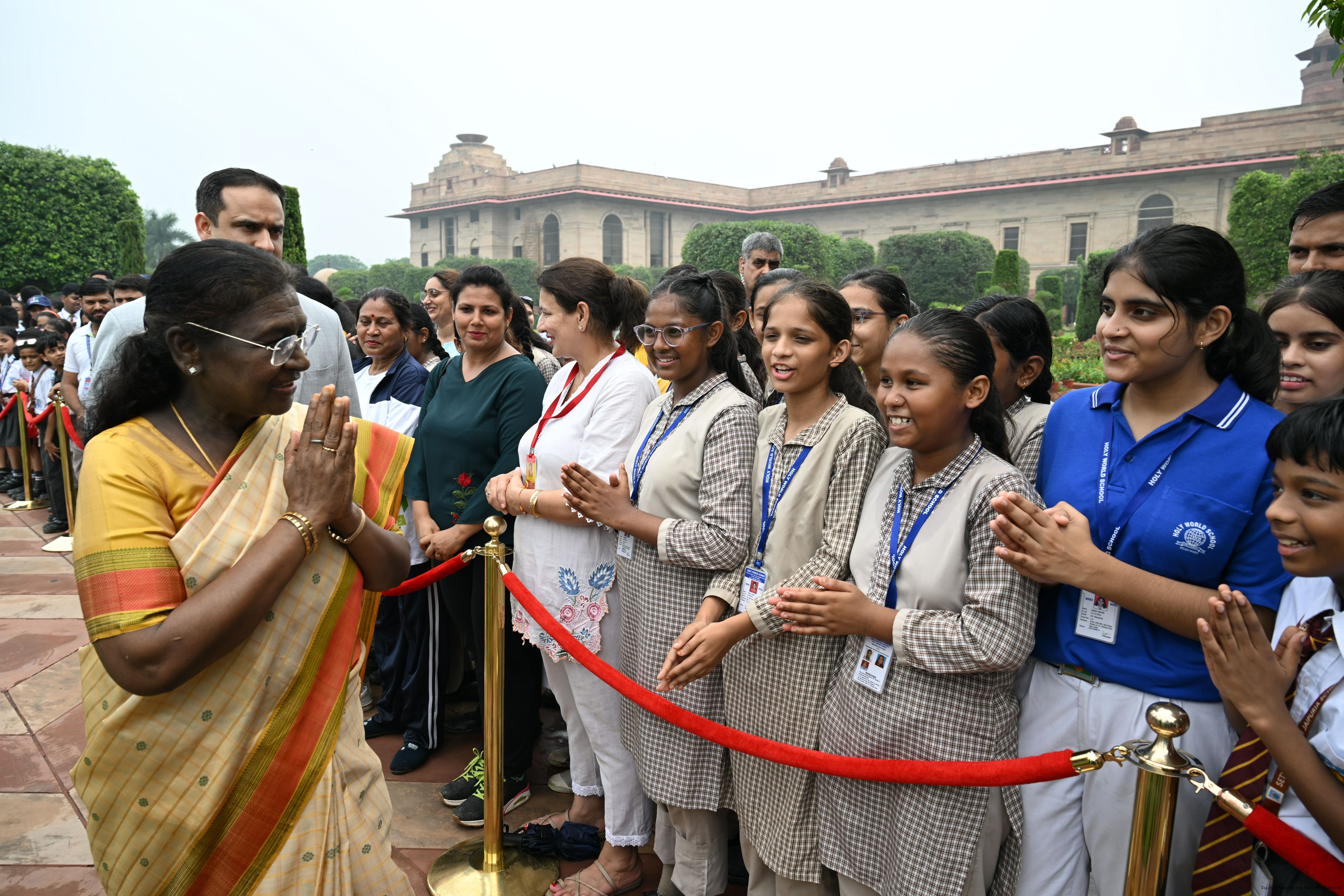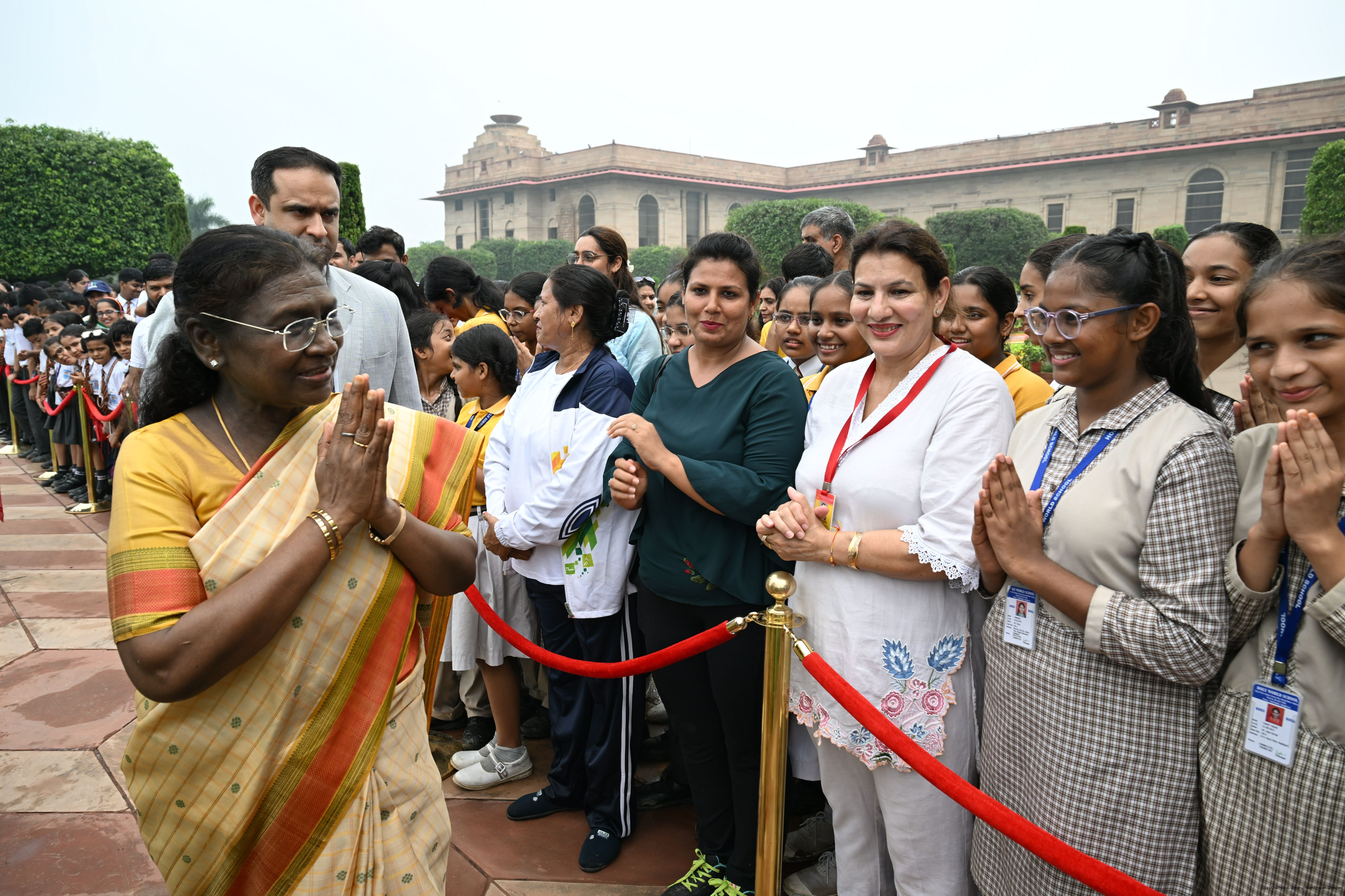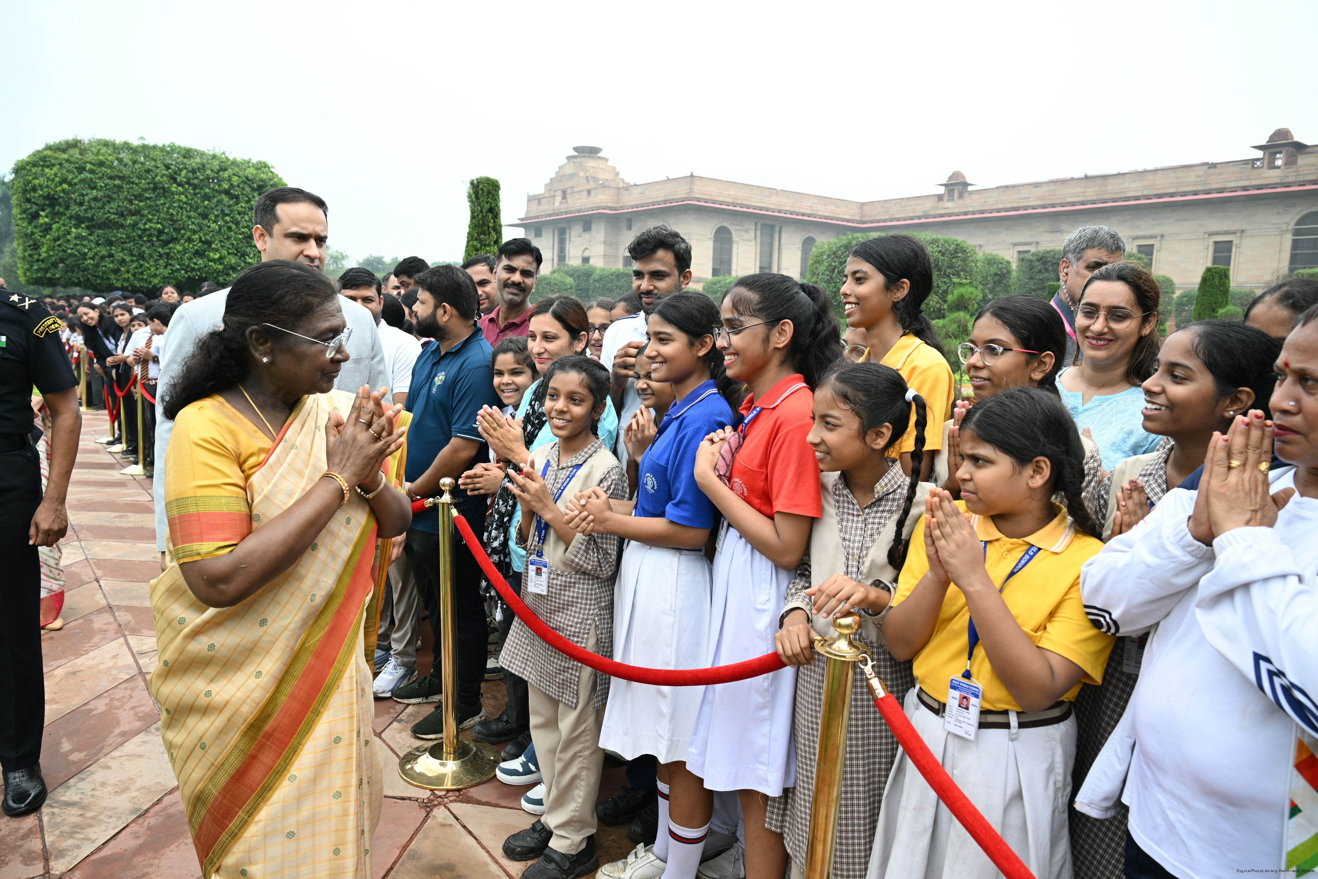 | Caption: | The President of India, Smt Droupadi Murmu interacted with sportspersons who visited Amrit Udyan on National Sports Day at Rashtrapati Bhavan on August 29, 2025. |