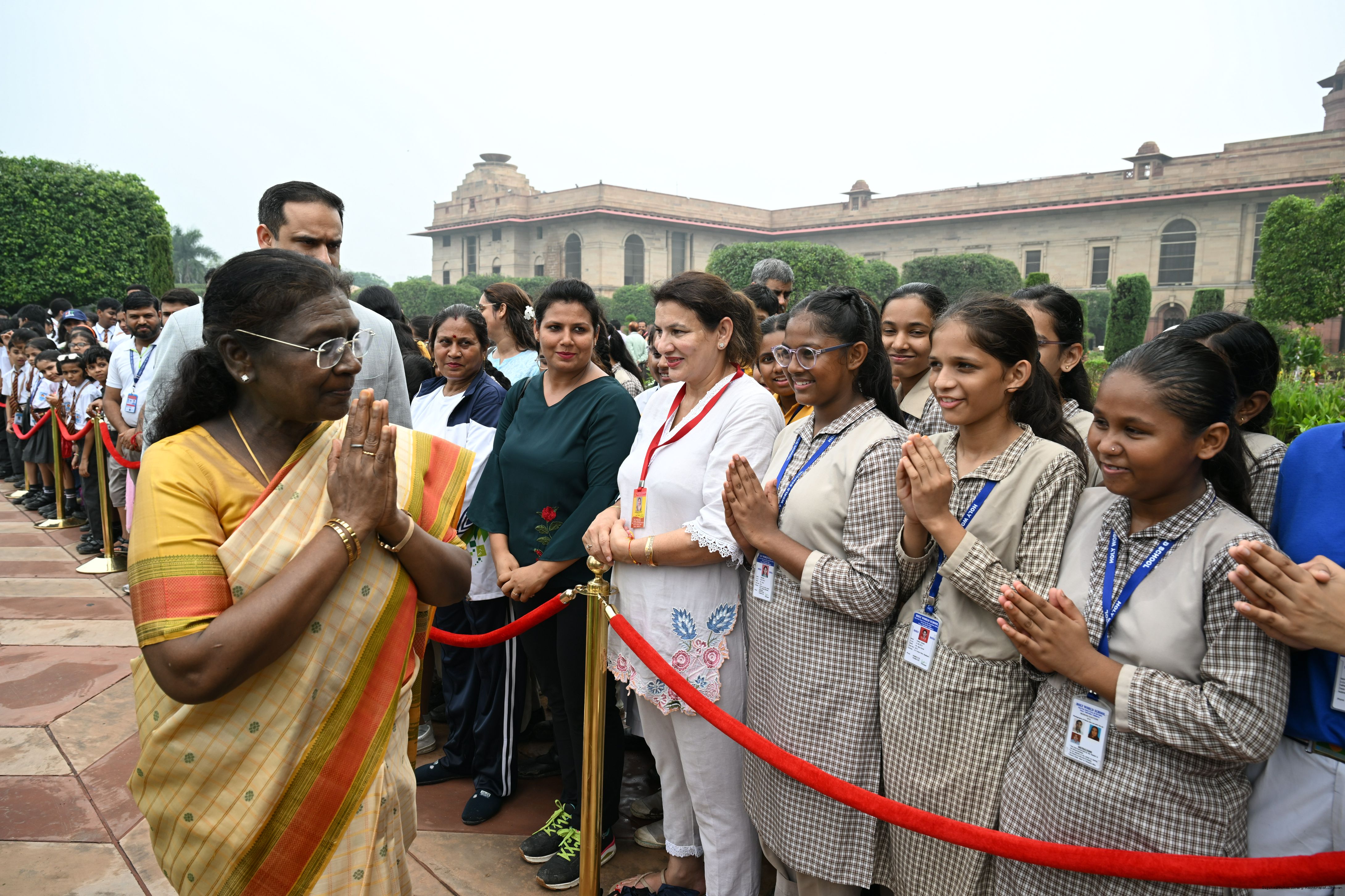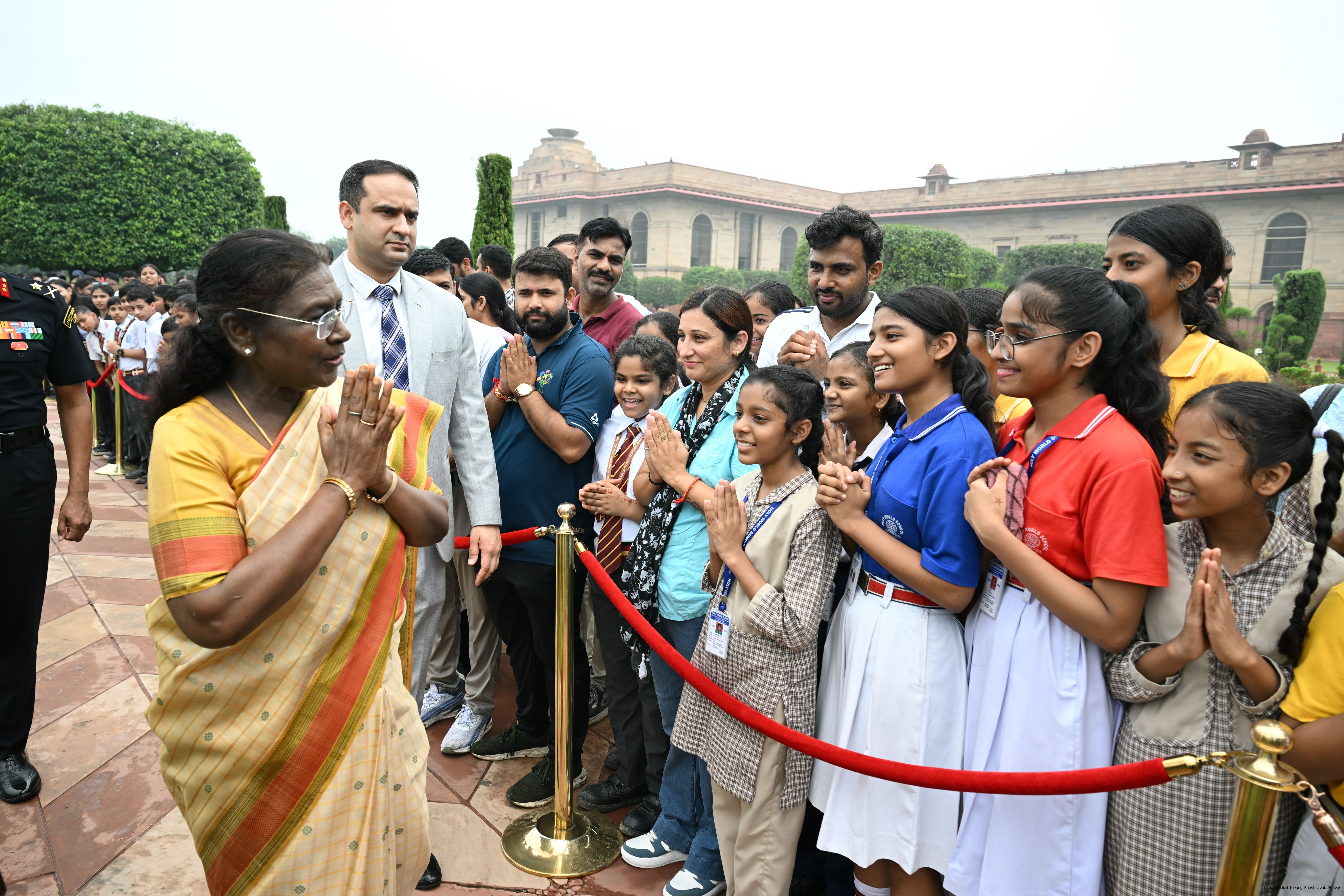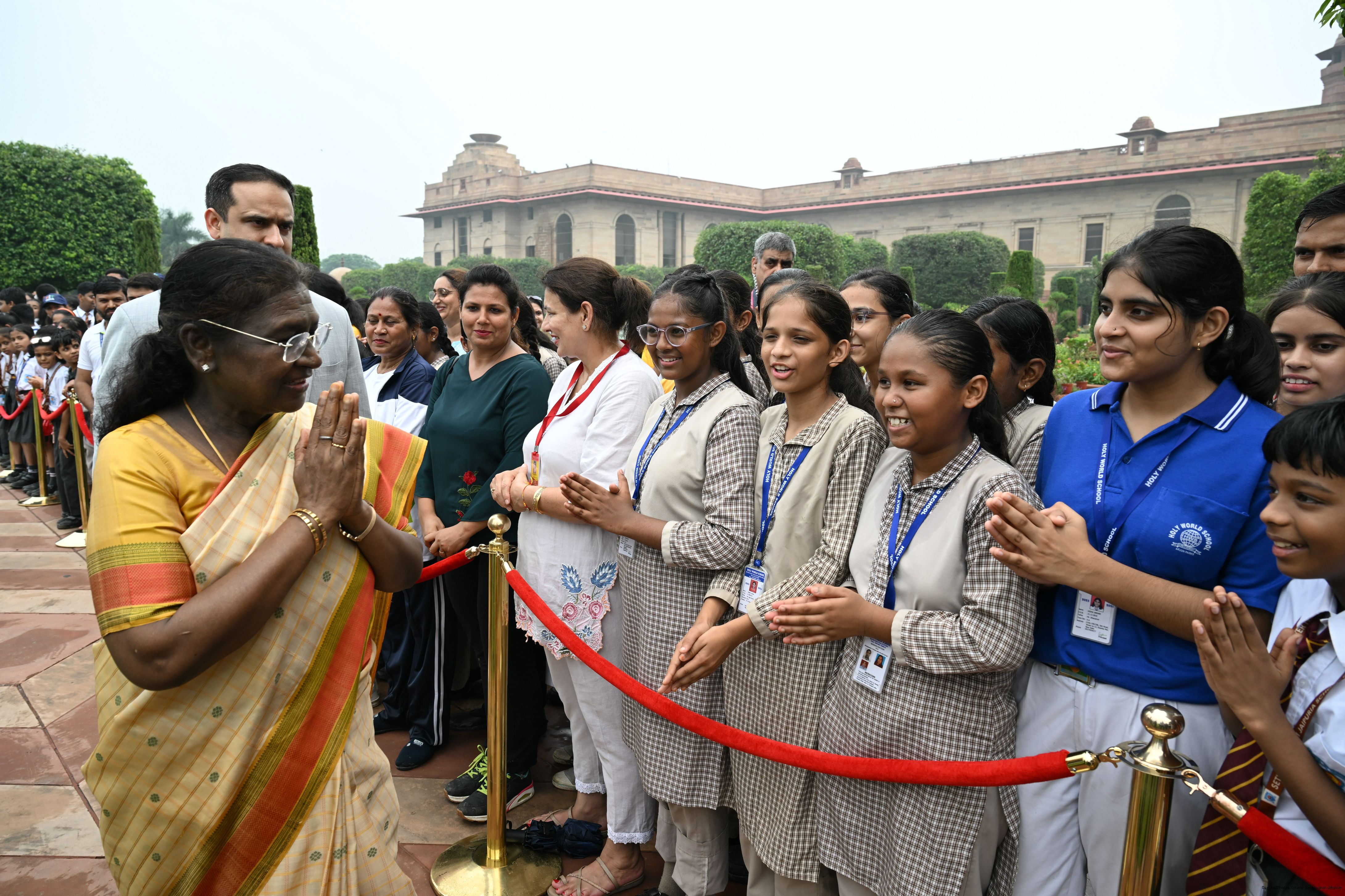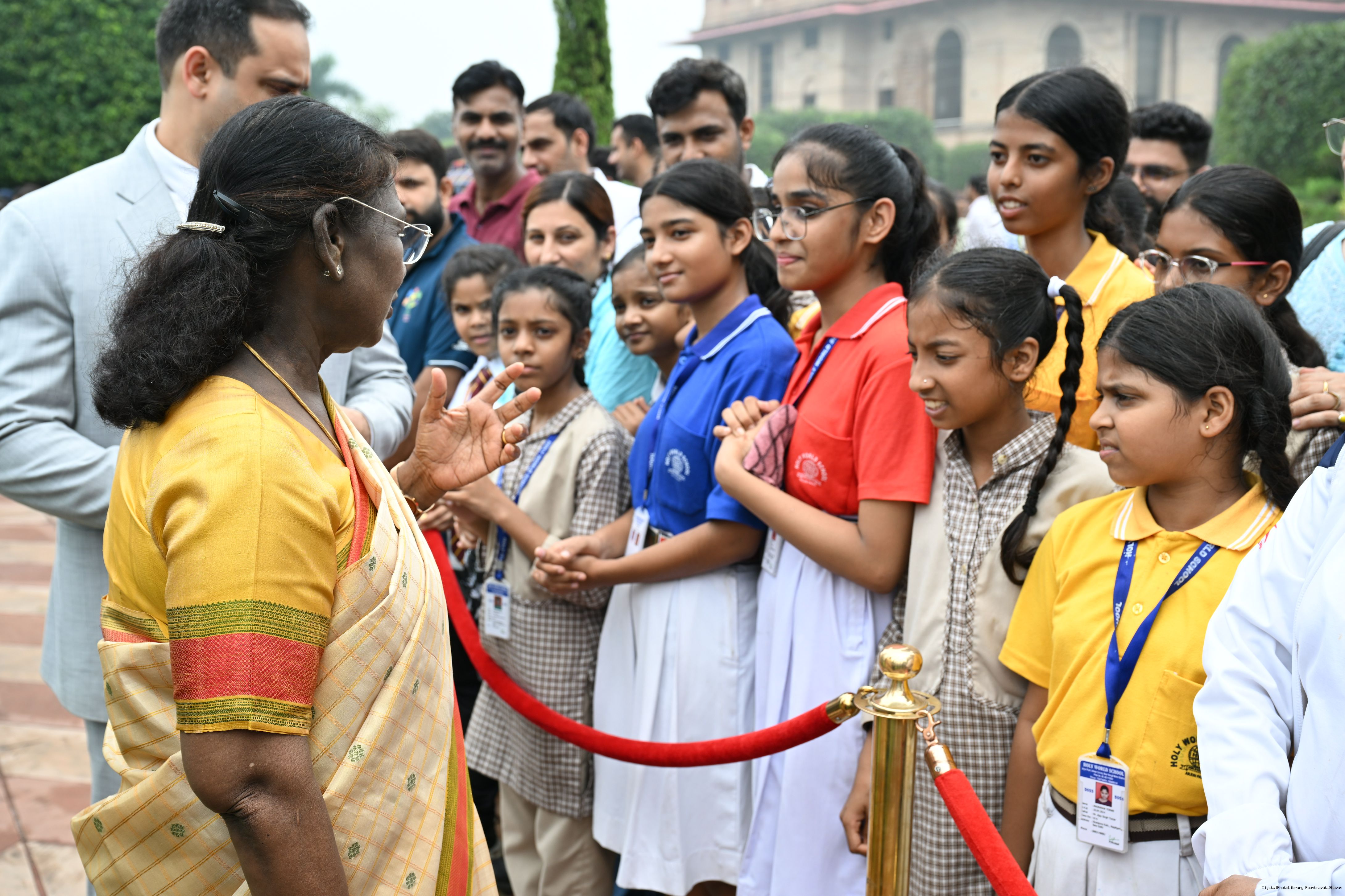 | Caption: | The President of India, Smt Droupadi Murmu interacted with sportspersons who visited Amrit Udyan on National Sports Day at Rashtrapati Bhavan on August 29, 2025. |
