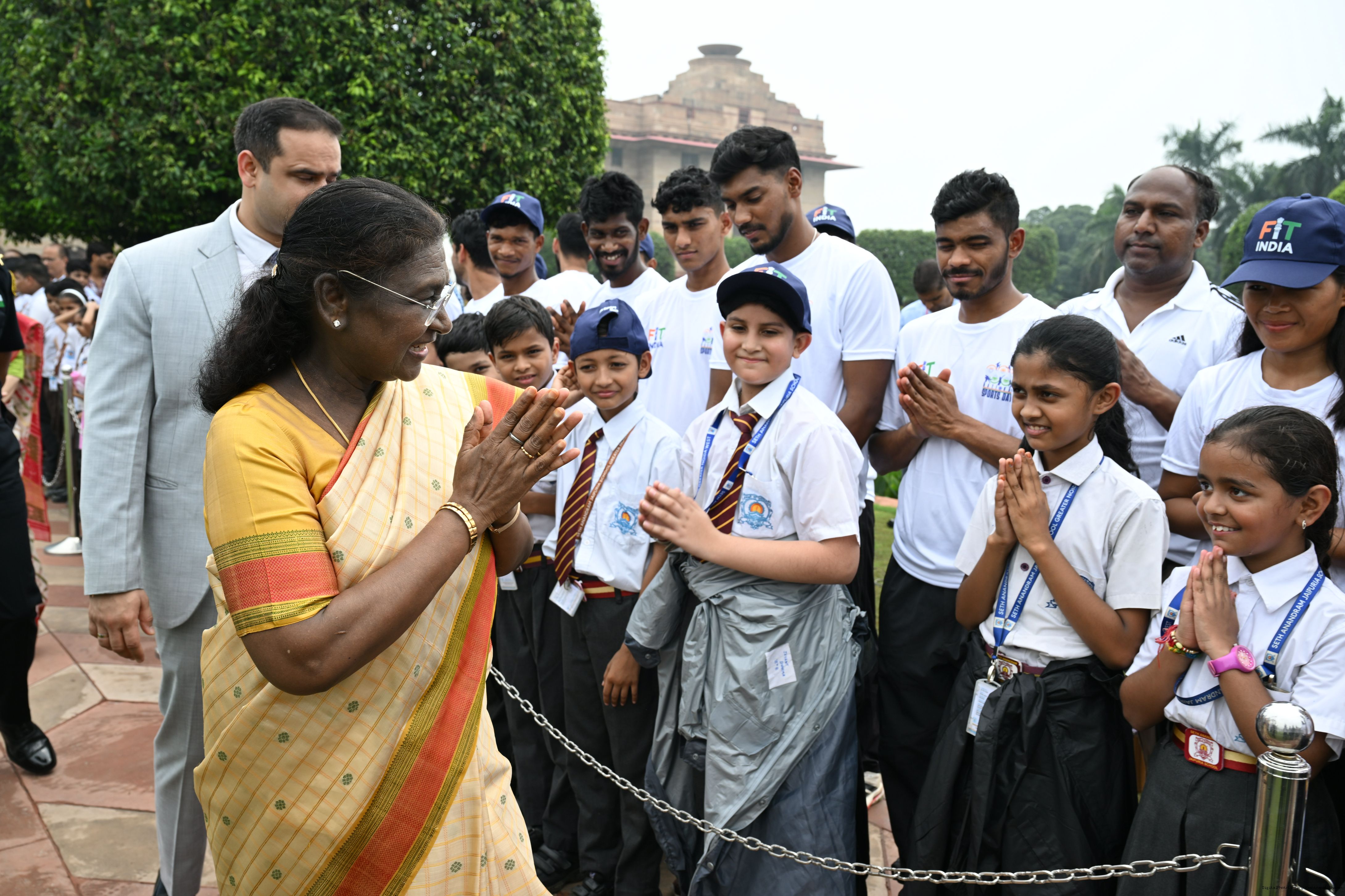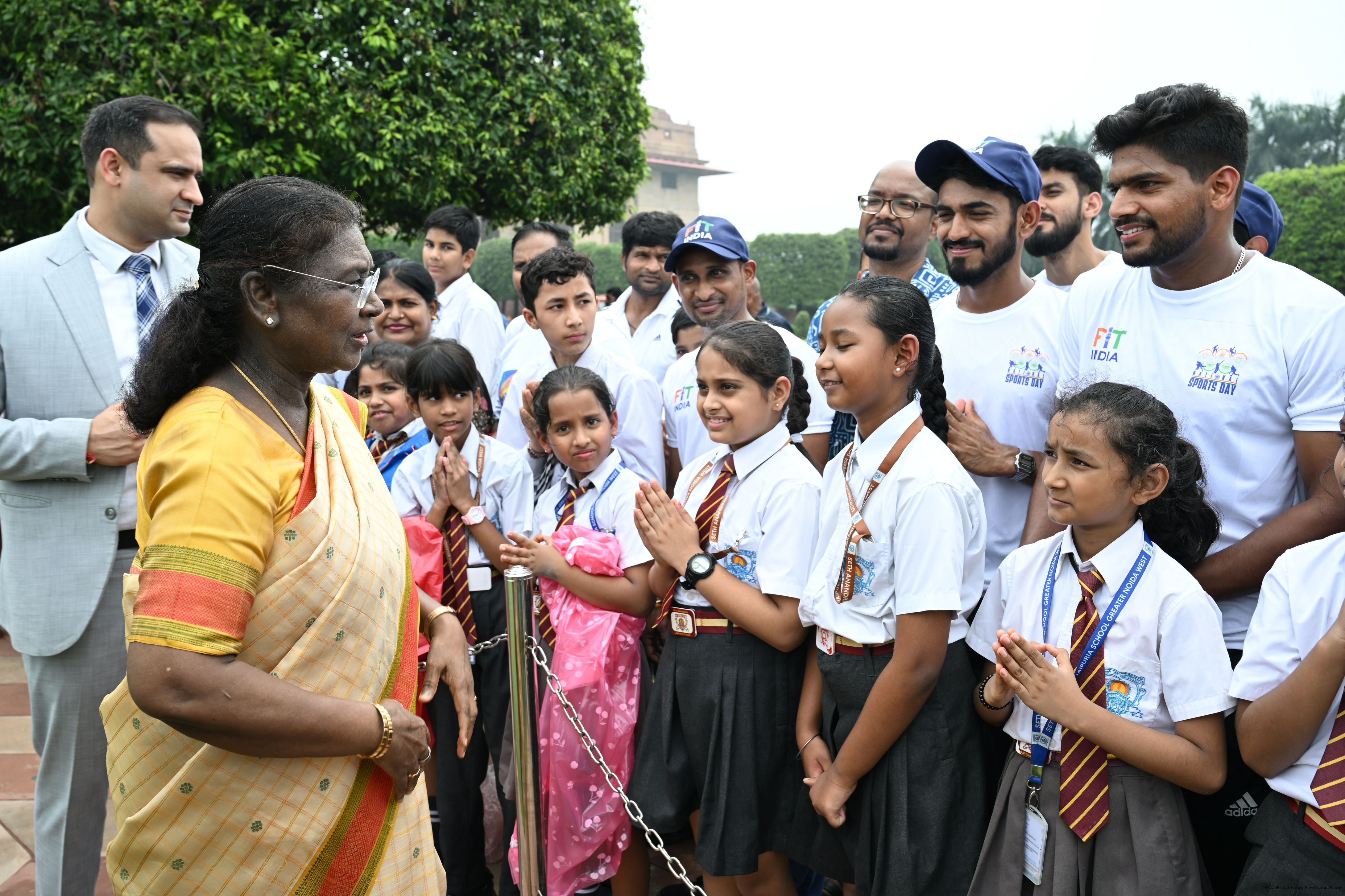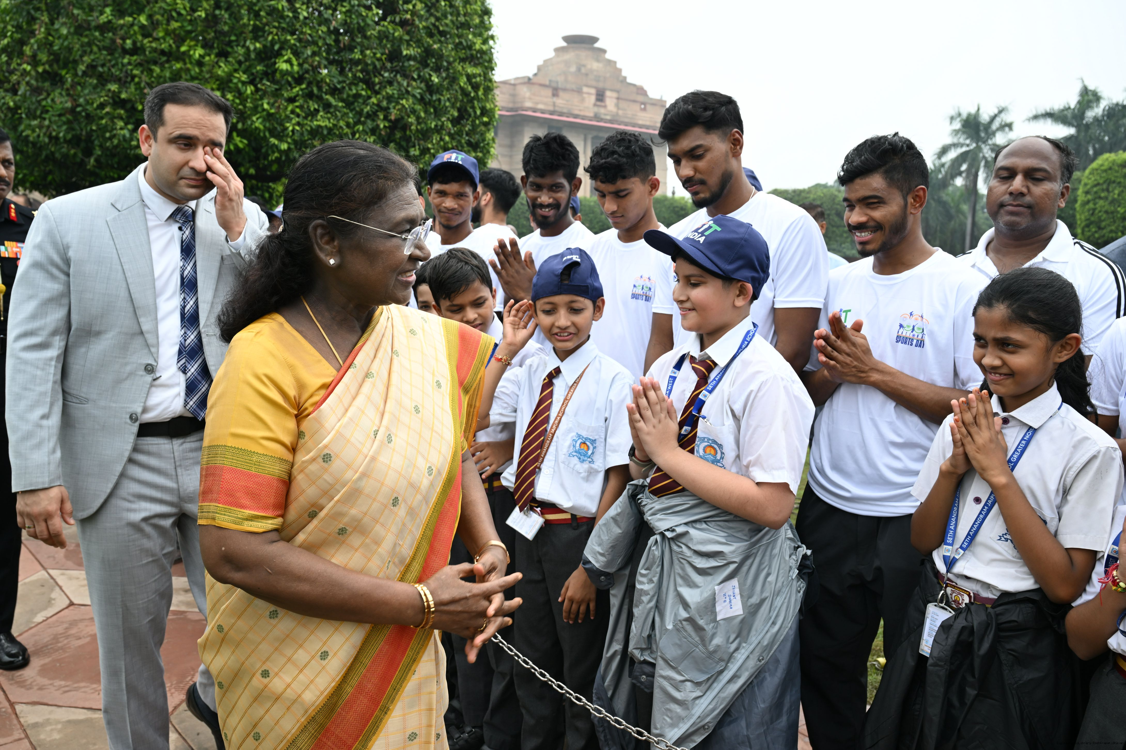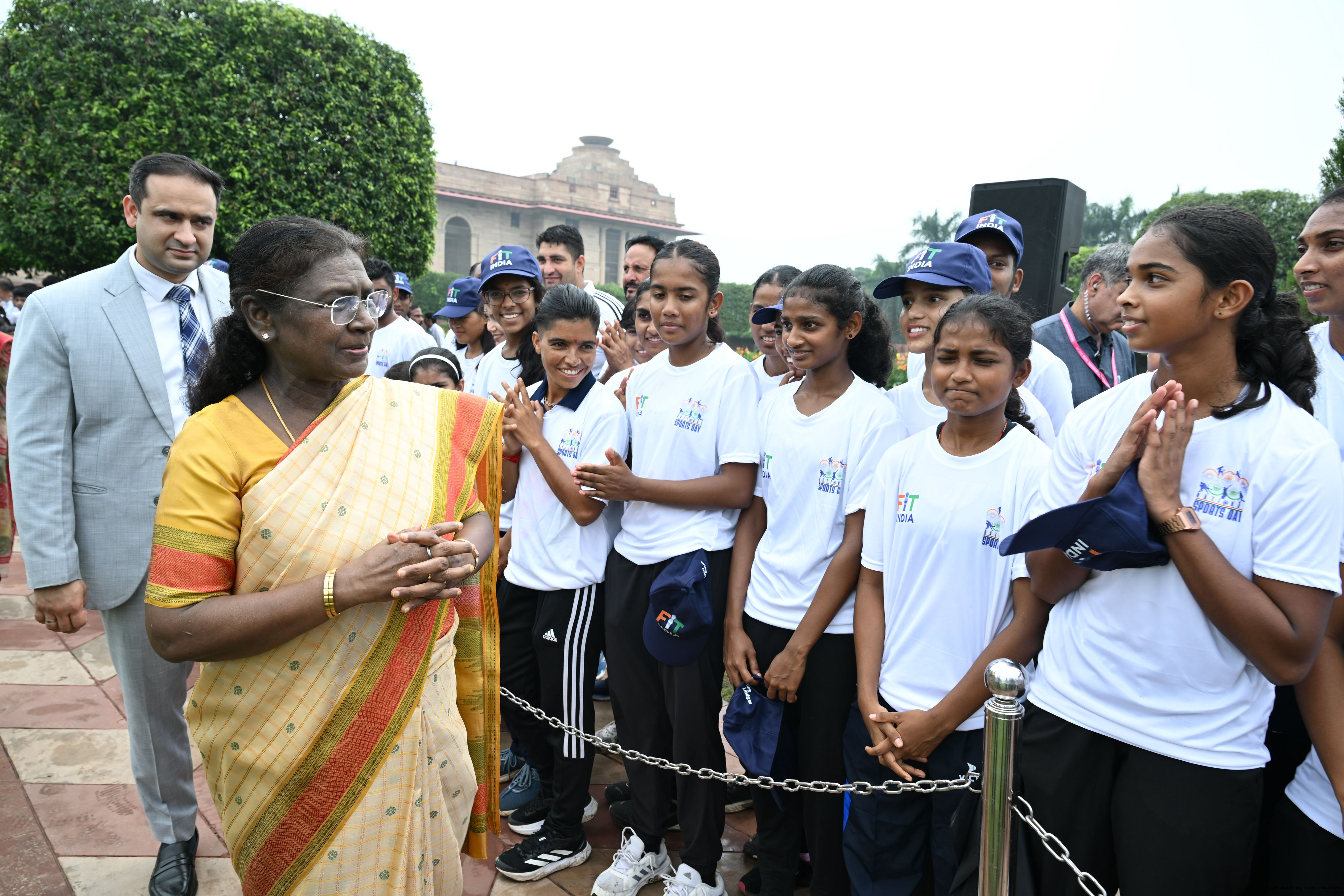 | Caption: | The President of India, Smt Droupadi Murmu interacted with sportspersons who visited Amrit Udyan on National Sports Day at Rashtrapati Bhavan on August 29, 2025. |