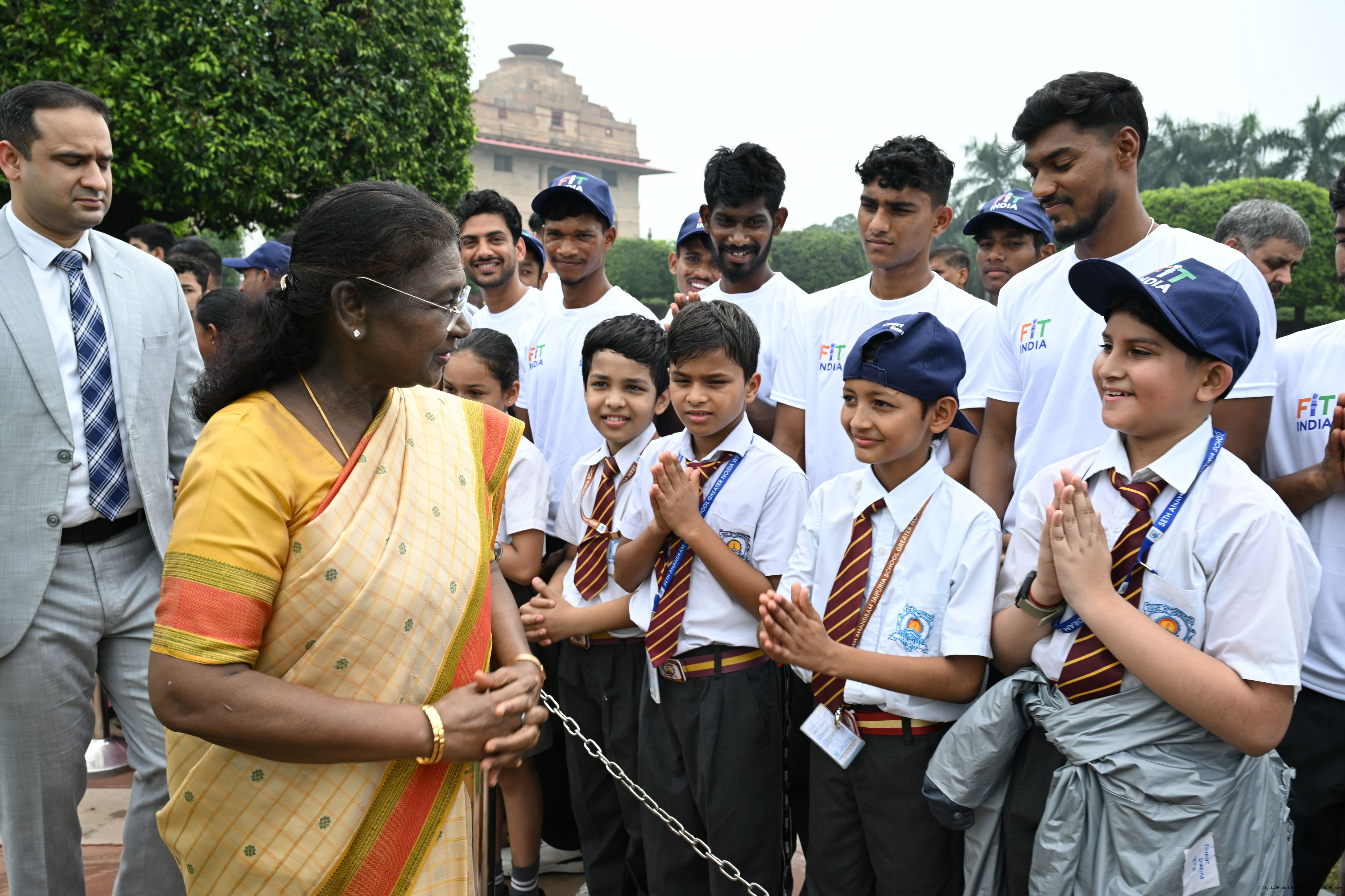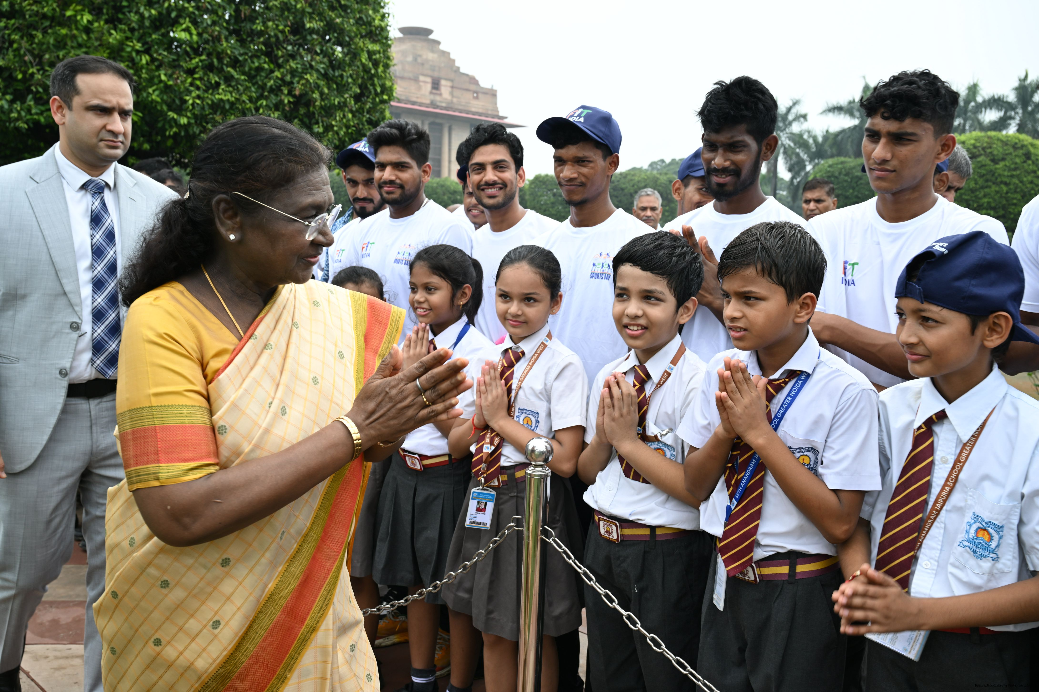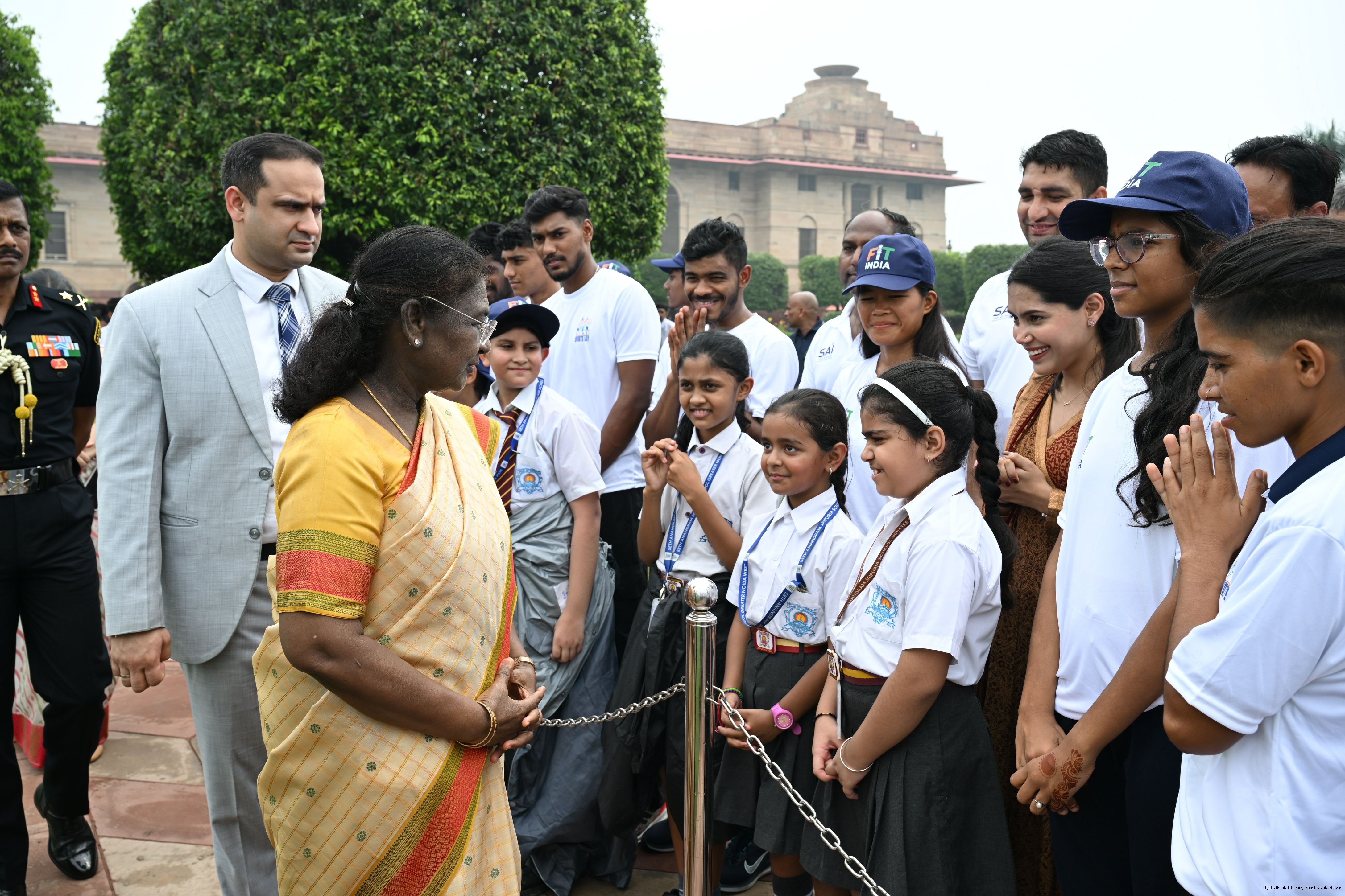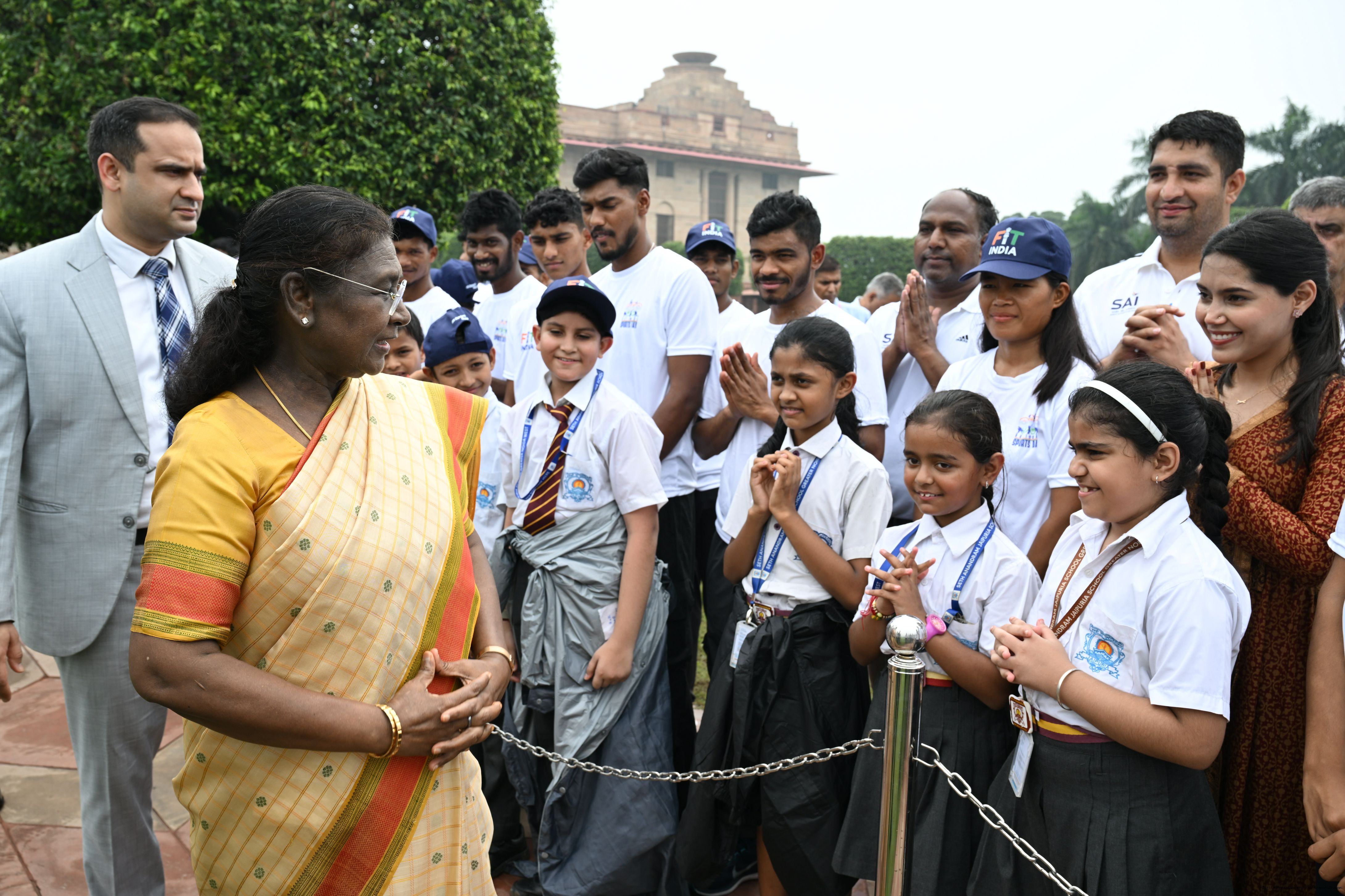 | Caption: | The President of India, Smt Droupadi Murmu interacted with sportspersons who visited Amrit Udyan on National Sports Day at Rashtrapati Bhavan on August 29, 2025. |